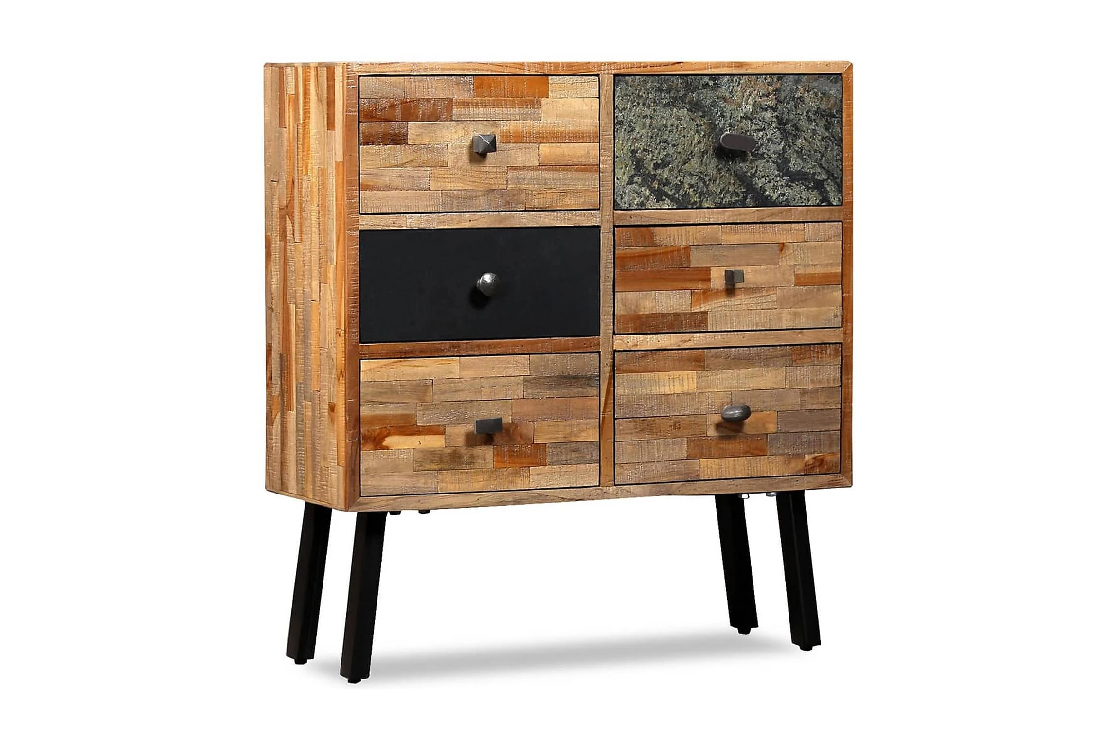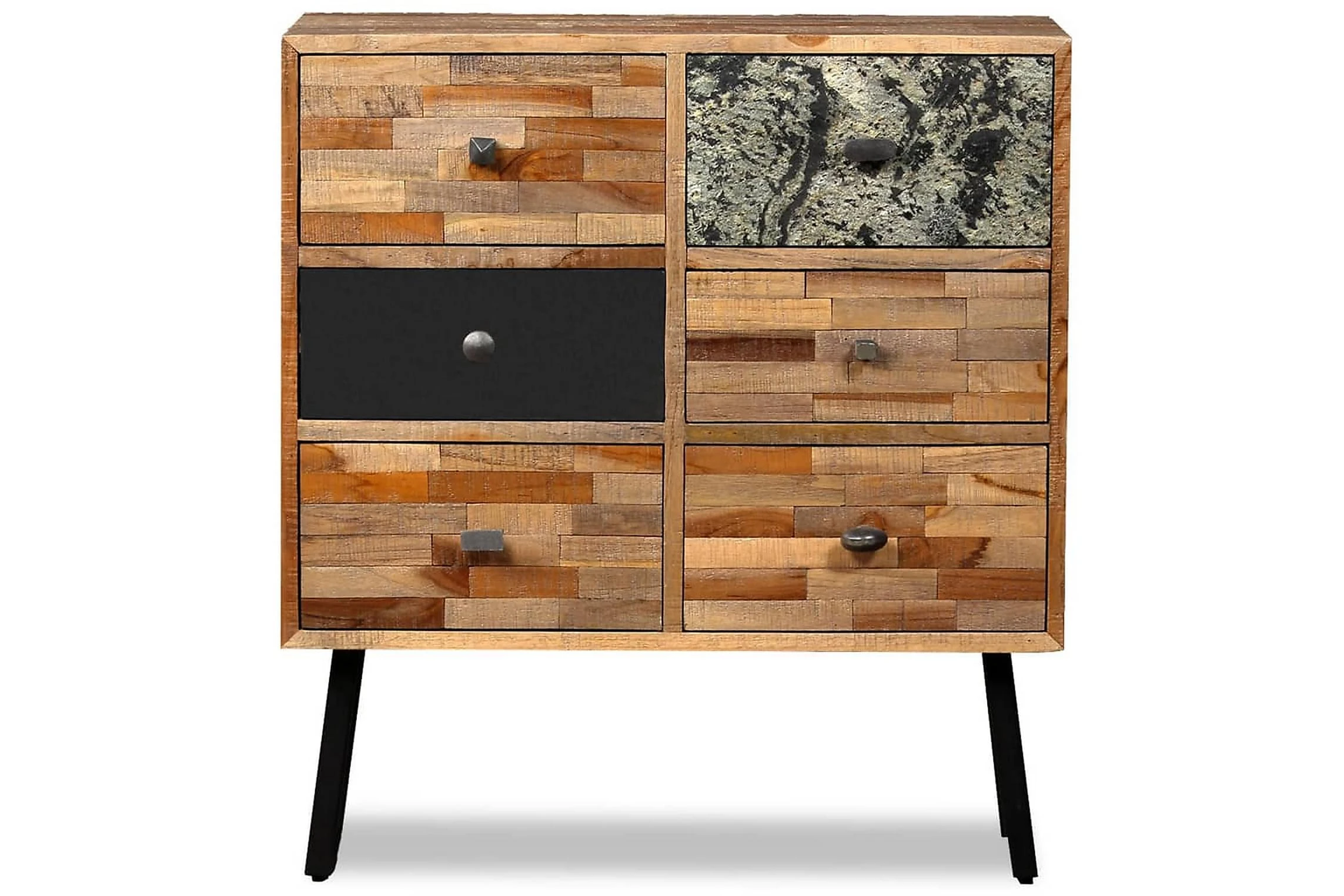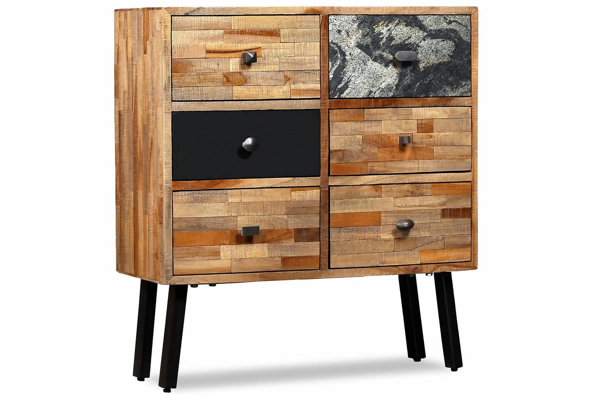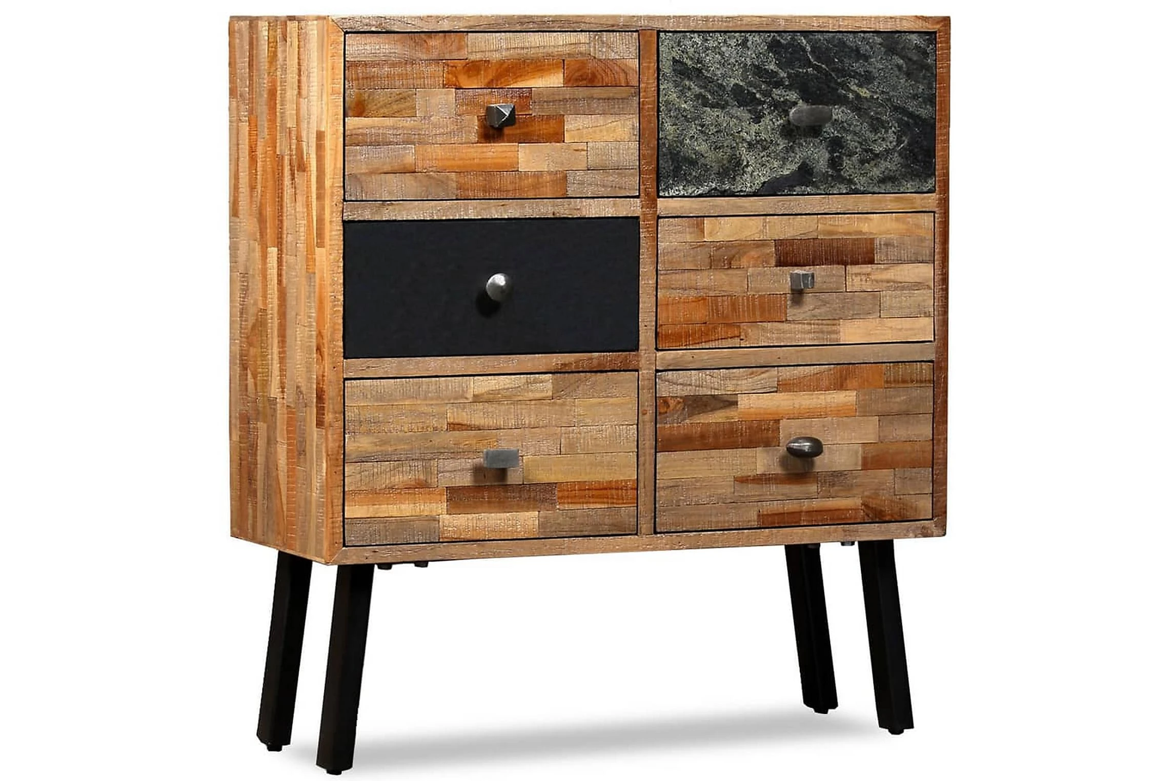 Sidoskåpet är tillverkat i återvunnen teak, vilket betyder att varje möbel är unik och skiljer sig något från de andra. Återvunnen teak är massiv, stadig, slitstark och vacker. Tack vare de starka stålbenen är sidoskåpet både stabilt och hållbart. Den stora ovansidan är perfekta att ställa dekorativa föremål, bildramar eller till och med krukväxter på och de sex lådorna ger gott om utrymme för att hålla mindre föremål organiserade och inom räckhåll. Lådorna med marmorfront bidrar till bordets unika vintagestil.