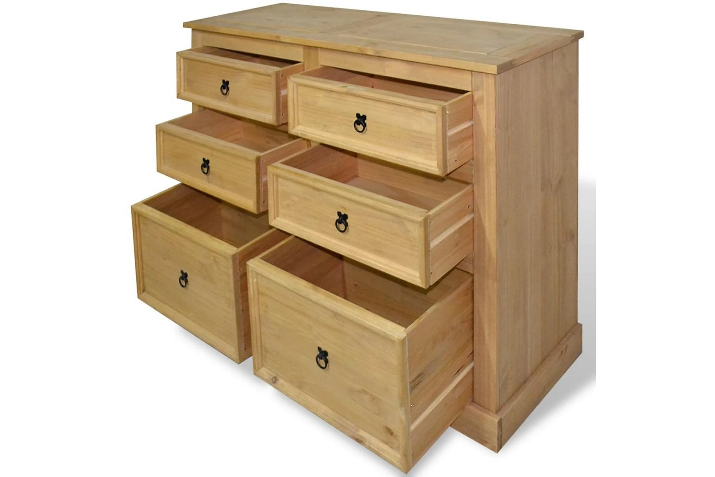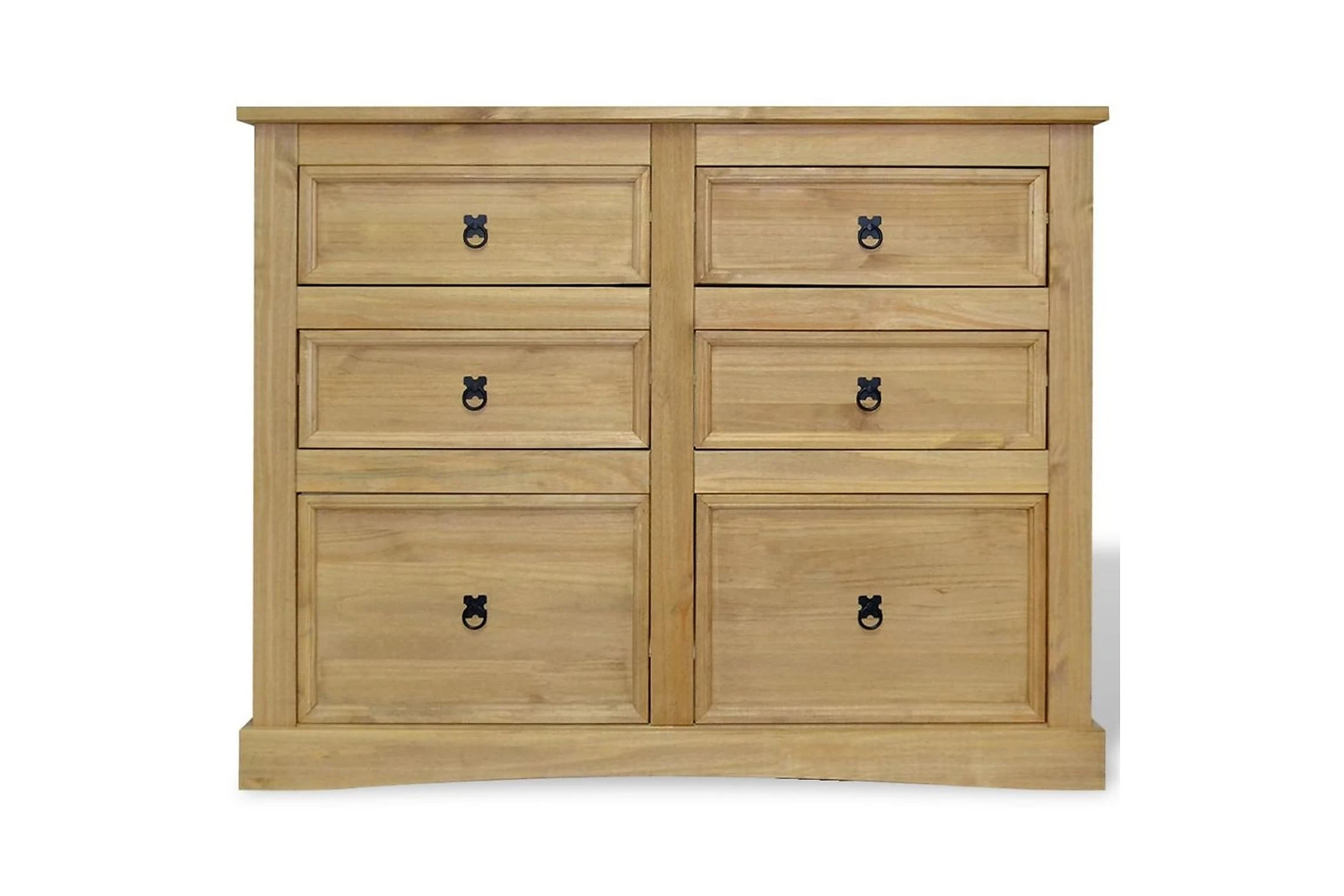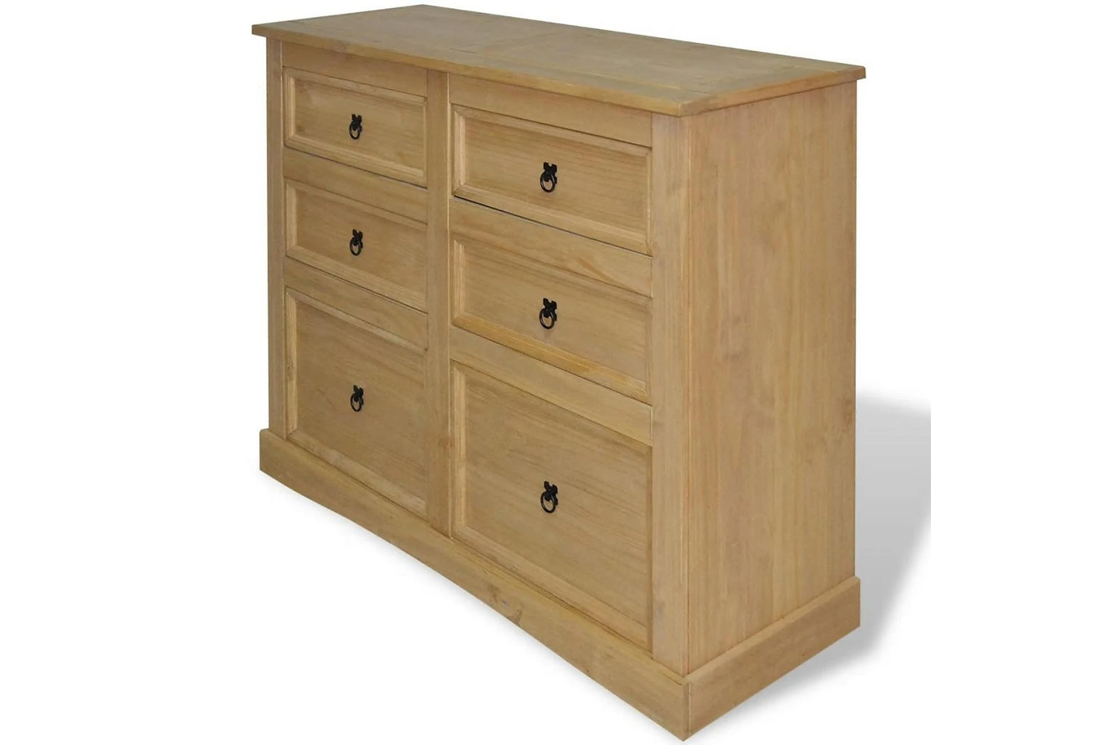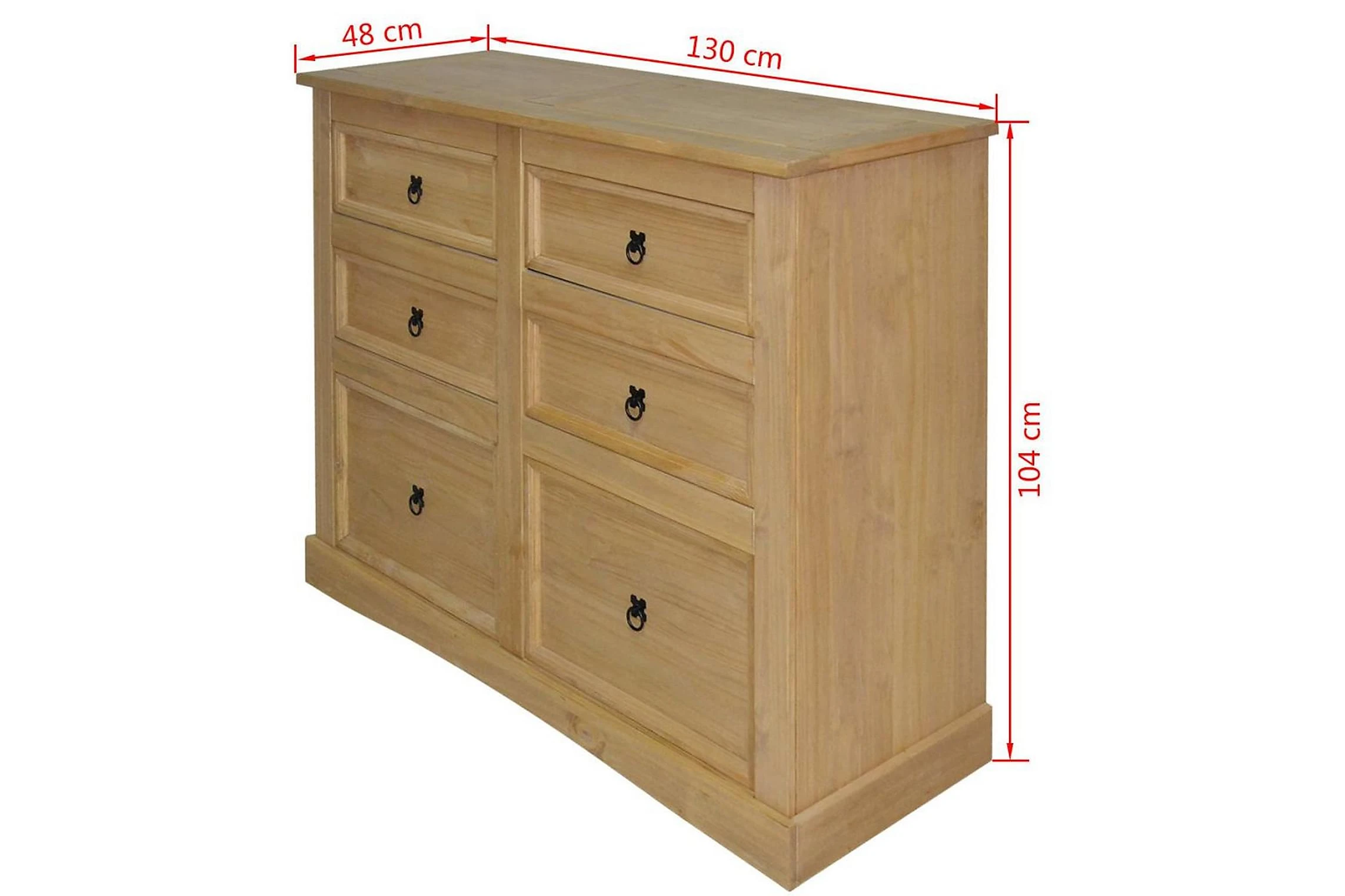 Denna högkvalitativa skänk är en del i den mexikanska serien möbler i Coronastil. Den vaxade furun och svarta metalldetaljerna utstrålar en mexikansk charm som gör att det kommer bli ett utmärkt tillskott i ditt vardagsrum, matsal eller hall. Denna skänk är tillverkad i massiv furu vilket gör den stark och robust. Den har sex lådor – fyra mindre och två större, vilka erbjuder rikligt med utrymme för att förvara böcker, multimediaenheter och andra föremål. Den stabila skivan är perfekt för att placera fruktkorgar, fotoramar, krukväxter eller andra dekorativa föremål på. Mycket enkelt att montera.