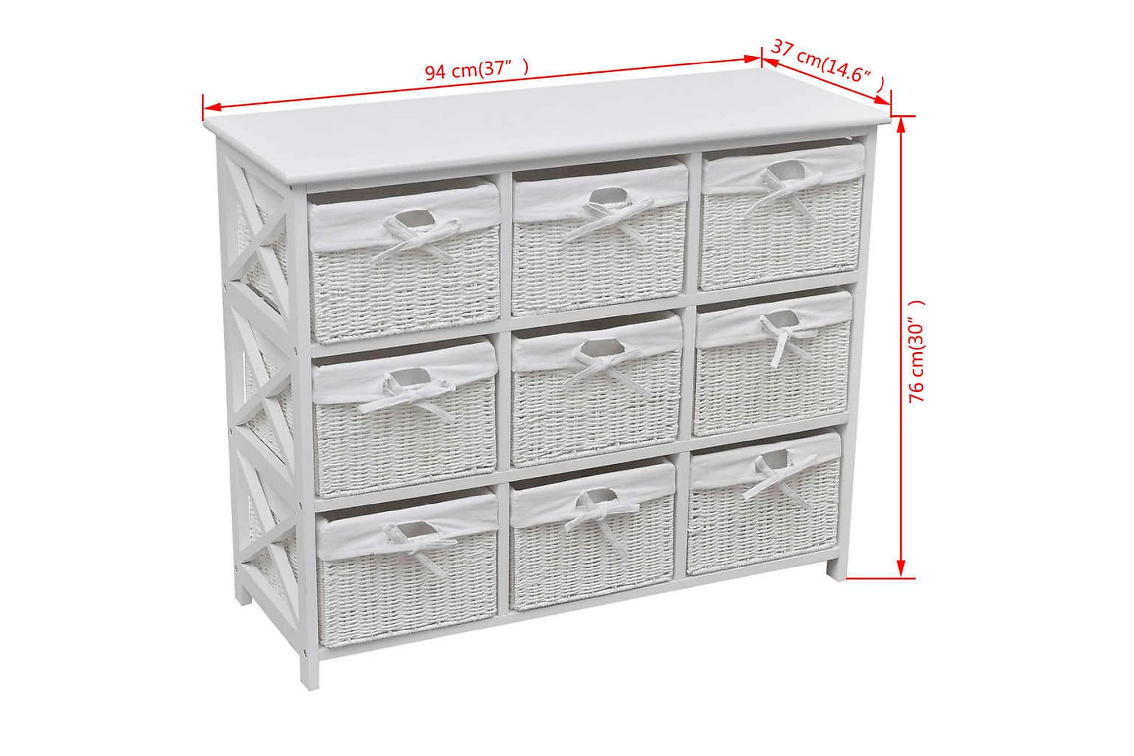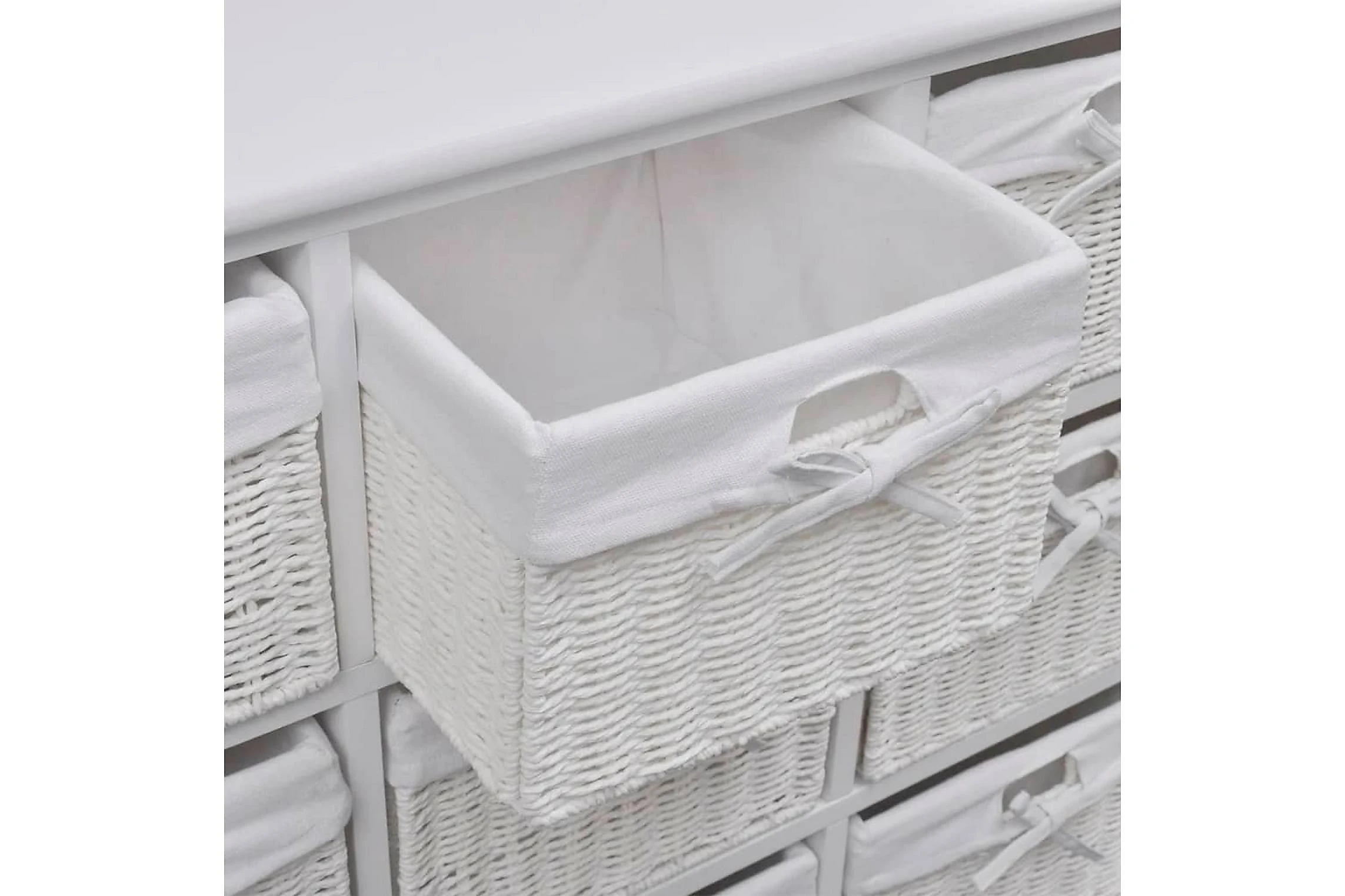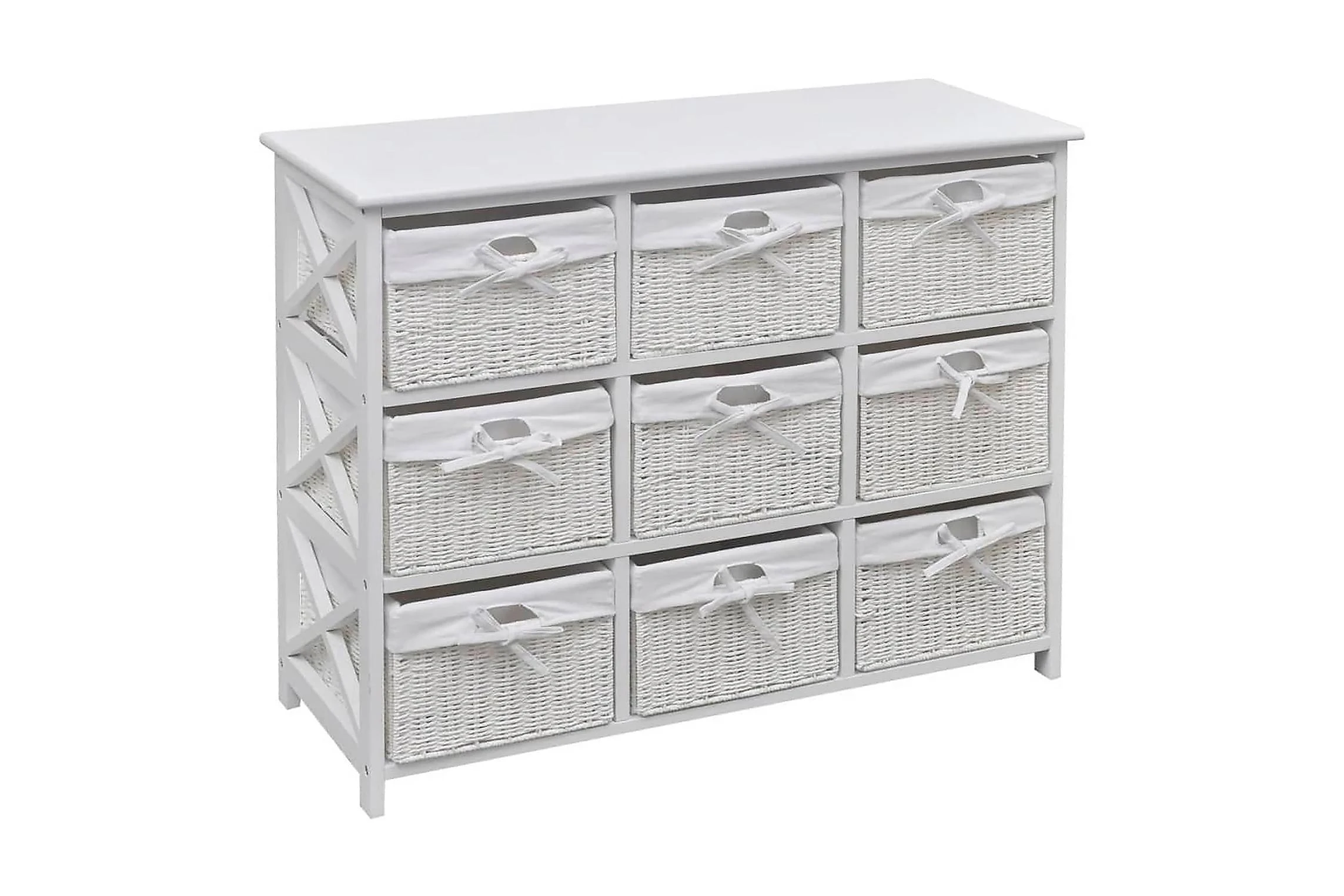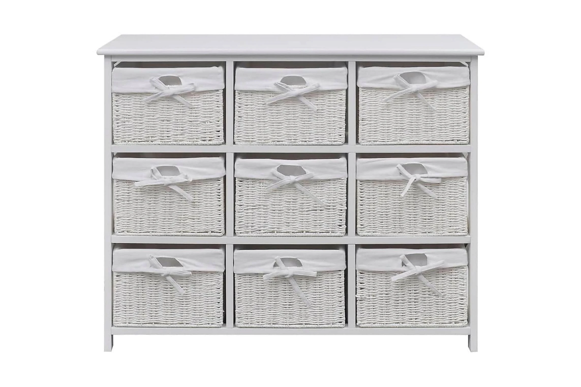 De nio inkluderade korgarna har en kraftigt vävd konstruktion, och är utrustade med praktiska tvättbara tygfoder. Möbeln har en vacker vitmålad yta som är både hållbar och lätt att rengöra.