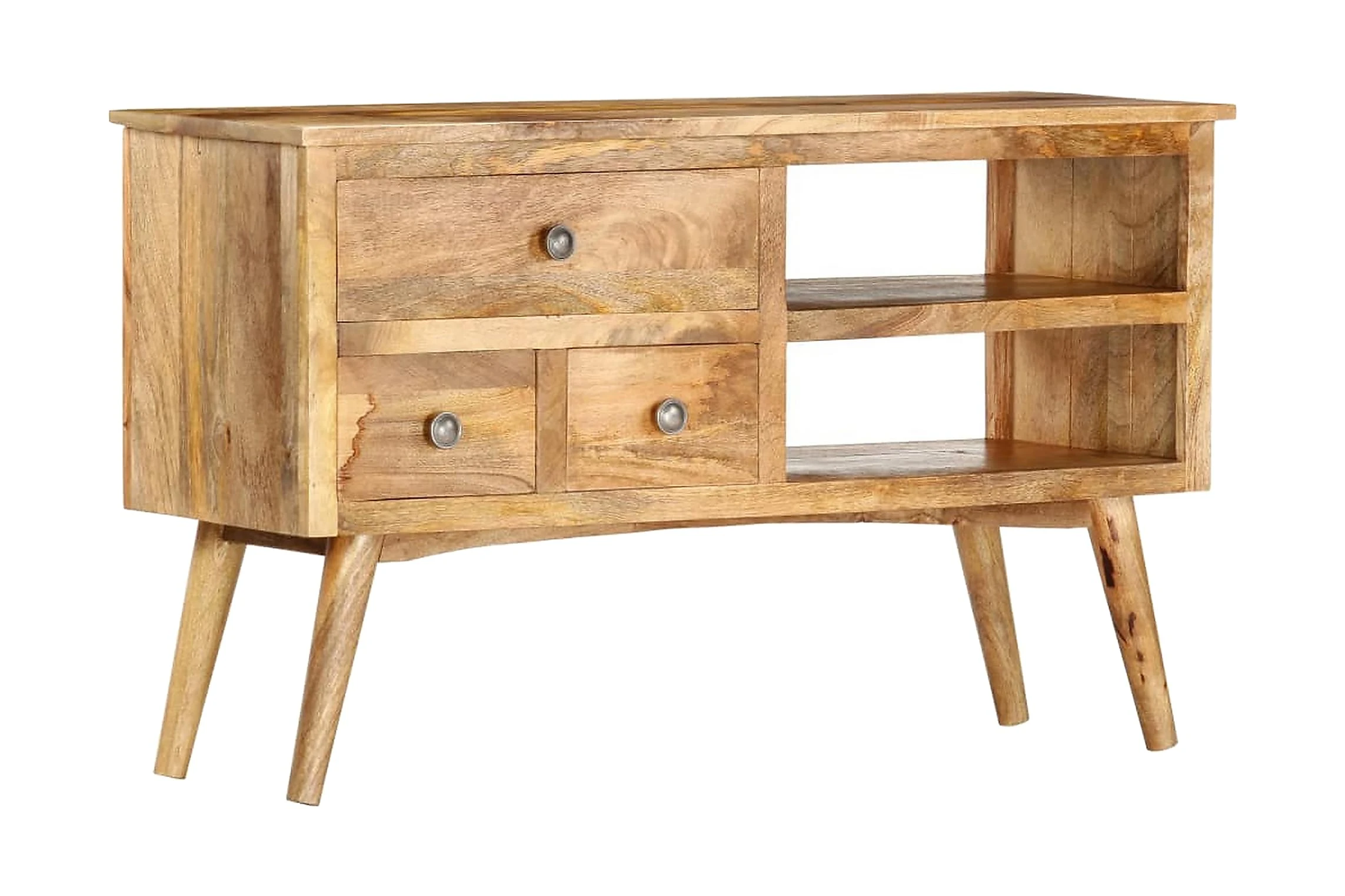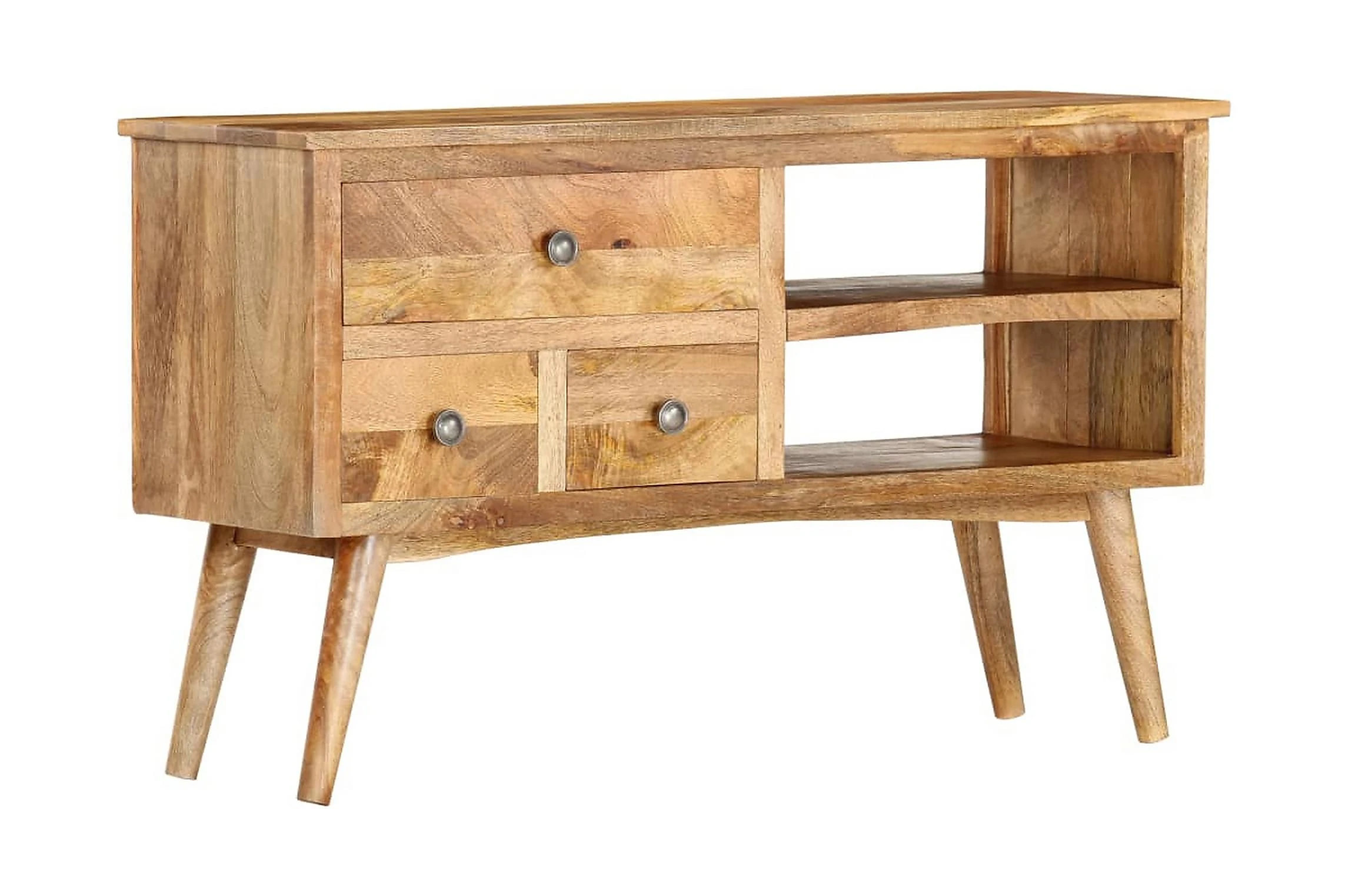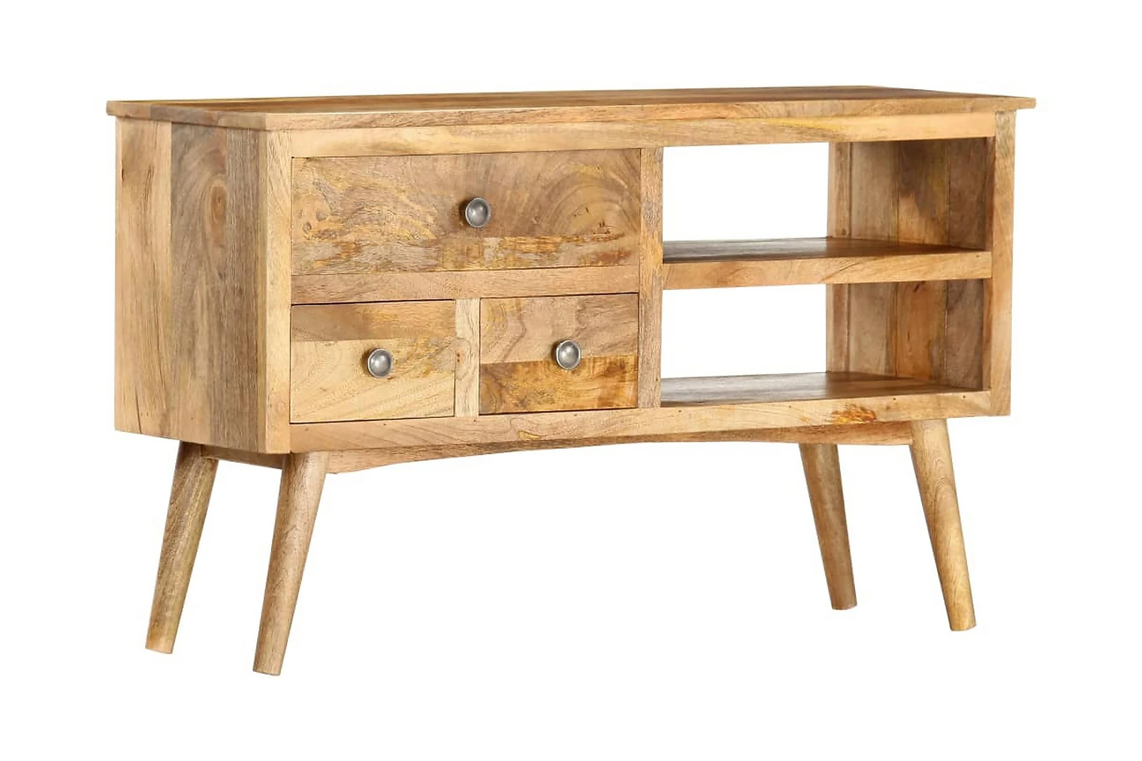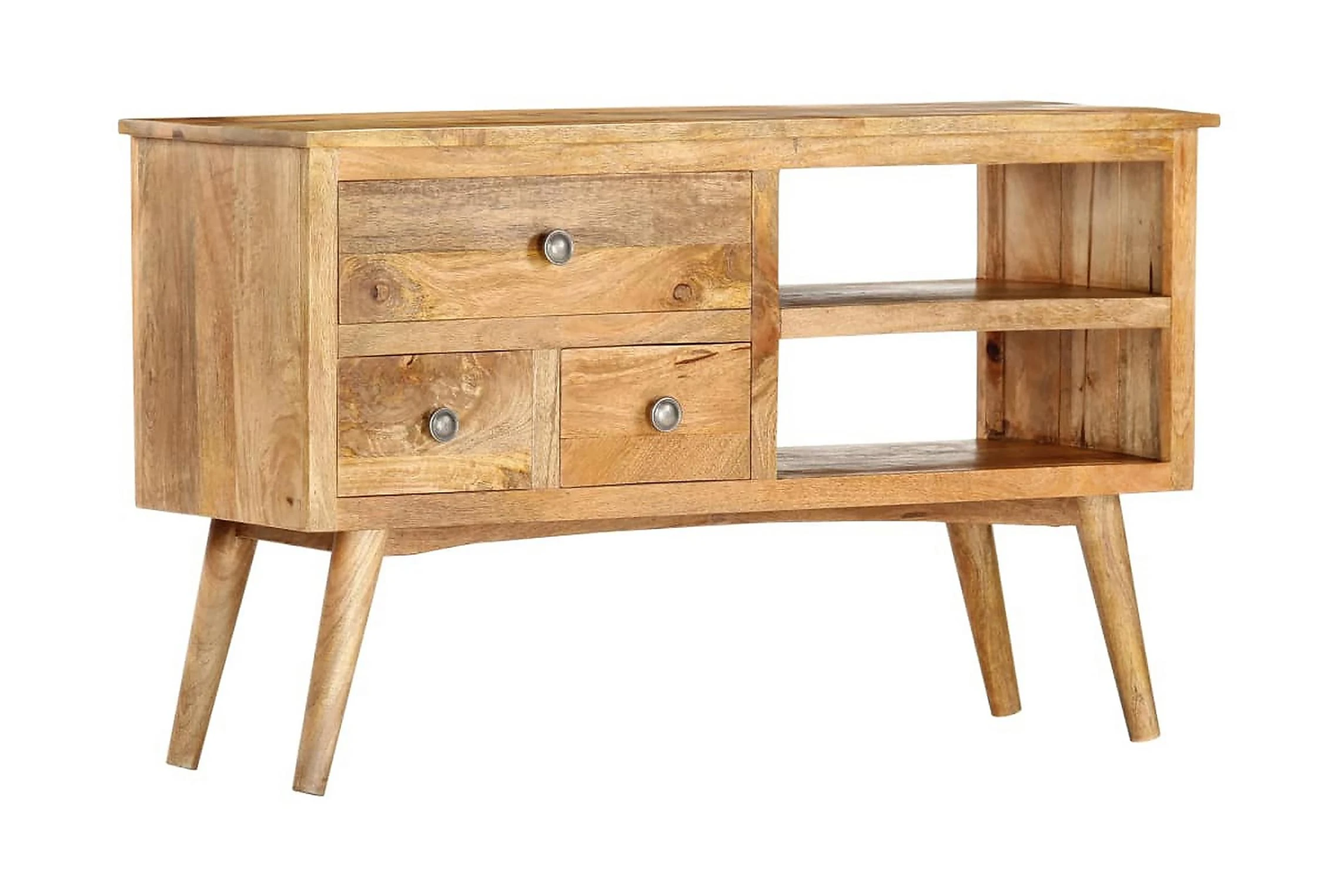 Denna skänk är tillverkad i massivt mangoträ, ett träslag med täta ådringar. Massivt mangoträ är inte bara starkt nog att bära tung vikt, det är även tåligt och slitstarkt. Därför är denna vackert designade sovrumsmöbel stabil, hållbar och iögonfallande. Det perfekta hantverket garanterar att varje steg i processen utförs med största omsorg, vare sig det är polering, målning eller lackering. Dessutom utmärks skänken av 3 lådor och 1 öppen hylla, vilket är en optimal lösning för att förvara dina saker organiserat och inom räckhåll. Skänken är enkel att montera.