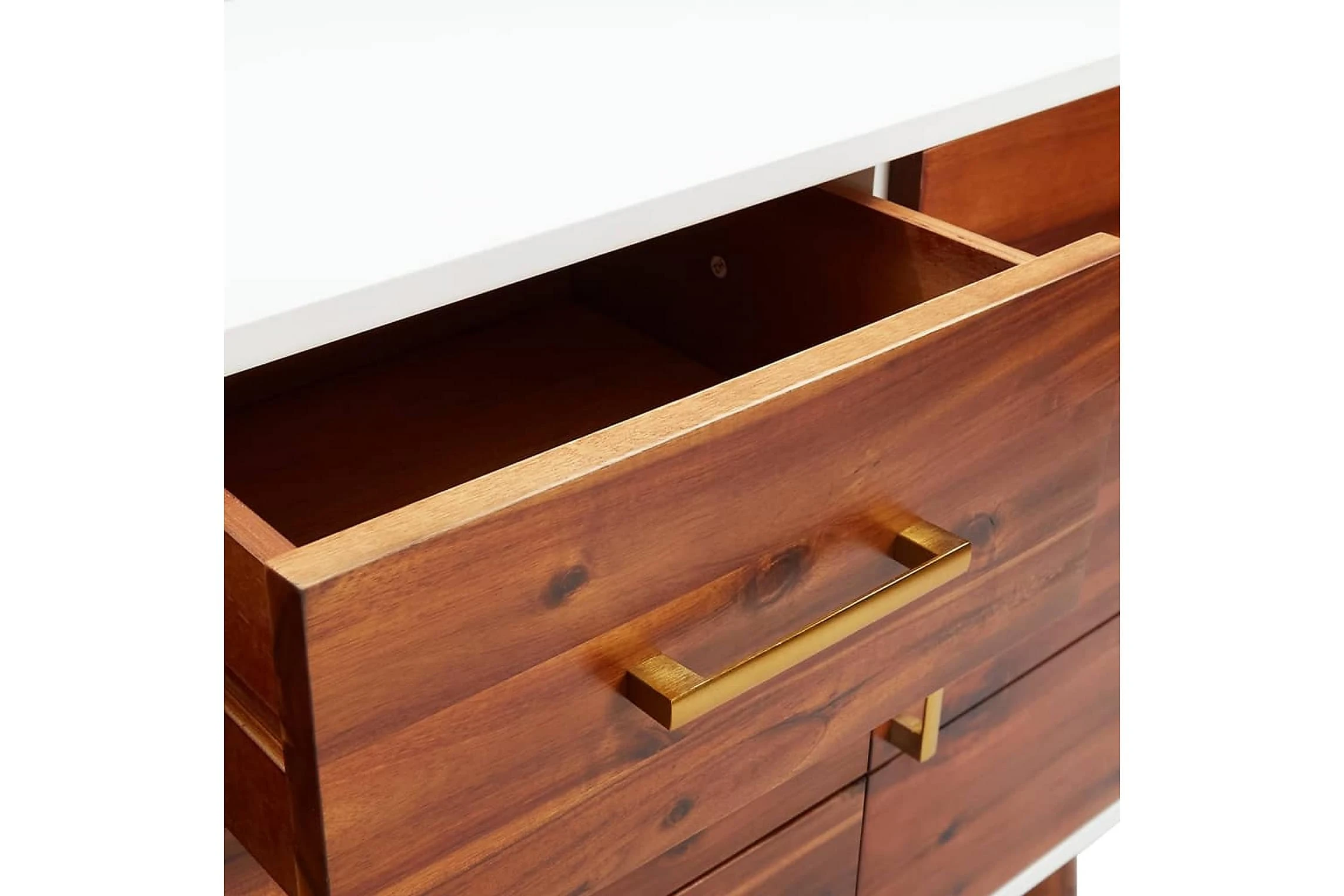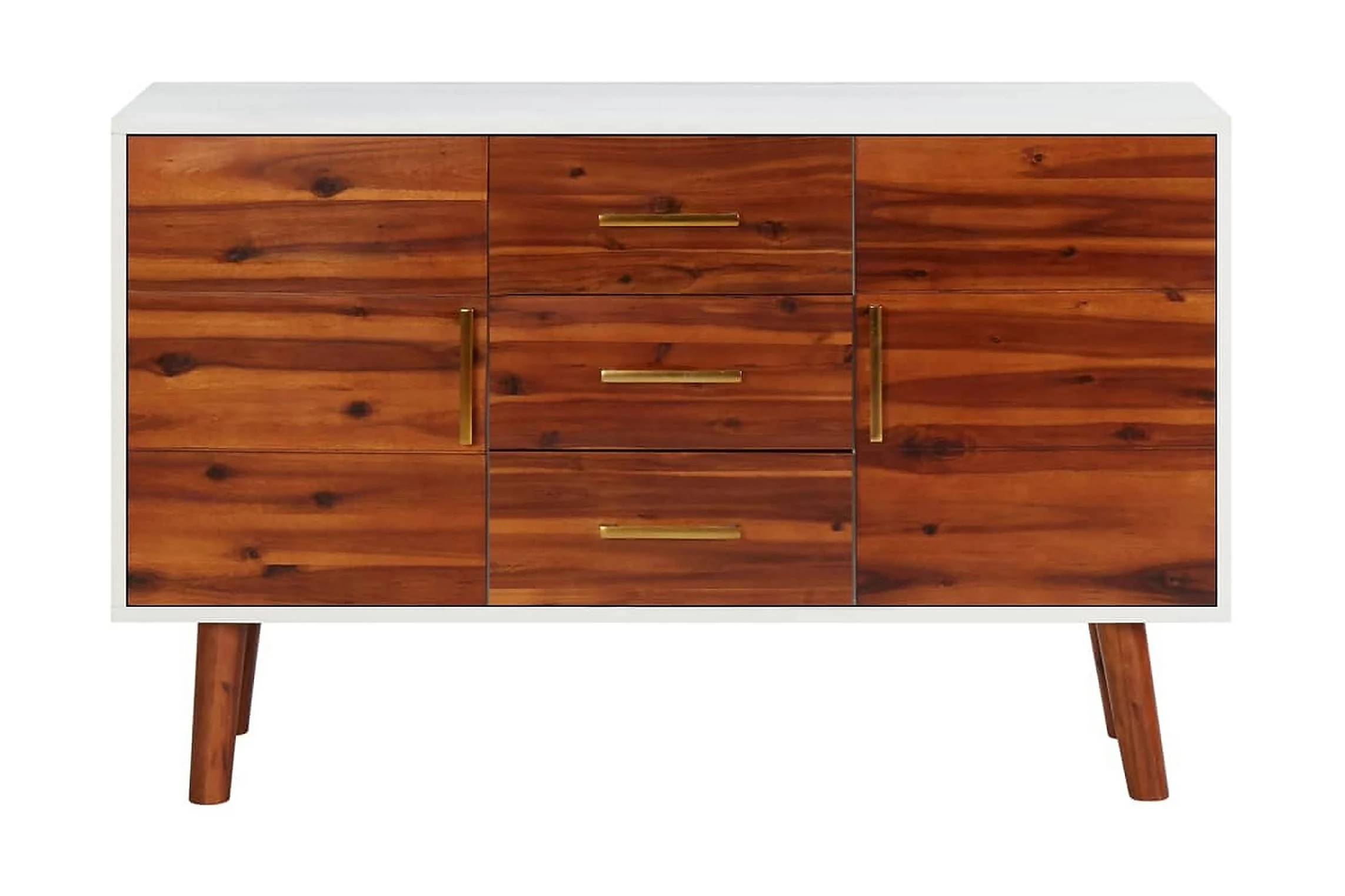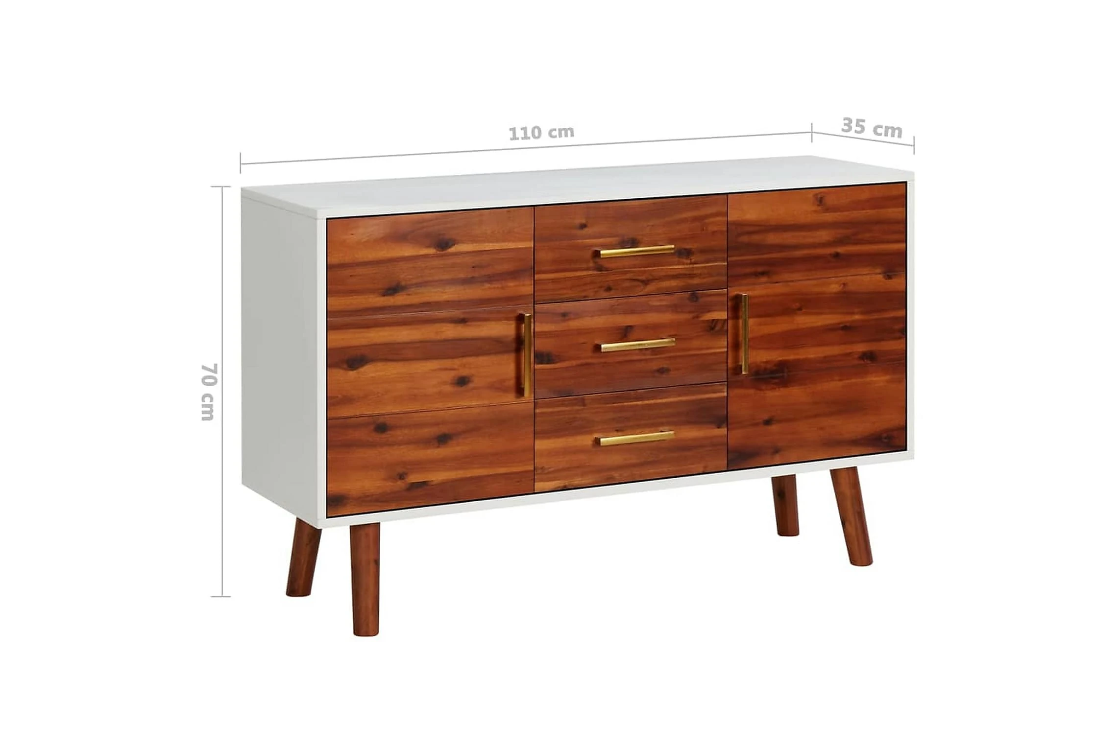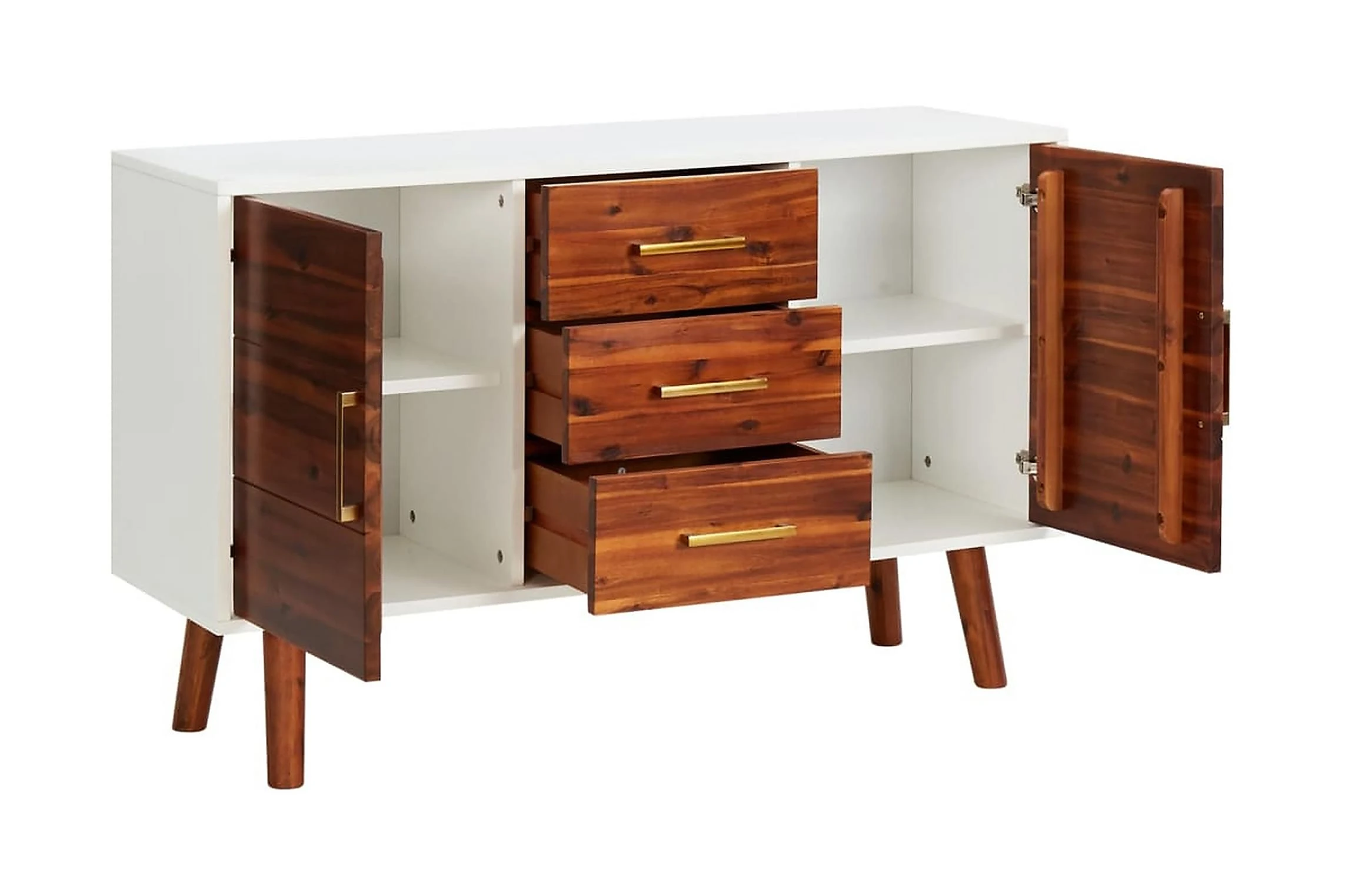Denna skänk är tillverkad i massiv akaciaträ och MDF, vilket gör den mycket robust och hållbar. Massivt akaciaträ är ett lövträ med täta fibrer. Dessutom är varje möbel unik tack vare dess vackra hantverk och ådringar. Sidoskåpet har 3 lådor och 2 dörrar, med gott om förvaringsutrymme för böcker, mediaapparater och andra saker. Ovansidan är perfekt för att ställa dekorativa föremål, fotoramar eller krukväxter.
