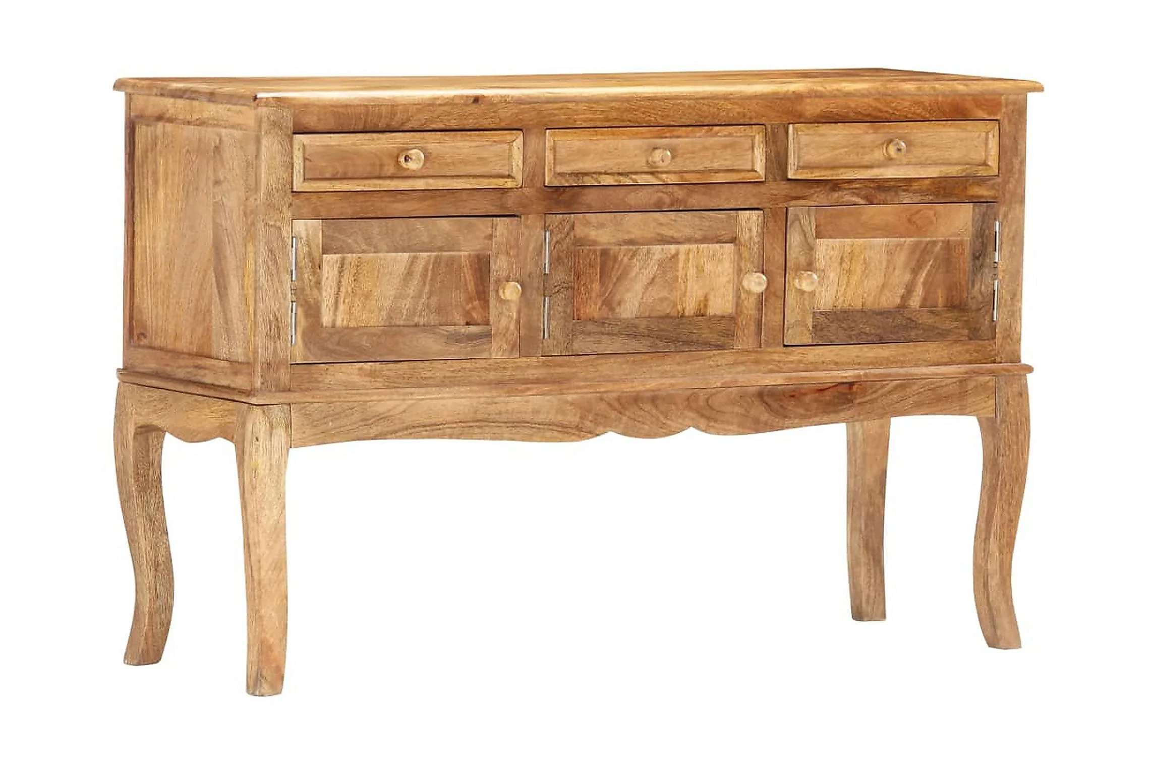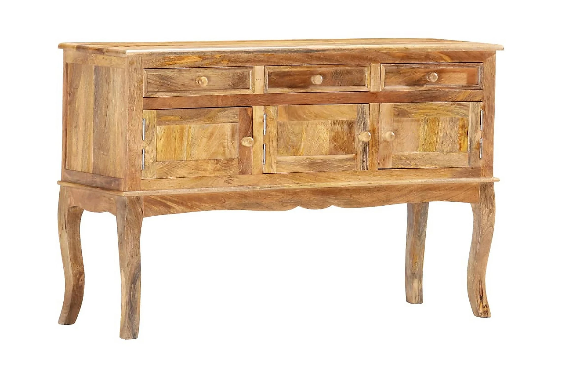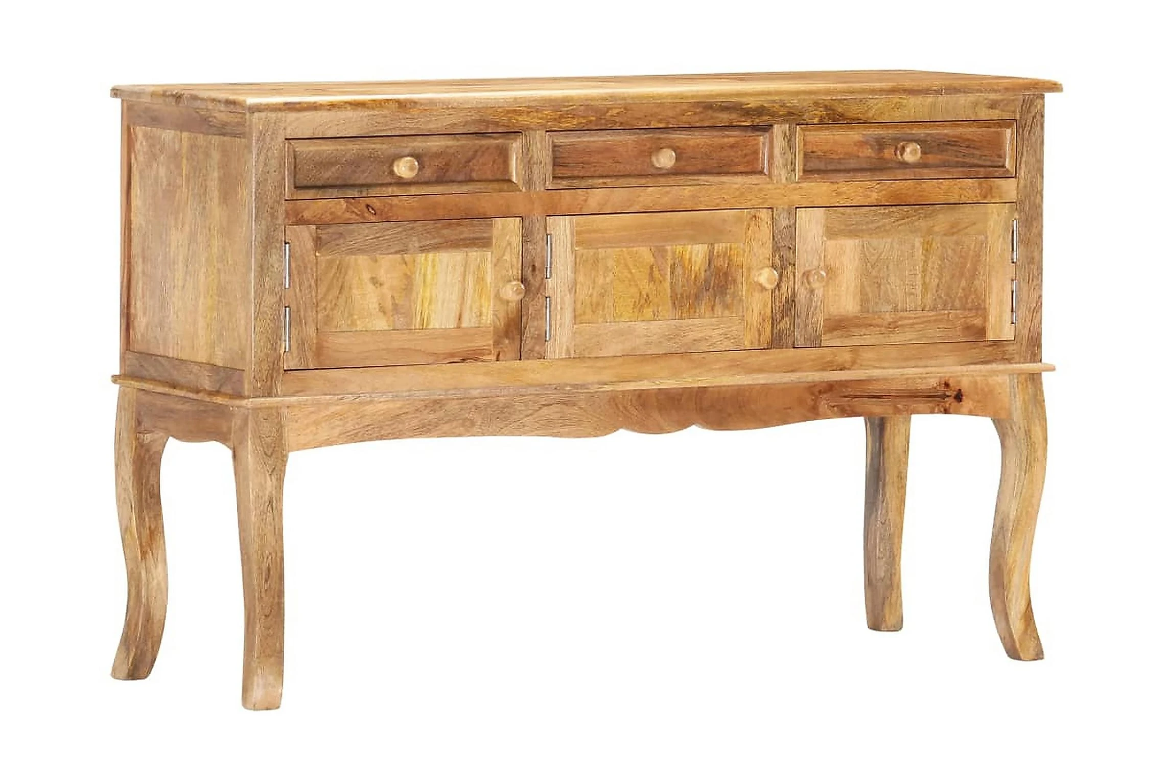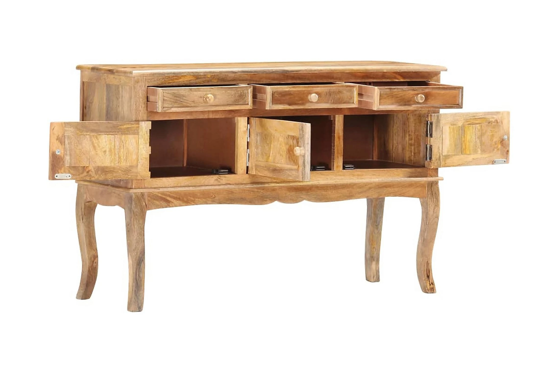 Skåpet är tillverkat i massivt mangoträ som är ett kompakt och robust lövträ med vackra strimmor och konturer i brunt eller guld. Varje steg i processen utförs med största omsorg, vare sig det är polering eller lackering. Hantverket bidrar till dess spektakulära franska stil. Dessutom har skänken 3 lådor och 3 dörrar så att du har gott om plats att hålla småsaker organiserade och inom räckhåll. Produkten är enkel att montera.