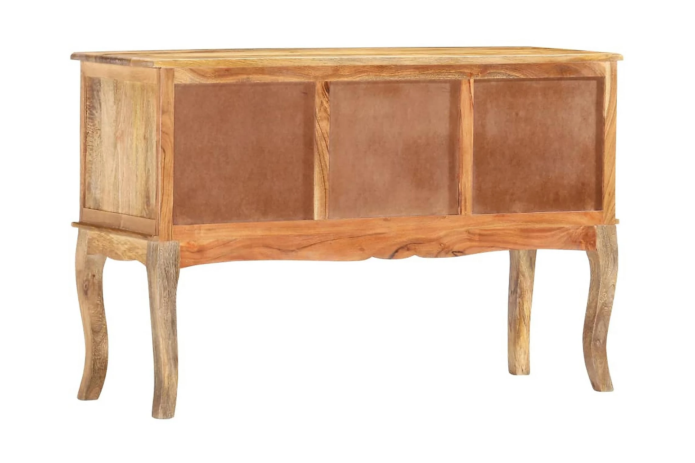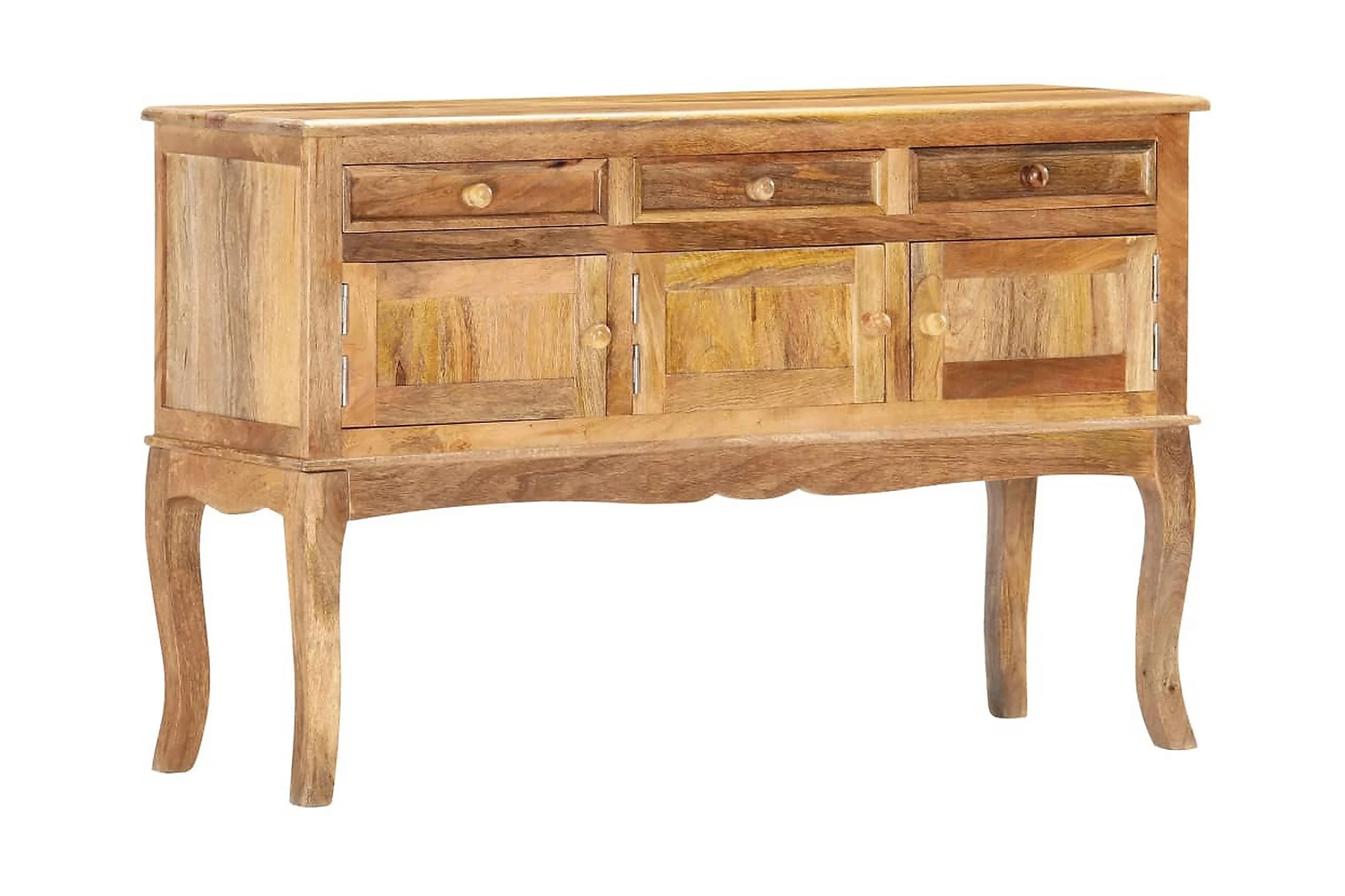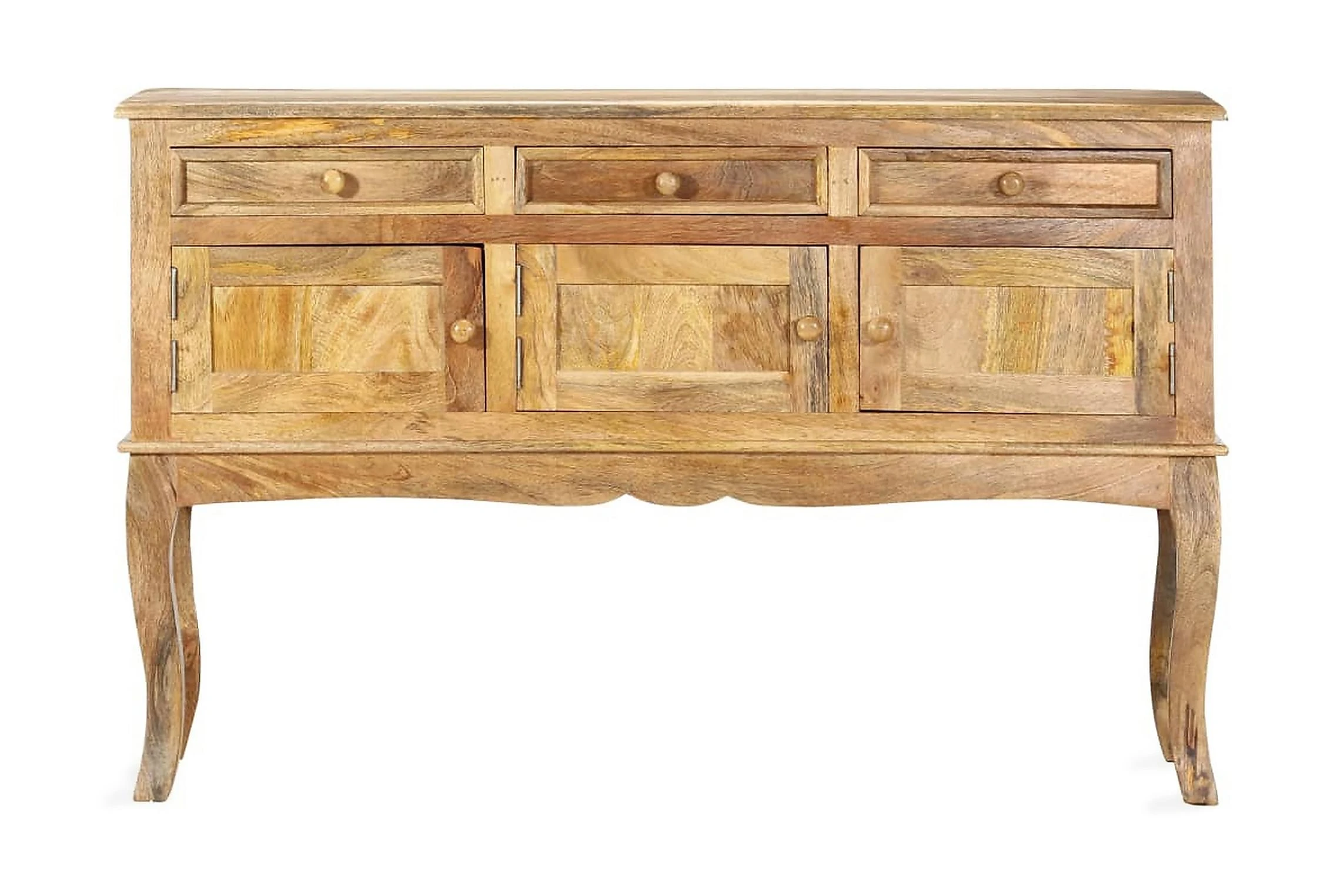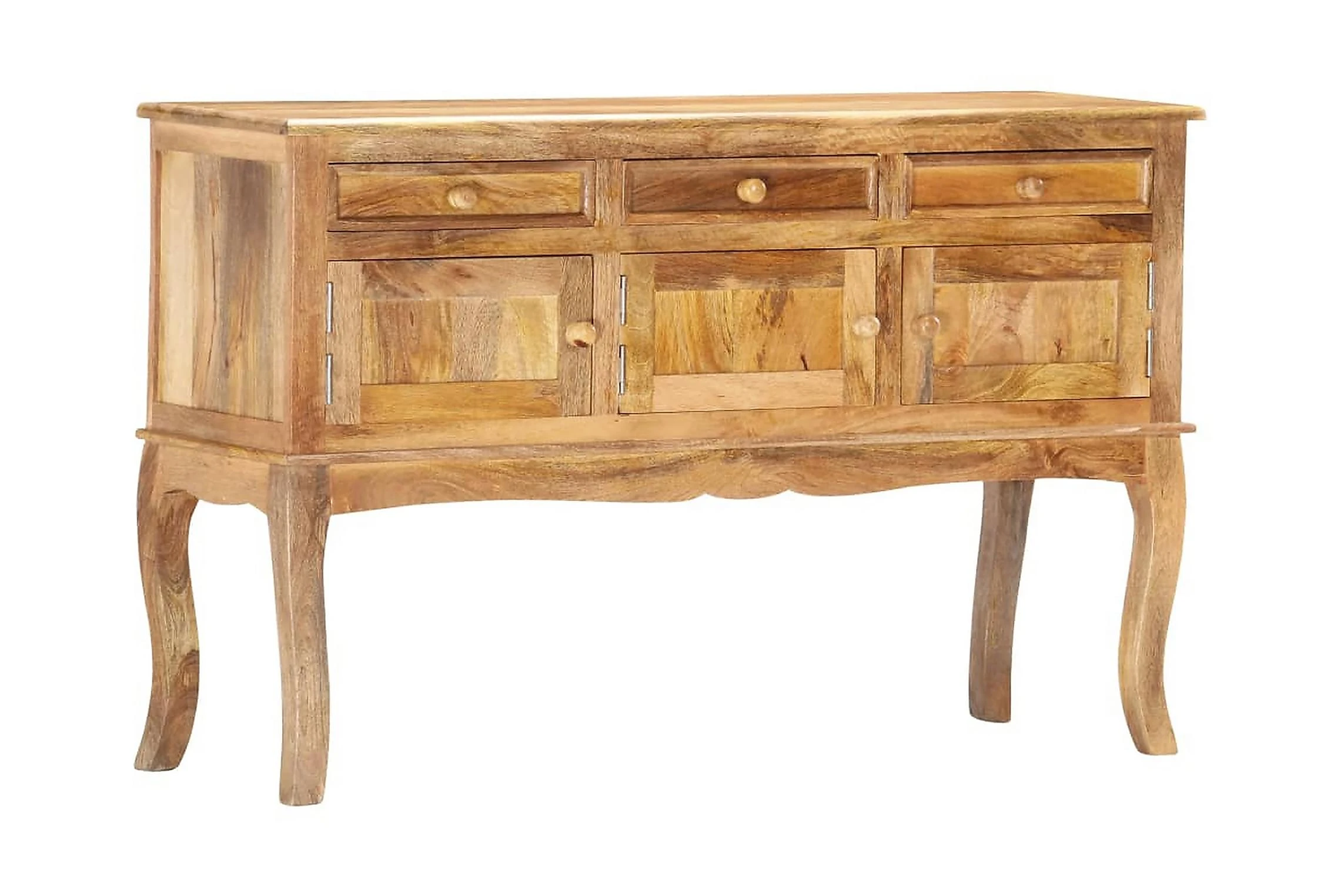 Skåpet är tillverkat i massivt mangoträ som är ett kompakt och robust lövträ med vackra strimmor och konturer i brunt eller guld. Varje steg i processen utförs med största omsorg, vare sig det är polering eller lackering. Hantverket bidrar till dess spektakulära franska stil. Dessutom har skänken 3 lådor och 3 dörrar så att du har gott om plats att hålla småsaker organiserade och inom räckhåll. Produkten är enkel att montera.