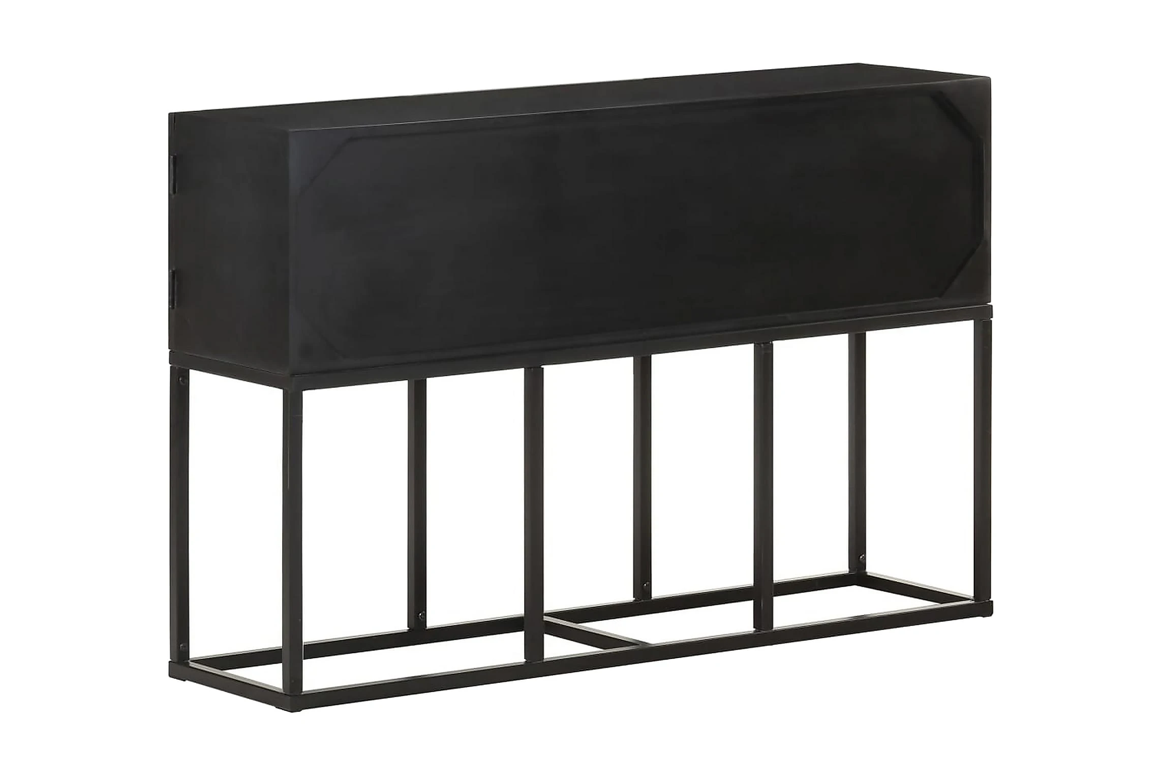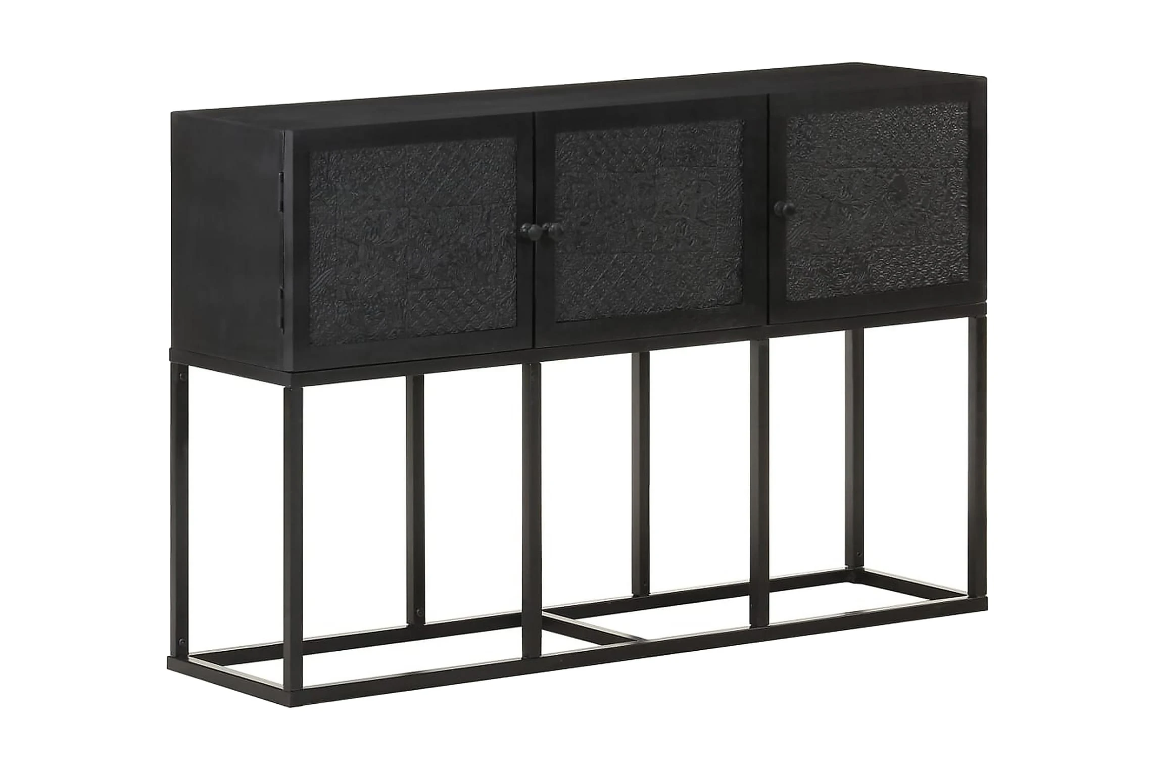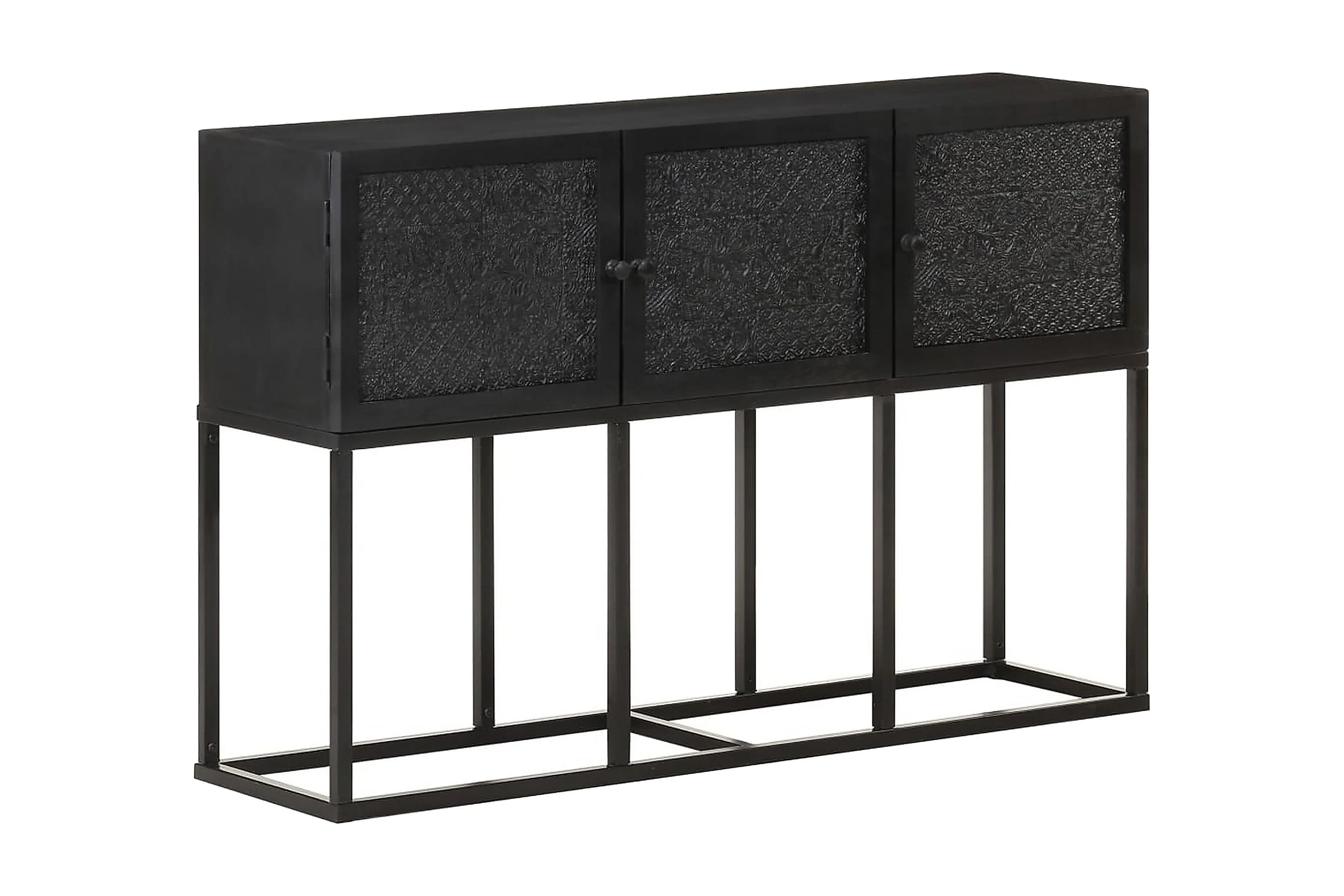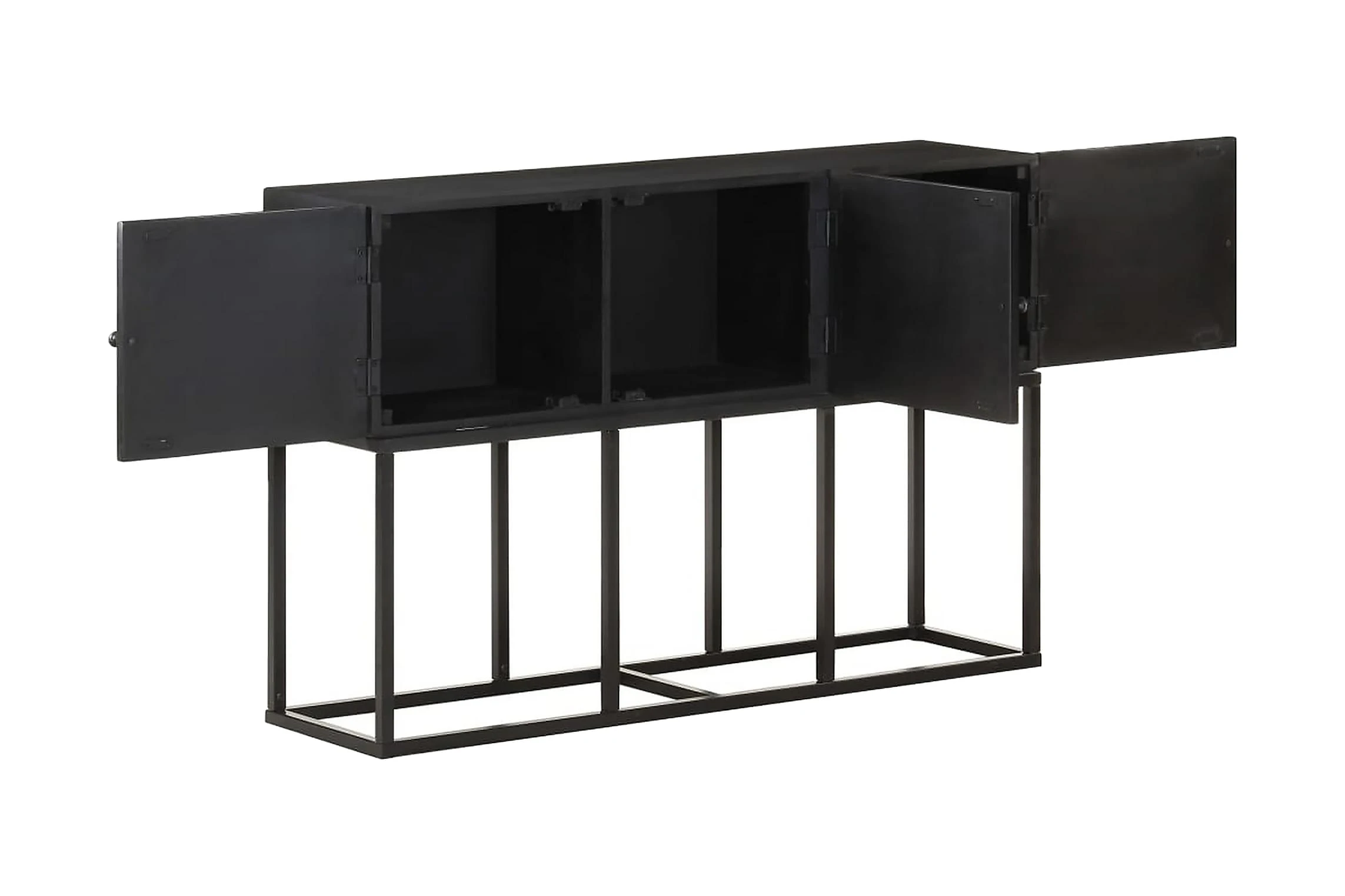 Skänken är tillverkad av massivt mangoträ, ett tropiskt lövträ som är starkt nog att bära vikten. Det är även mycket tåligt, vilket gör den stabil och hållbar. Den pulverlackerade stålramen gör den stabil. Skåpet har även 3 dörrar med gott om förvaringsutrymme. Dessutom kan den stadiga träytan användas för att visa upp prydnadssaker som fotoramar, krukväxter, vaser mm.