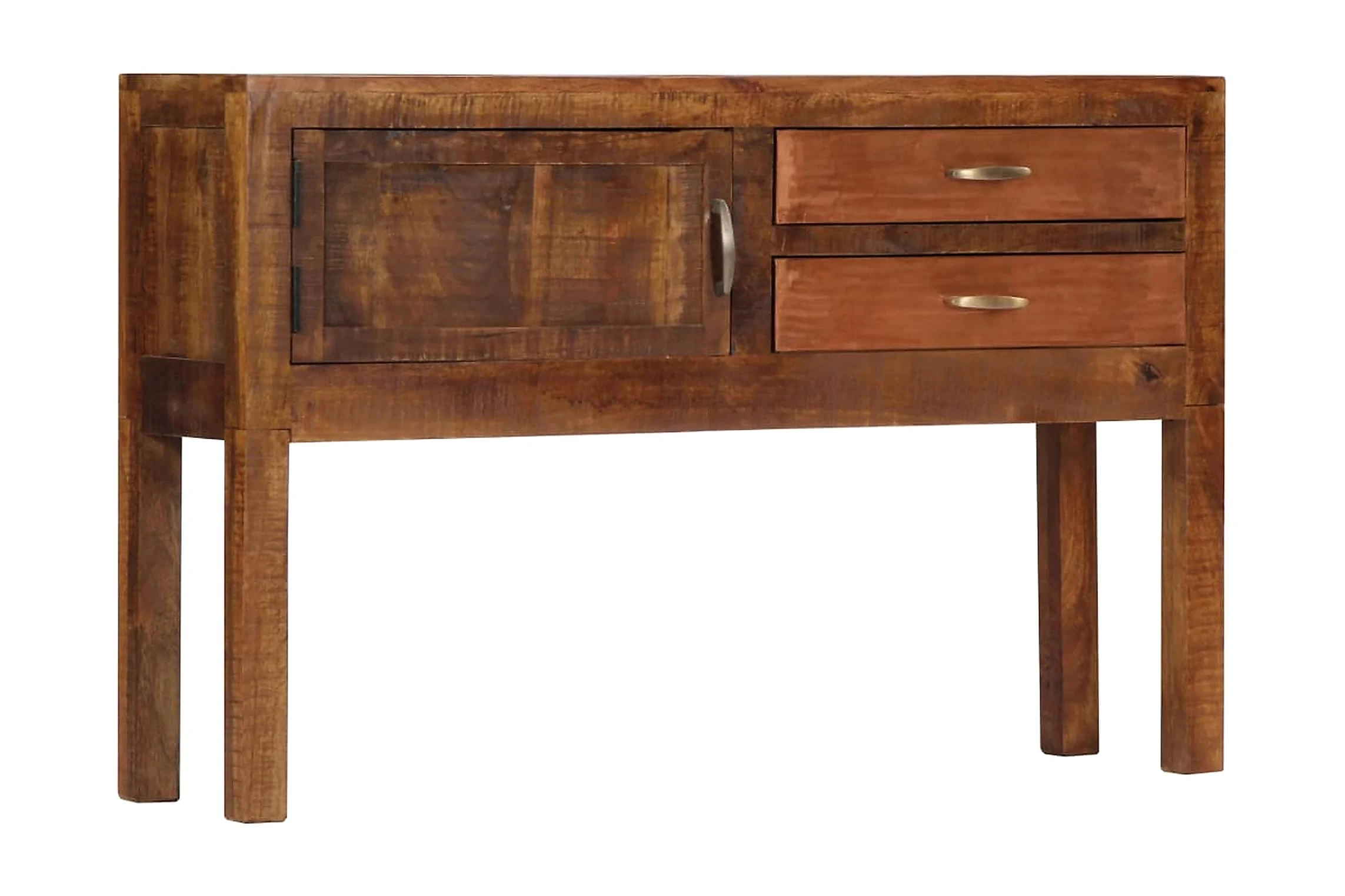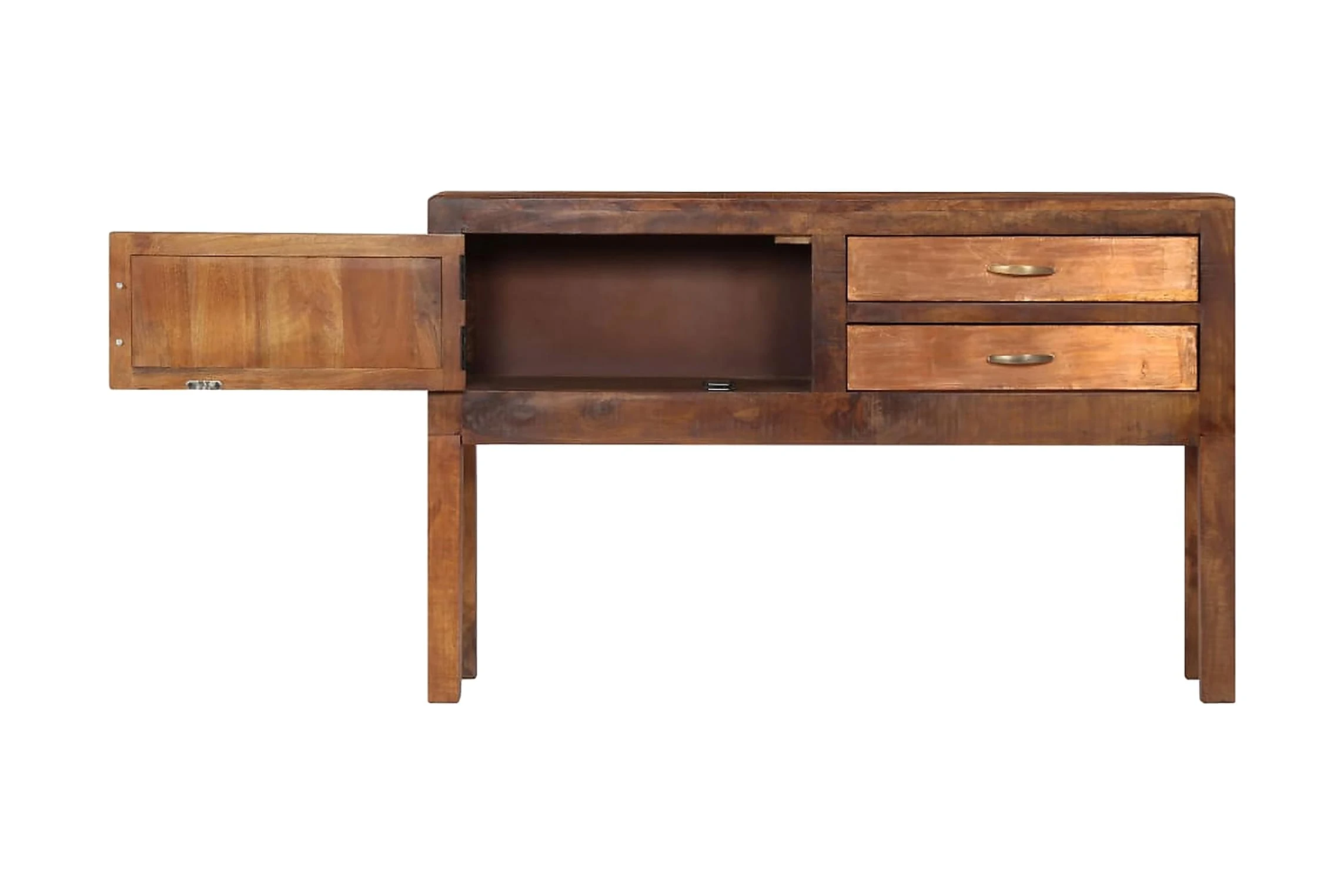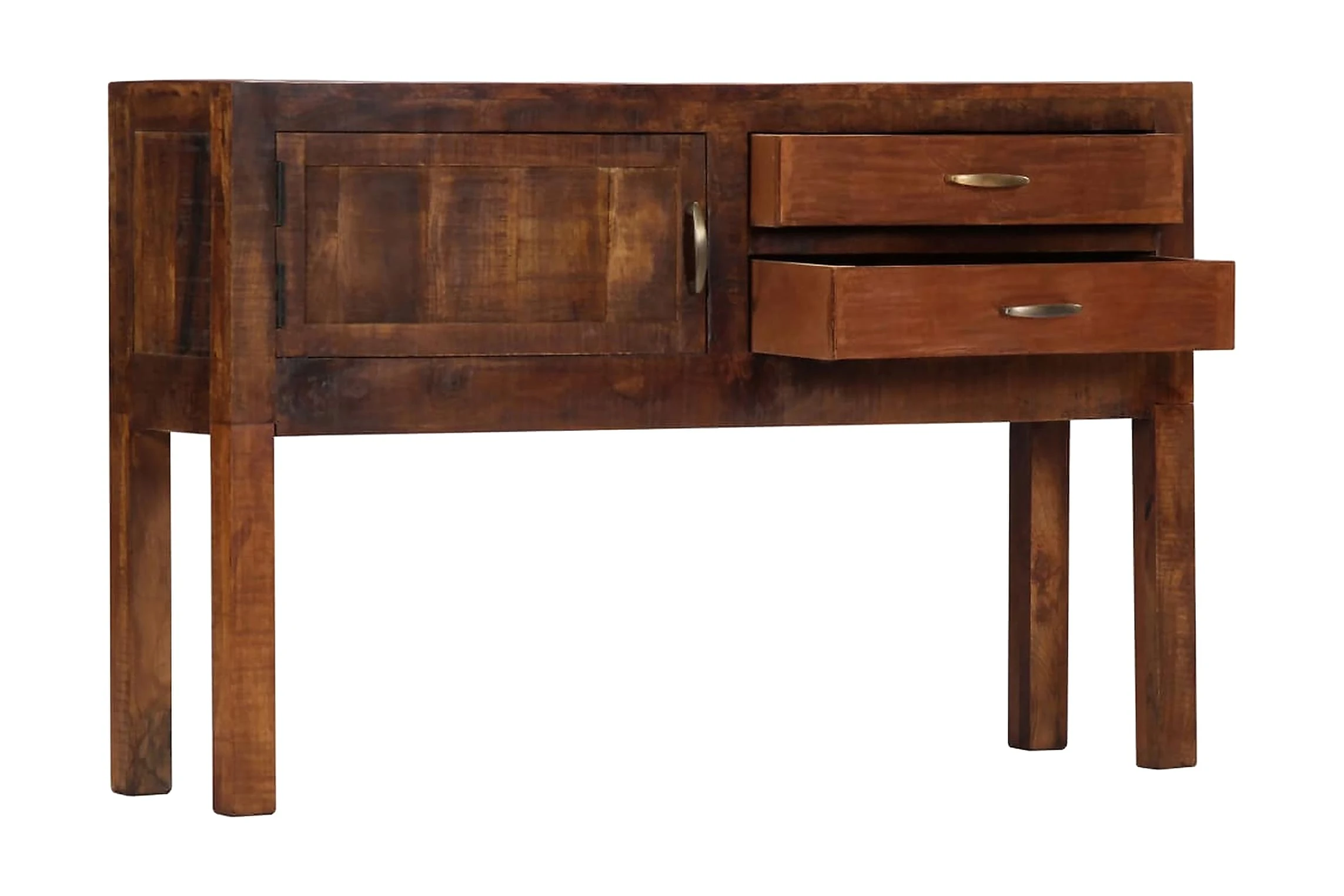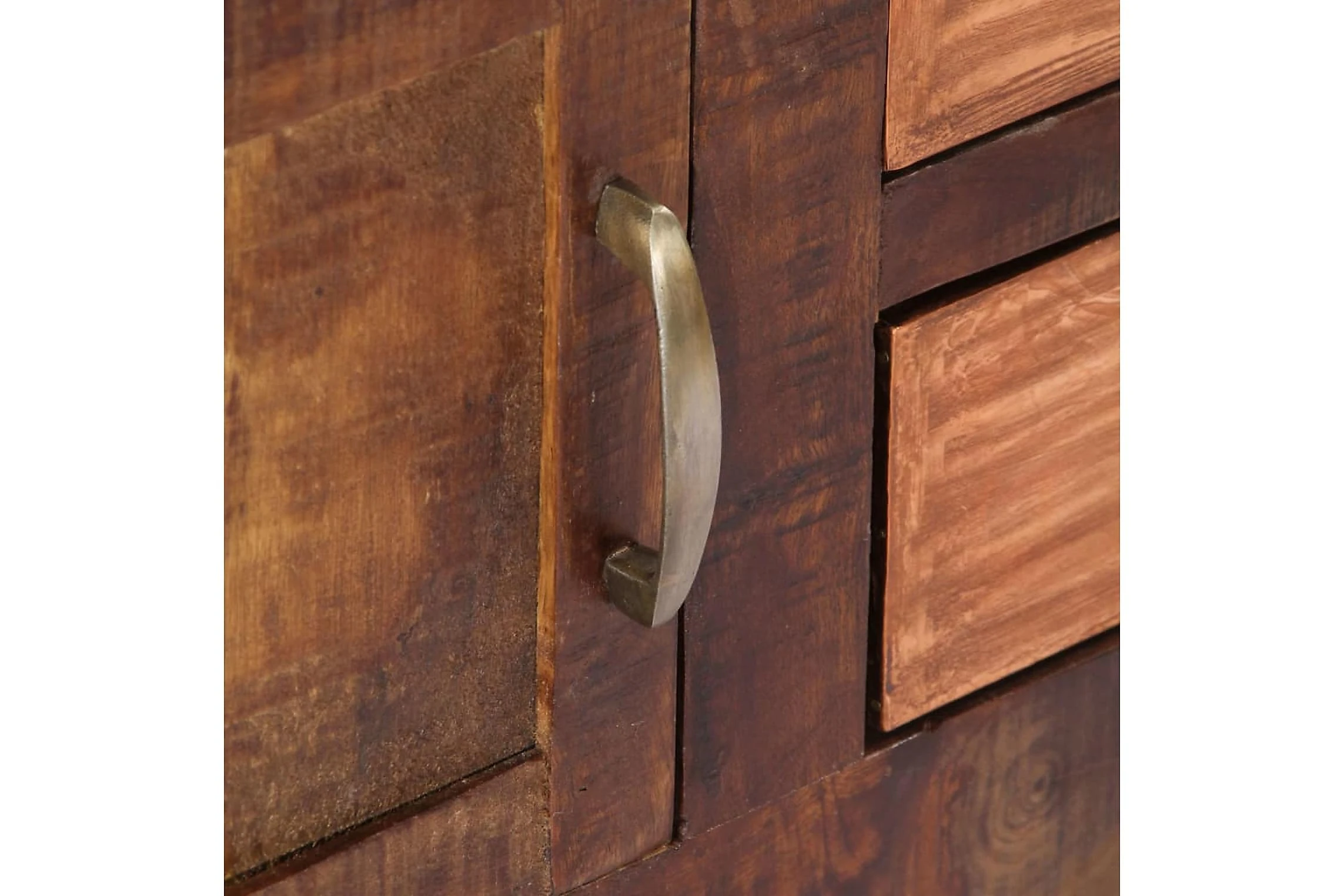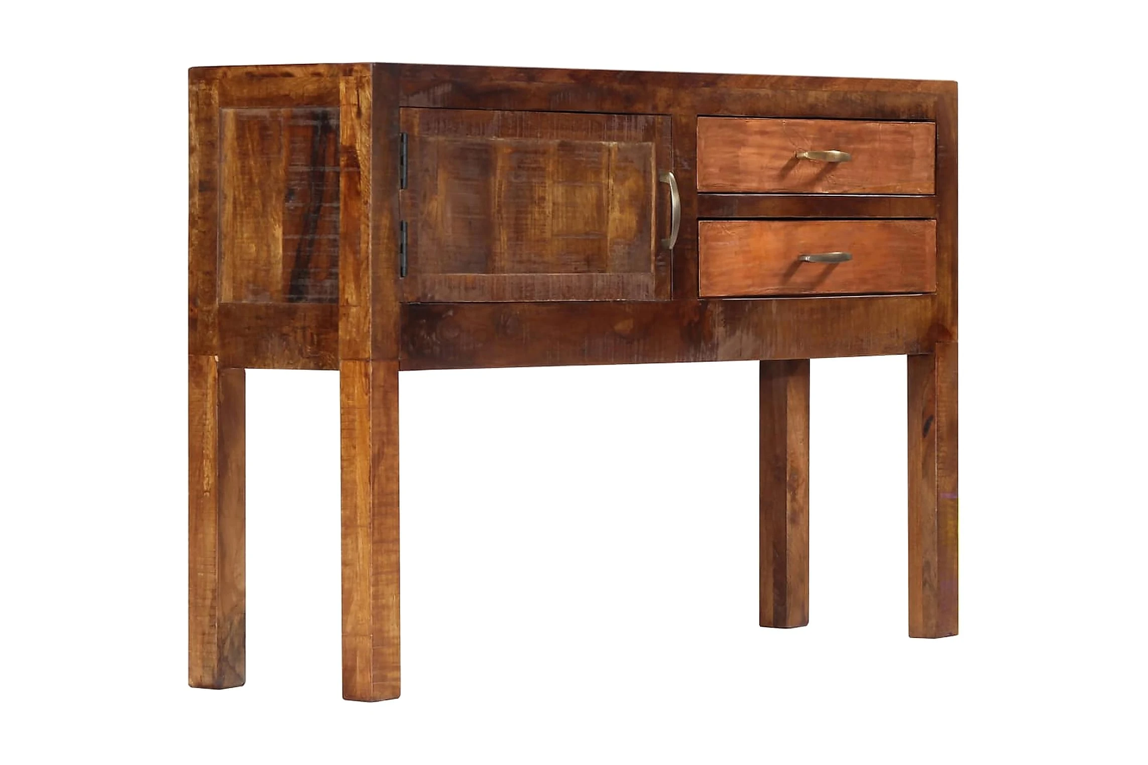 Detta vintageskåp är tillverkat av massivt mangoträ, ett lövträ med täta ådringar. Grovt mangoträ har inte bara styrkan att bära vikten, utan behåller även sin hållbarhet under många år. Därför är detta skåp ytterst stabilt, hållbart och iögonfallande. Det förstklassiga hantverket och de eleganta träådringarna gör varje möbel distinkt och något annorlunda än nästa. Detta träskåp har 2 lådor och 1 skåp med dörr, som har gott om förvaringsutrymme för dina kläder, böcker och andra saker.
