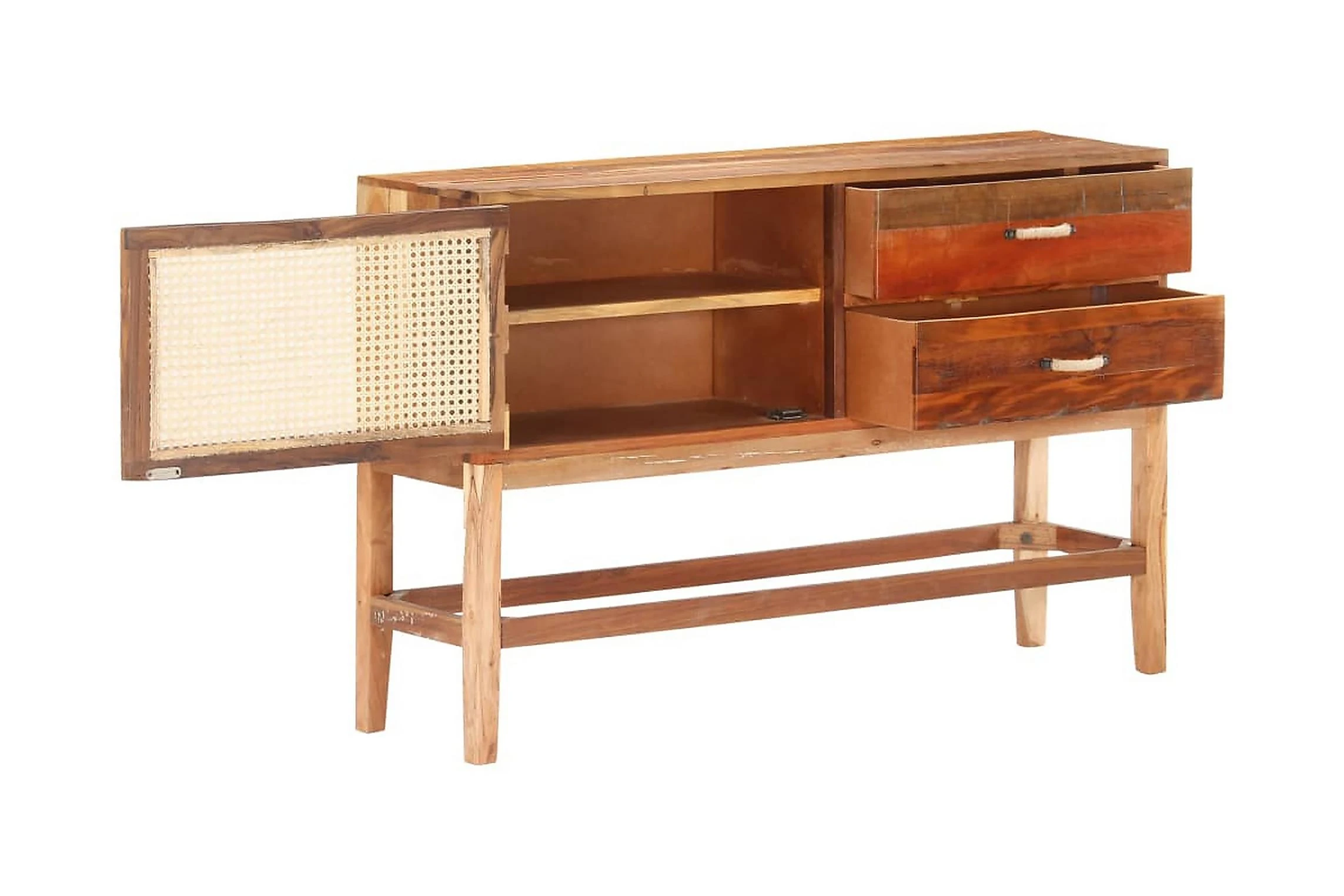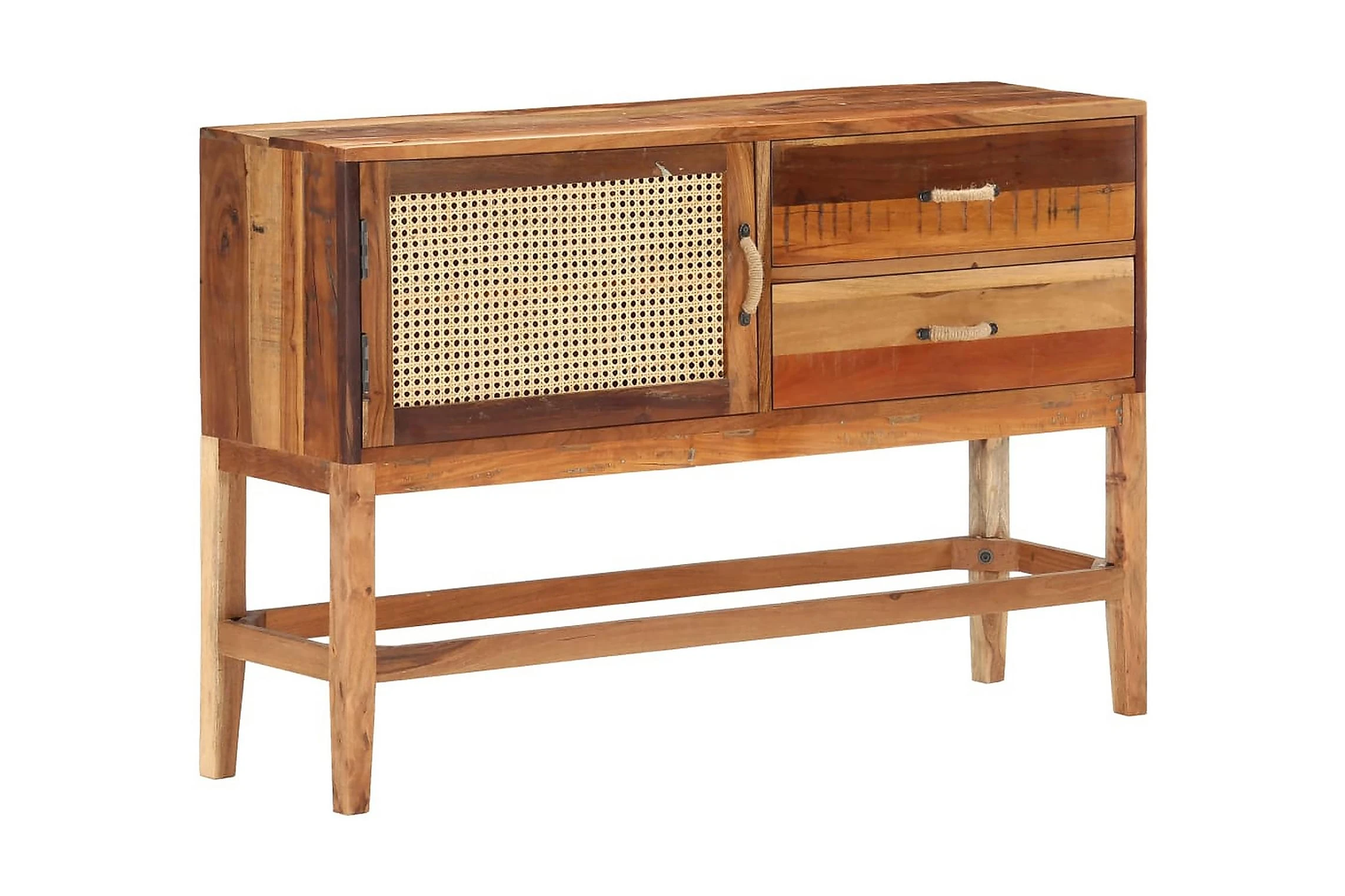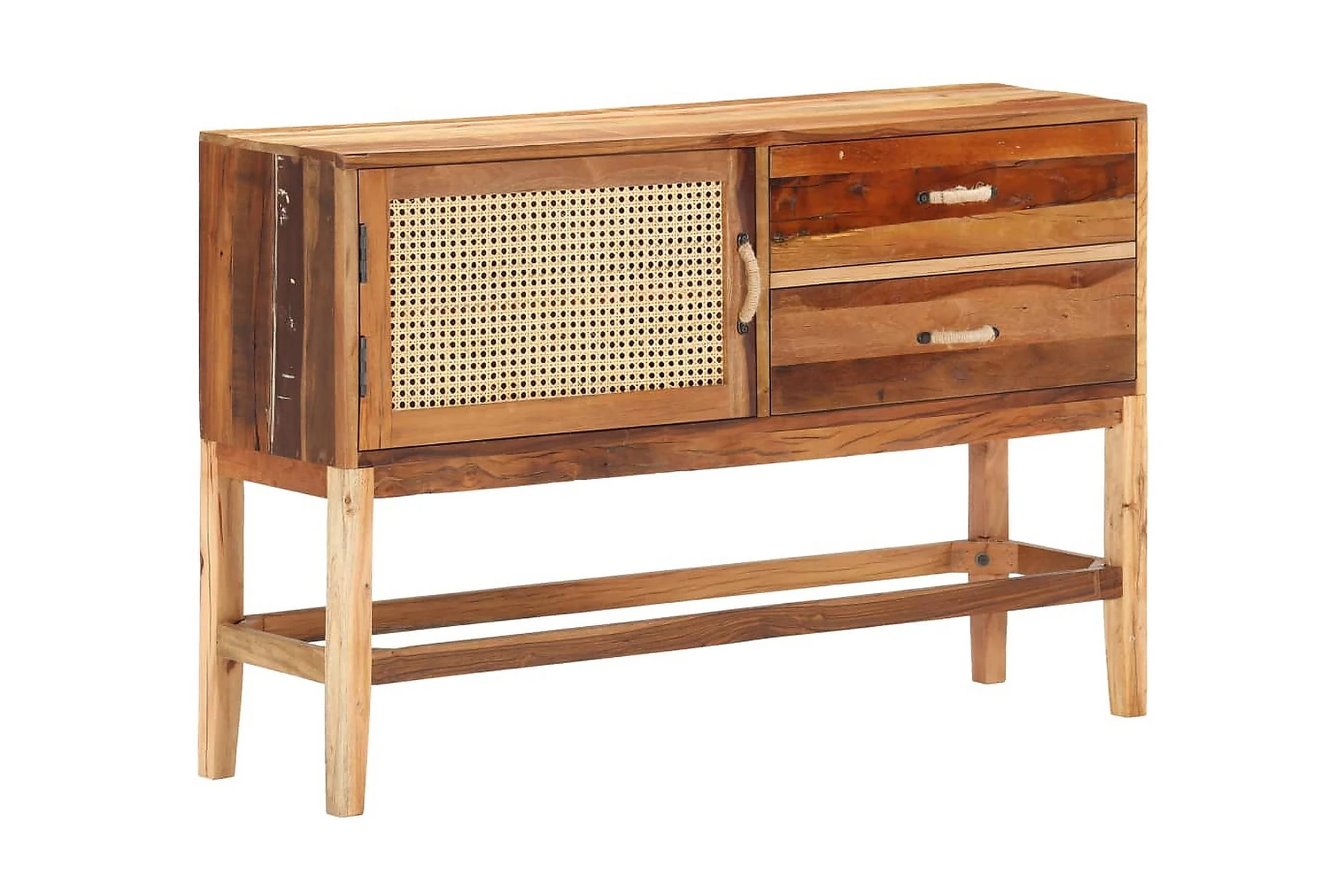 Skänken i trä är tillverkad i massivt återvunnet trä som har samlats in från reglar, golv och balkar från gamla byggnader som har rivits, och kan bestå av olika typer av trä såsom teak, lövträ, tropiskt trä, mangoträ med mera. Detta innebär att det återvunna träet behåller egenskaperna från dessa olika träslag. Återvunnet trä är redan åldrat, vittrat och torkat, så det varken krymper eller böjs. Framdörren är gjord av naturlig rotting. Detta skåp är helt handgjort och de fina träådringarna gör varje möbel unik och något olik de andra. Varje steg i processen utförs med otrolig omsorg, vare sig det är polering, målning eller lackering. Detta förvaringsskåp ger dig plats att förvara böcker, anteckningsböcker, pennor och andra småsaker. Sidoskåpet är även enkelt att montera.