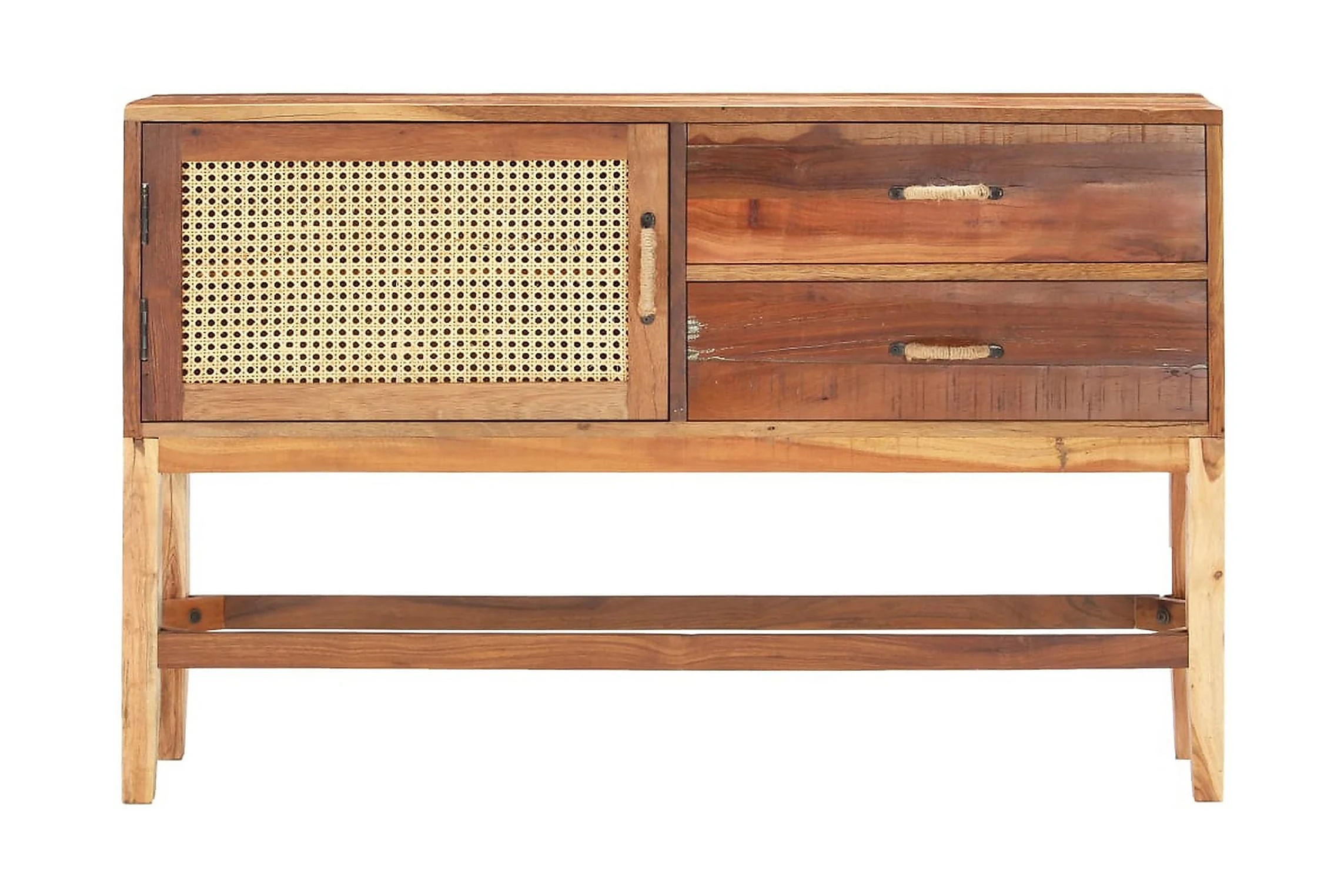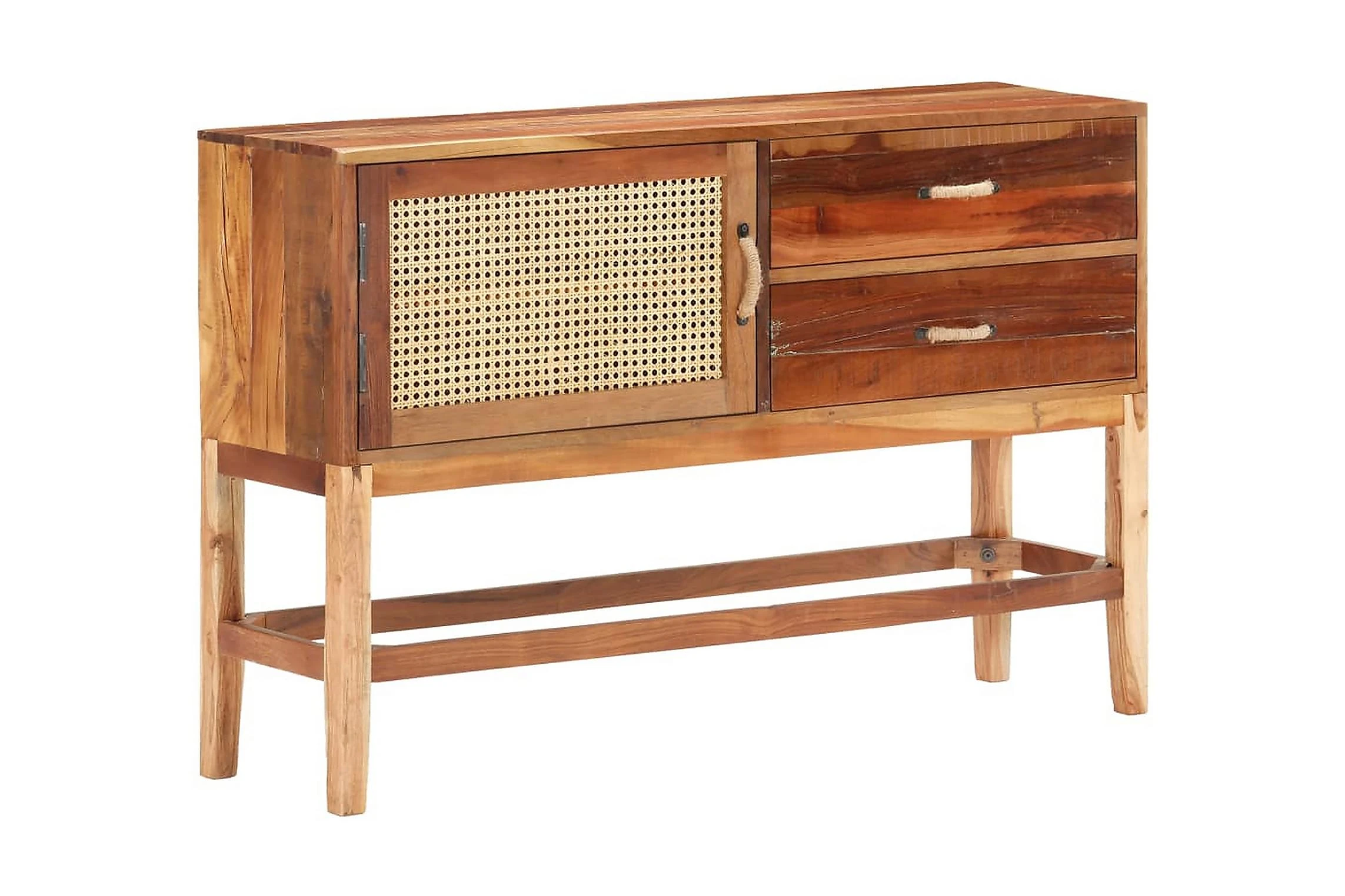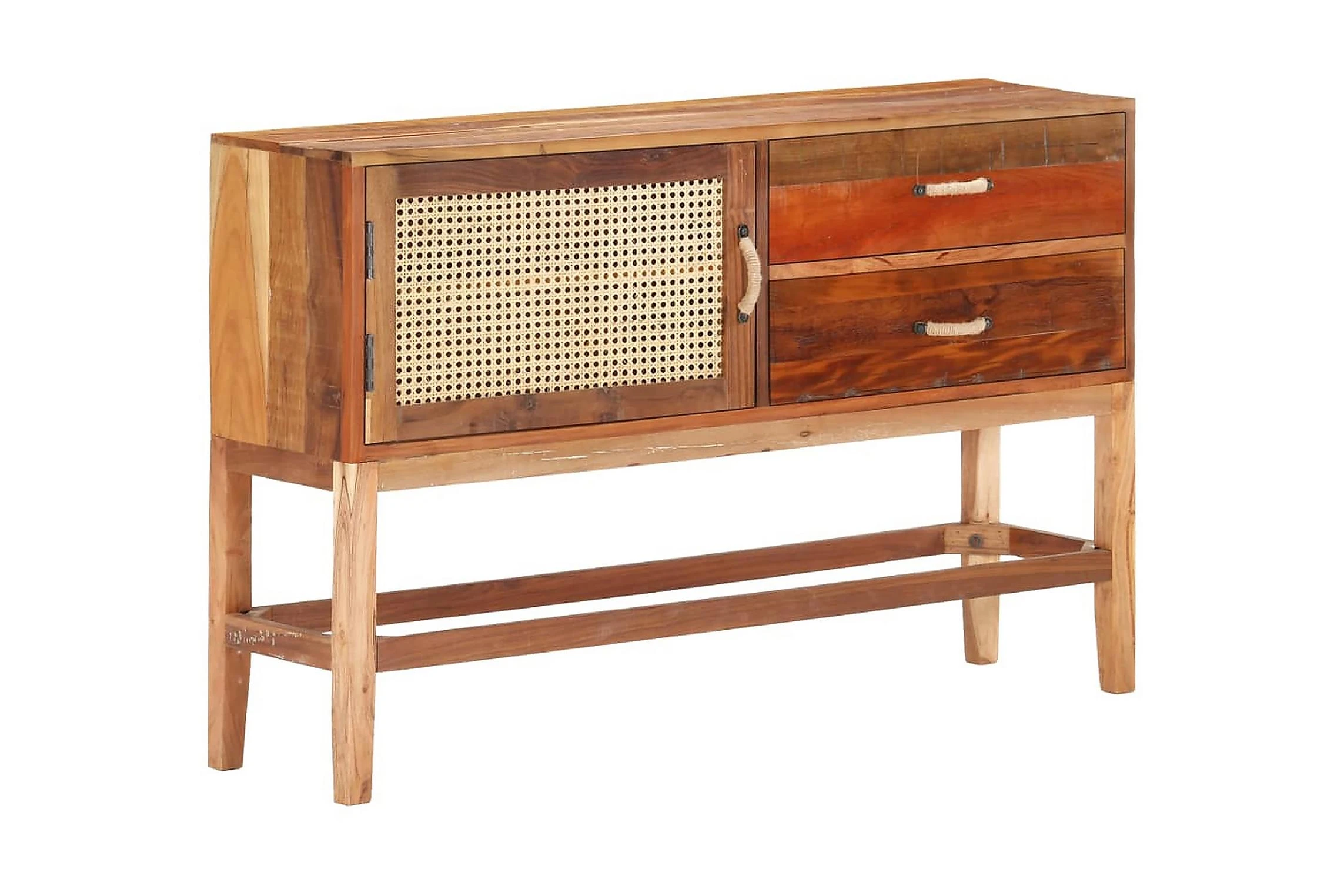 Skänken i trä är tillverkad i massivt återvunnet trä som har samlats in från reglar, golv och balkar från gamla byggnader som har rivits, och kan bestå av olika typer av trä såsom teak, lövträ, tropiskt trä, mangoträ med mera. Detta innebär att det återvunna träet behåller egenskaperna från dessa olika träslag. Återvunnet trä är redan åldrat, vittrat och torkat, så det varken krymper eller böjs. Framdörren är gjord av naturlig rotting. Detta skåp är helt handgjort och de fina träådringarna gör varje möbel unik och något olik de andra. Varje steg i processen utförs med otrolig omsorg, vare sig det är polering, målning eller lackering. Detta förvaringsskåp ger dig plats att förvara böcker, anteckningsböcker, pennor och andra småsaker. Sidoskåpet är även enkelt att montera.