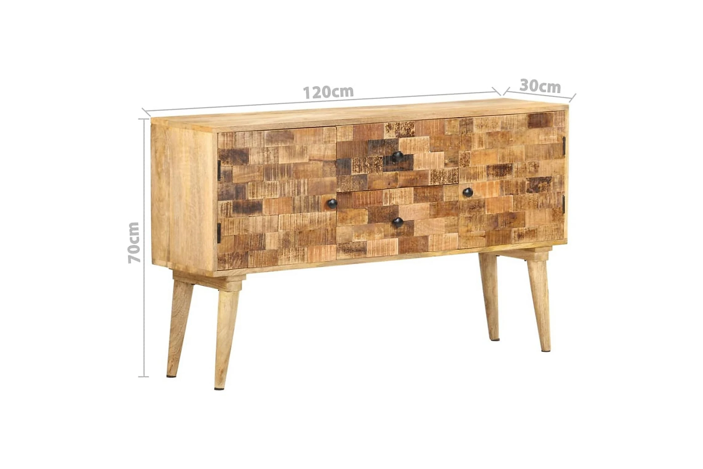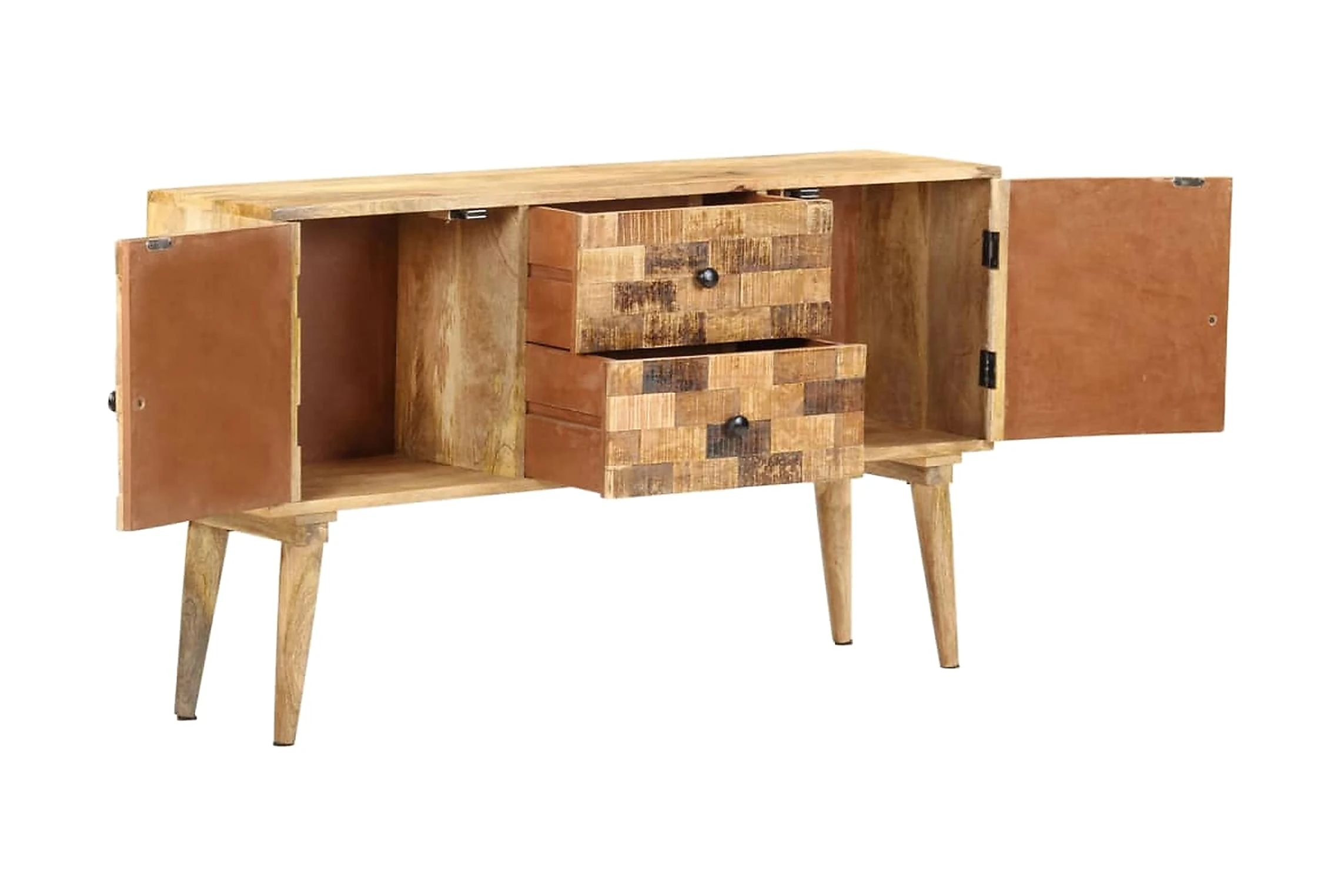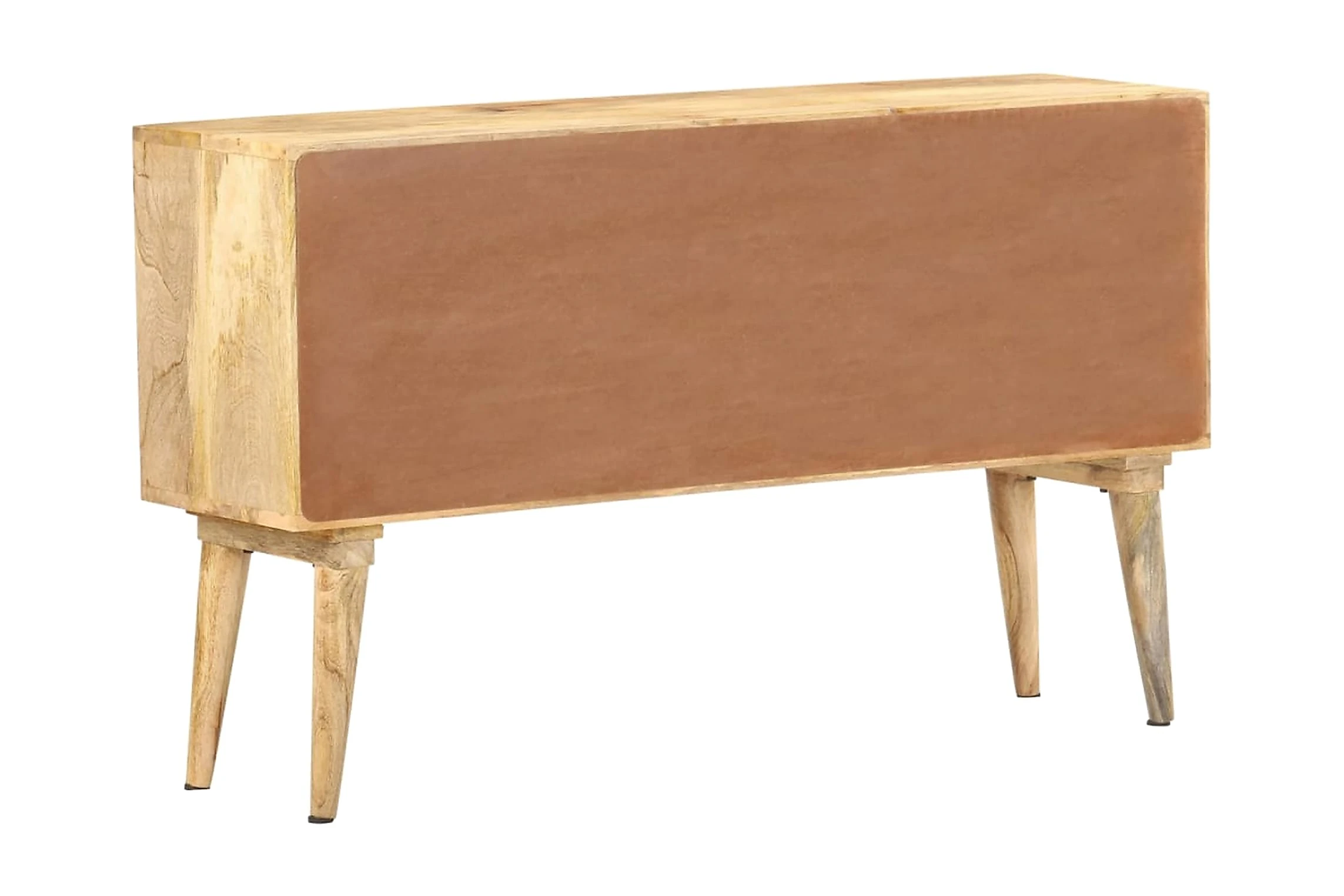 Skänken är tillverkad i massivt mangoträ, ett tropiskt lövträ som är starkt nog att bära vikten. Det står även emot tidens tand, vilket gör det stabilt och hållbart. Den tåliga ovansidan är perfekt att ställa dekorativa föremål, såsom vaser och fotoramar på. Skänken har även 2 dörrar och 2 lådor med gott om förvaringsplats för att hålla viktiga saker i ordning och inom räckhåll.