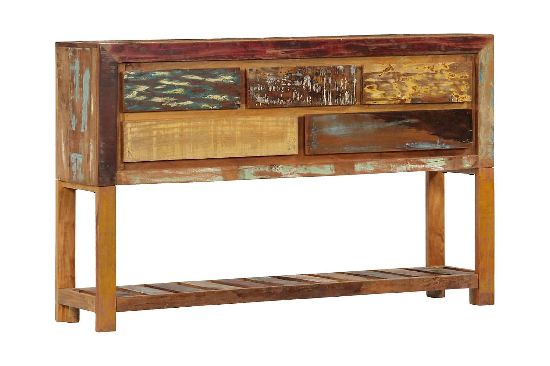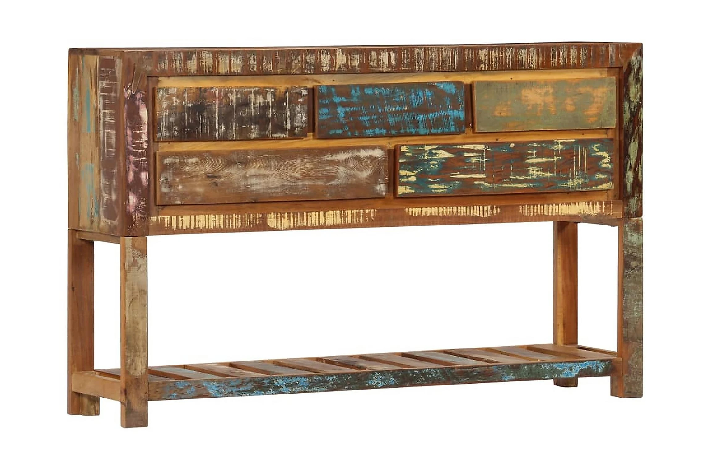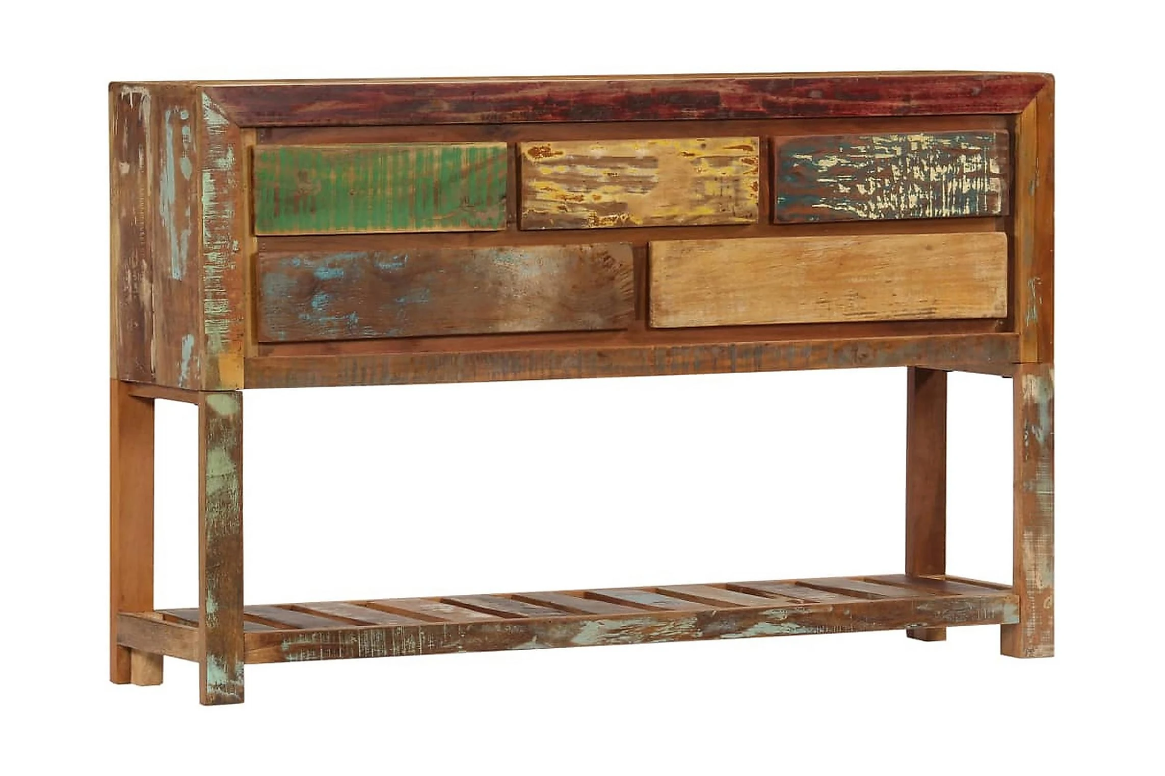 Detta konsolbord är tillverkat i massivt återvunnet trä som har samlats in från reglar, golv och balkar från gamla byggnader som rivits och består av olika typer av trä såsom furu, teak, björk, ek, ceder, mangoträ, akacia, etc. Detta innebär att det återvunna träet behåller egenskaperna från dessa olika träslag. Återvunnet trä är redan åldrat, vittrat och torkat, så det varken krymper eller böjs. Det förstklassiga hantverket och de eleganta träådringarna gör varje hallbord distinkt och något annorlunda än nästa. Detta sidobord har 5 lådor och 1 låda, vilket ger massor av förvaringsutrymme för dina kläder, böcker och andra saker.