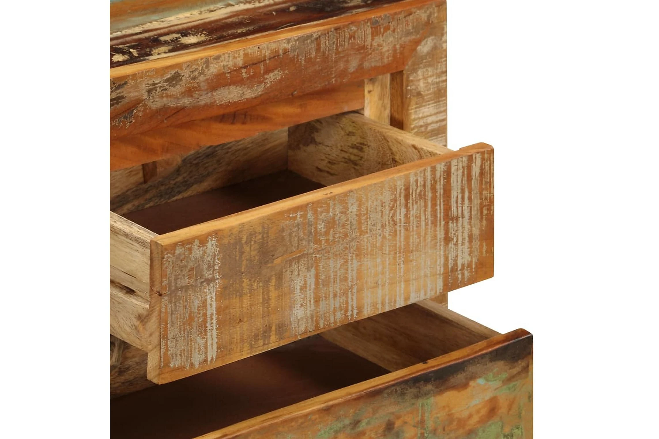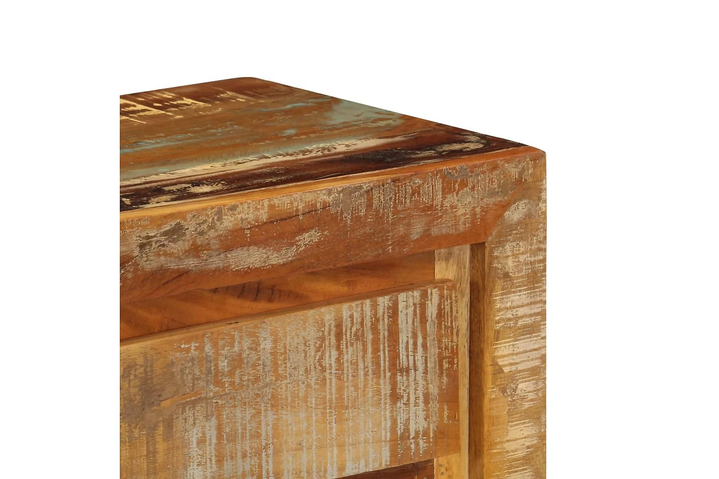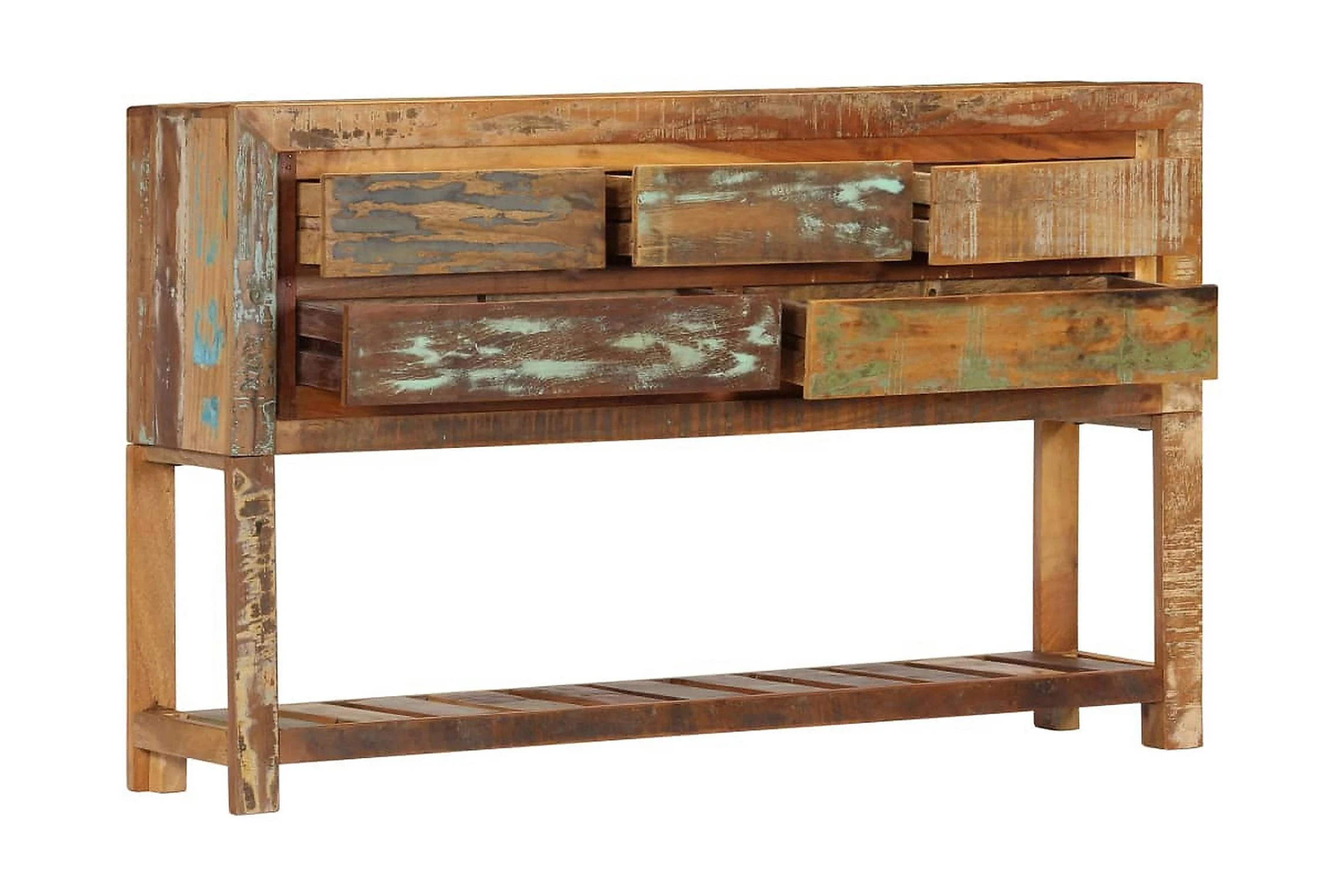 Detta konsolbord är tillverkat i massivt återvunnet trä som har samlats in från reglar, golv och balkar från gamla byggnader som rivits och består av olika typer av trä såsom furu, teak, björk, ek, ceder, mangoträ, akacia, etc. Detta innebär att det återvunna träet behåller egenskaperna från dessa olika träslag. Återvunnet trä är redan åldrat, vittrat och torkat, så det varken krymper eller böjs. Det förstklassiga hantverket och de eleganta träådringarna gör varje hallbord distinkt och något annorlunda än nästa. Detta sidobord har 5 lådor och 1 låda, vilket ger massor av förvaringsutrymme för dina kläder, böcker och andra saker.