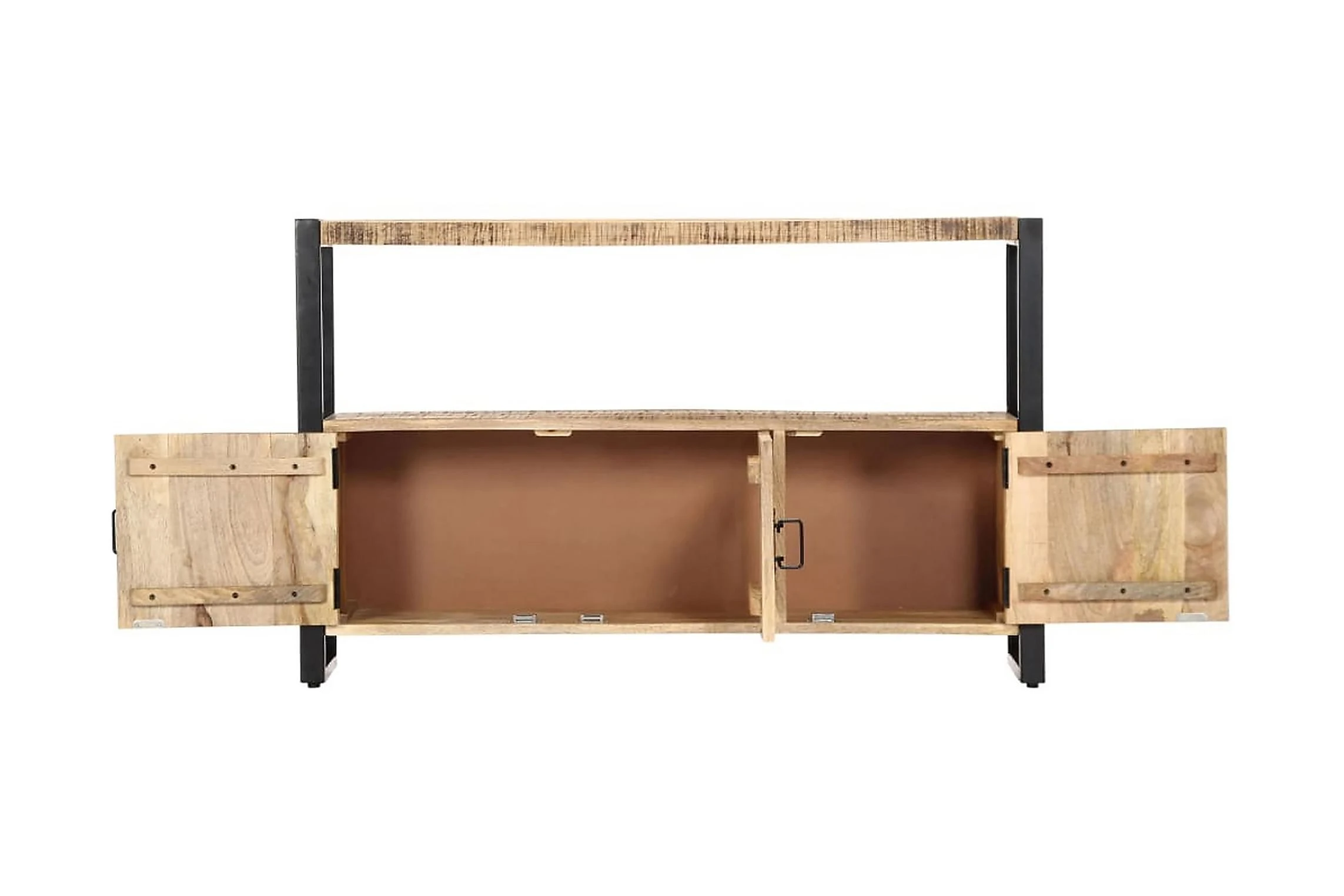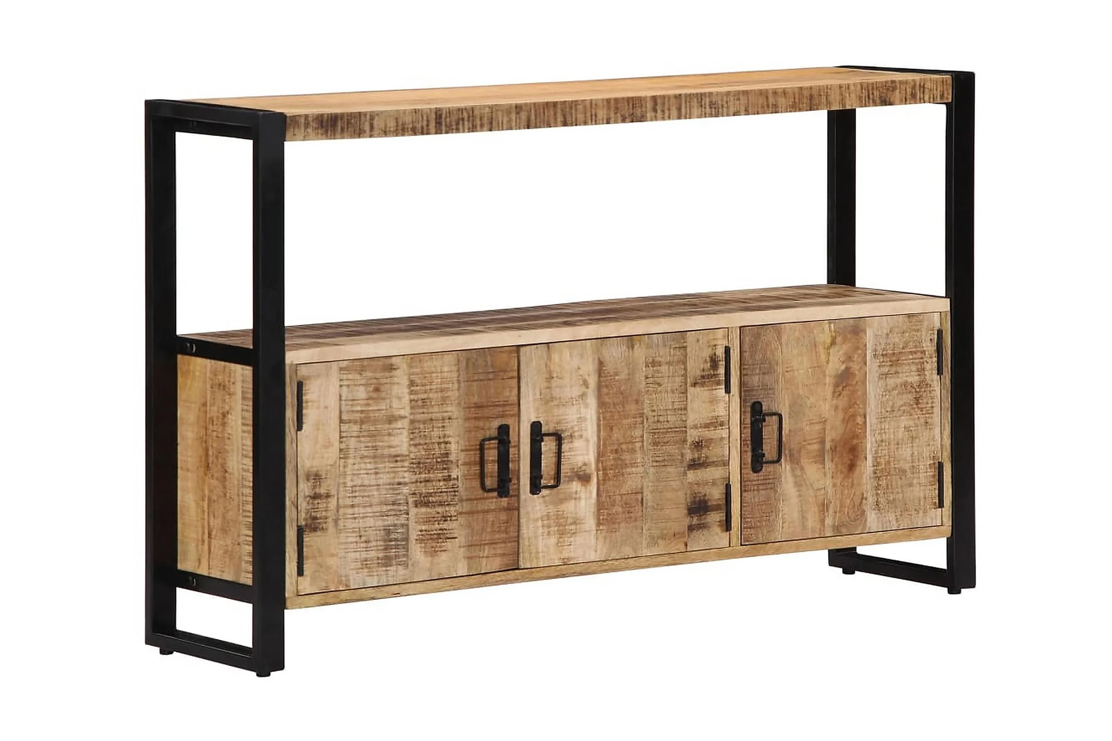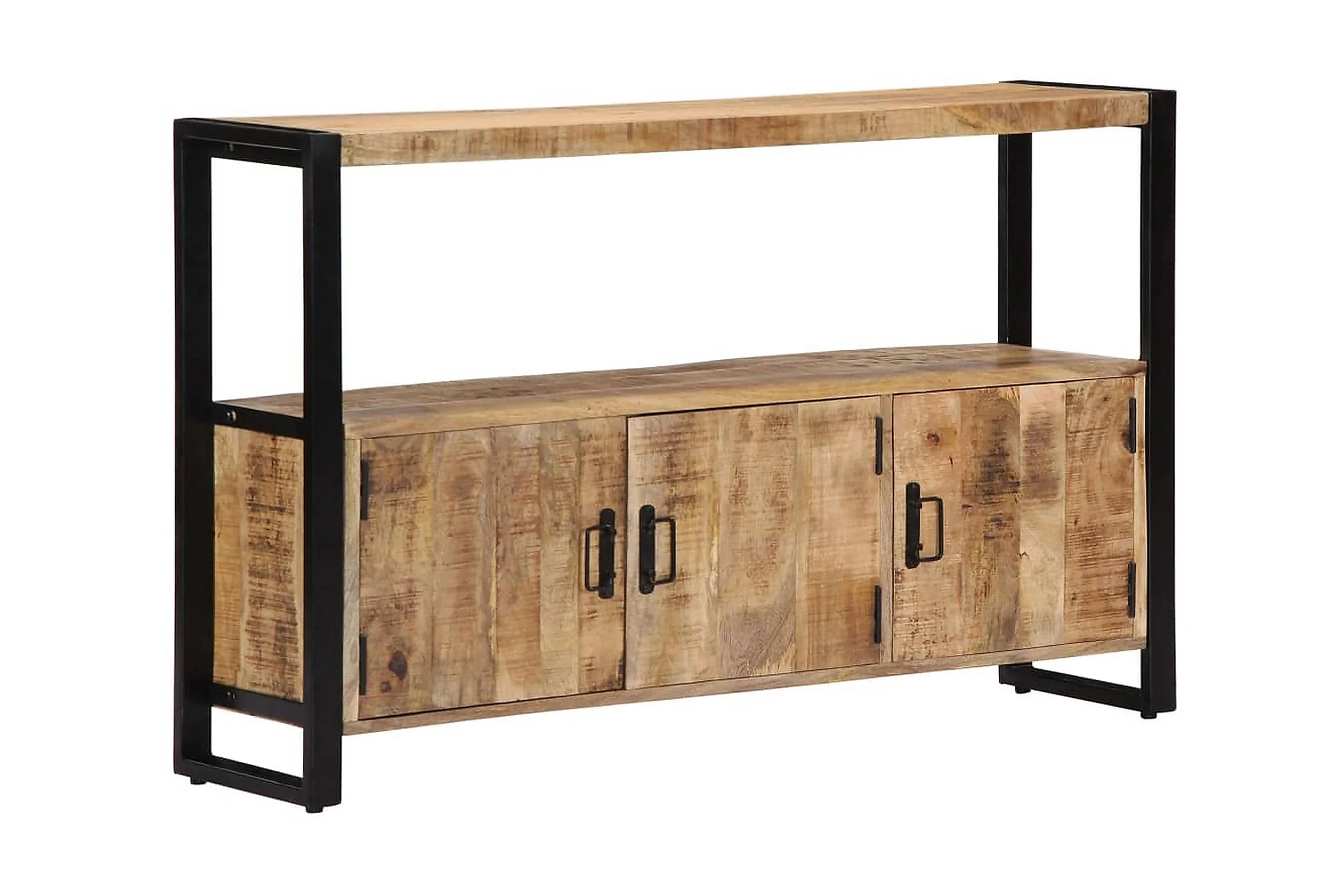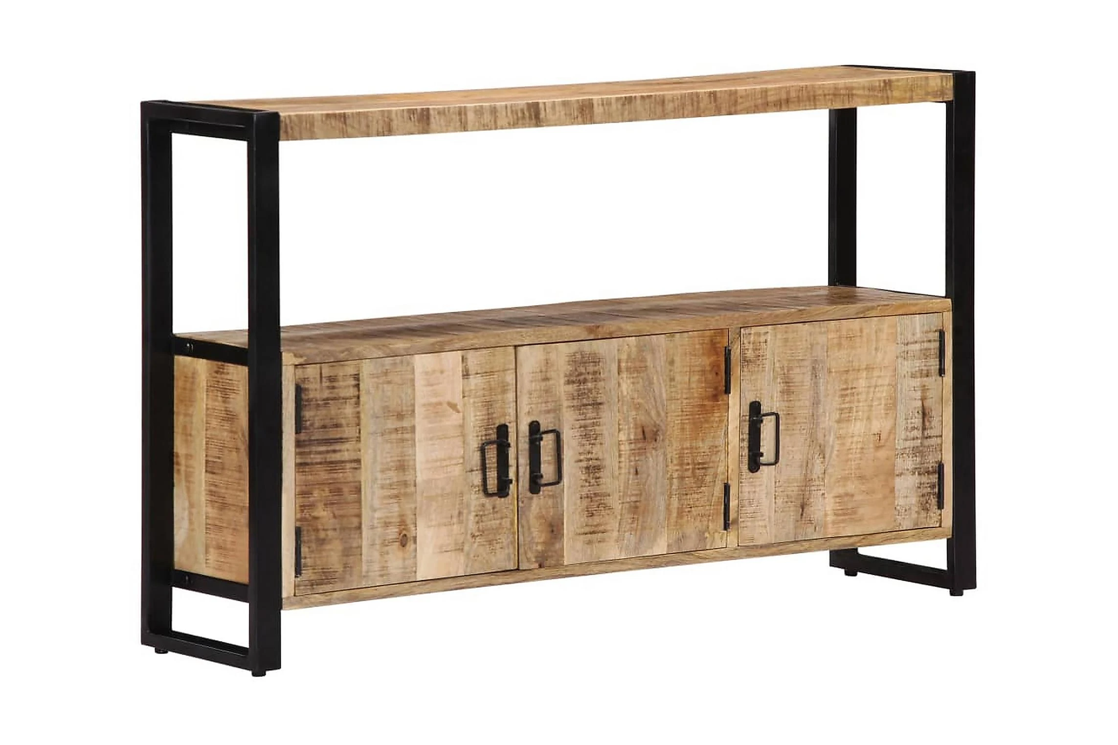 Skåpet är tillverkat i massivt mangoträ, ett lövträ med täta ådringar. Grovt mangoträ har inte bara styrkan att bära vikten, det står även emot tidens tand. Därför är denna vackert designade skänk ytterst stabil, hållbar och iögonfallande. Det skickliga hantverket garanterar att varje steg i processen utförs med största omsorg, vare sig det är polering, målning eller lackering. Den pulverlackerade stålramen bidrar dessutom till skänkens industriella stil och robusthet. Skänken har dessutom 2 skåp med 3 dörrar och 1 utrymme, och därför gott om plats för att förvara dina mediaenheter, kläder, böcker och andra prylar.
