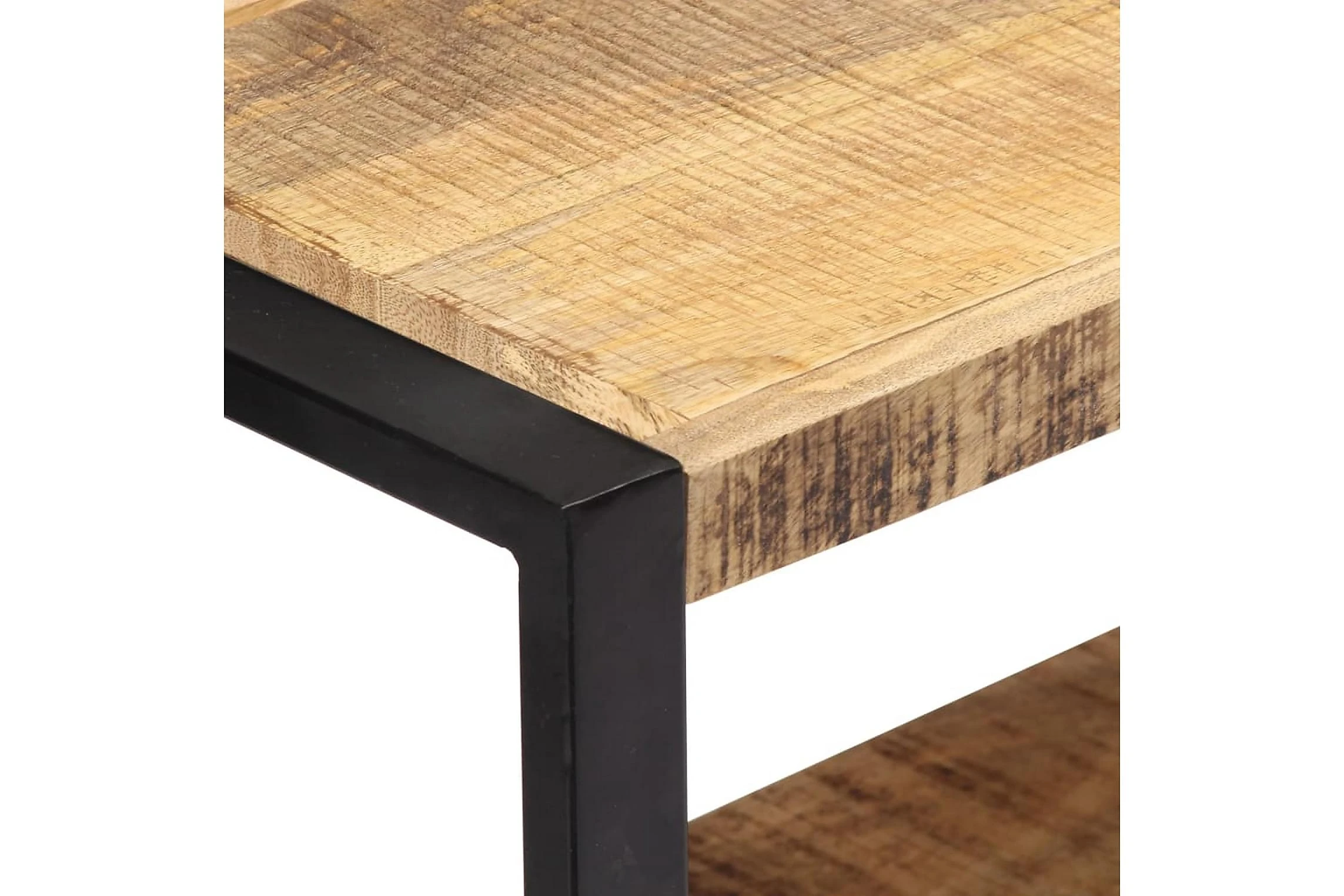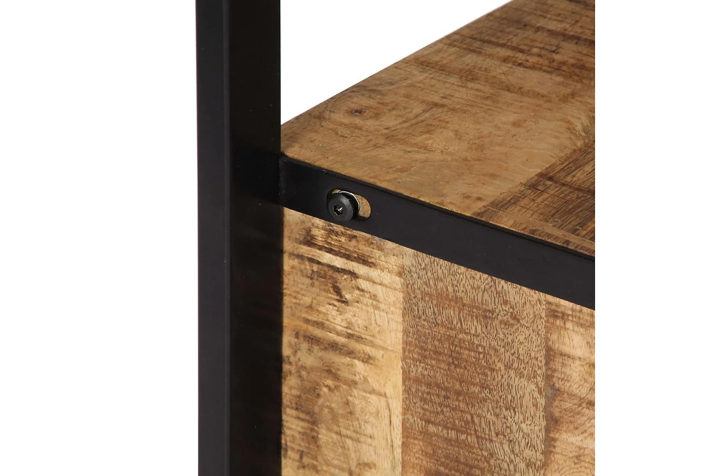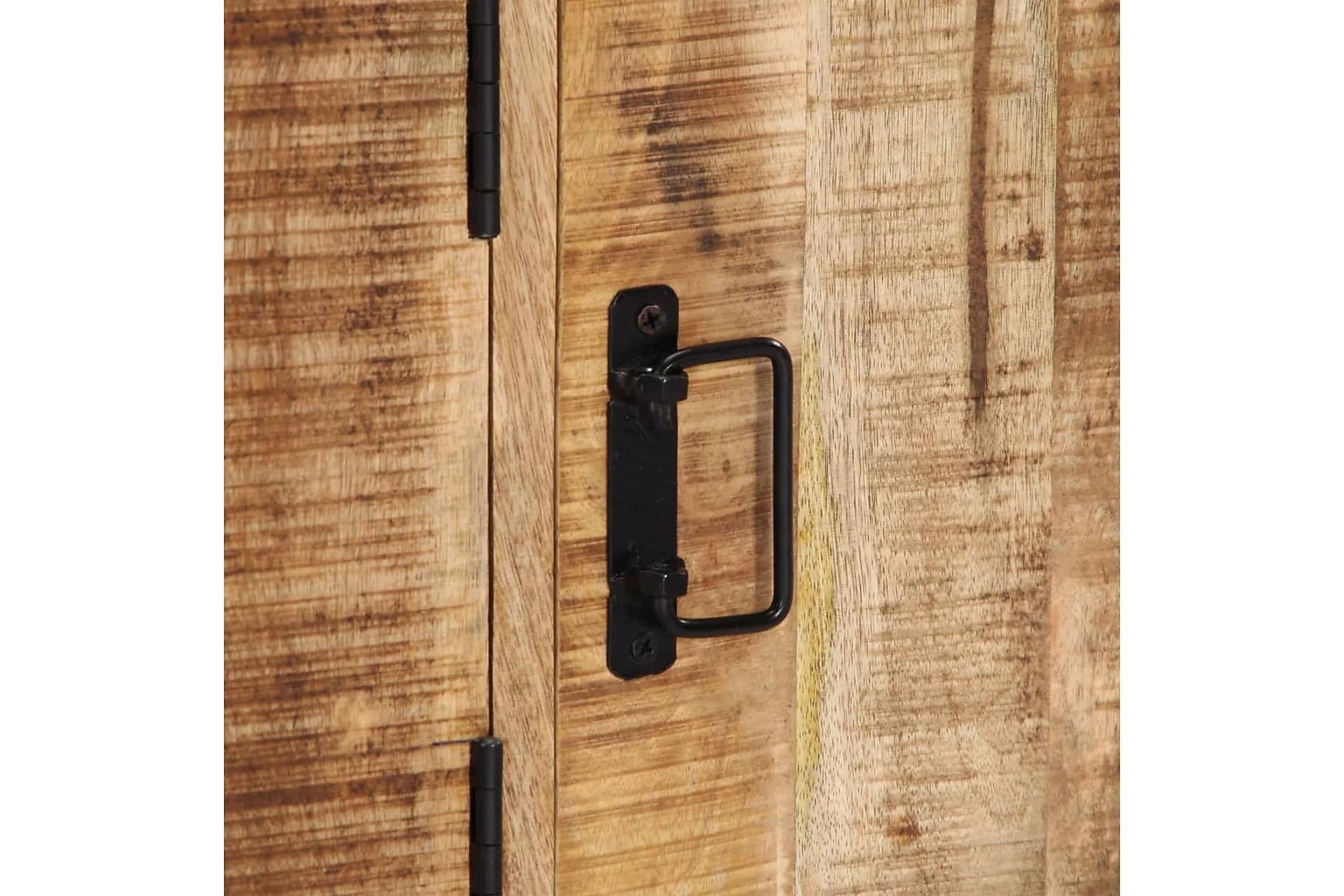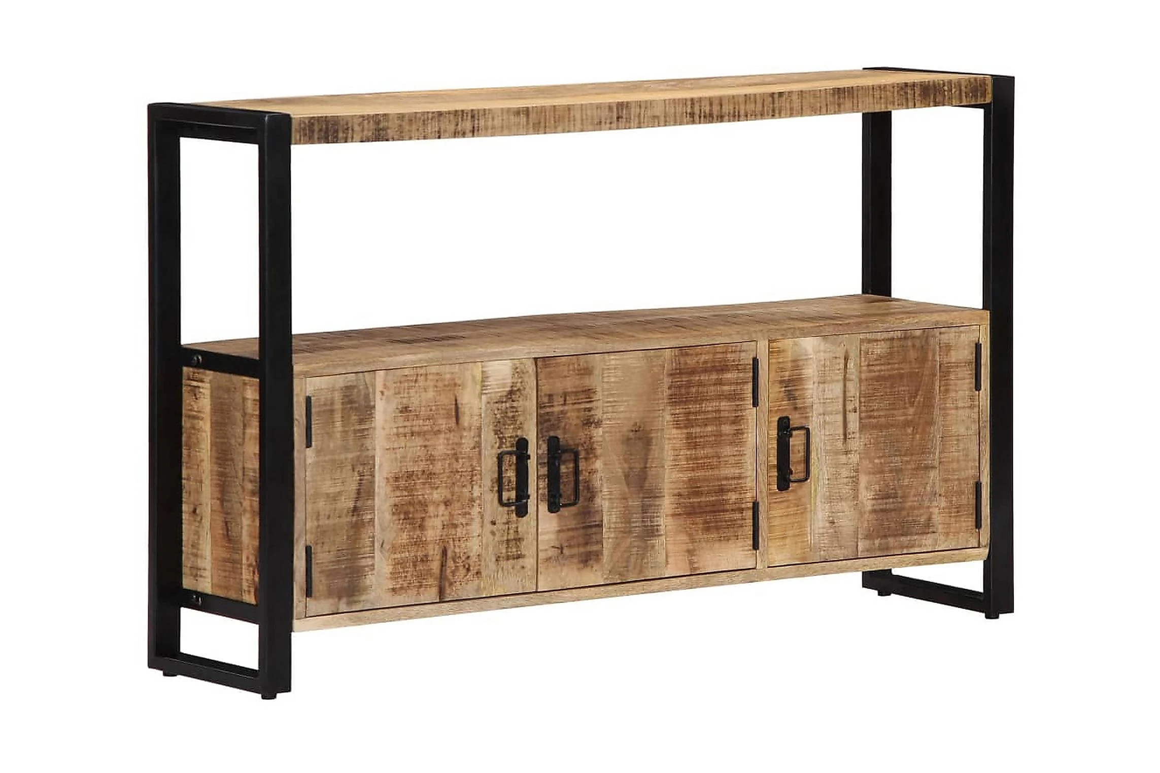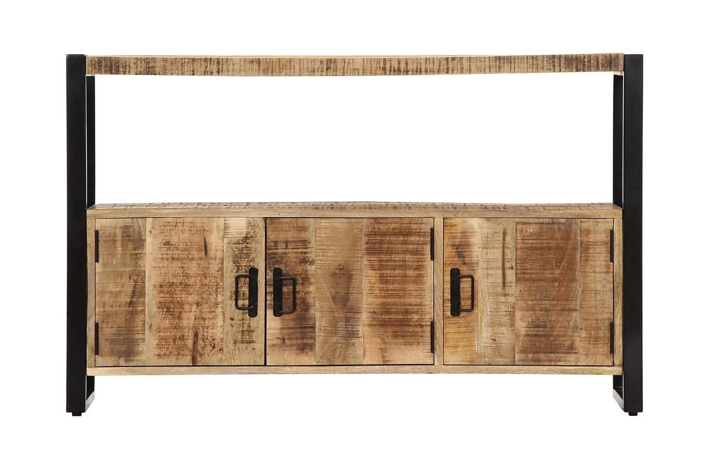 Skåpet är tillverkat i massivt mangoträ, ett lövträ med täta ådringar. Grovt mangoträ har inte bara styrkan att bära vikten, det står även emot tidens tand. Därför är denna vackert designade skänk ytterst stabil, hållbar och iögonfallande. Det skickliga hantverket garanterar att varje steg i processen utförs med största omsorg, vare sig det är polering, målning eller lackering. Den pulverlackerade stålramen bidrar dessutom till skänkens industriella stil och robusthet. Skänken har dessutom 2 skåp med 3 dörrar och 1 utrymme, och därför gott om plats för att förvara dina mediaenheter, kläder, böcker och andra prylar.