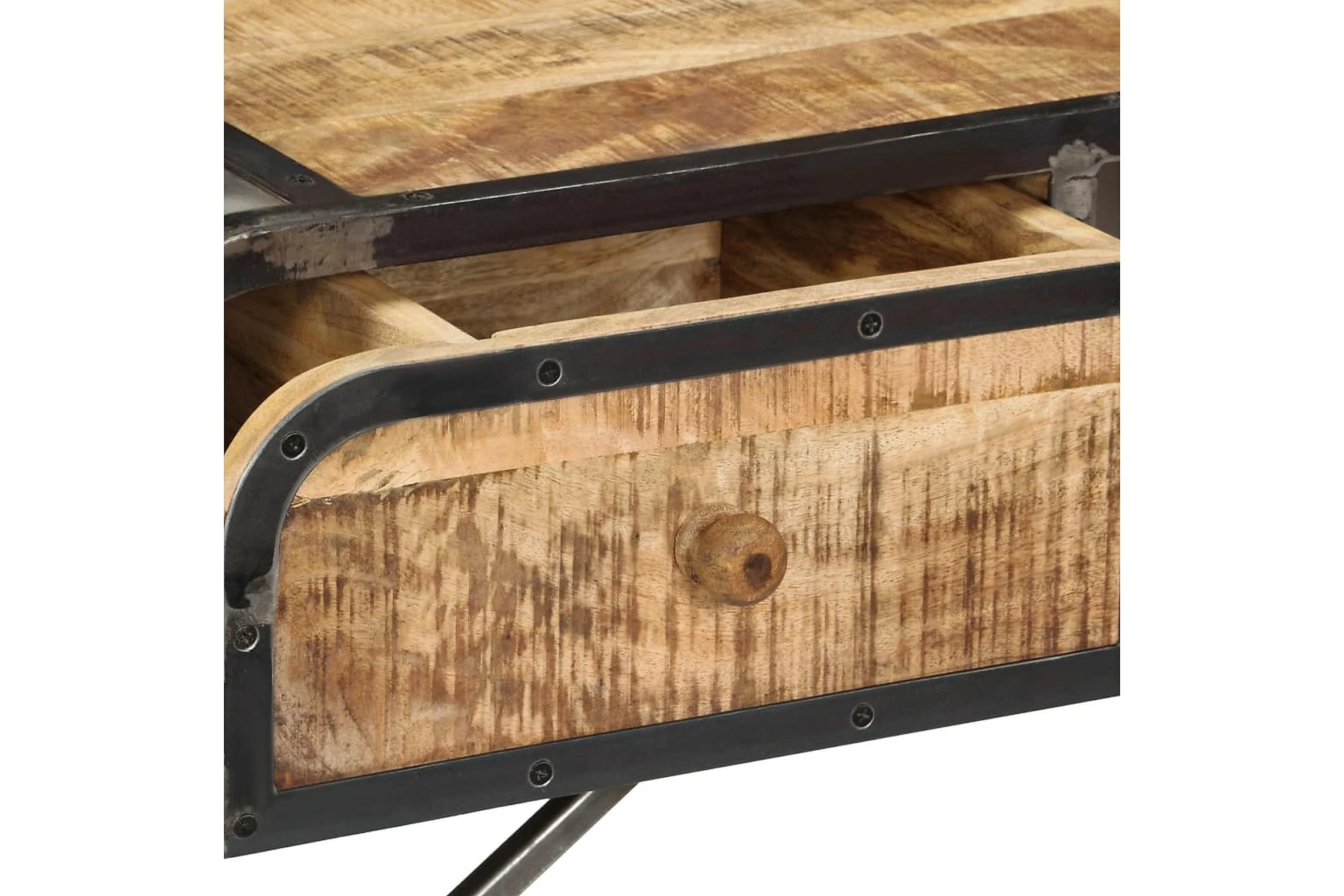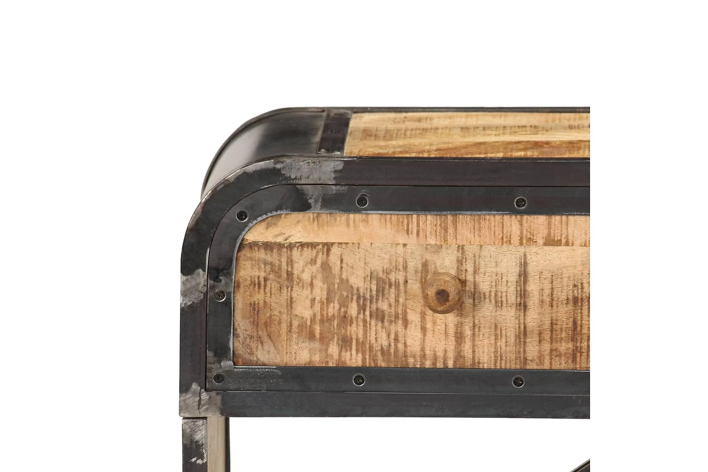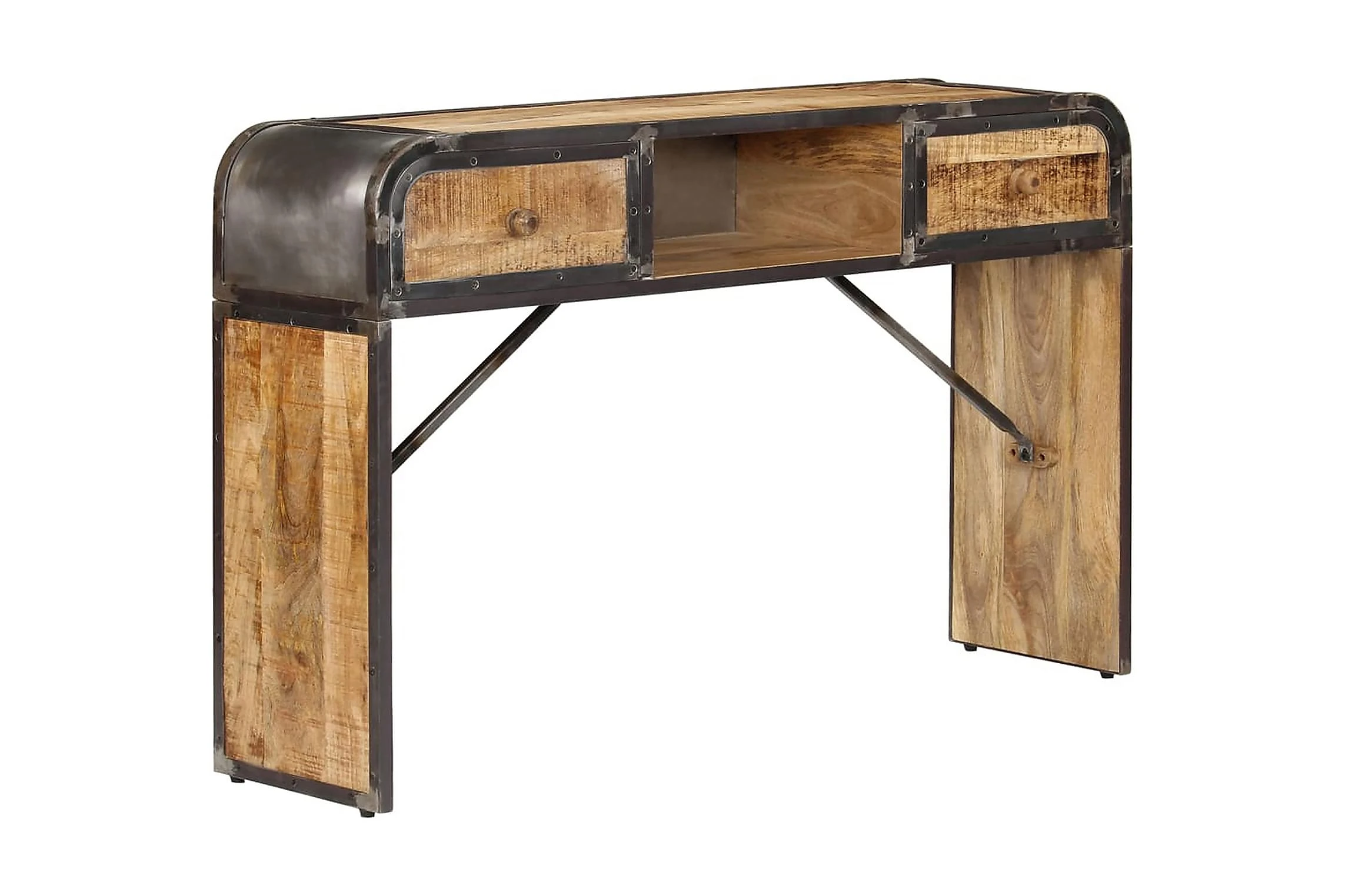 Detta konsolbord är tillverkat i massivt mangoträ, ett lövträ med rika ådringar. Grovt mangoträ är inte bara starkt nog för att bära upp vikten, det är också tåligt och hållbart. Därför är detta vackert designade hallbord stabilt, hållbart och iögonfallande. Det mästerliga hantverket garanterar att varje steg i processen utförs med största omsorg, vare sig det är polering eller lackering. Järnramen bidrar till skänkens industriella stil. Sidobordet har dessutom 2 lådor och ett utrymme med gott om plats för att förvara dina böcker och andra saker.