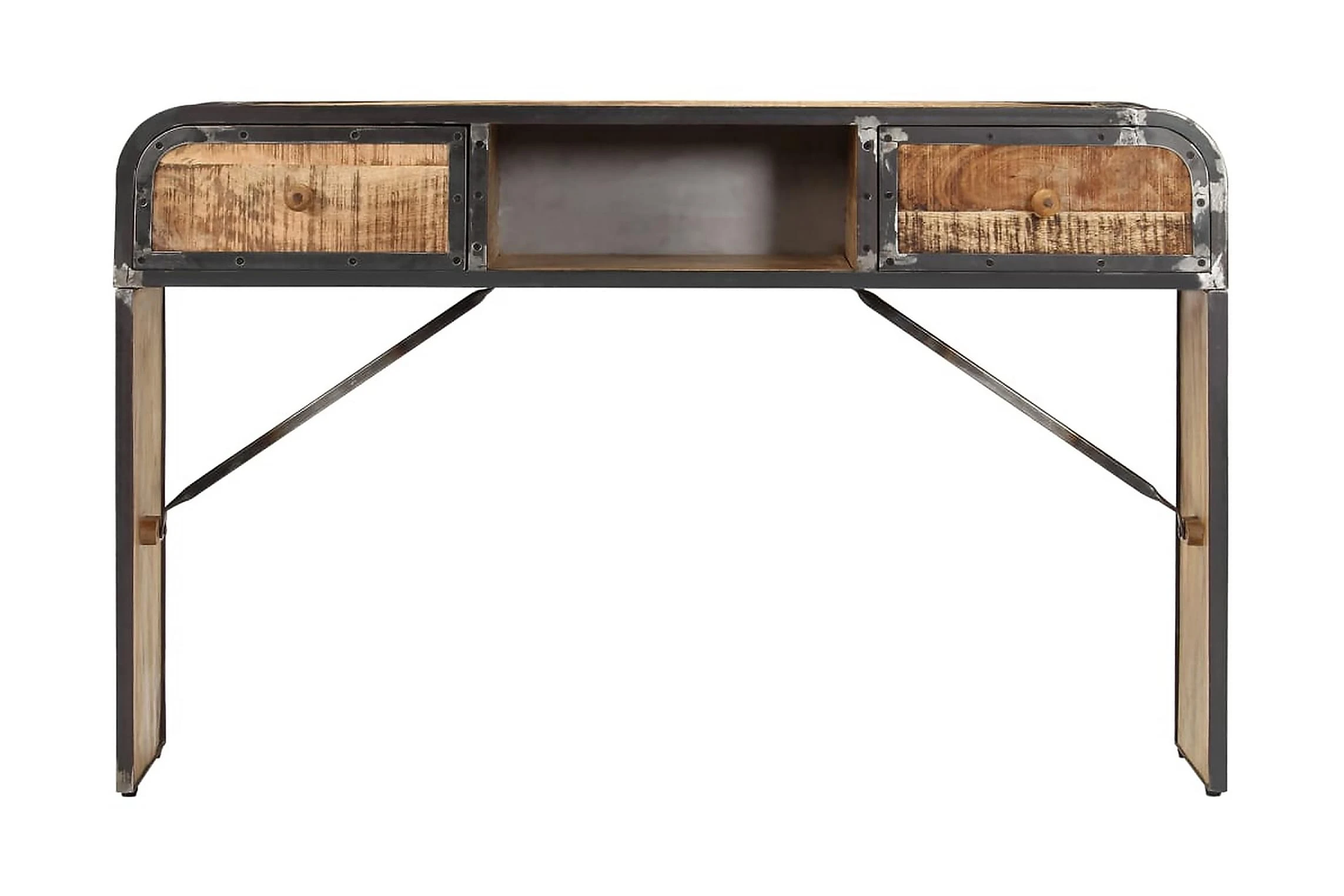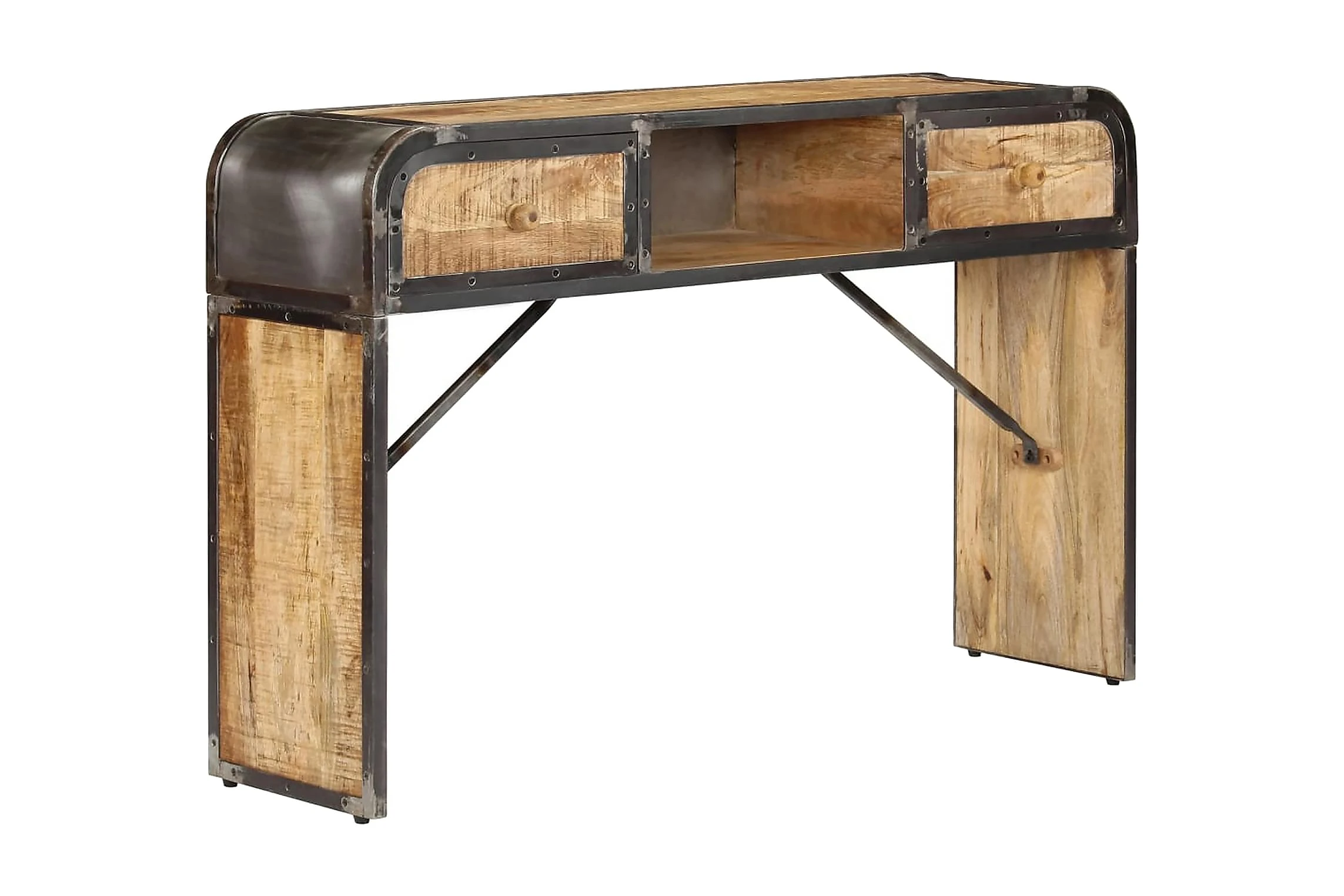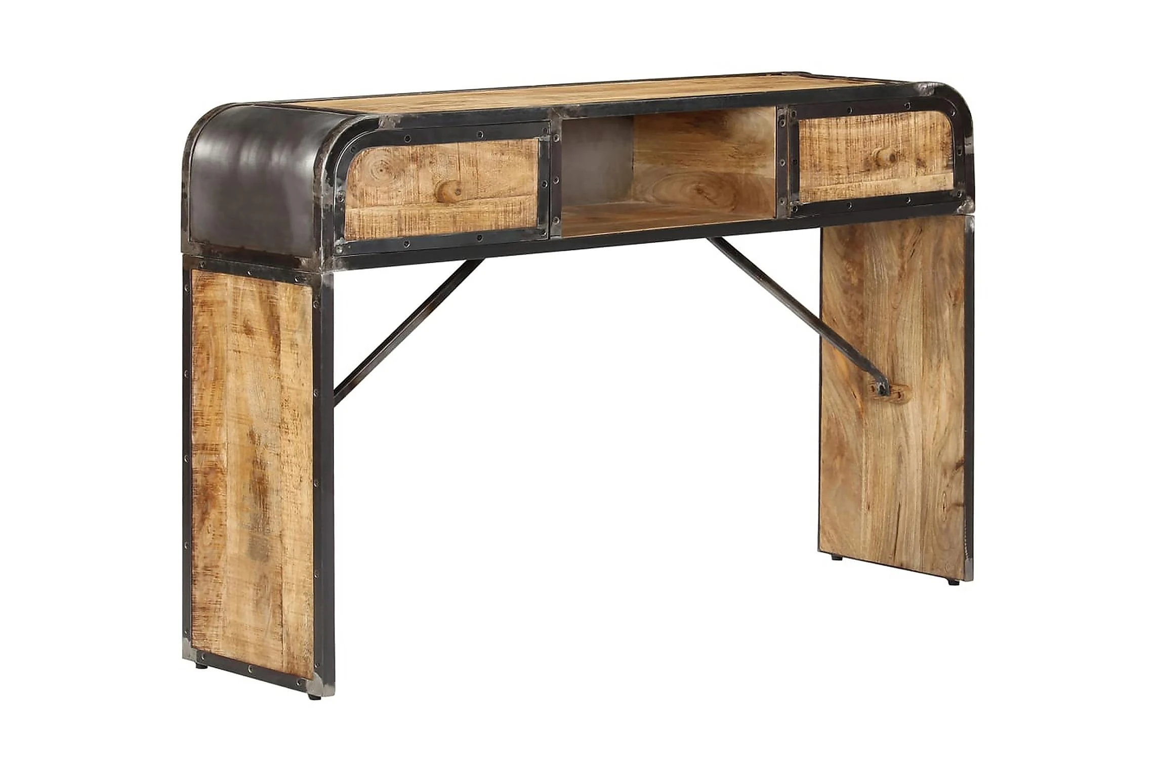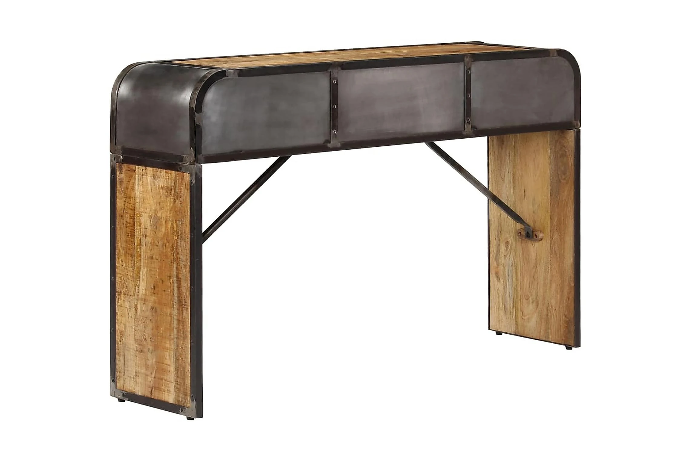 Detta konsolbord är tillverkat i massivt mangoträ, ett lövträ med rika ådringar. Grovt mangoträ är inte bara starkt nog för att bära upp vikten, det är också tåligt och hållbart. Därför är detta vackert designade hallbord stabilt, hållbart och iögonfallande. Det mästerliga hantverket garanterar att varje steg i processen utförs med största omsorg, vare sig det är polering eller lackering. Järnramen bidrar till skänkens industriella stil. Sidobordet har dessutom 2 lådor och ett utrymme med gott om plats för att förvara dina böcker och andra saker.