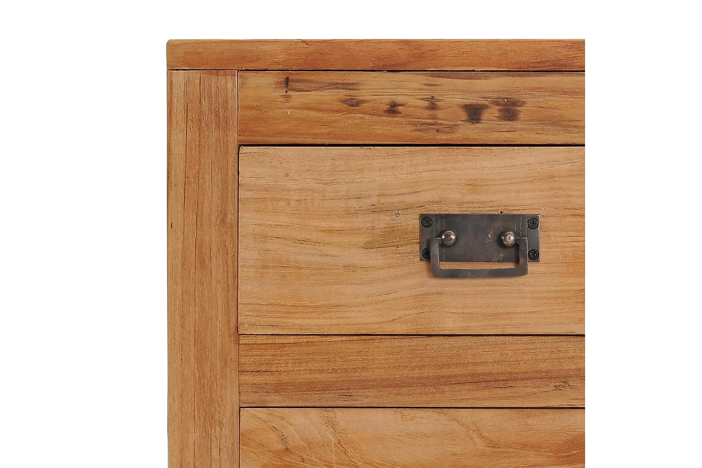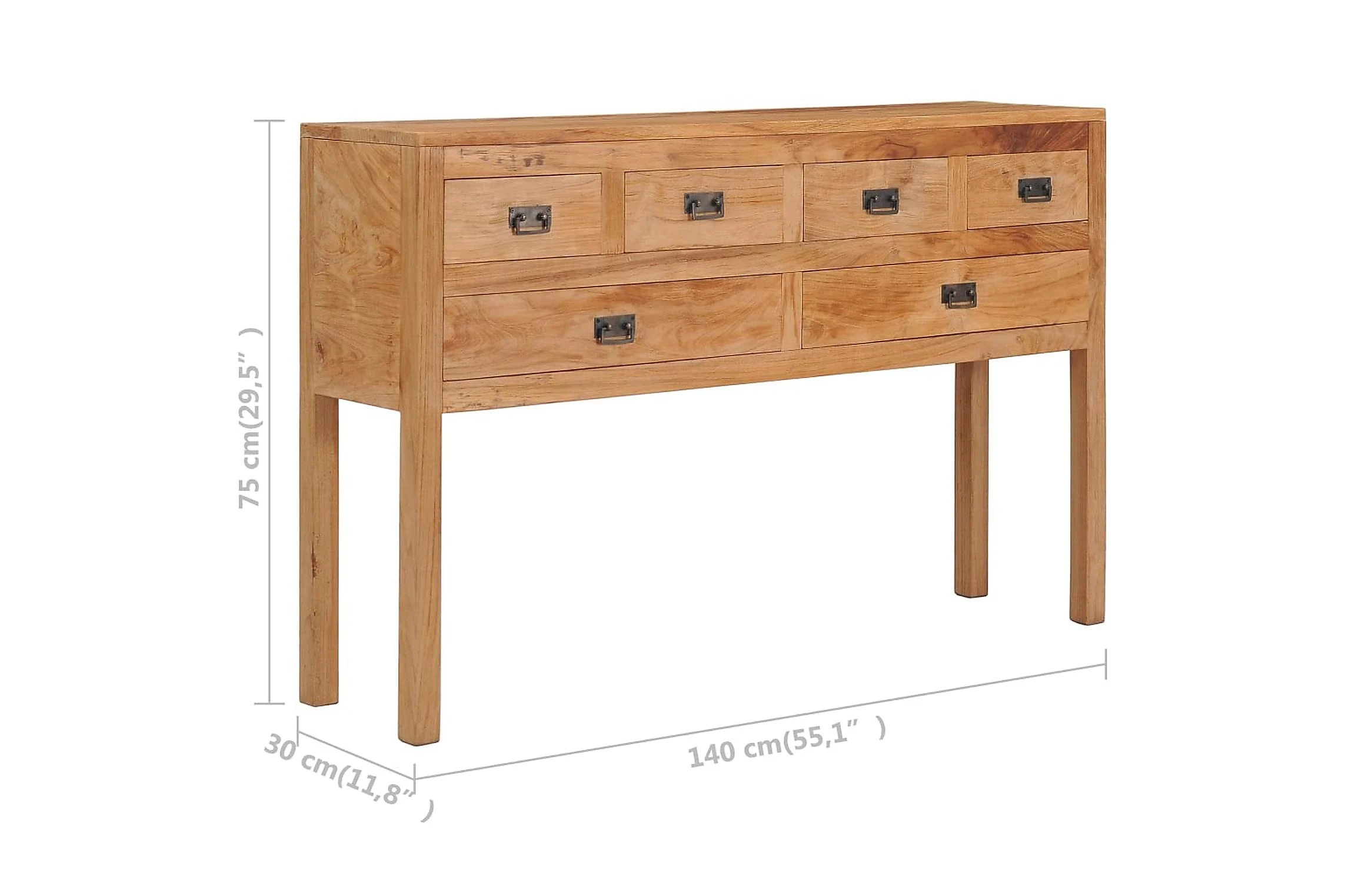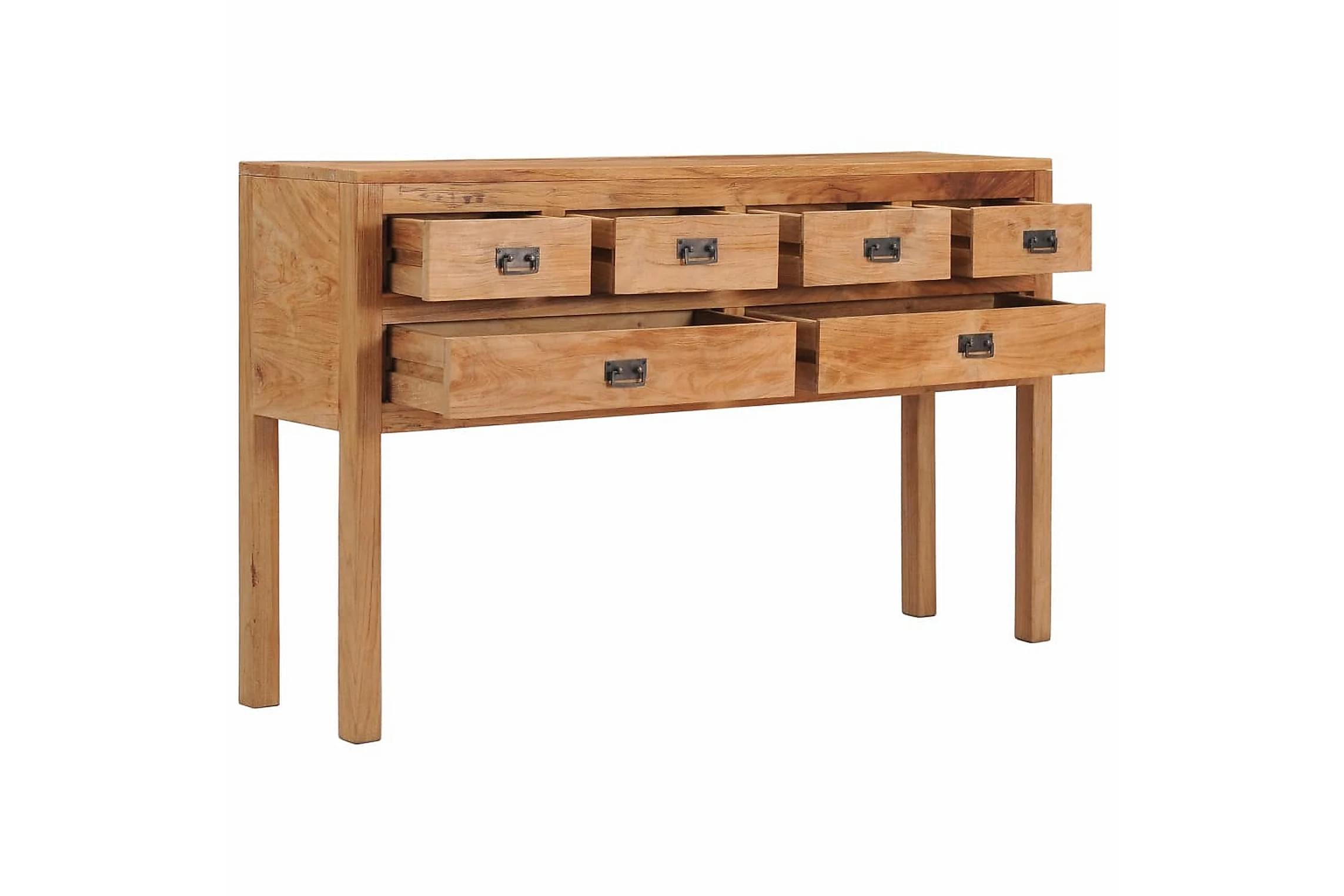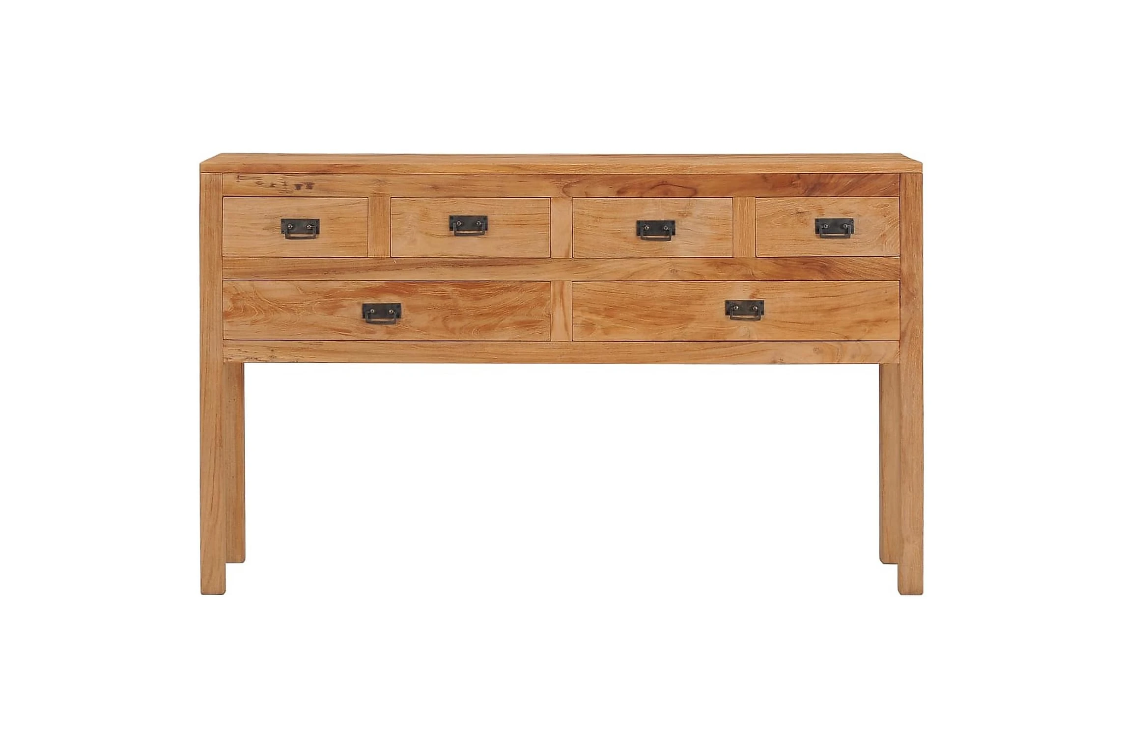 Skänken är tillverkad i massiv teak, som bidrar till en stadig och hållbar bas. Den är behandlad med en naturlig olja som säkerställer en jämn yta som är enkel att rengöra och underhålla. Den har sex lådor med gott om plats för förvaring. Skänken kan användas som konsolbord, sidobord och avlastningsbord.
