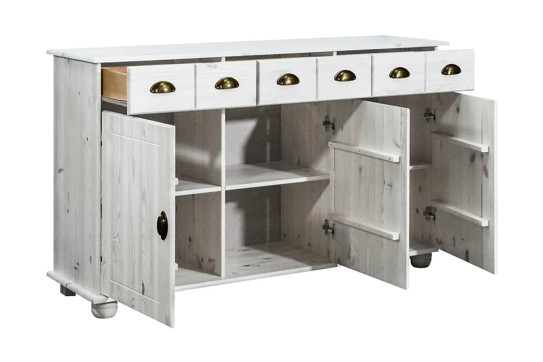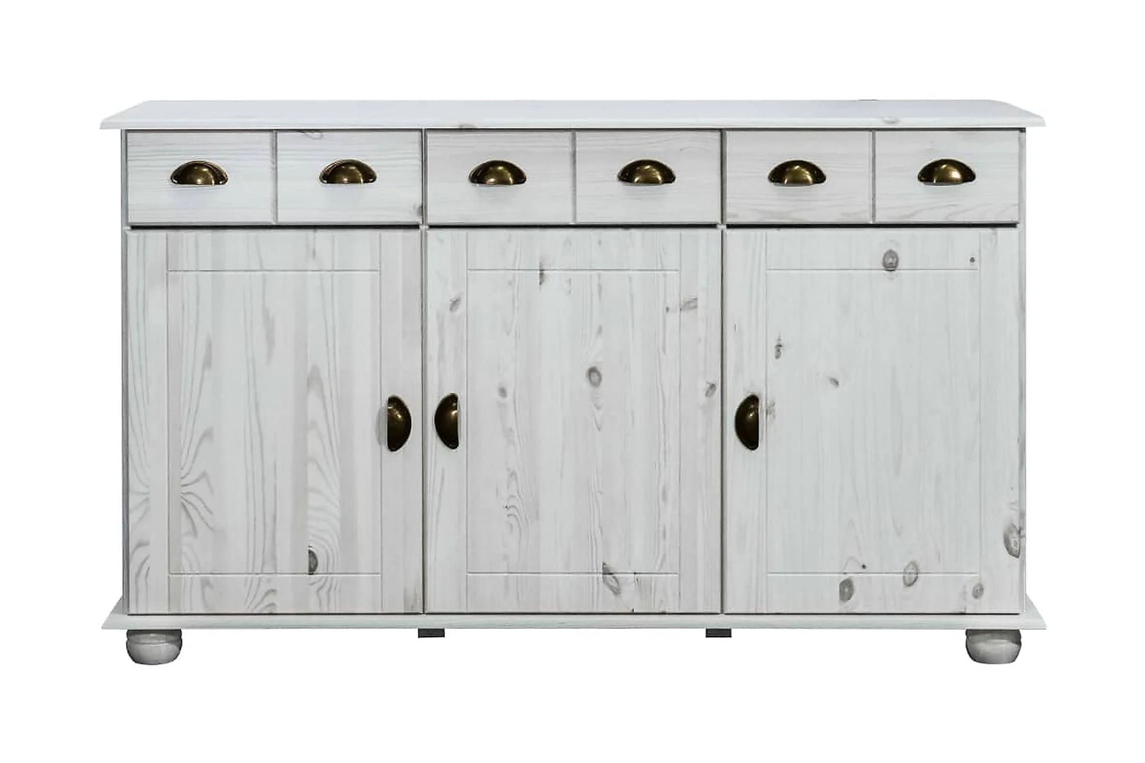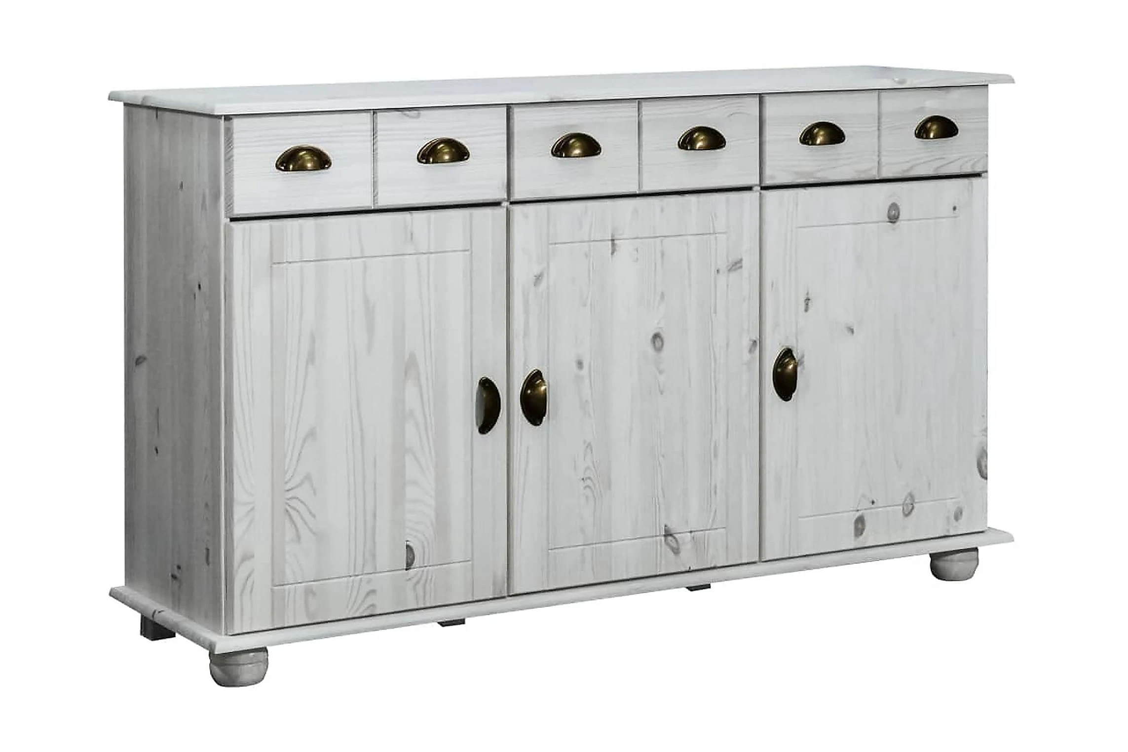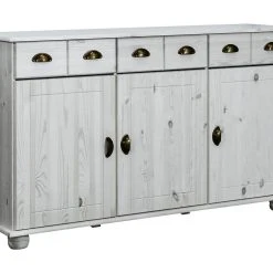 Förvaringsskänken är tillverkad i massiv furu, vilket gör det stabil och hållbar. Handtaget gör det enkelt att öppna dörren och lådan. Skåpet har tre lådor och tre dörrar med gott om förvaringsplats för dina saker. Dessutom är den stadiga ovansidan perfekt för att visa upp prydnadssaker som fotoramar, krukväxter, vaser mm.
