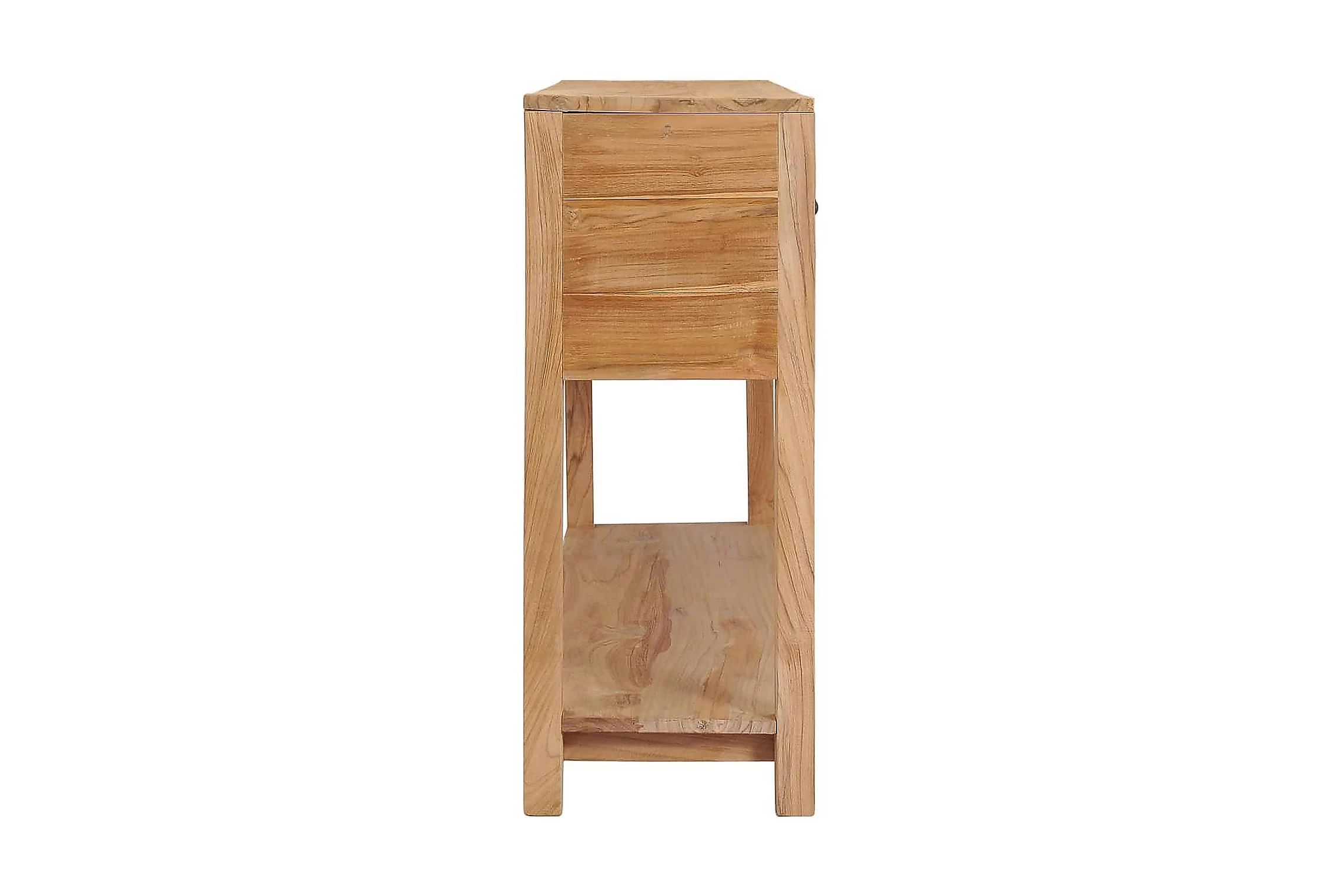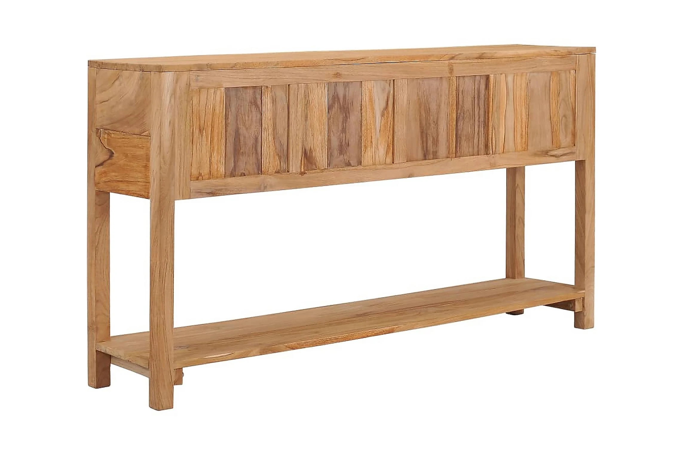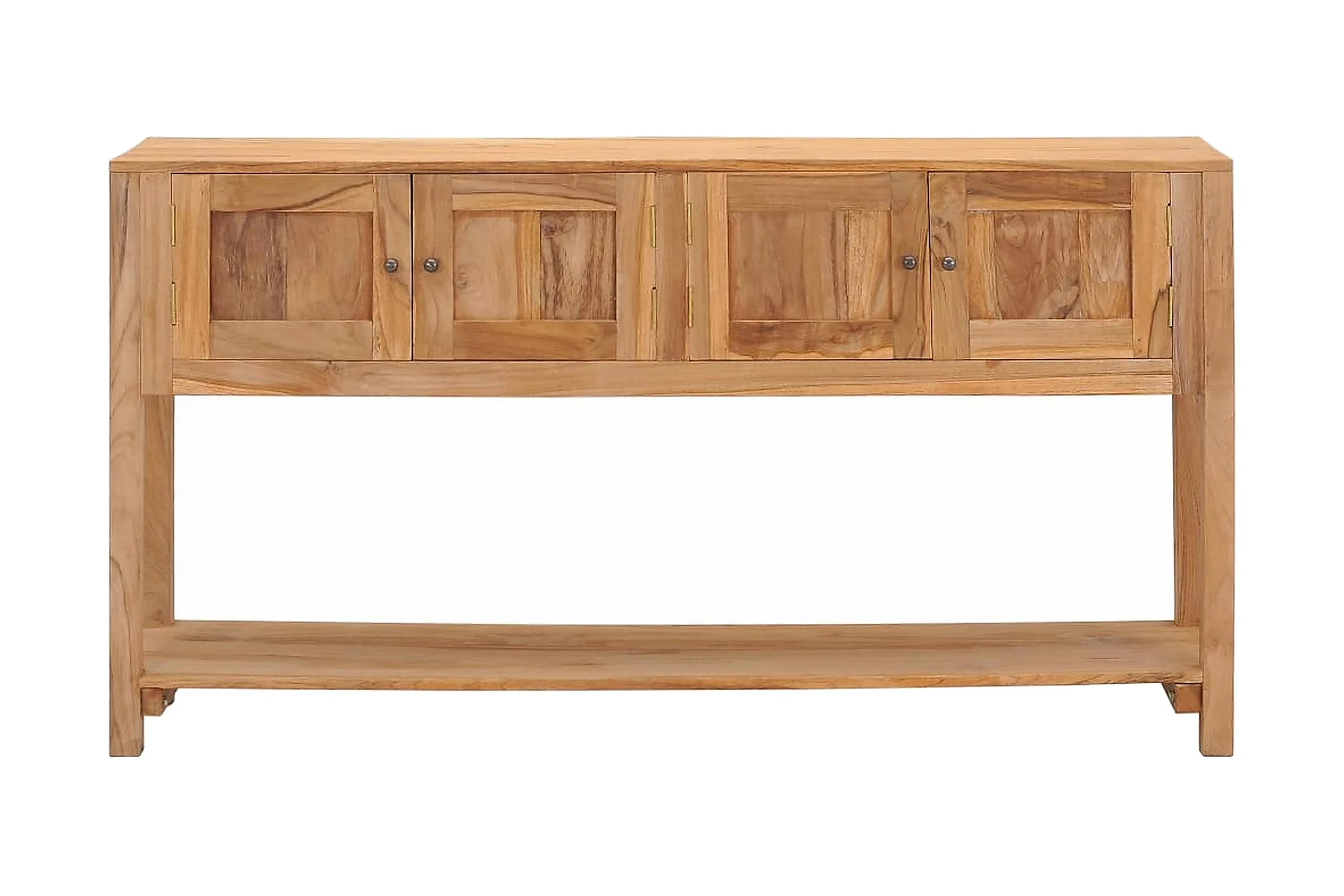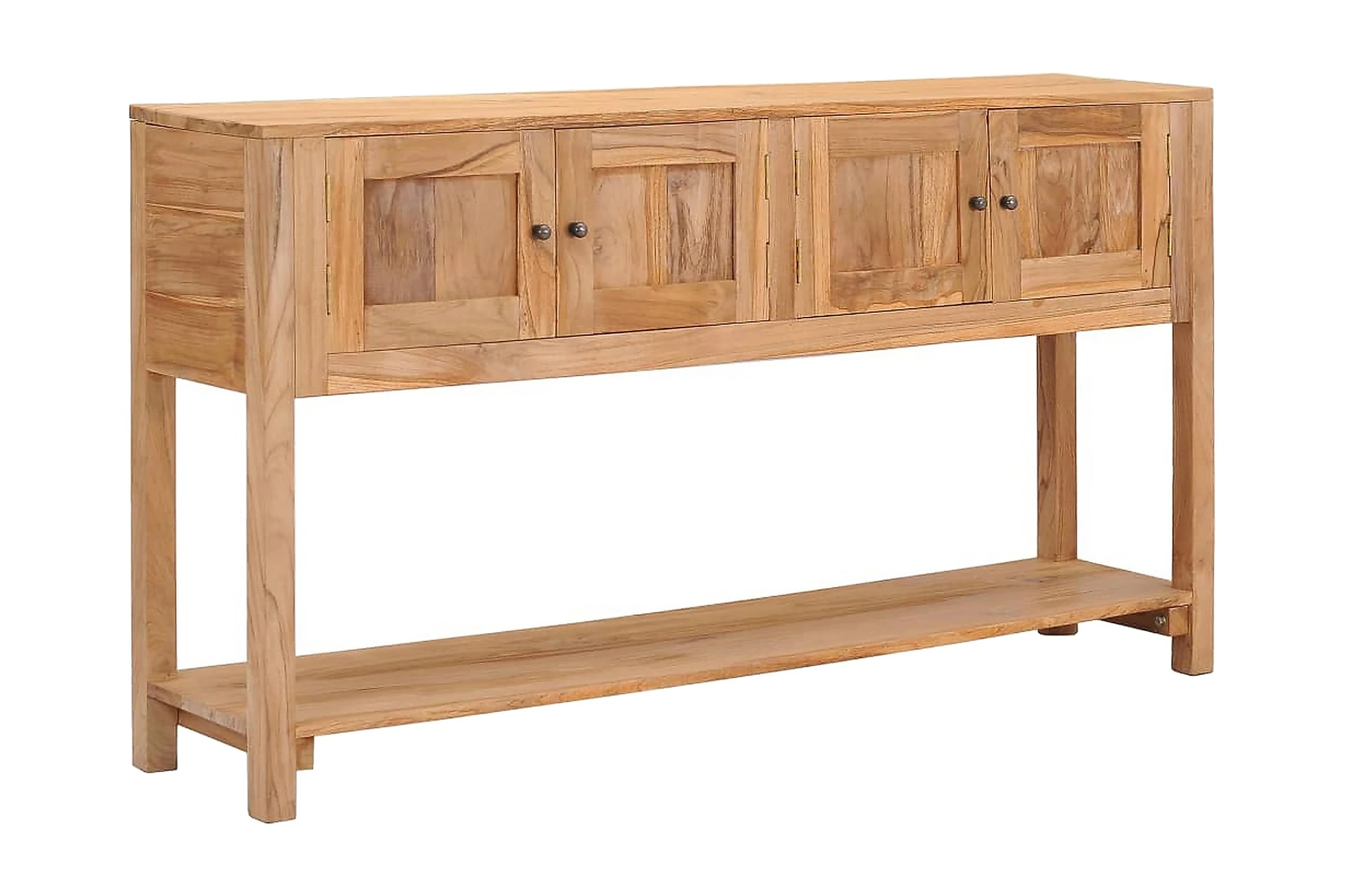 Skänken är tillverkad i massiv teak, som bidrar till en stadig och hållbar bas. Den är behandlad med en naturlig olja som säkerställer en jämn yta som är enkel att rengöra och underhålla. Den har två utrymmen med gott om plats för förvaring. Den rymliga bottenhyllan är lämplig för förvaring av större prylar vid behov. Skänken kan användas som konsolbord, sidobord och avlastningsbord.