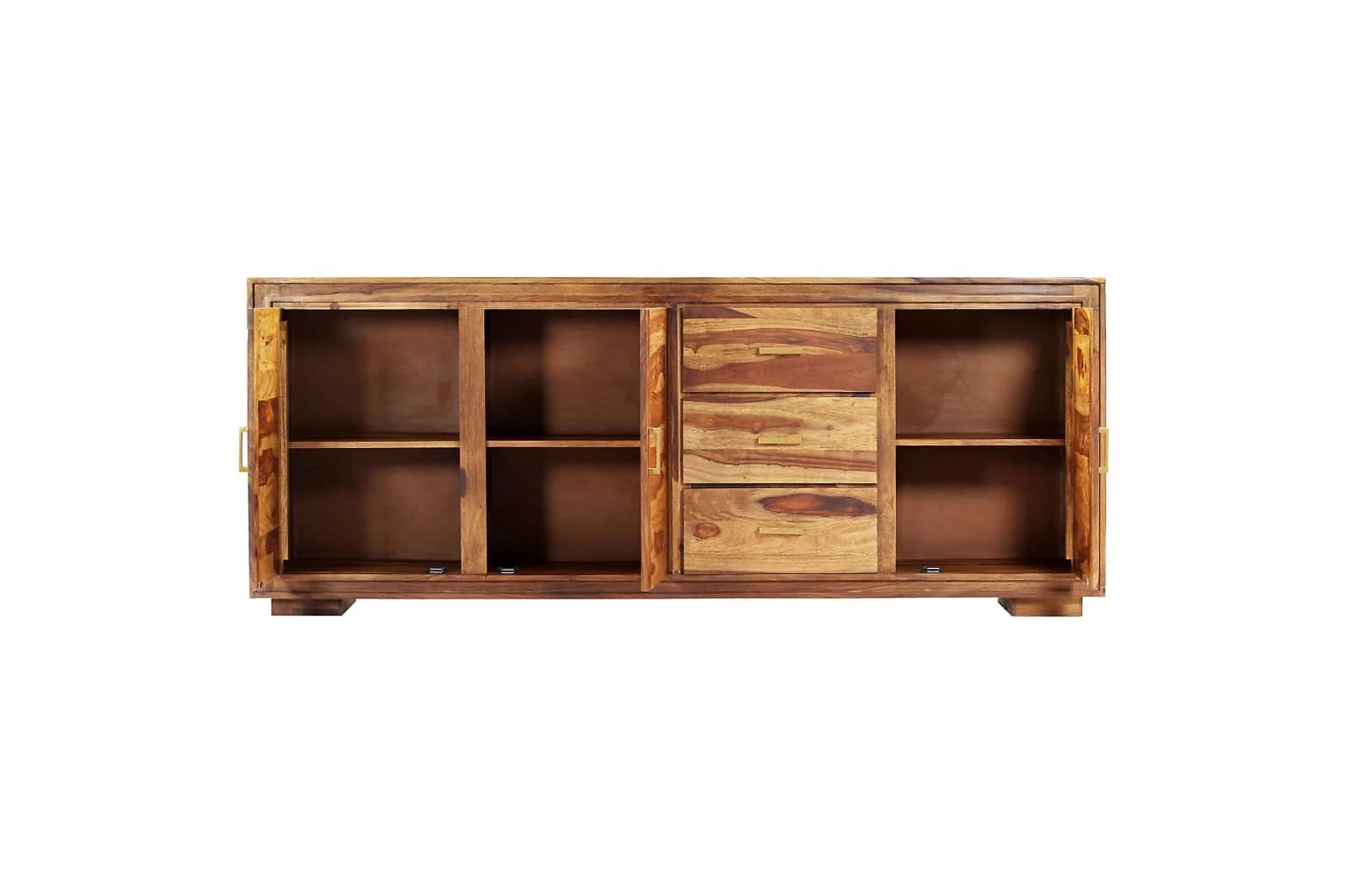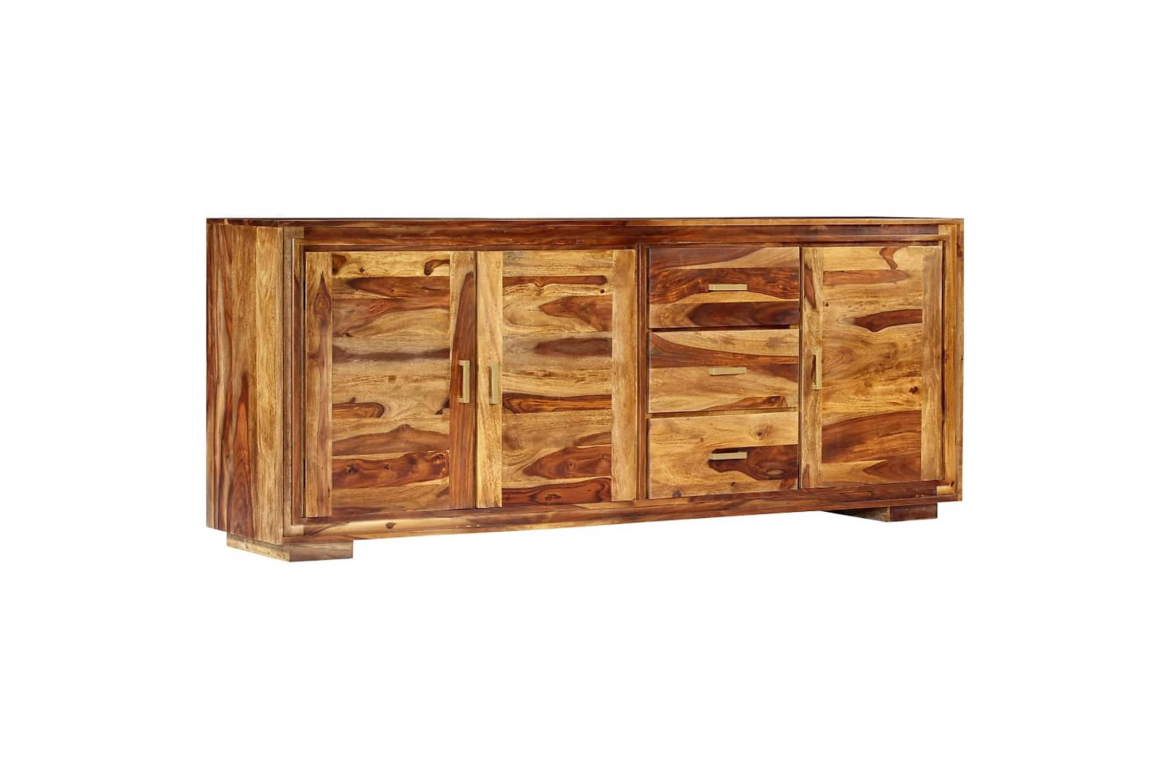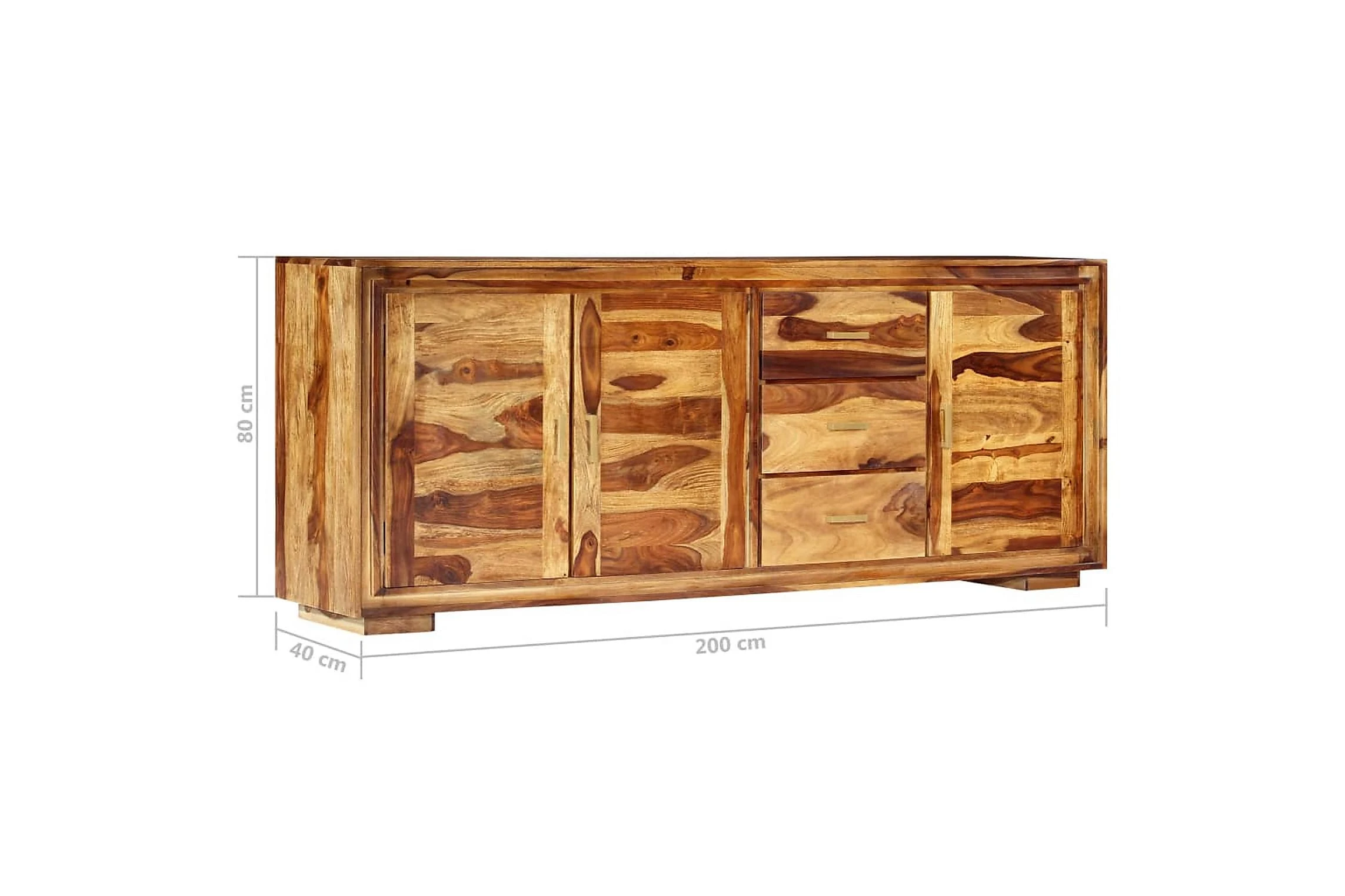 Skänken har en massiv ovansida där du kan ställa drickor, fruktskålar, fotoramar eller krukväxter. De tre lådorna och de tre stora utrymmena har gott om plats för böcker och andra prylar. Sidoskåpet är tillverkat av massivt sheshamträ. Shesham, även kallat rosenträ eller palisander, är ett tropiskt lövträ som är känt för sina rika ådringar. Dess vackra träfiber gör varje möbel unik och något olik alla andra.