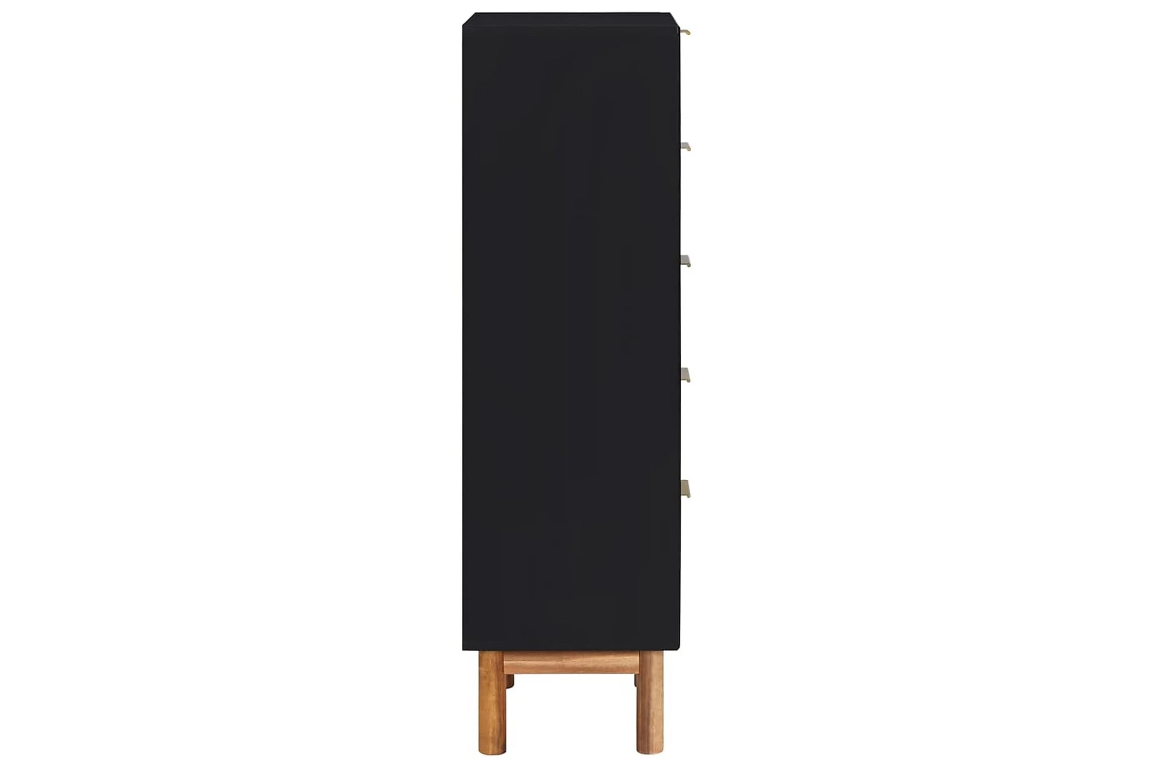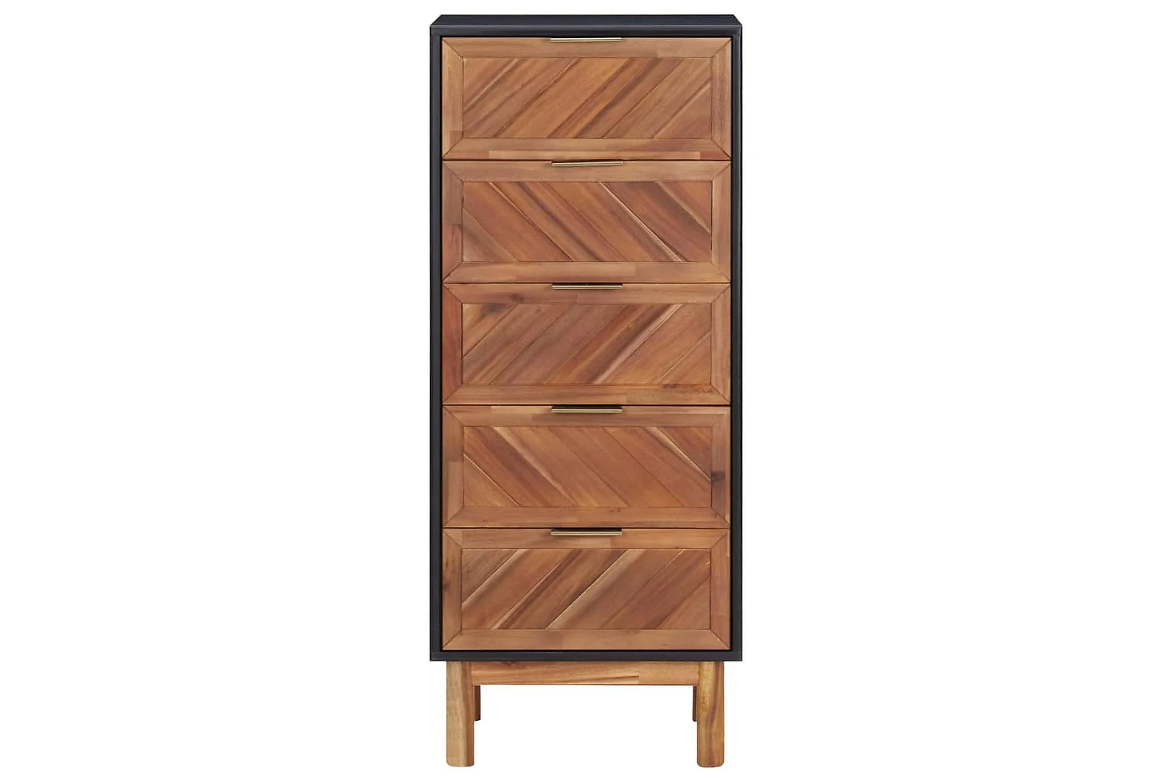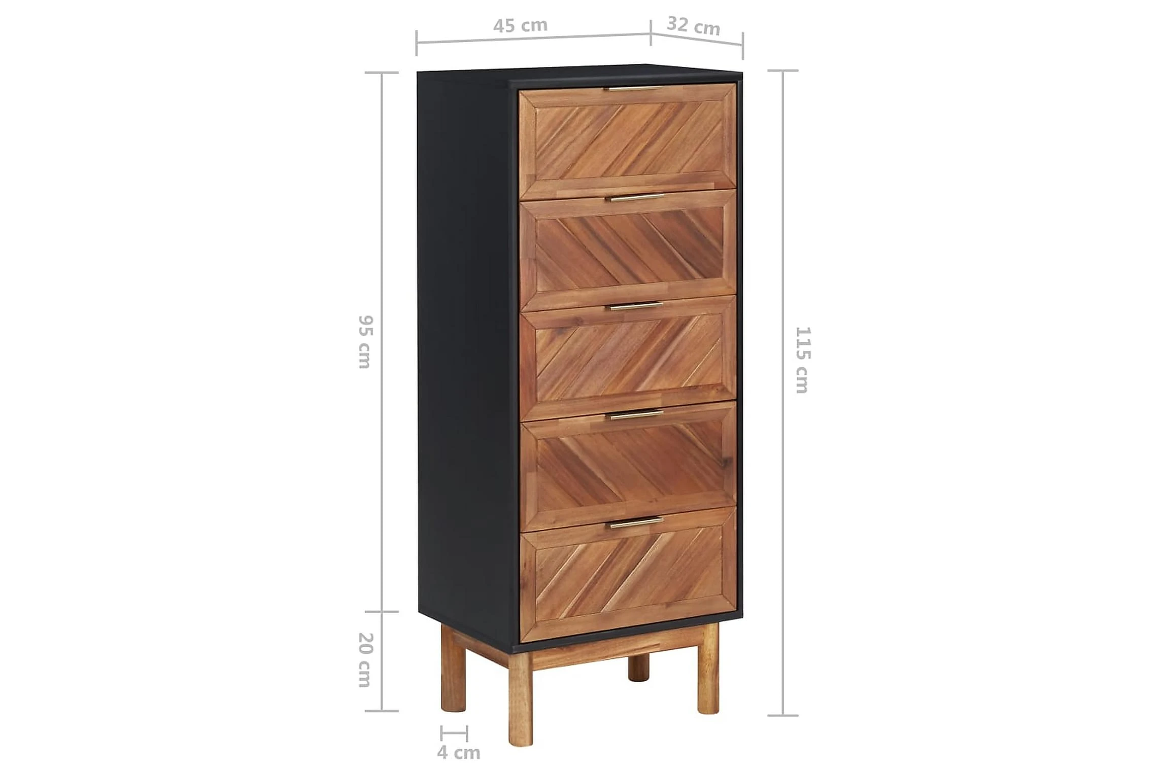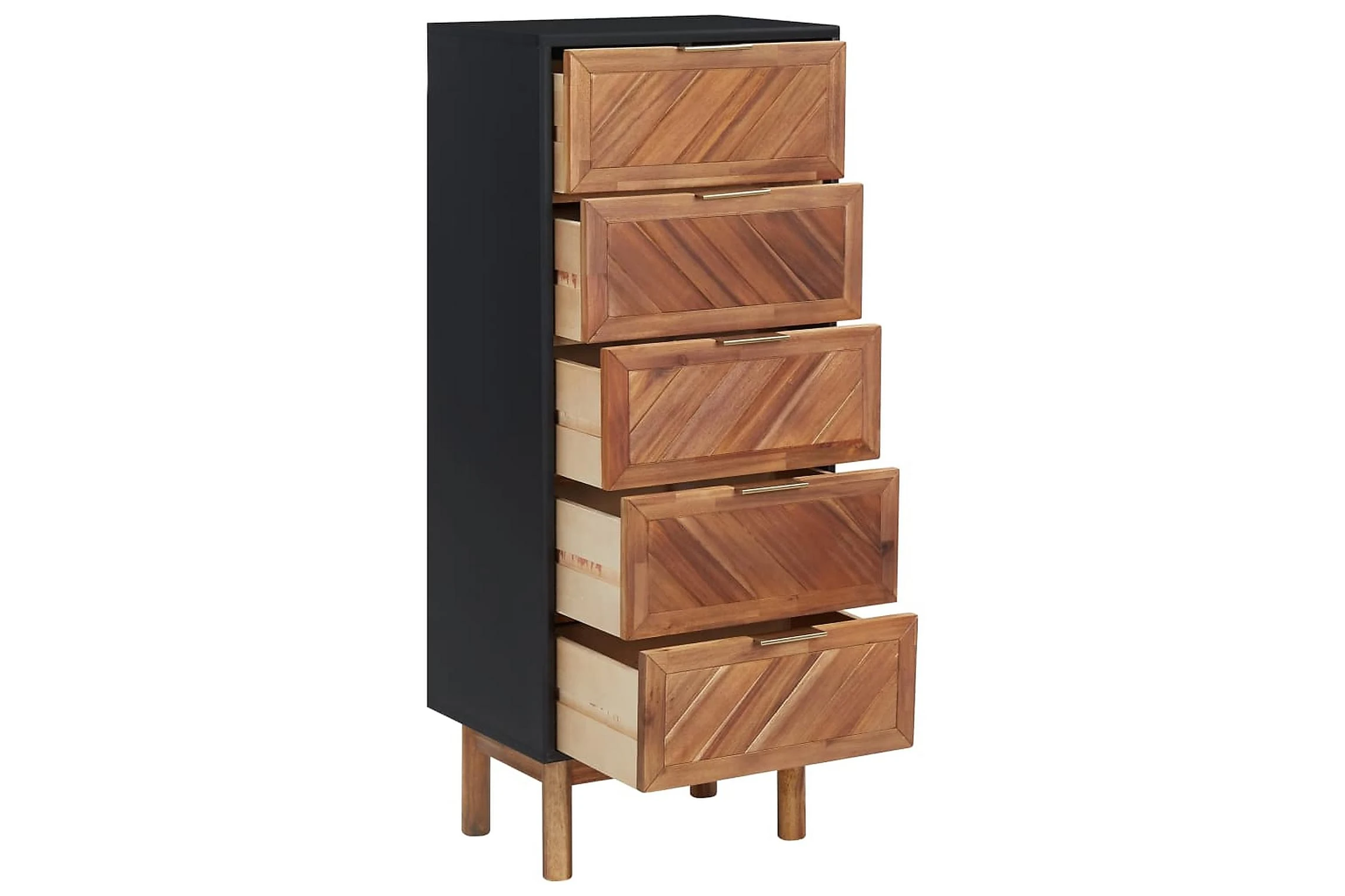 Träskänken är mästerligt tillverkad i massivt akaciaträ och MDF, vilket gör den väldigt stadig och hållbar. Det höga skåpet har 5 lådor med gott om förvaringsplats för böcker, mediaenheter och andra viktiga saker. Skänkens ovansida är perfekt för att visa upp dekorativa föremål, fotoramar eller krukväxter. De guldiga handtagen i aluminium gör förvaringsskänken elegant.