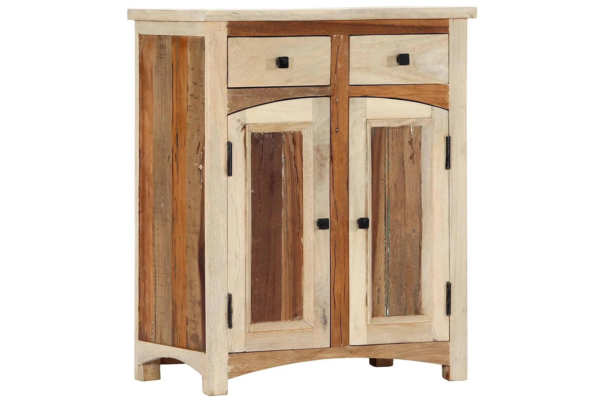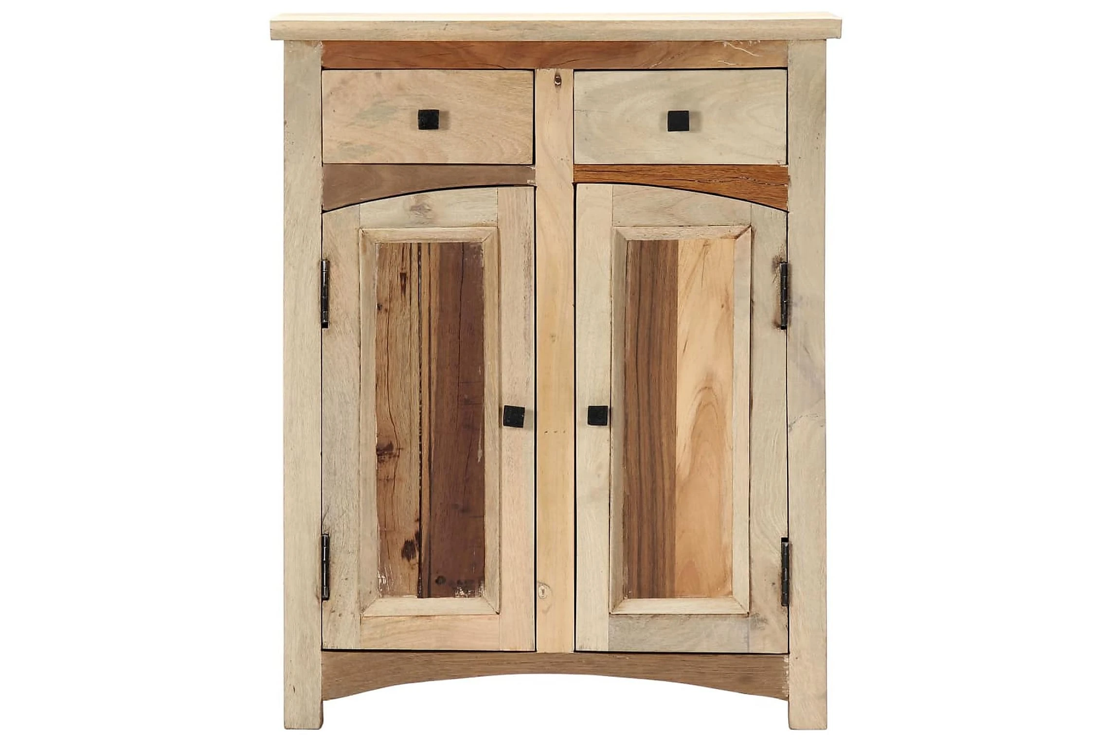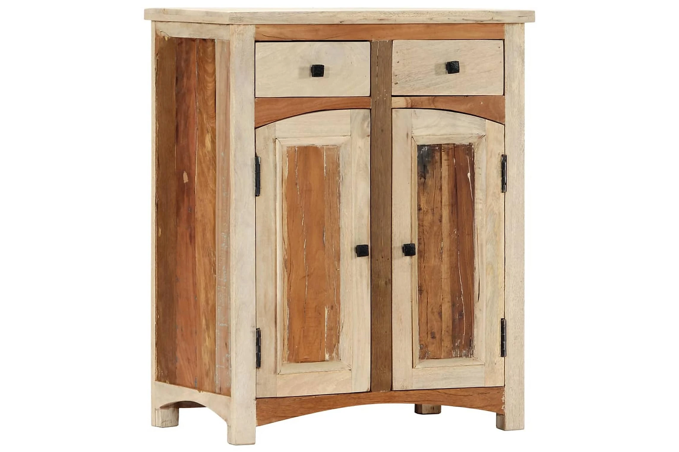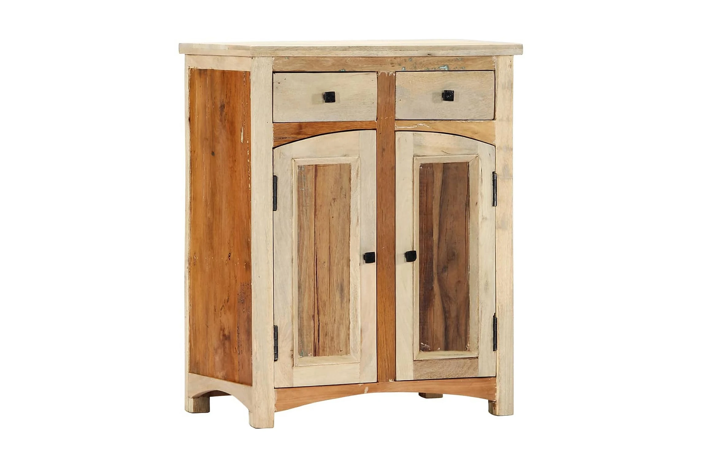 Den här skänken är tillverkad av massivt mangoträ och återvunnet trä som har samlats in från reglar, golv och balkar från gamla byggnader som har rivits, och kan bestå av olika typer av trä såsom furu, teak, björk, ek, ceder, mangoträ, akacia, etc. Detta innebär att det återvunna träet behåller egenskaperna från dessa olika träslag. Återvunnet trä är redan åldrat, vittrat och torkat, så det varken krymper eller böjs. Varje steg i processen utförs med största omsorg, vare sig det är polering eller lackering. Det mästerliga hantverket och de vackra träådringarna gör varje möbel unik och något annorlunda än alla andra. Skänken har även 2 dörrar och 2 lådor som är en ultimat förvaringslösning för att hålla småsaker organiserade och inom räckhåll. Skänken är lätt att montera.