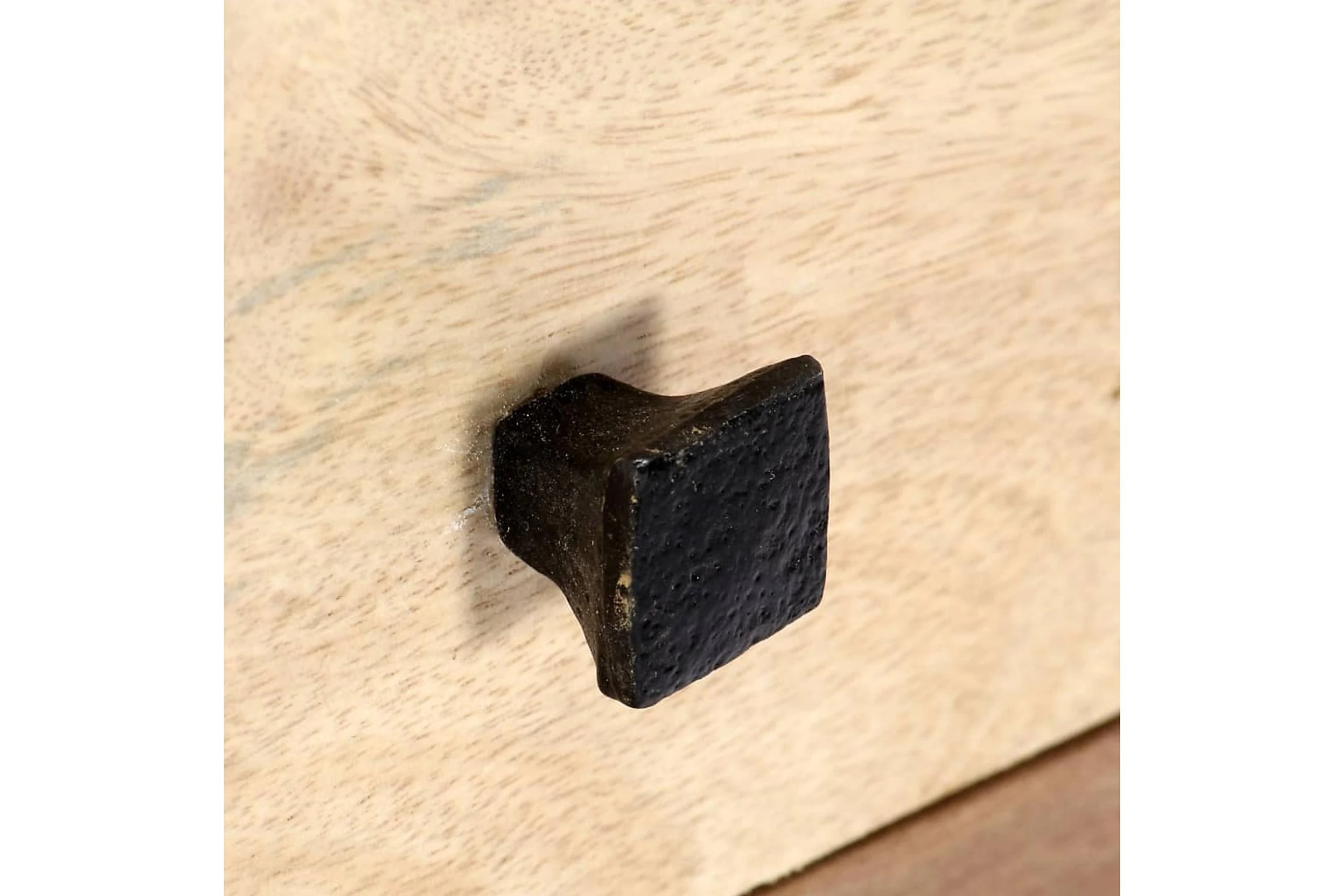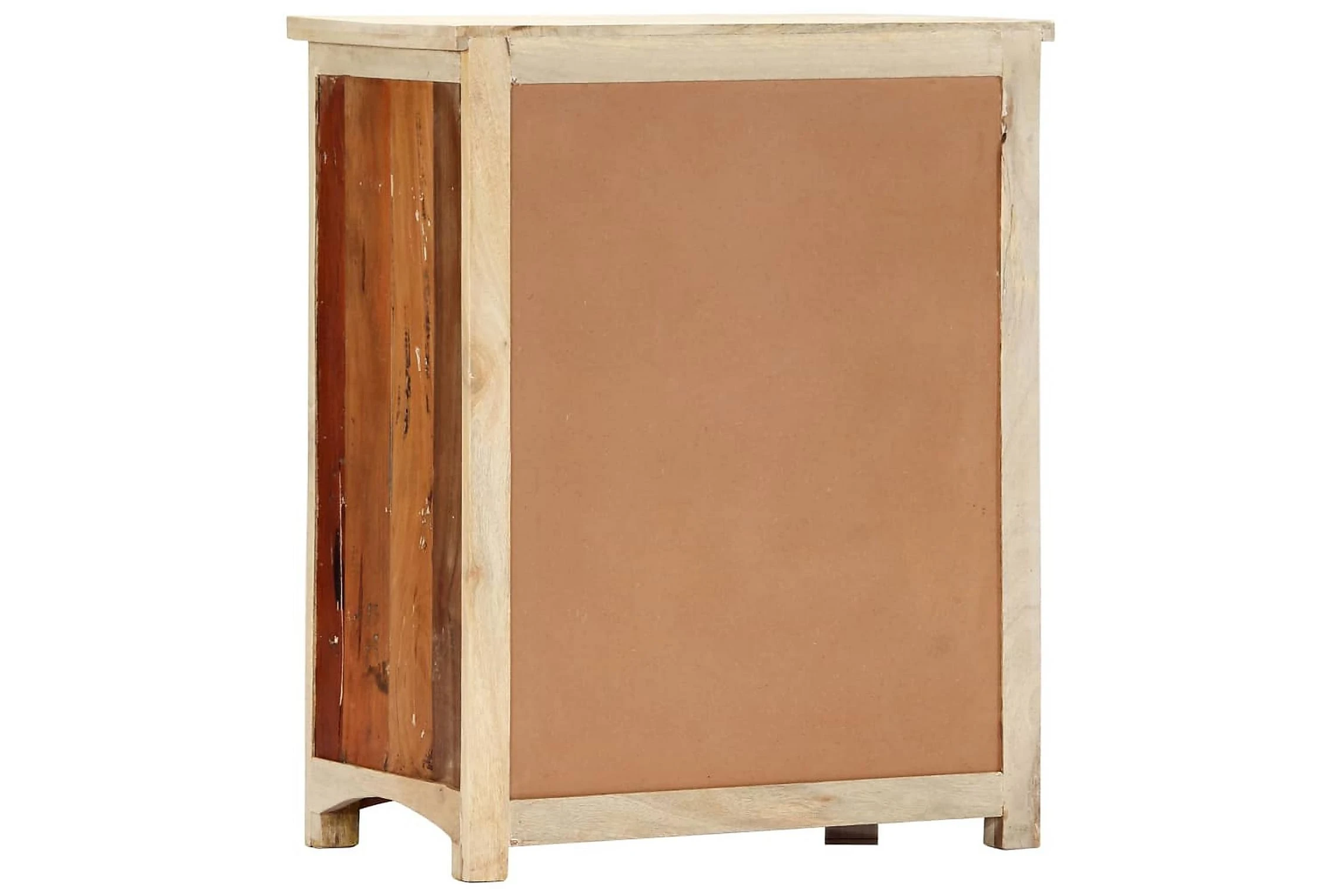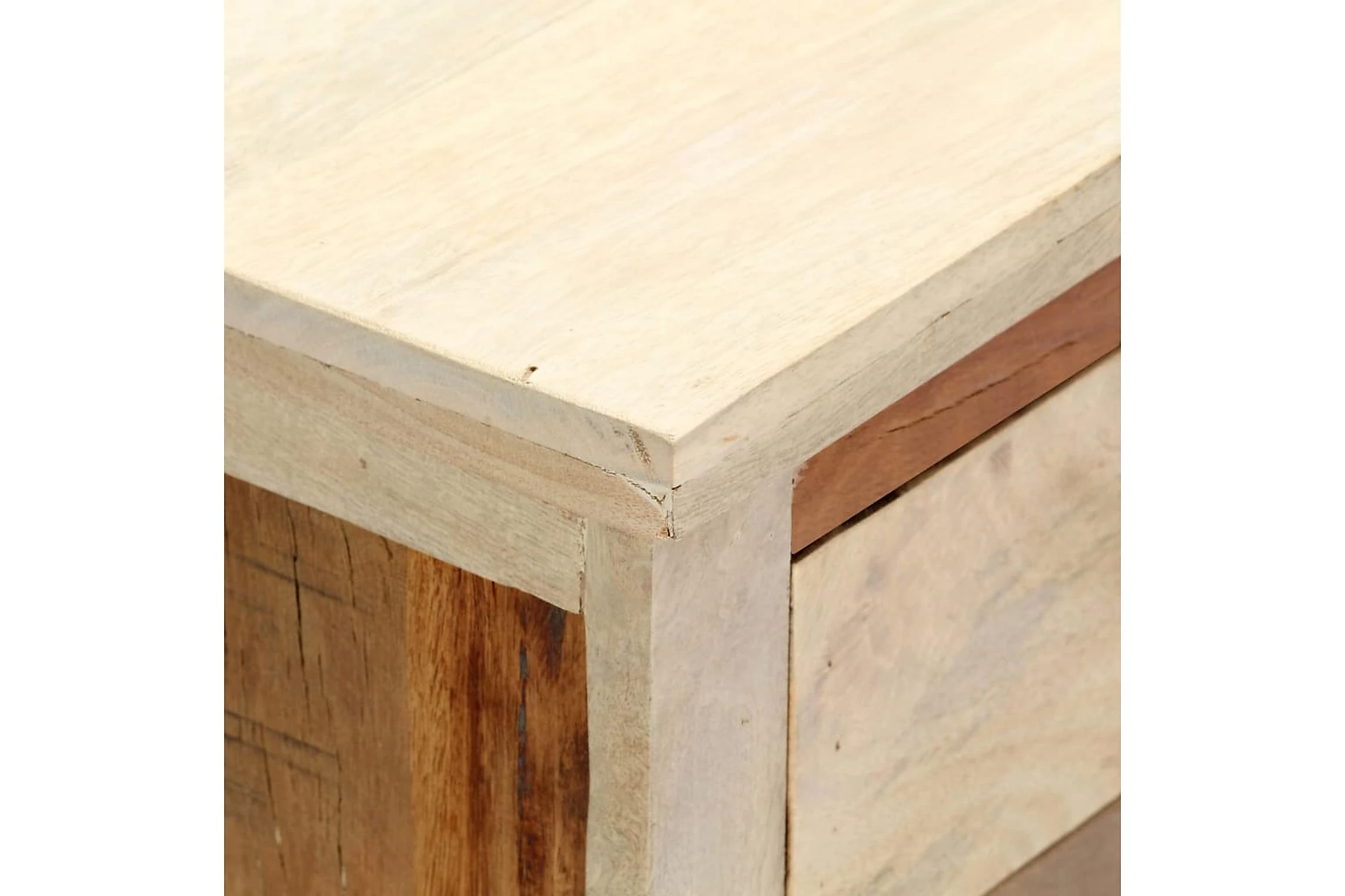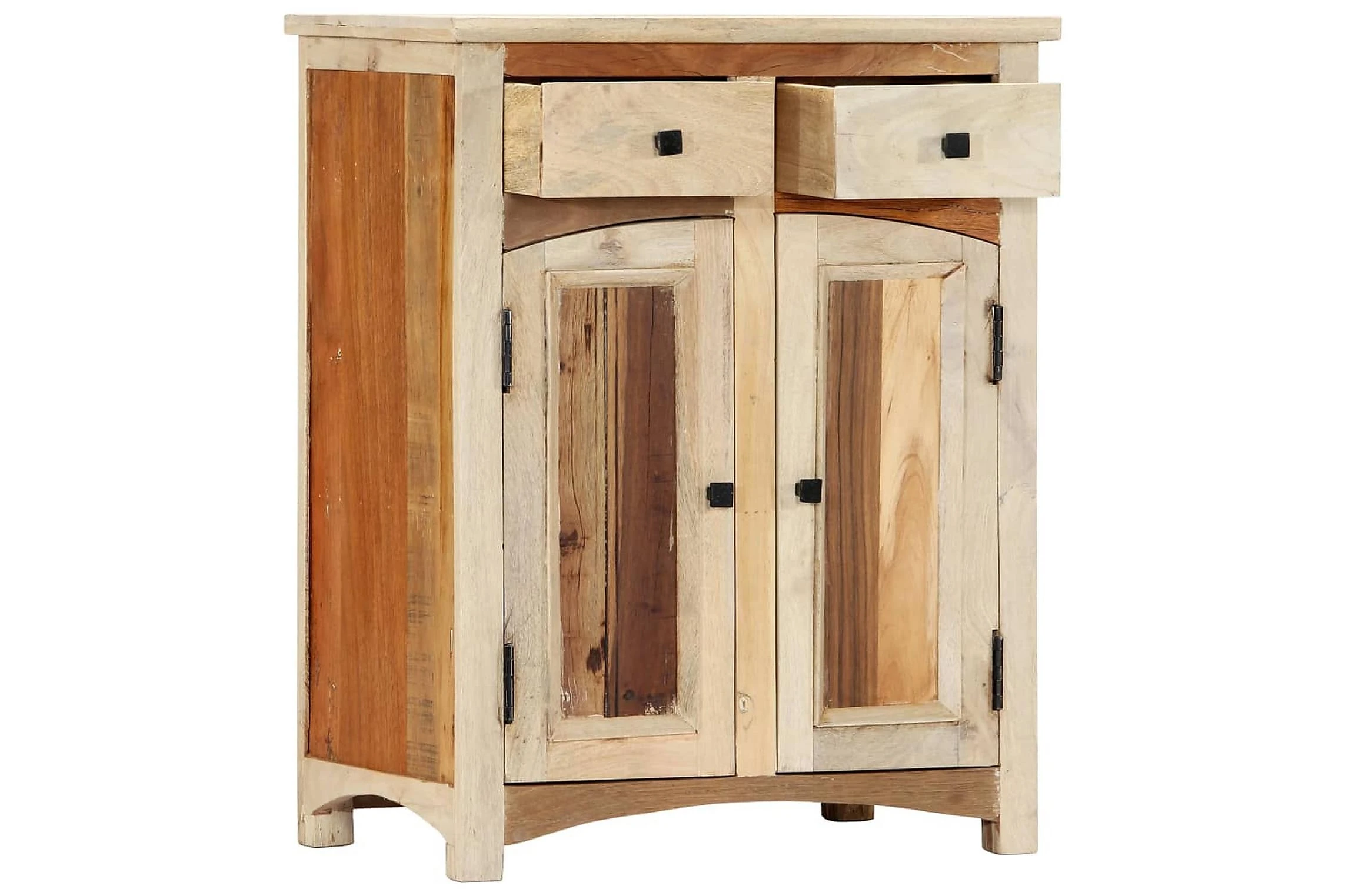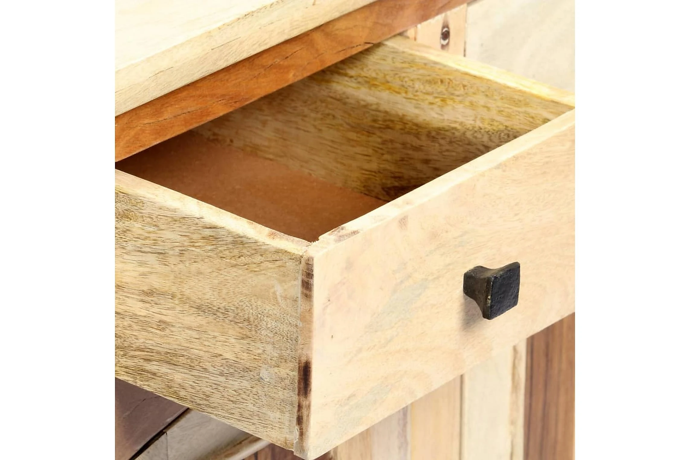 Den här skänken är tillverkad av massivt mangoträ och återvunnet trä som har samlats in från reglar, golv och balkar från gamla byggnader som har rivits, och kan bestå av olika typer av trä såsom furu, teak, björk, ek, ceder, mangoträ, akacia, etc. Detta innebär att det återvunna träet behåller egenskaperna från dessa olika träslag. Återvunnet trä är redan åldrat, vittrat och torkat, så det varken krymper eller böjs. Varje steg i processen utförs med största omsorg, vare sig det är polering eller lackering. Det mästerliga hantverket och de vackra träådringarna gör varje möbel unik och något annorlunda än alla andra. Skänken har även 2 dörrar och 2 lådor som är en ultimat förvaringslösning för att hålla småsaker organiserade och inom räckhåll. Skänken är lätt att montera.