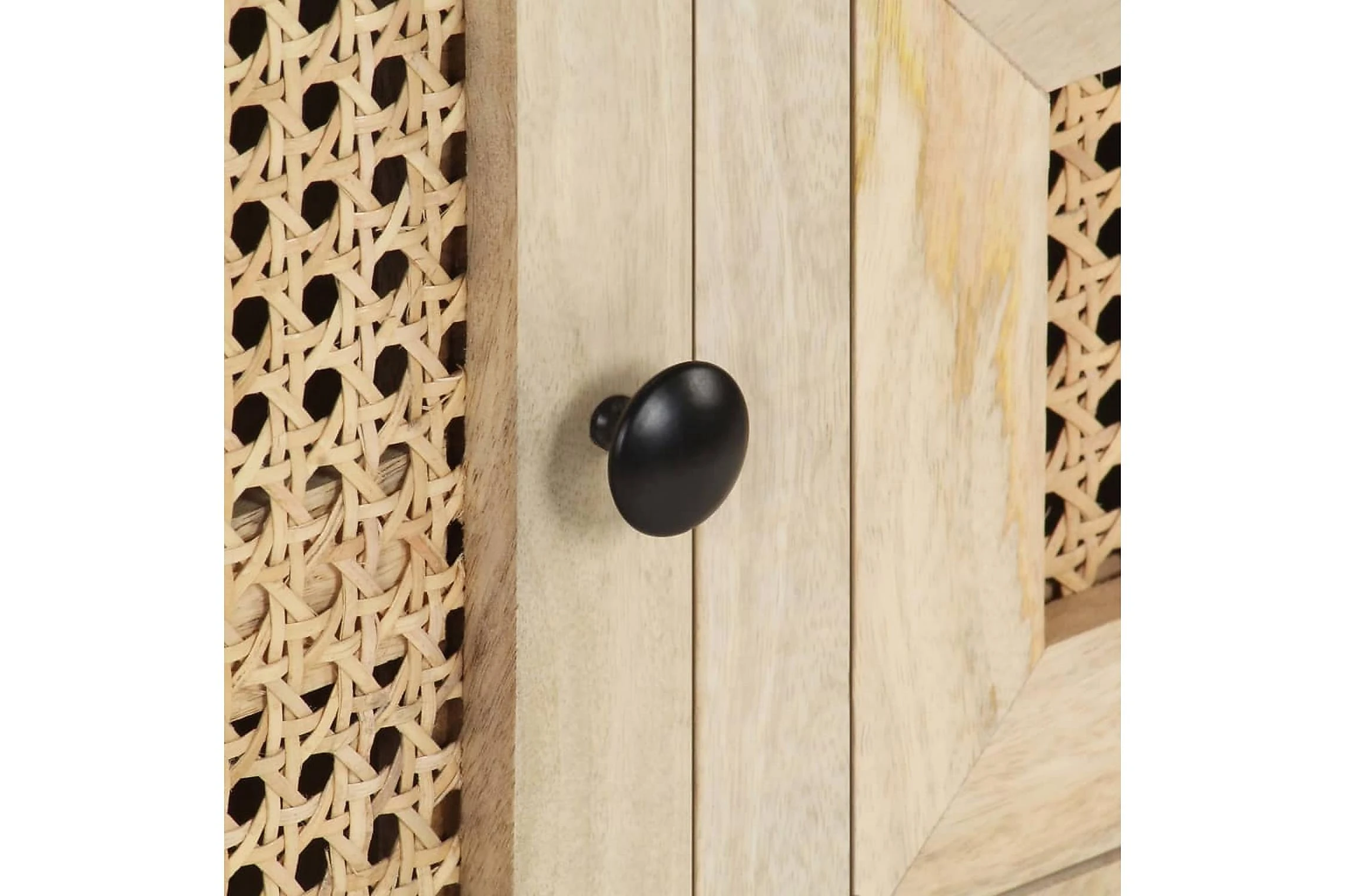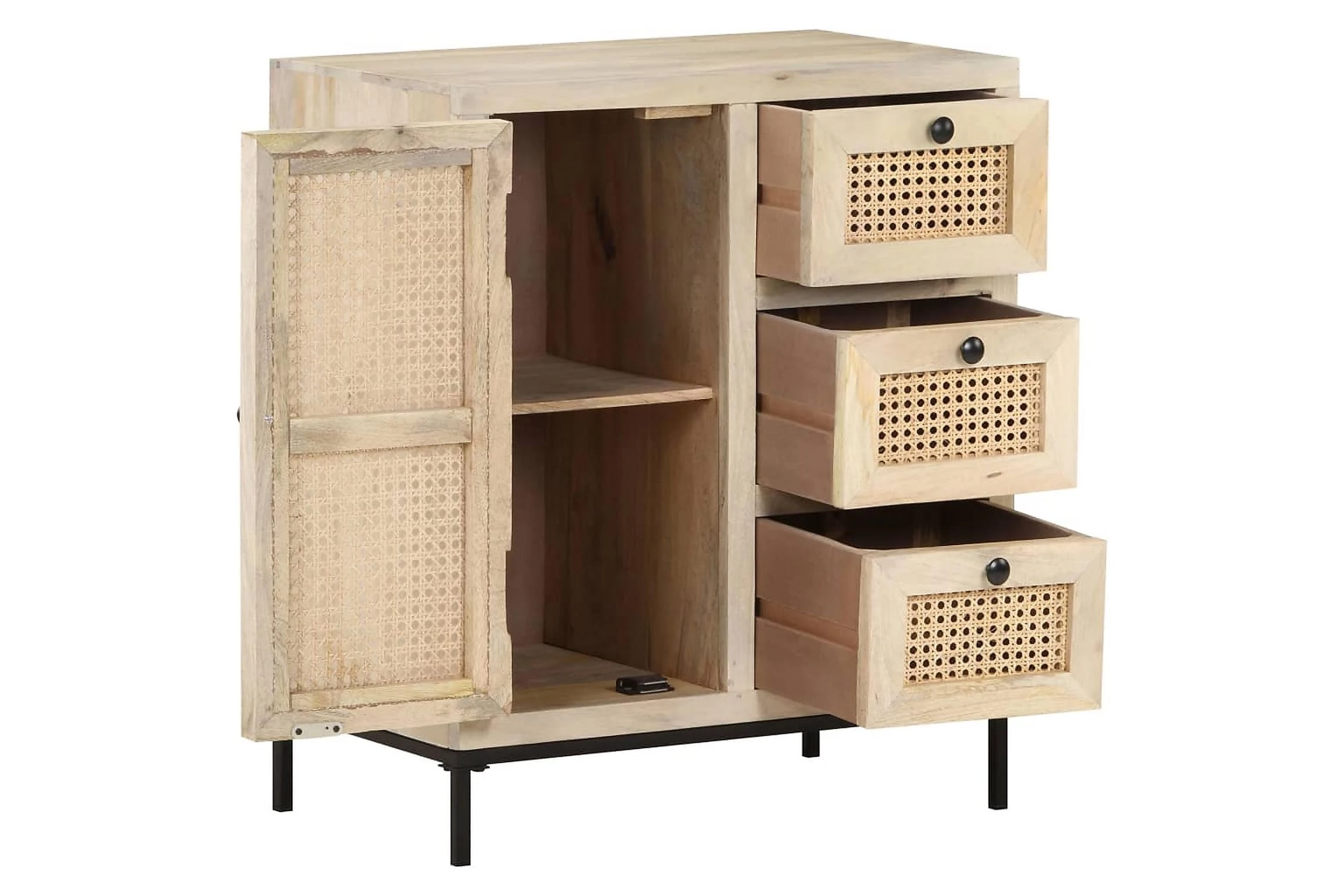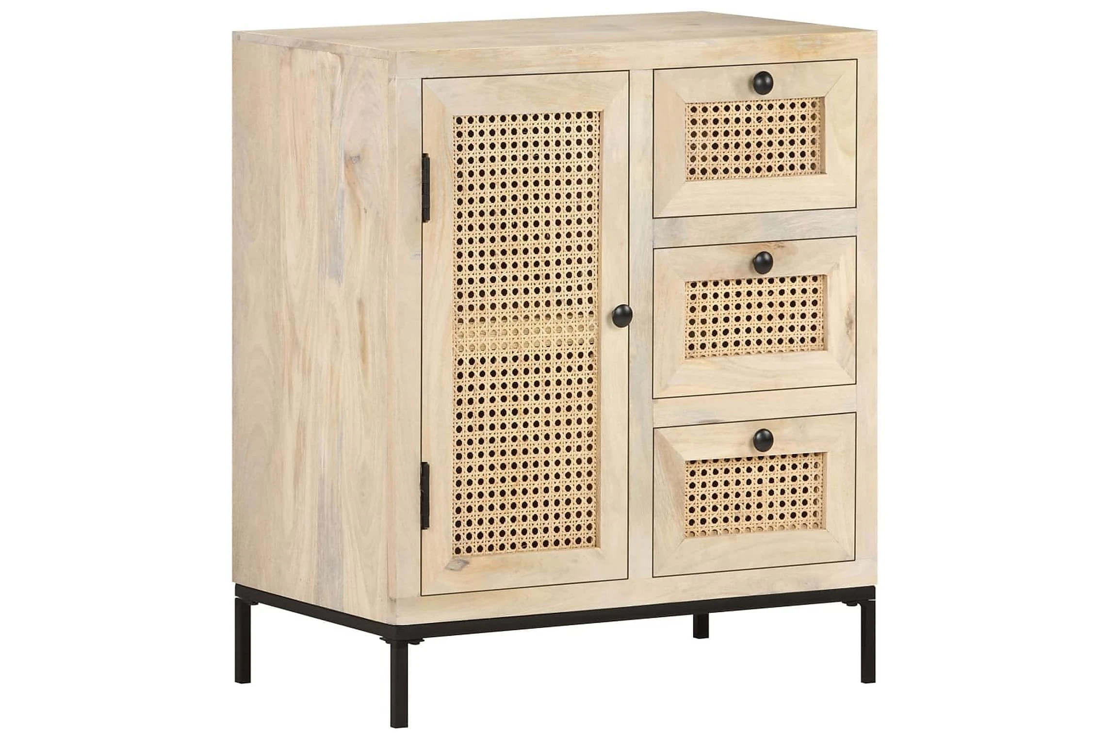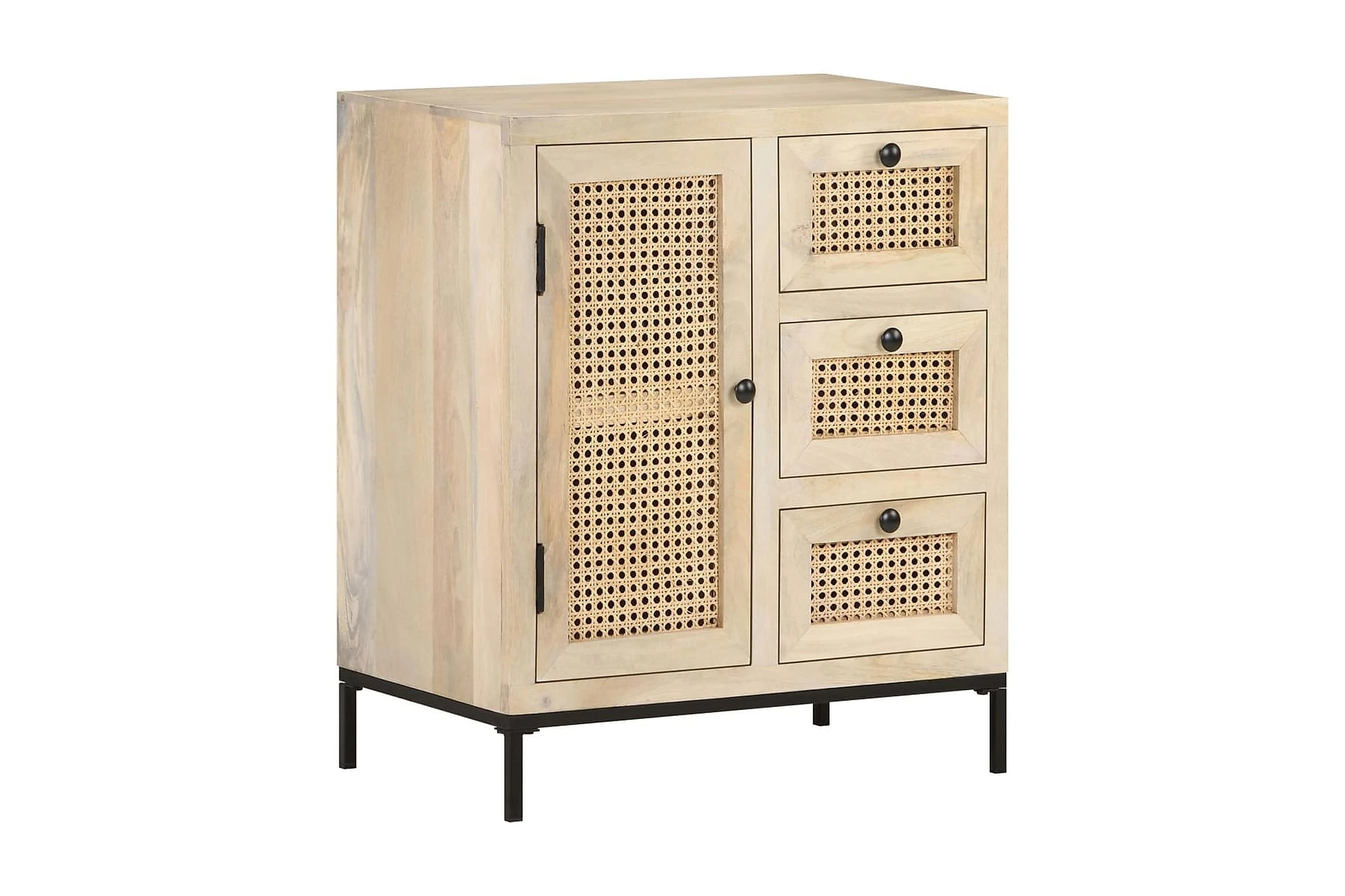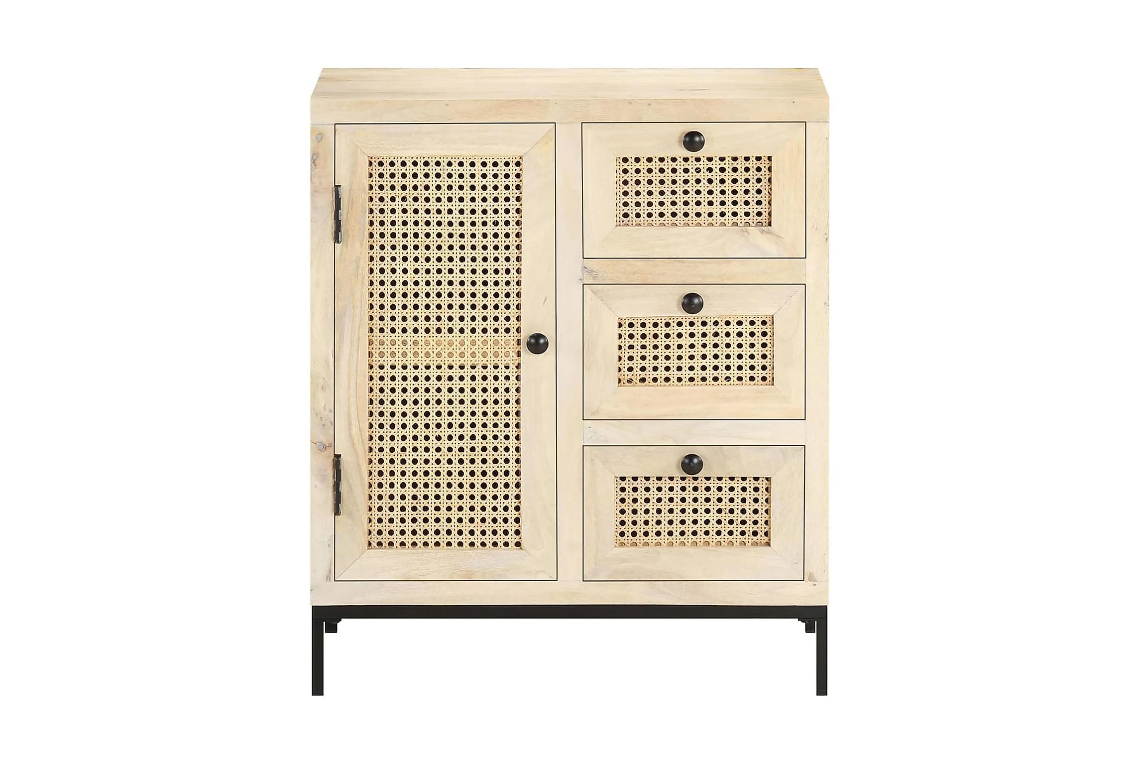 Massivt mangoträ är ett tropiskt lövträ. Det är både starkt och slitagebeständigt. Dessutom gör det fina hantverket och vackra träådringar varje skänk något olik de andra. Skåpet har gott om förvaringsutrymme, så att du kan visa eller förvara prylar som du vill ha organiserade. Stålbasen bidrar till dess stadighet och stabilitet. Dessutom har skänken ett handvävt rottingmönster på dörren och lådorna som utstrålar en rustik charm.