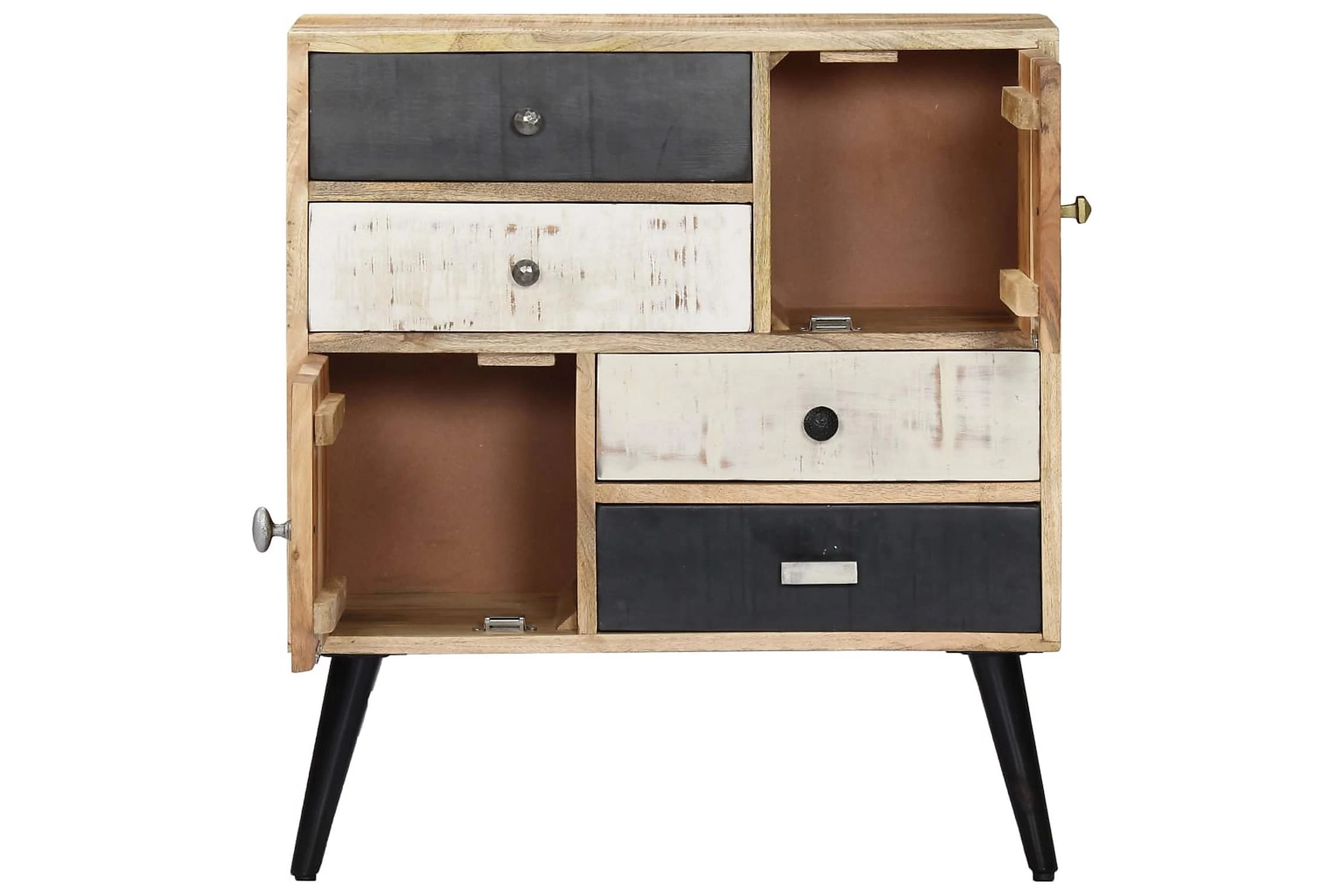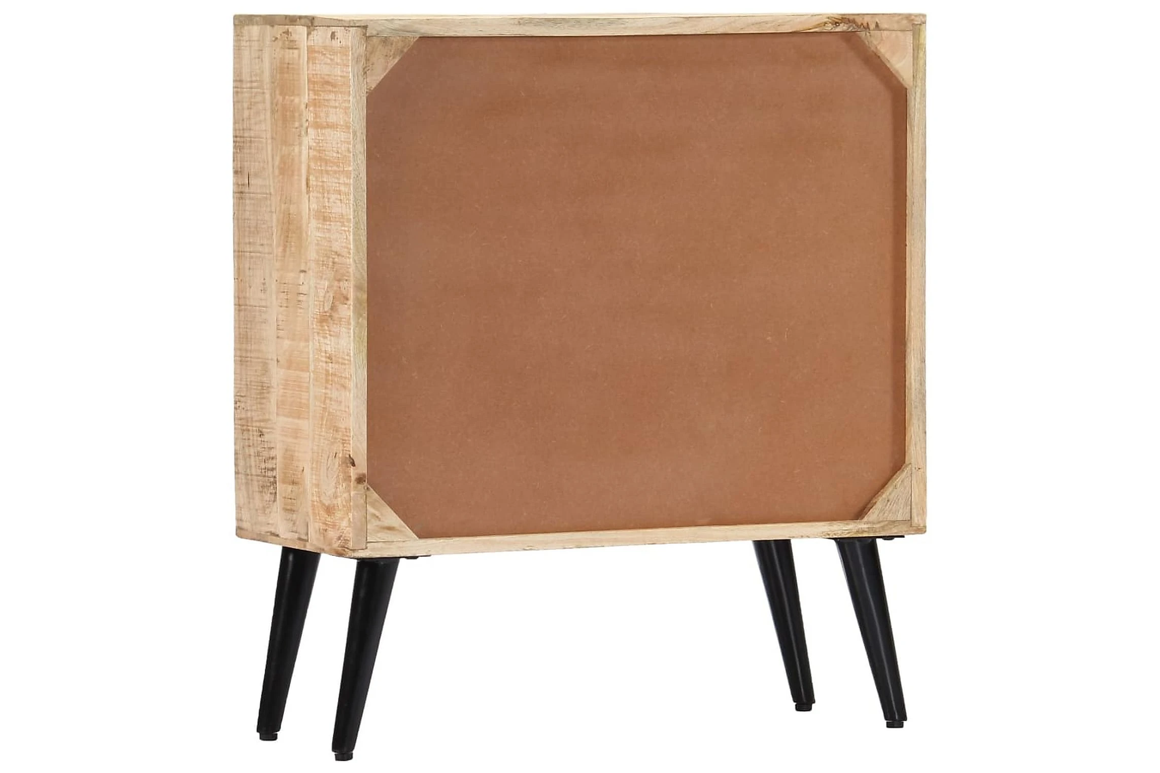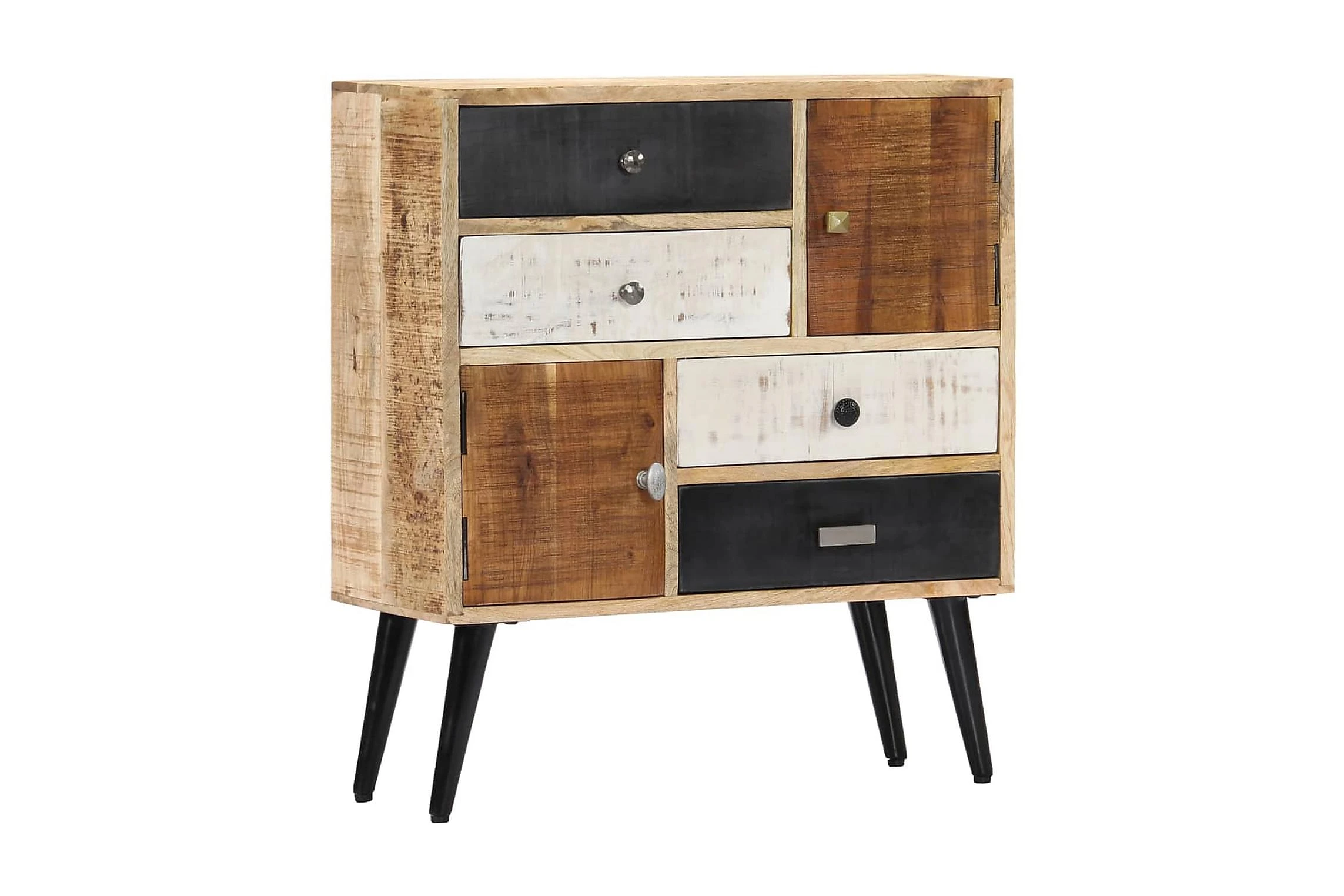 Skänken är tillverkad av massivt mangoträ och har fått en vacker ytbehandling genom polering och lackering för ett elegant utseende. Mangoträ är ett tätt och robust lövträ som har vackra strimmor eller konturer på ytan. Den har 4 lådor och 2 dörrar med gott om plats för att förvara dina böcker, tidskrifter och andra föremål. Skänken är enkel att montera och enkel att rengöra med en fuktig trasa.