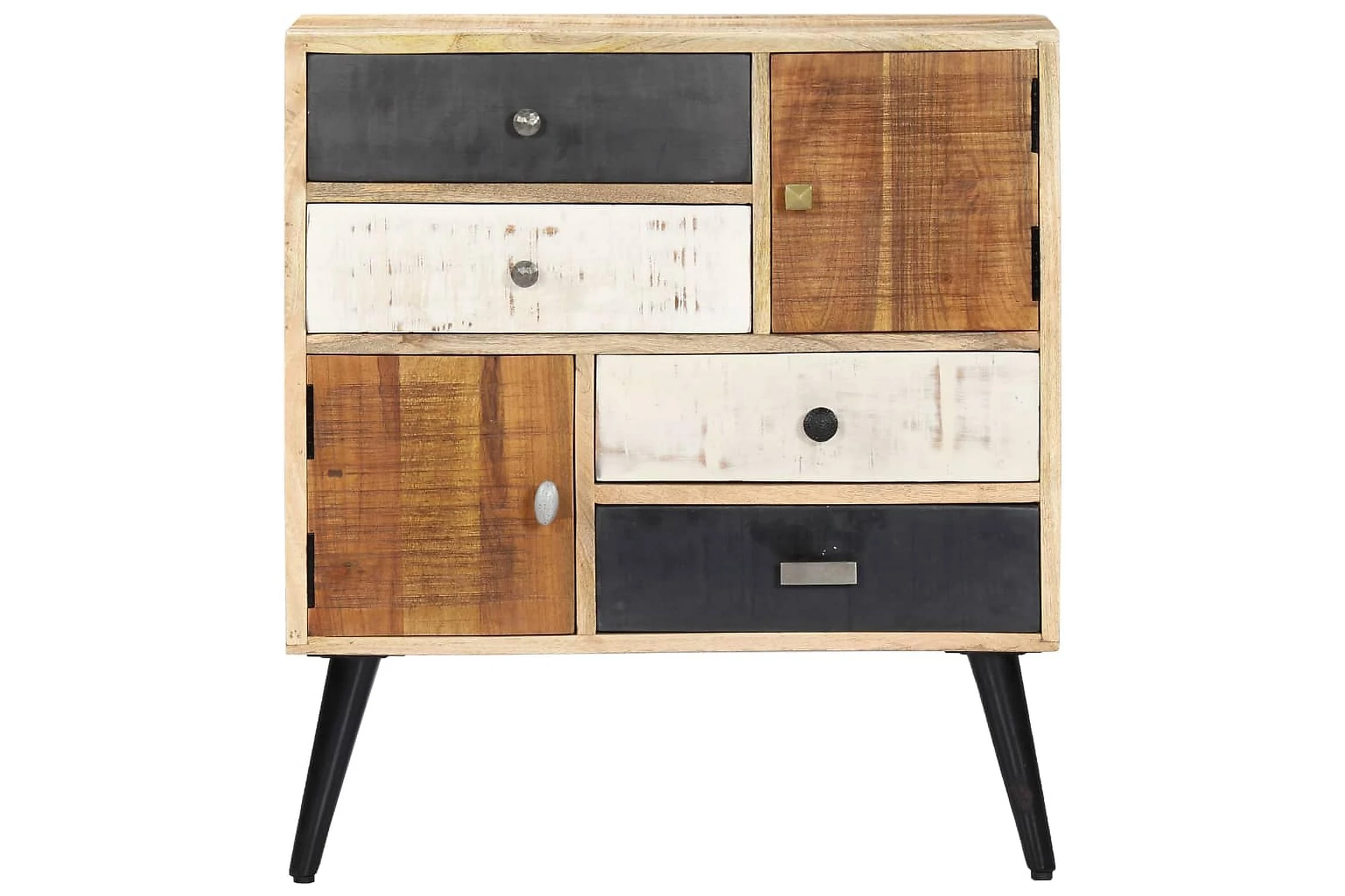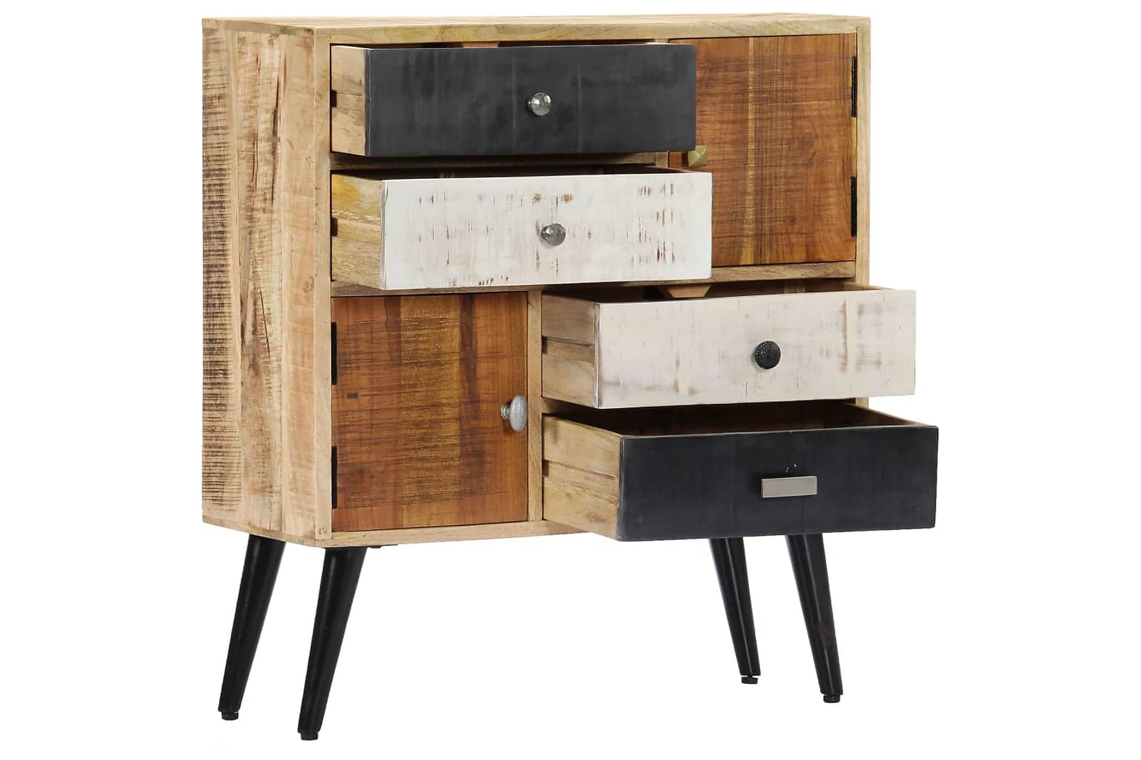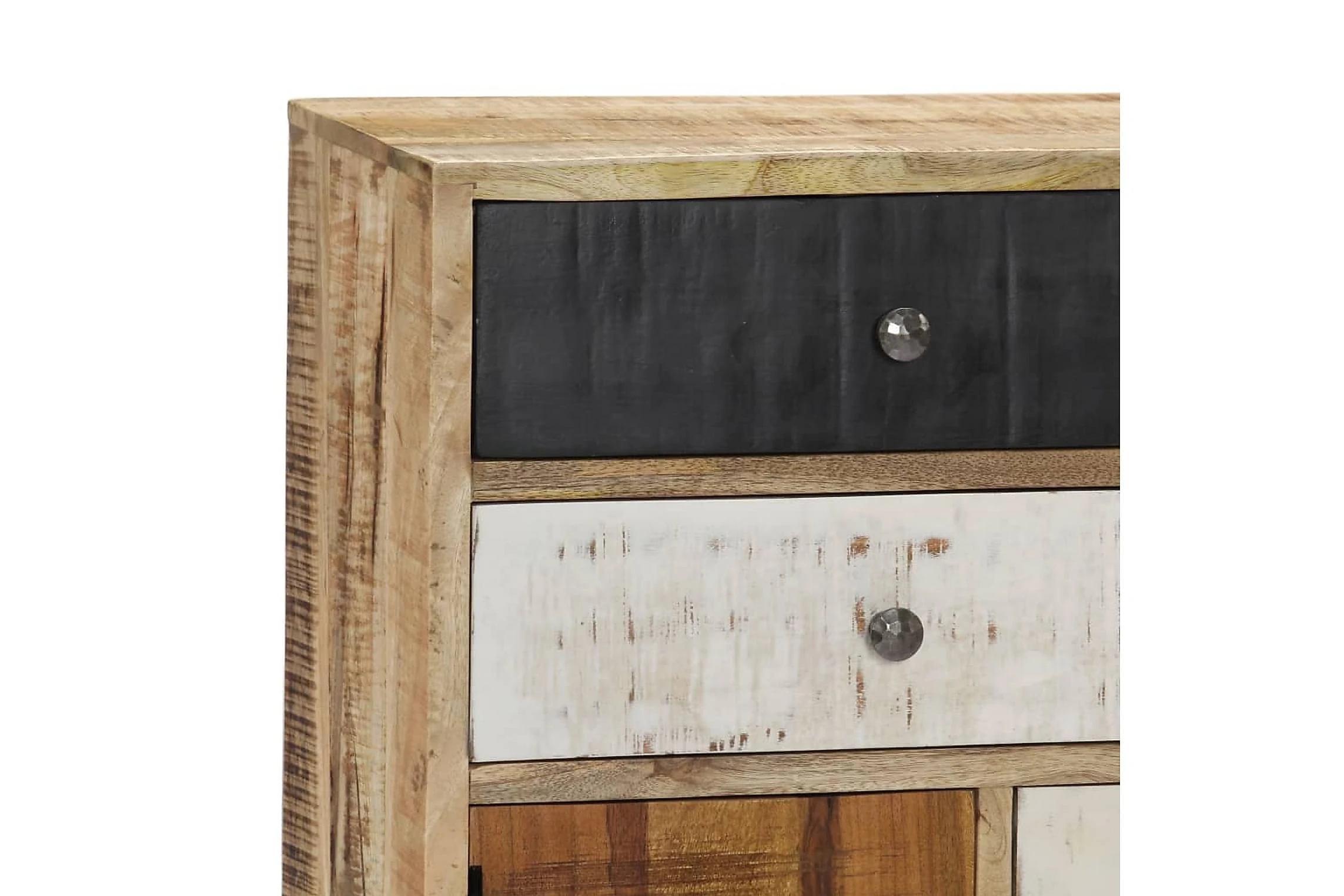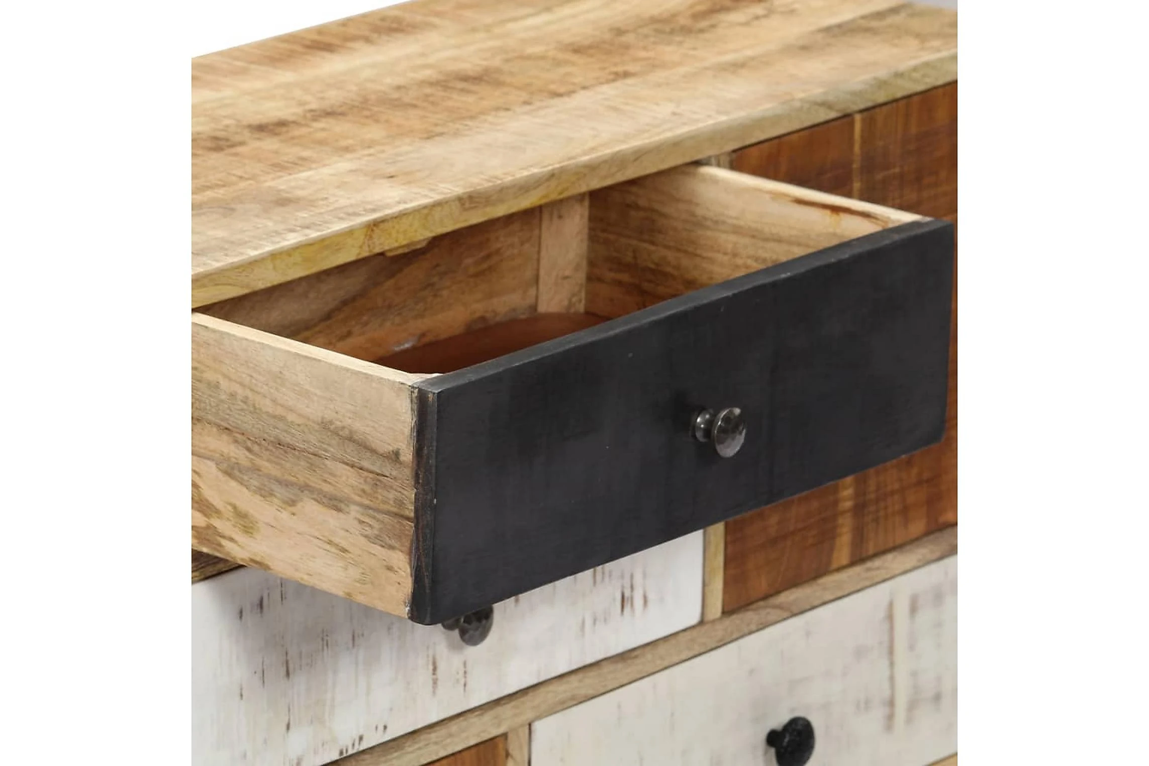 Skänken är tillverkad av massivt mangoträ och har fått en vacker ytbehandling genom polering och lackering för ett elegant utseende. Mangoträ är ett tätt och robust lövträ som har vackra strimmor eller konturer på ytan. Den har 4 lådor och 2 dörrar med gott om plats för att förvara dina böcker, tidskrifter och andra föremål. Skänken är enkel att montera och enkel att rengöra med en fuktig trasa.