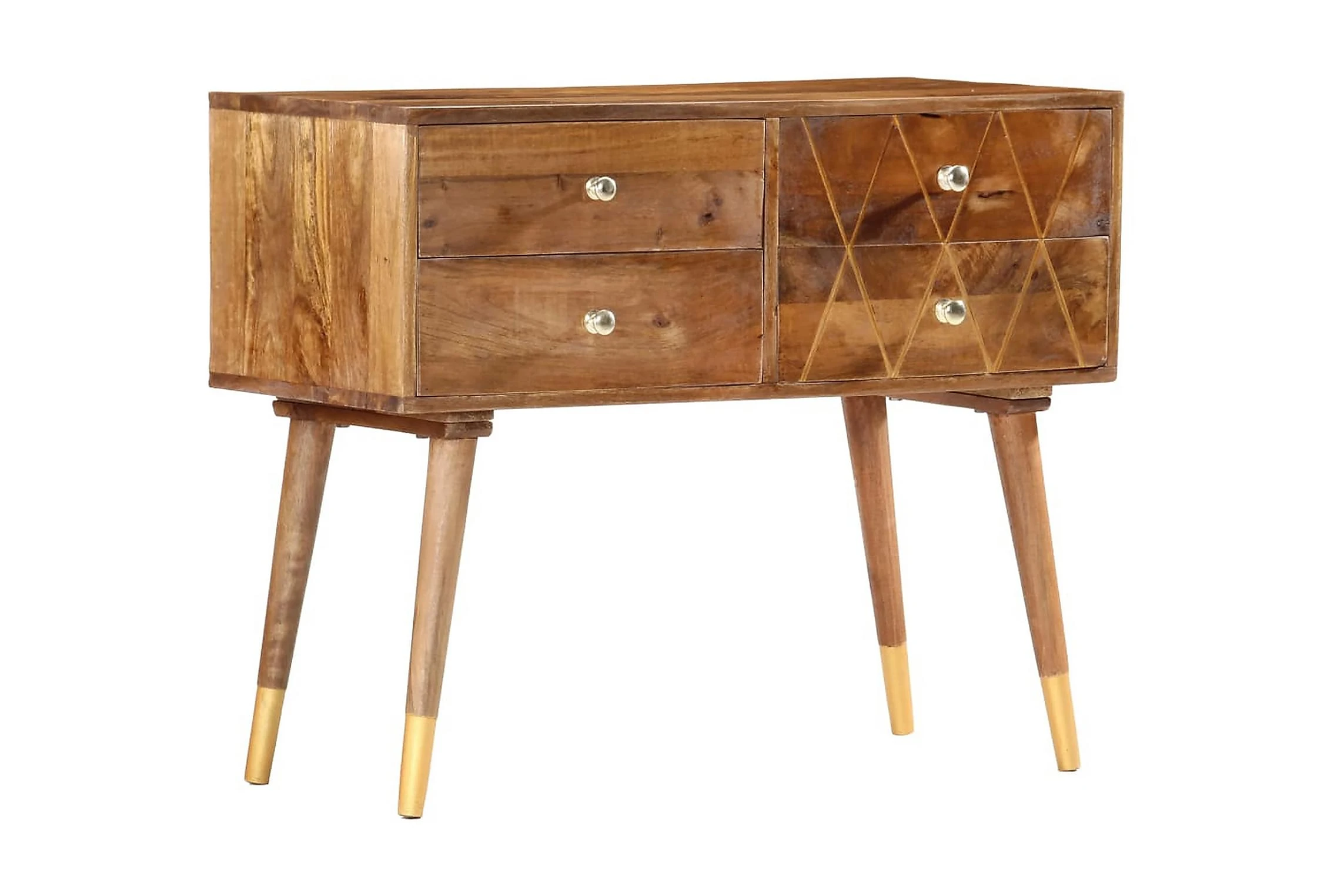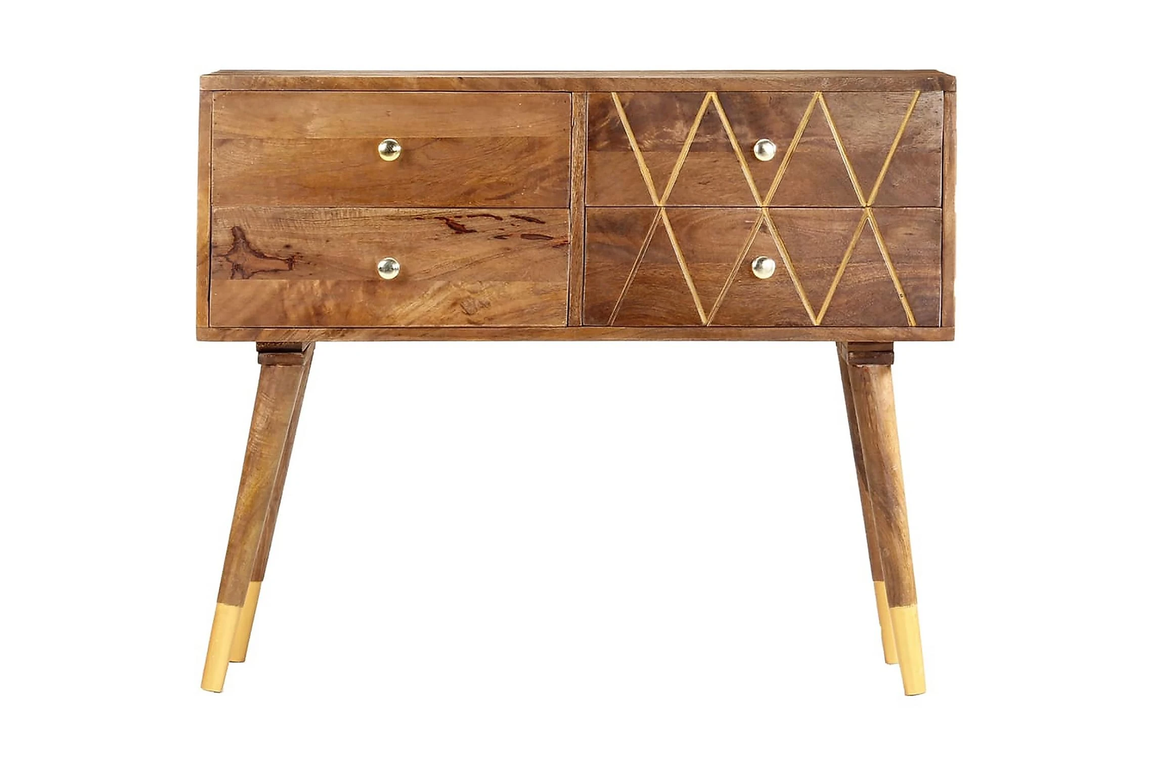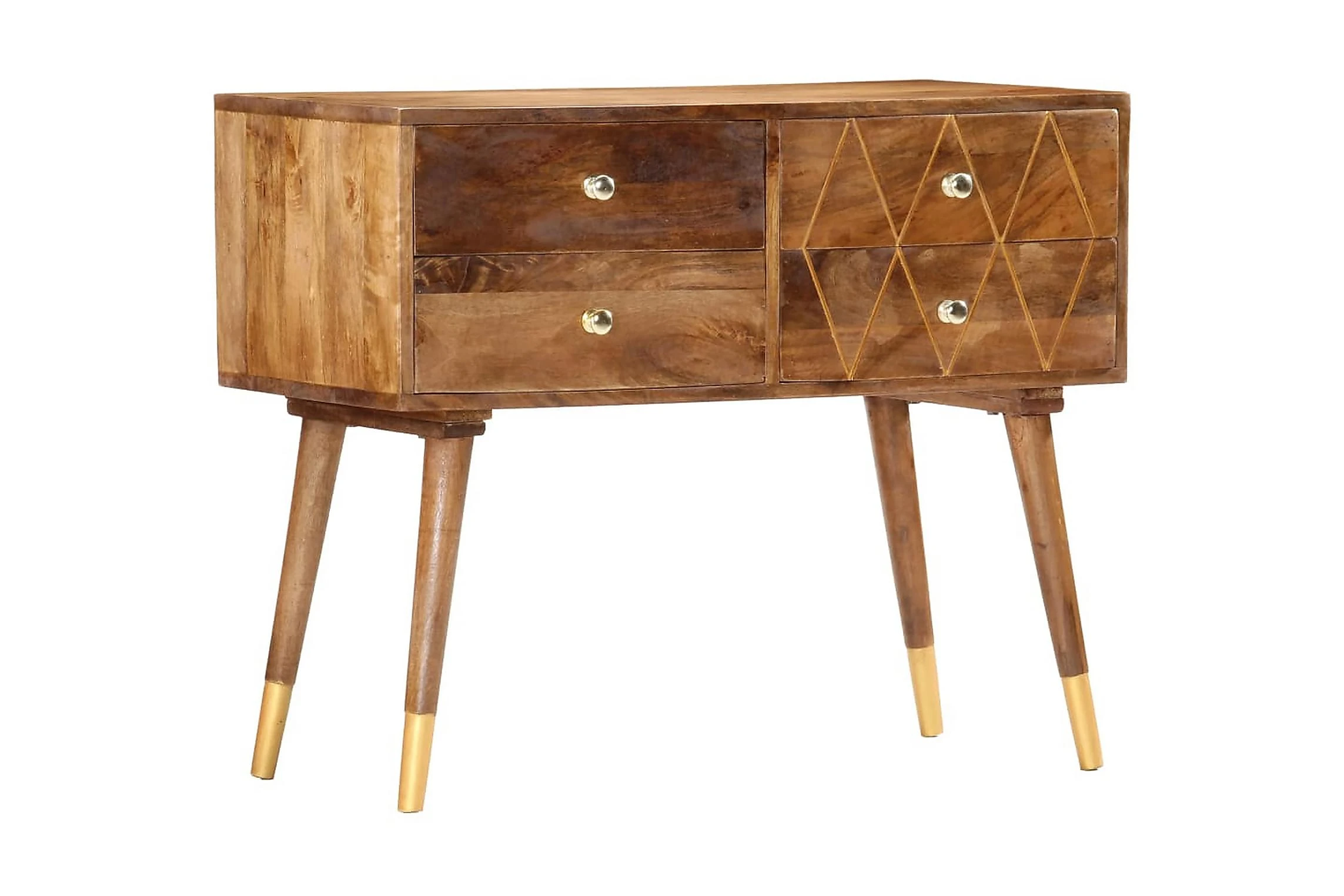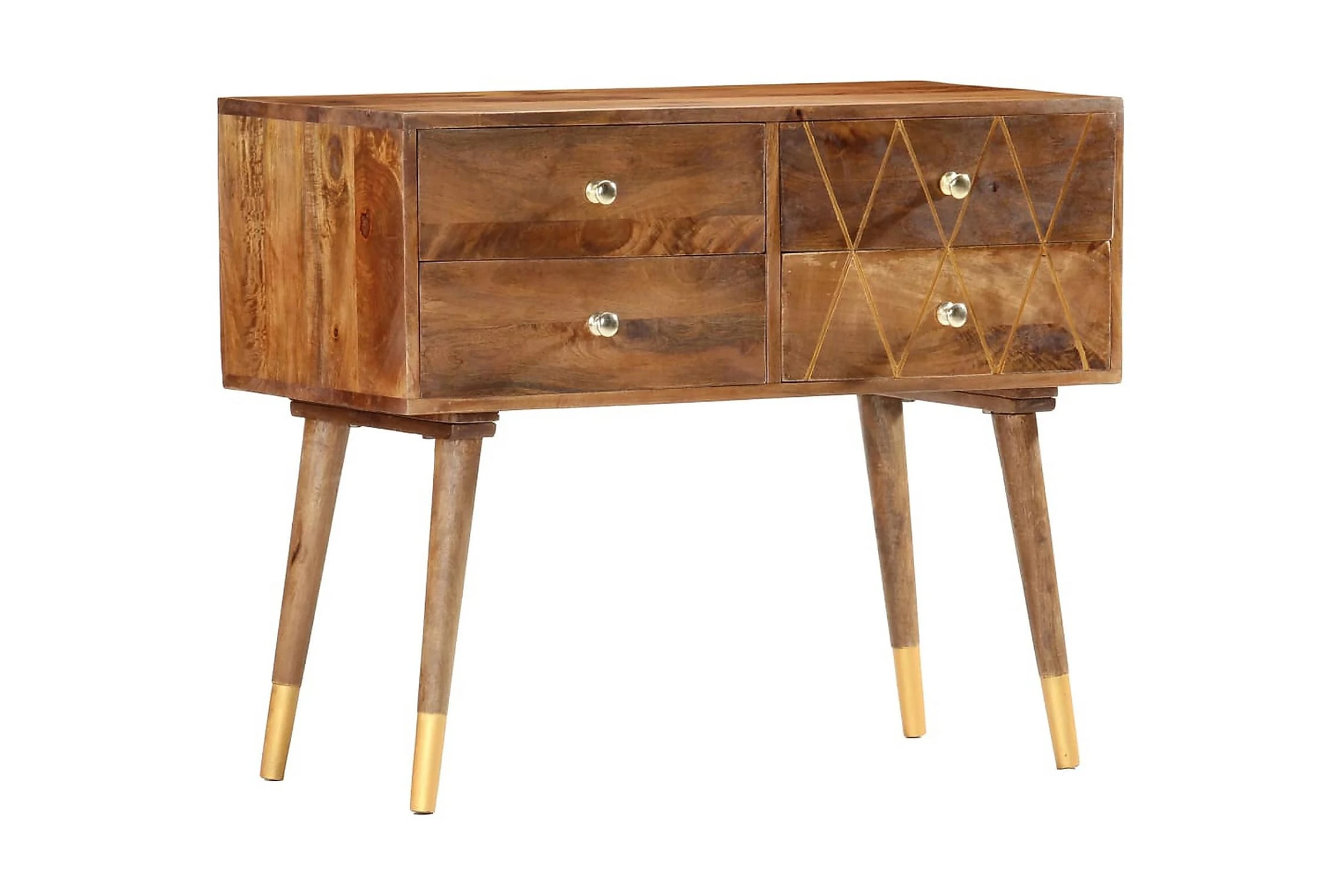Skänken är tillverkad i massivt mangoträ, ett tätt och robust lövträ som har vackra strimmor och konturer i brunt eller guld på ytan. De vackra träådringarna gör varje möbel unik och något olik andra. Skänken har en stadig yta där du kan ställa fruktskålar, vaser eller andra dekorativa föremål. 4 lådor ger extra förvaringsutrymme. Monteringen är enkel.