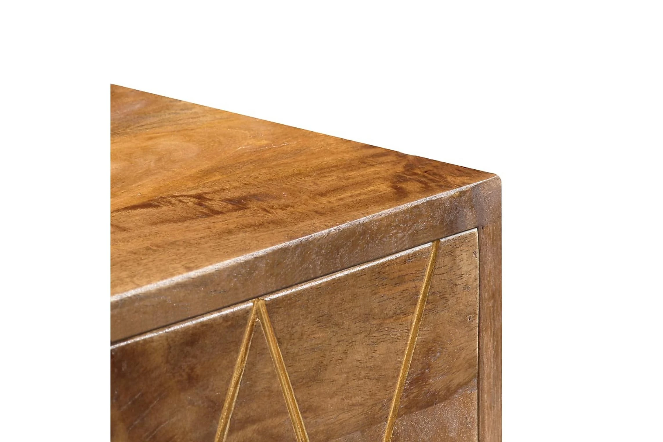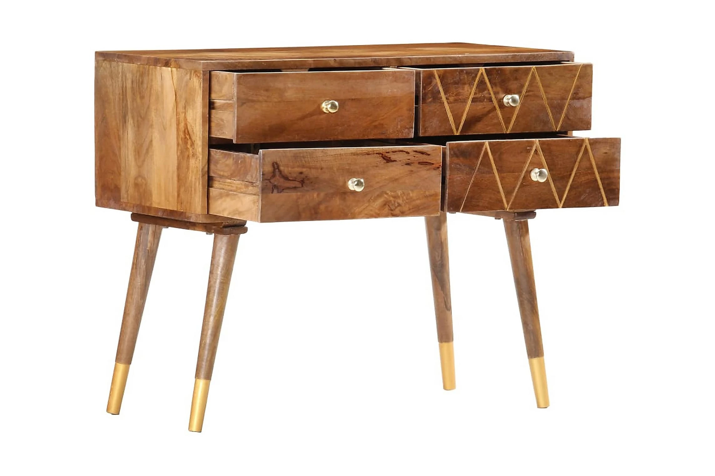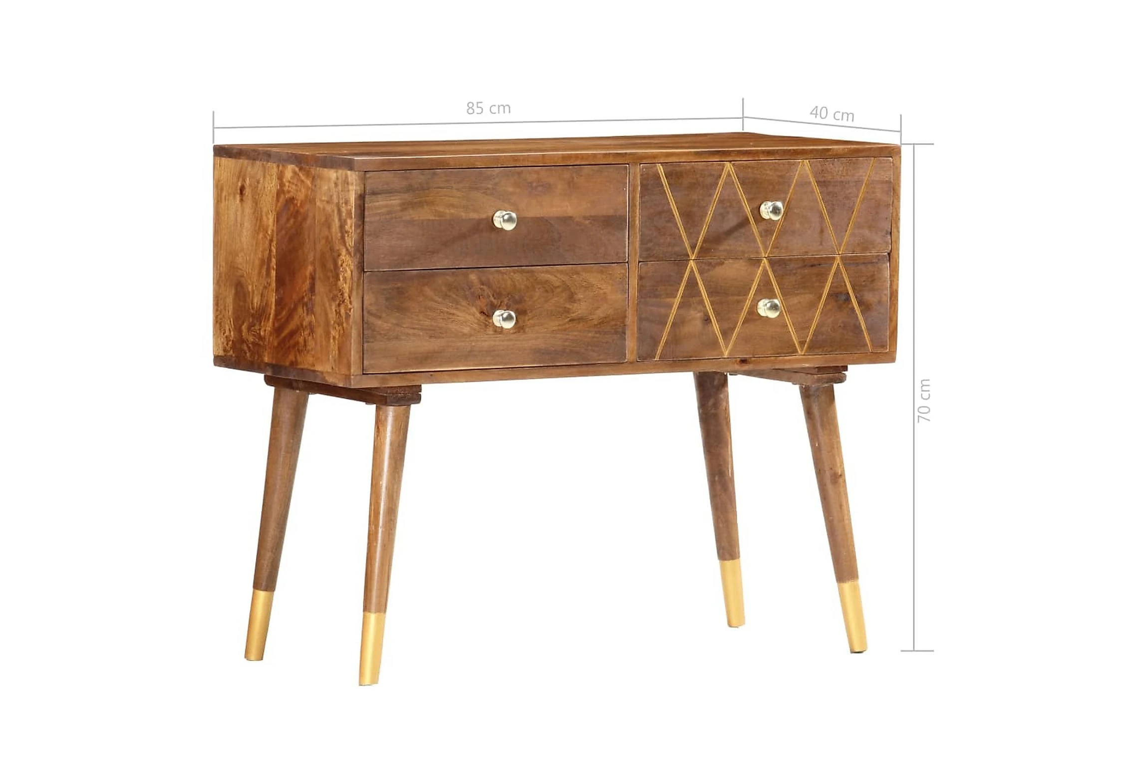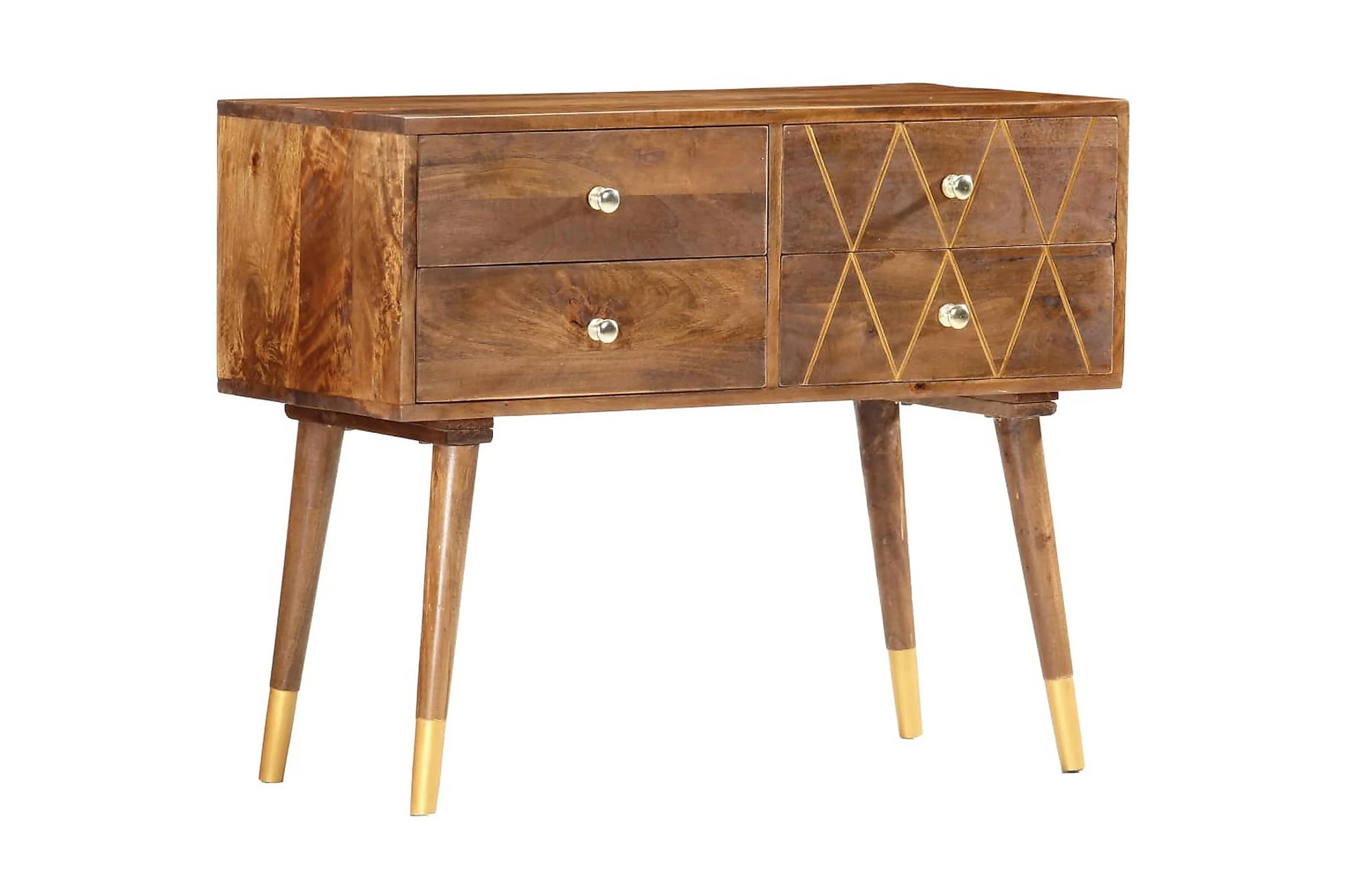 Skänken är tillverkad i massivt mangoträ, ett tätt och robust lövträ som har vackra strimmor och konturer i brunt eller guld på ytan. De vackra träådringarna gör varje möbel unik och något olik andra. Skänken har en stadig yta där du kan ställa fruktskålar, vaser eller andra dekorativa föremål. 4 lådor ger extra förvaringsutrymme. Monteringen är enkel.