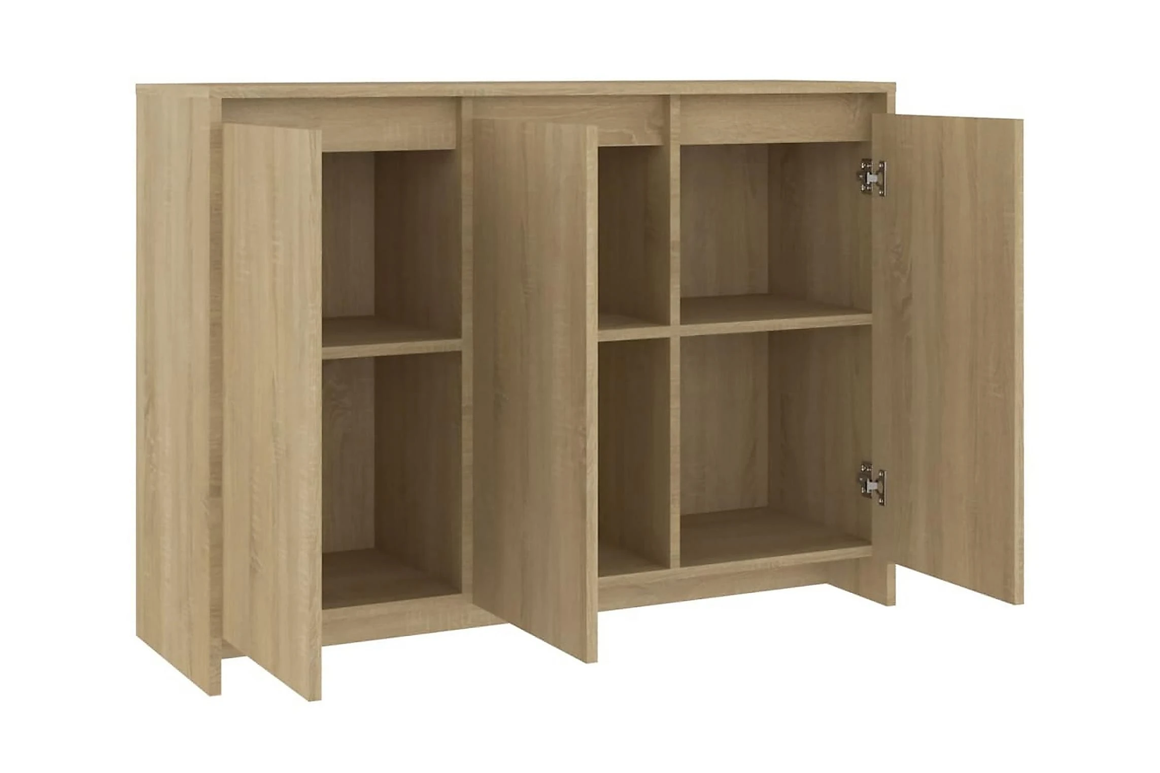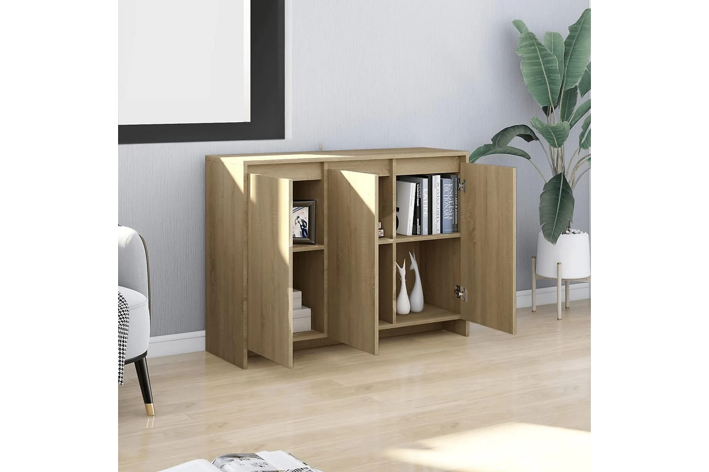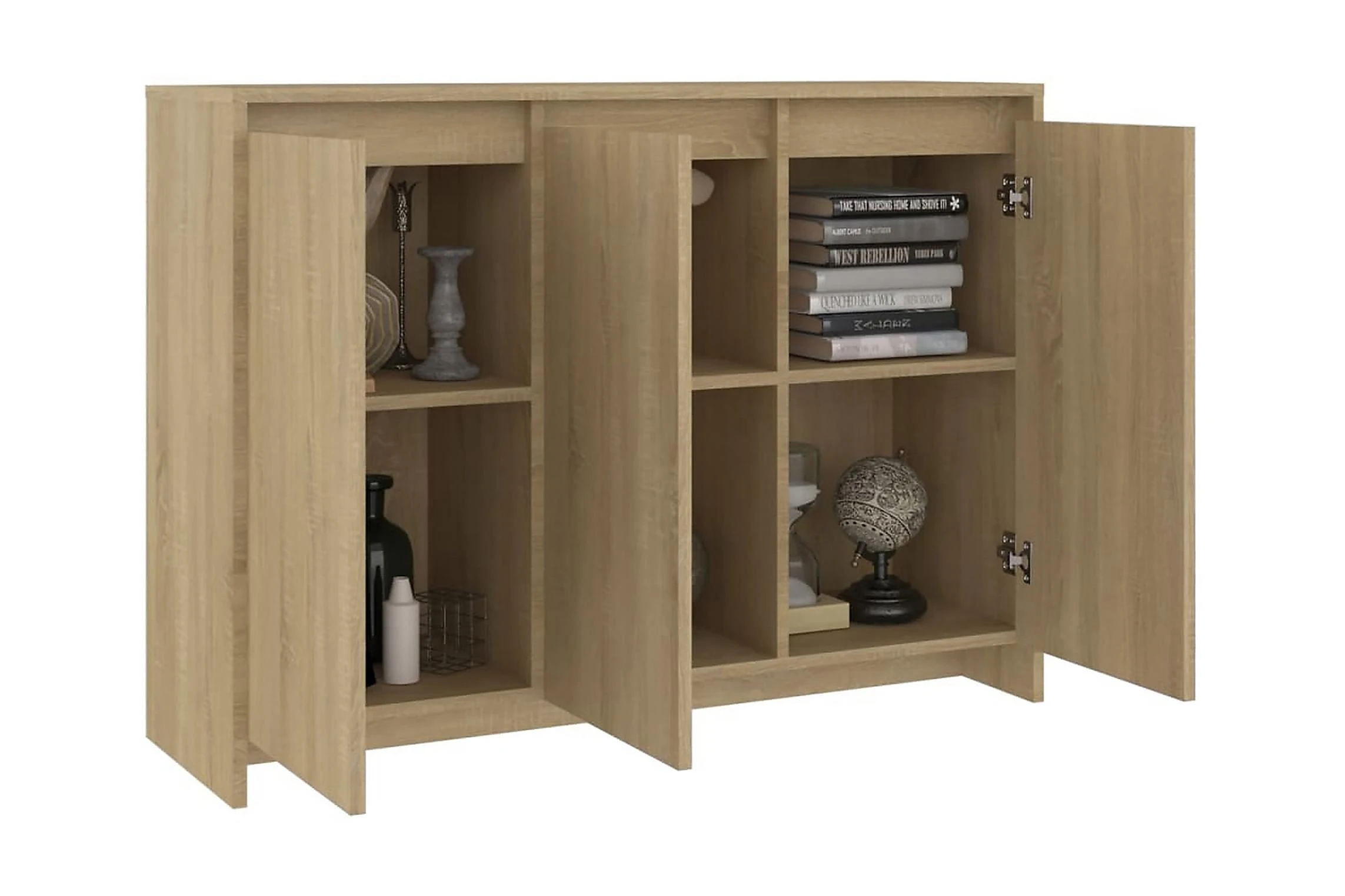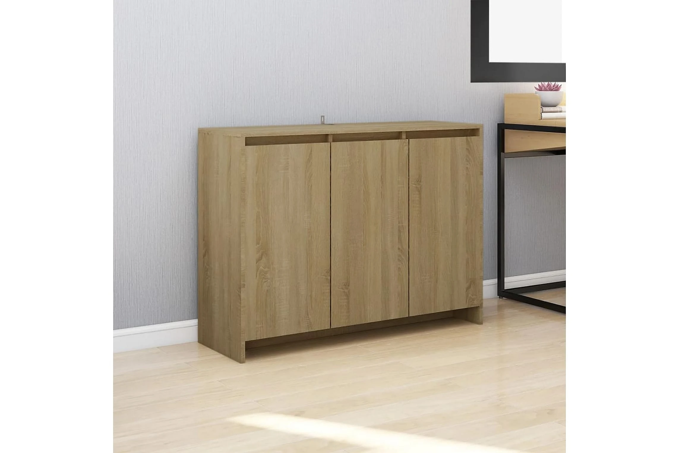 Denna skänk har en robust och hållbar konstruktion. Med 3 dörrar ger skåpet gott om förvaringsutrymme för böcker, multimedieapparater och andra föremål. Den robusta toppen är idealisk för att placera dekorativa föremål, fotoramar eller krukväxter på.