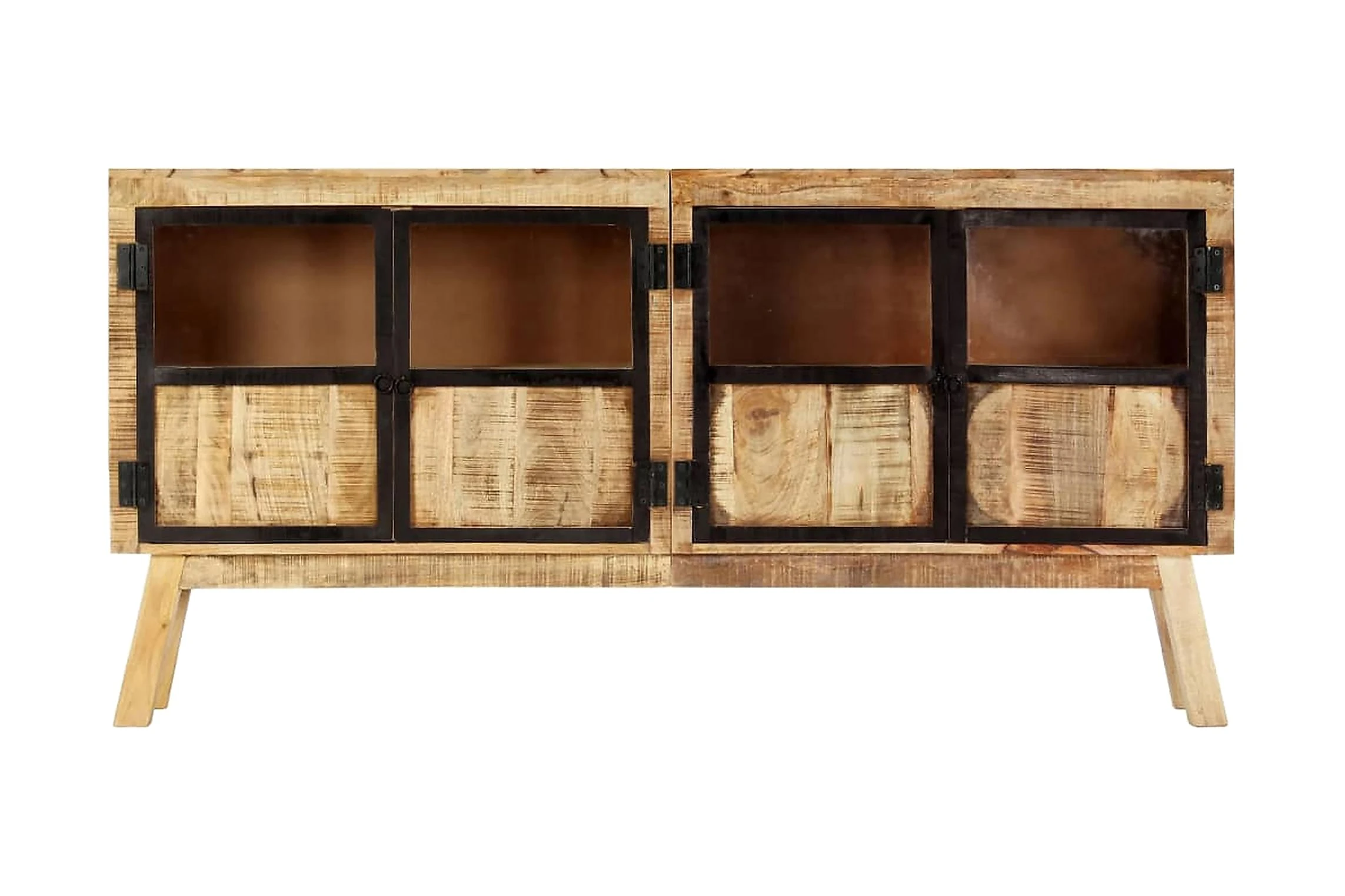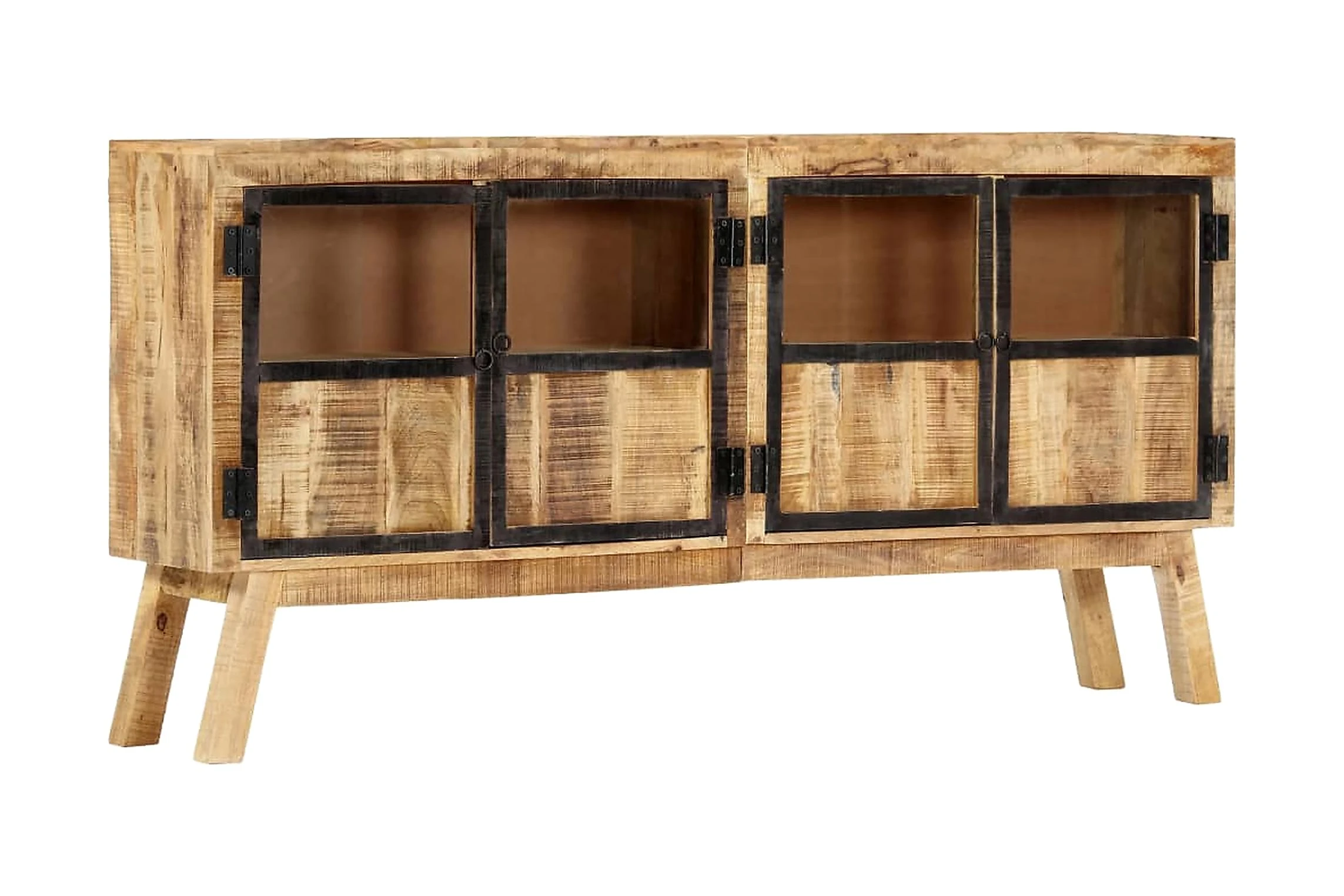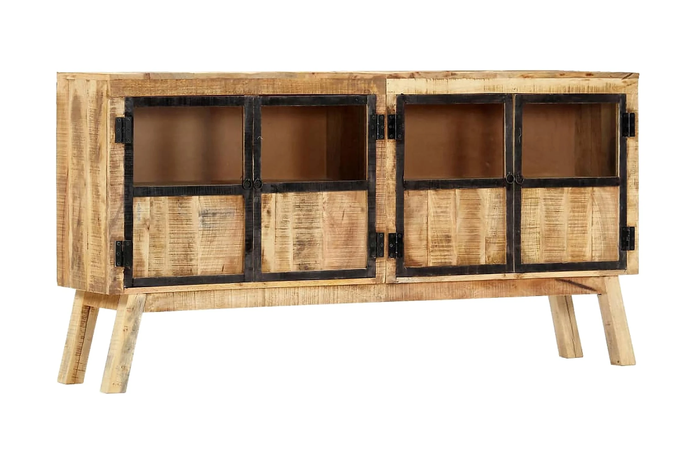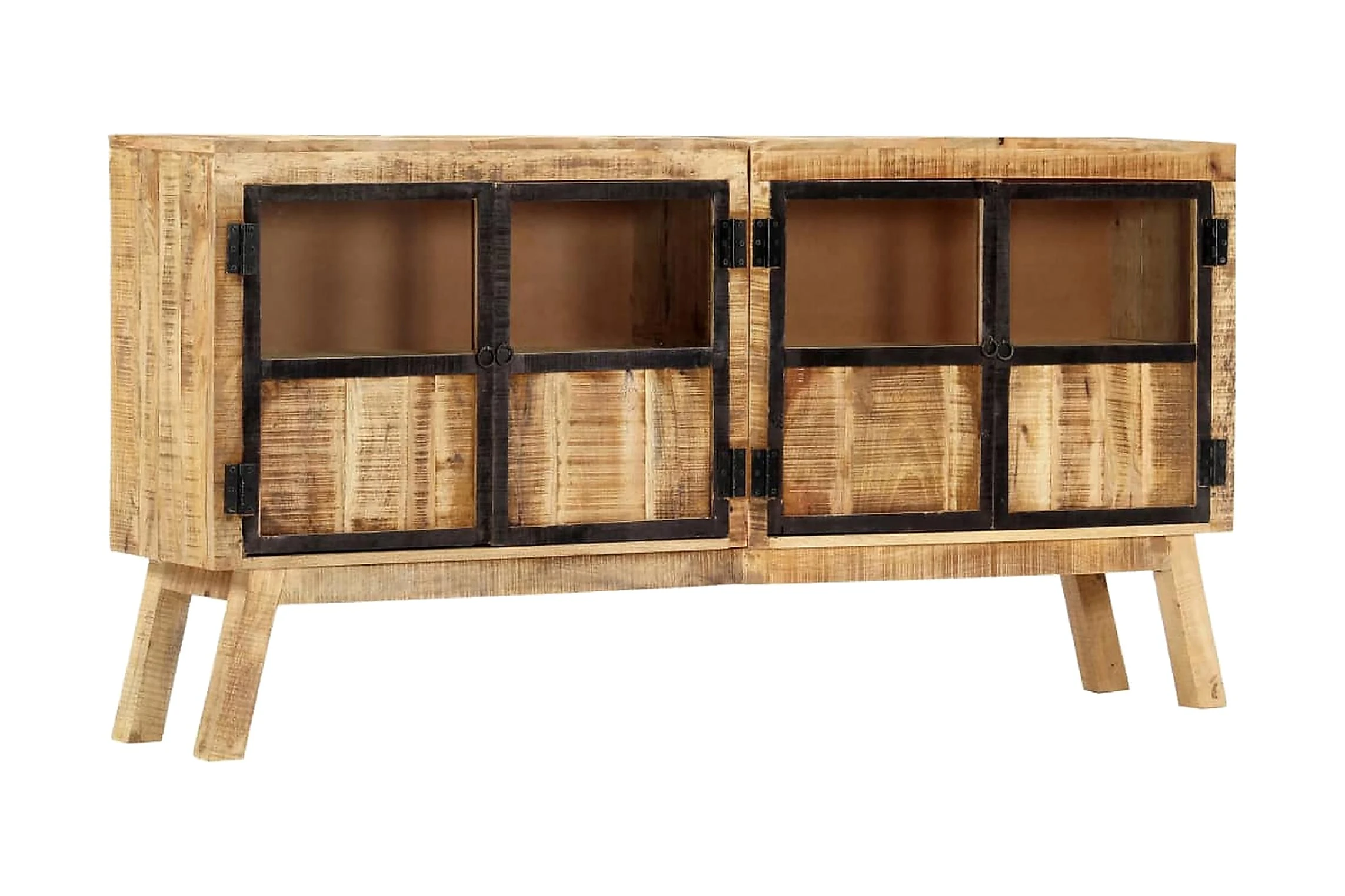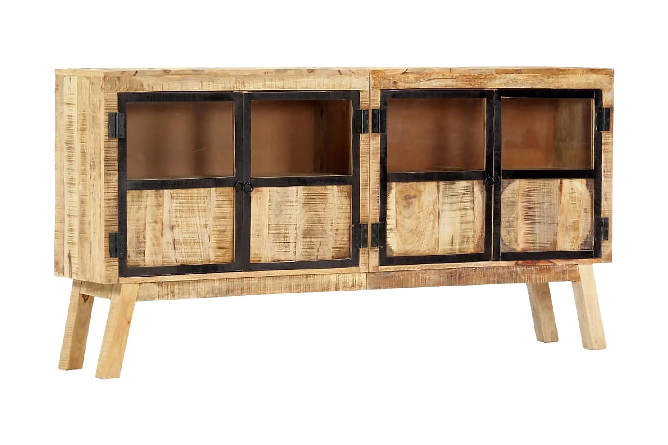 Skåpet är tillverkat av massivt grovt mangoträ och är ytterst stabilt och hållbart. Träskänken med 2 dörrar har gott om plats för att förvara tidskrifter, böcker, prydnader och andra småsaker inom räckhåll. Trästommen bidrar till dess industriella design.