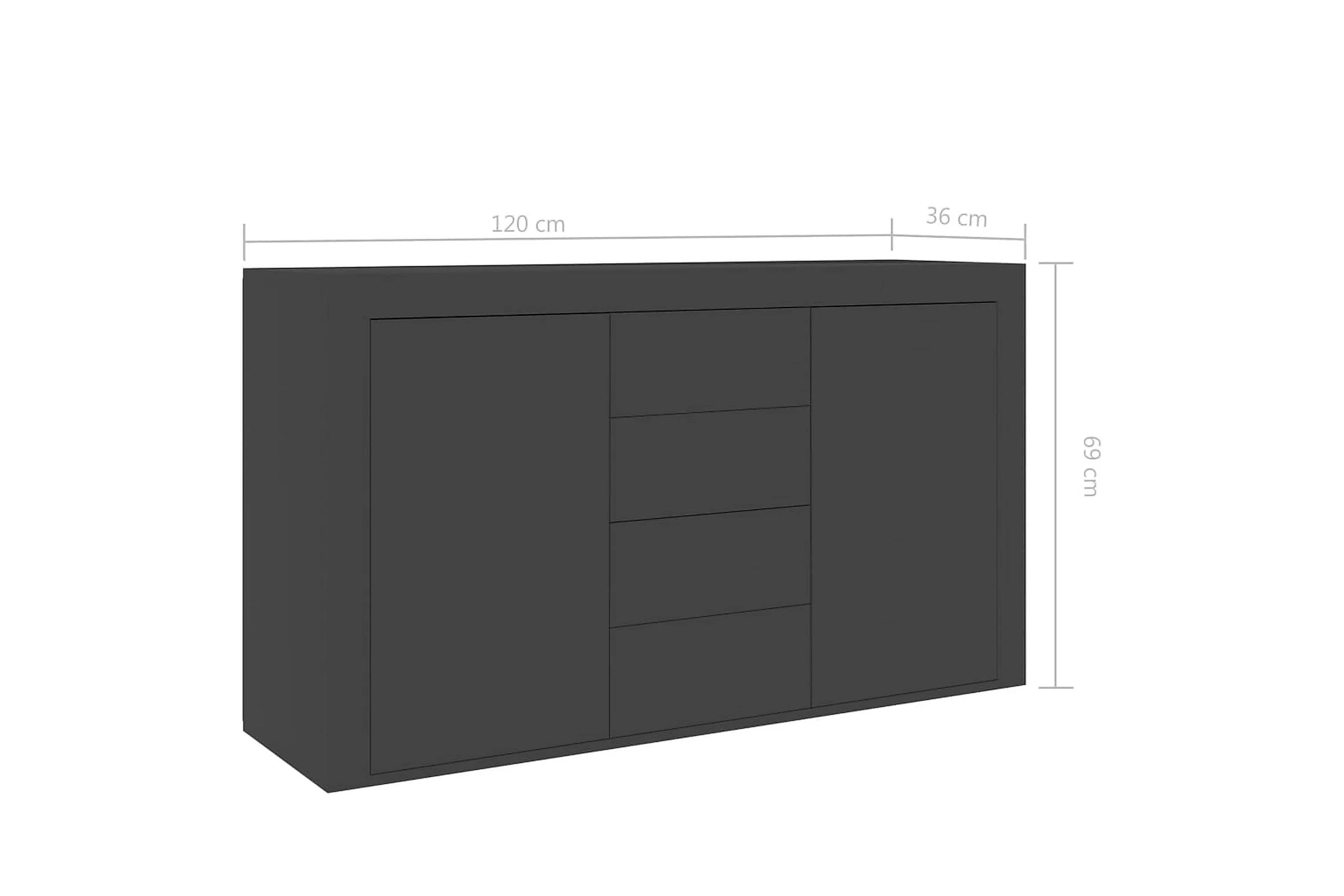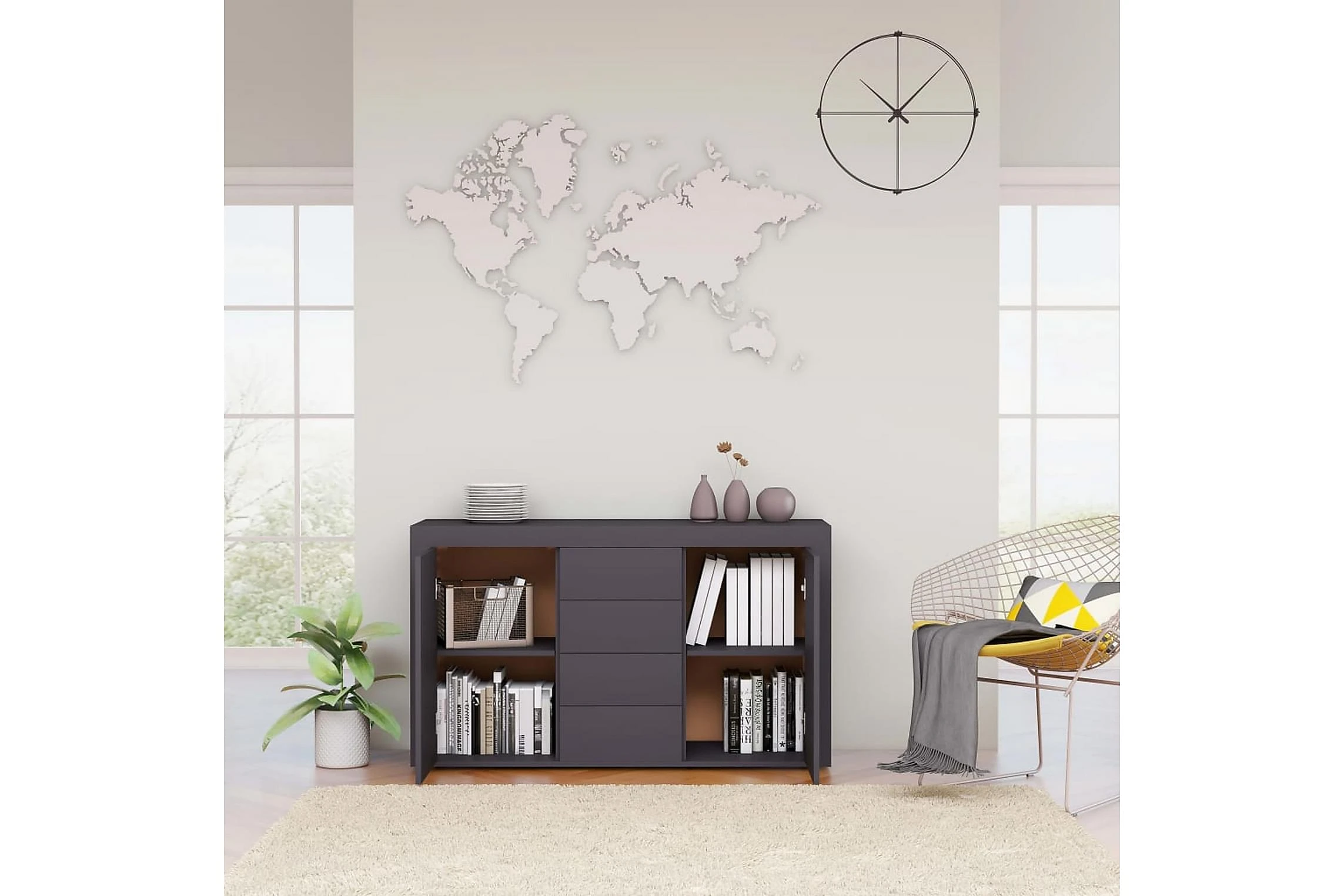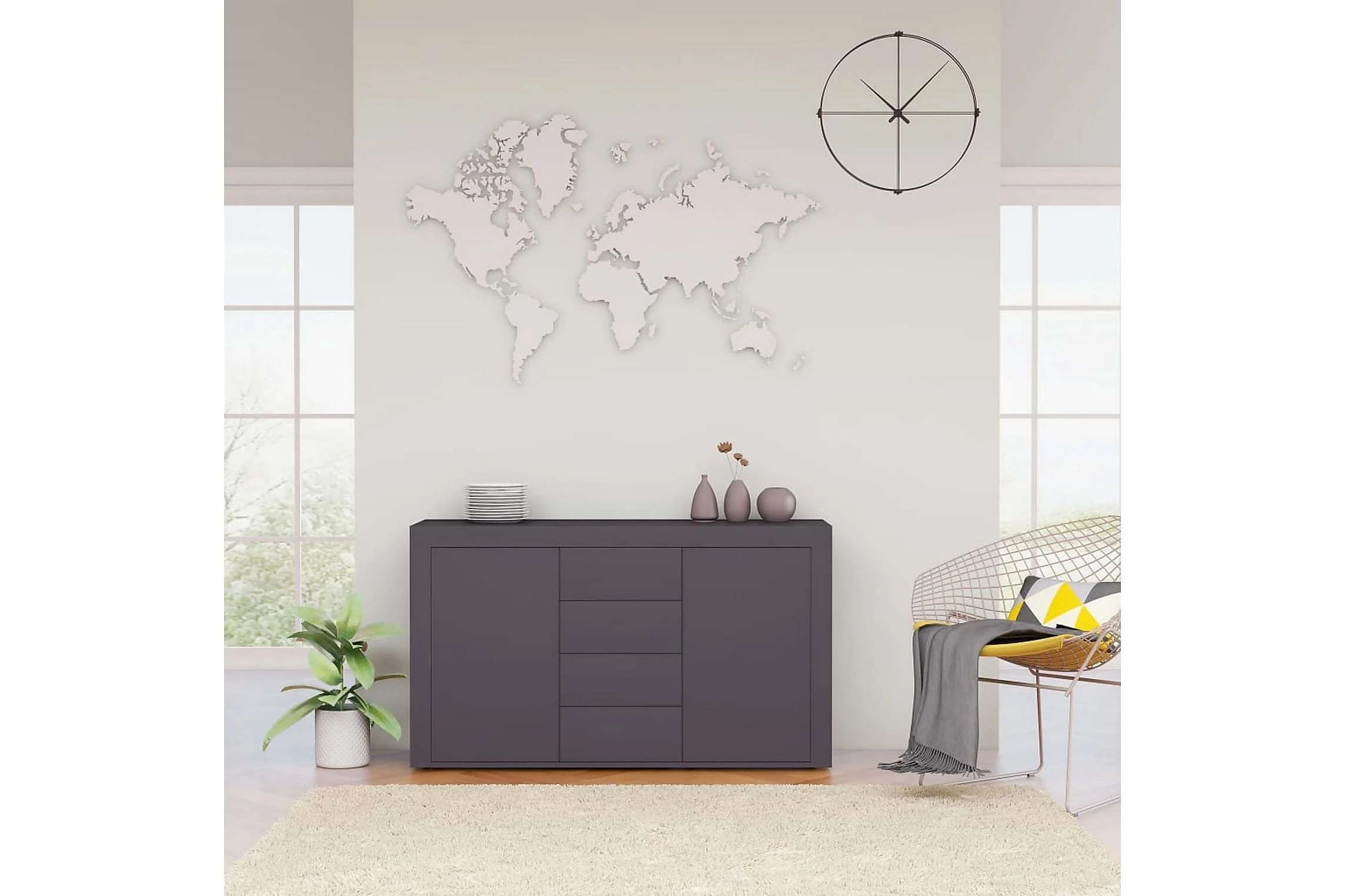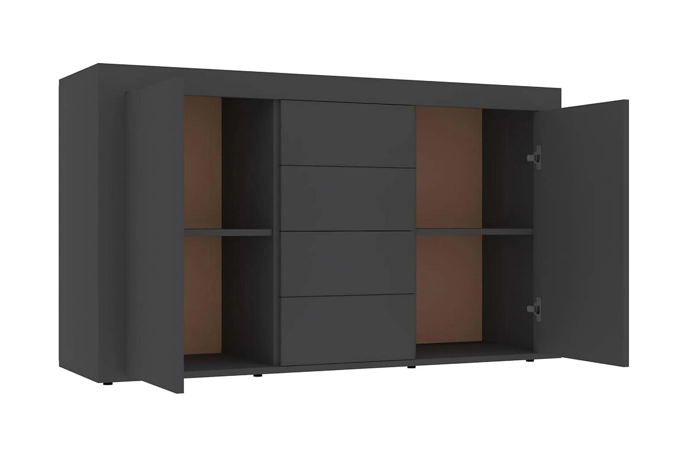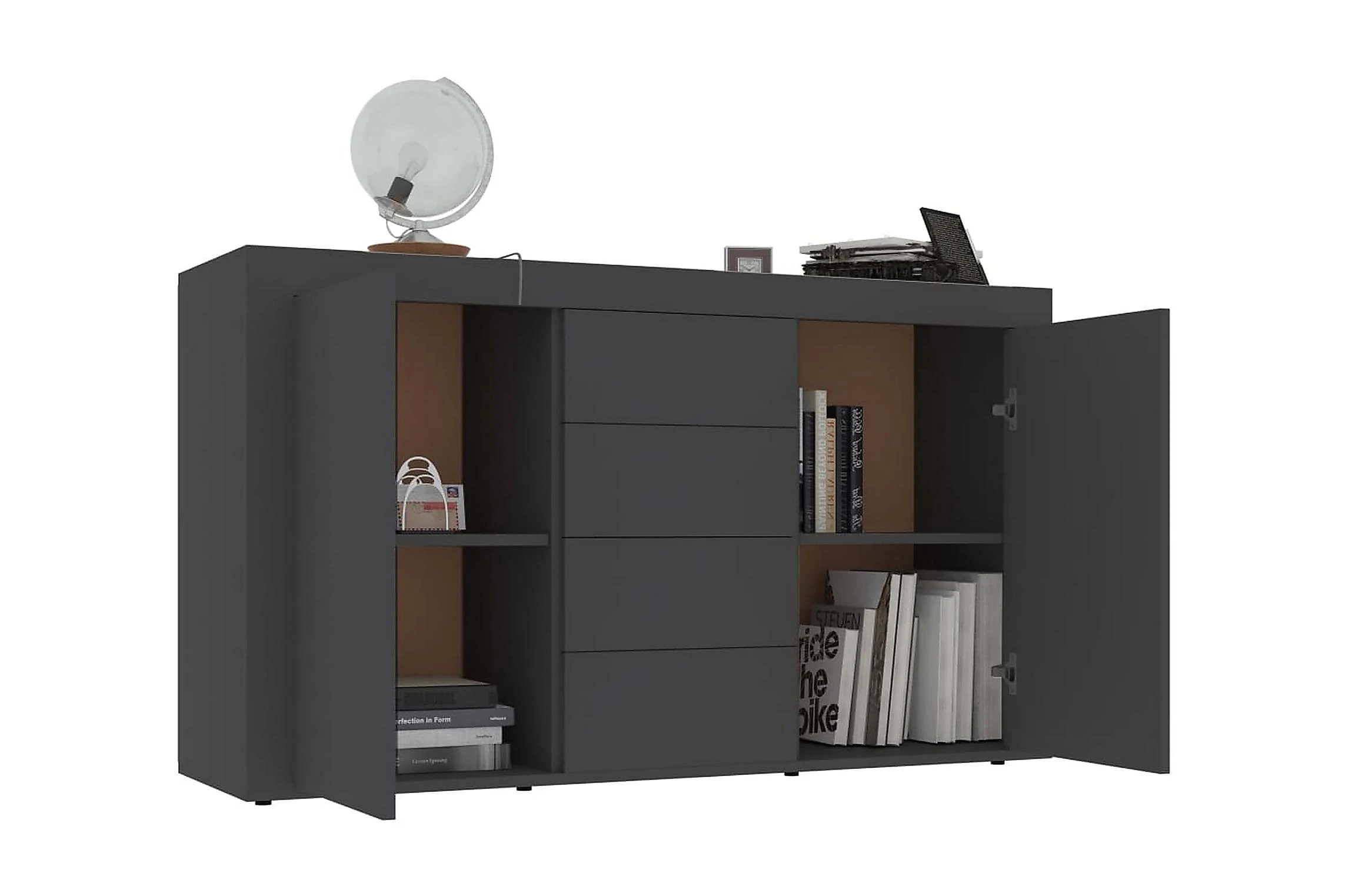 Skänken med 2 luckor och 4 lådor har gott om förvaringsplats för böcker, mediaenheter och andra saker. Den stadiga ovansidan är perfekt för att visa upp prydnadsföremål, fotoramar eller krukväxter. Skänken är byggd för att hålla tack vare dess premium spånskiva. Den kan enkelt rengöras med en fuktig trasa.