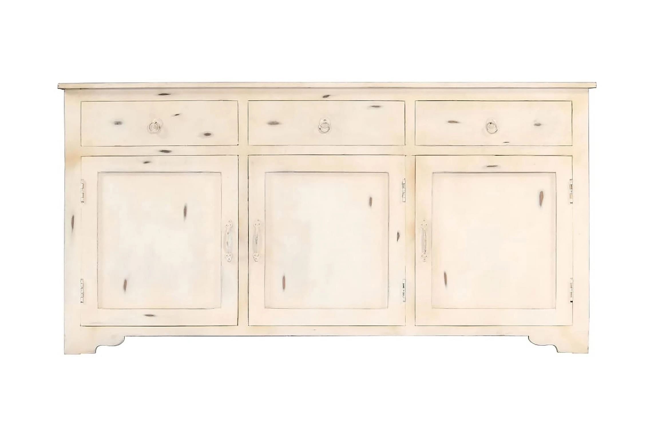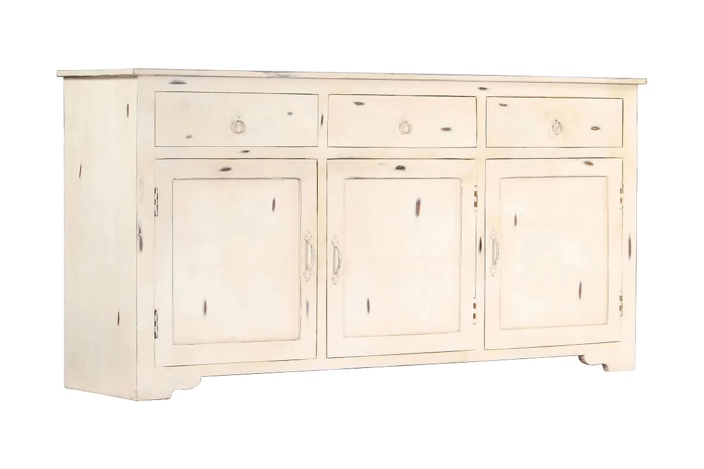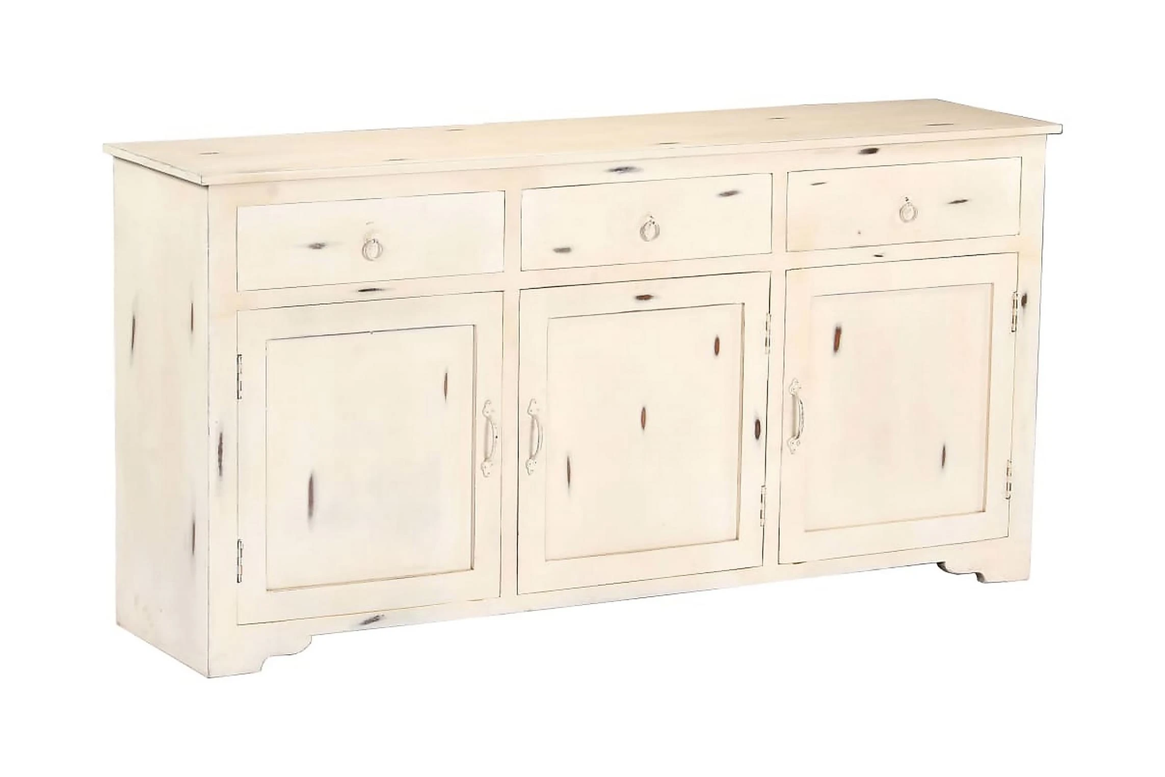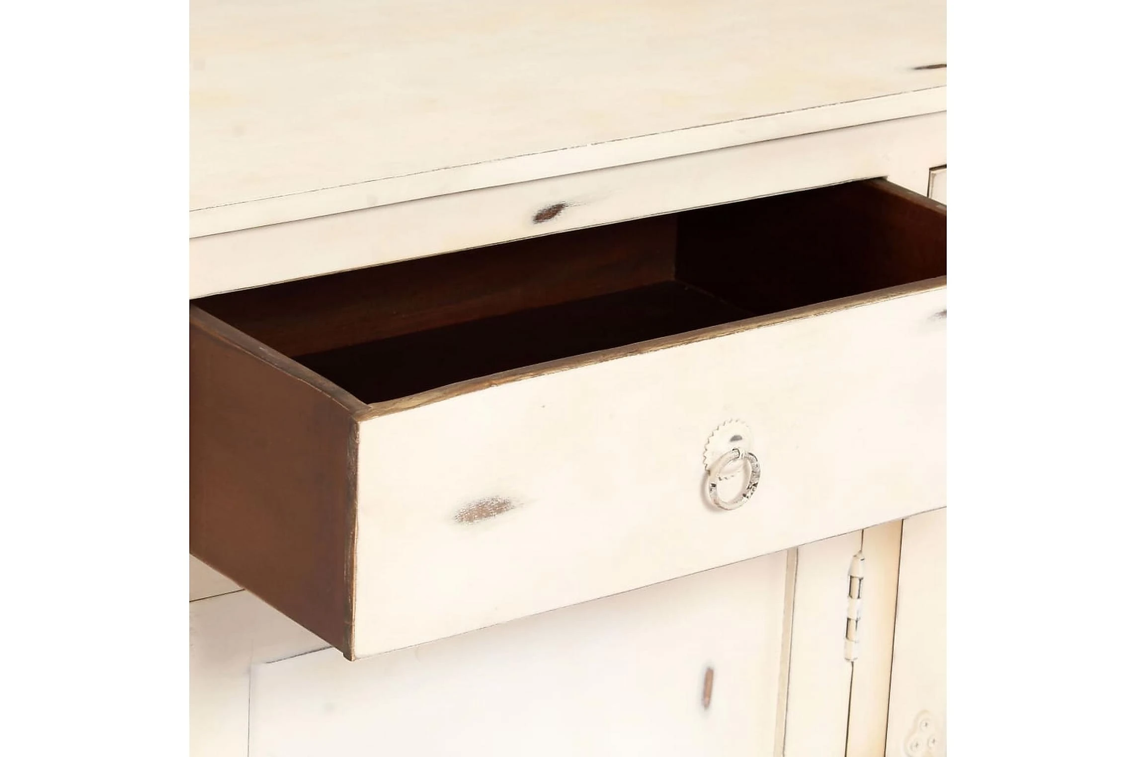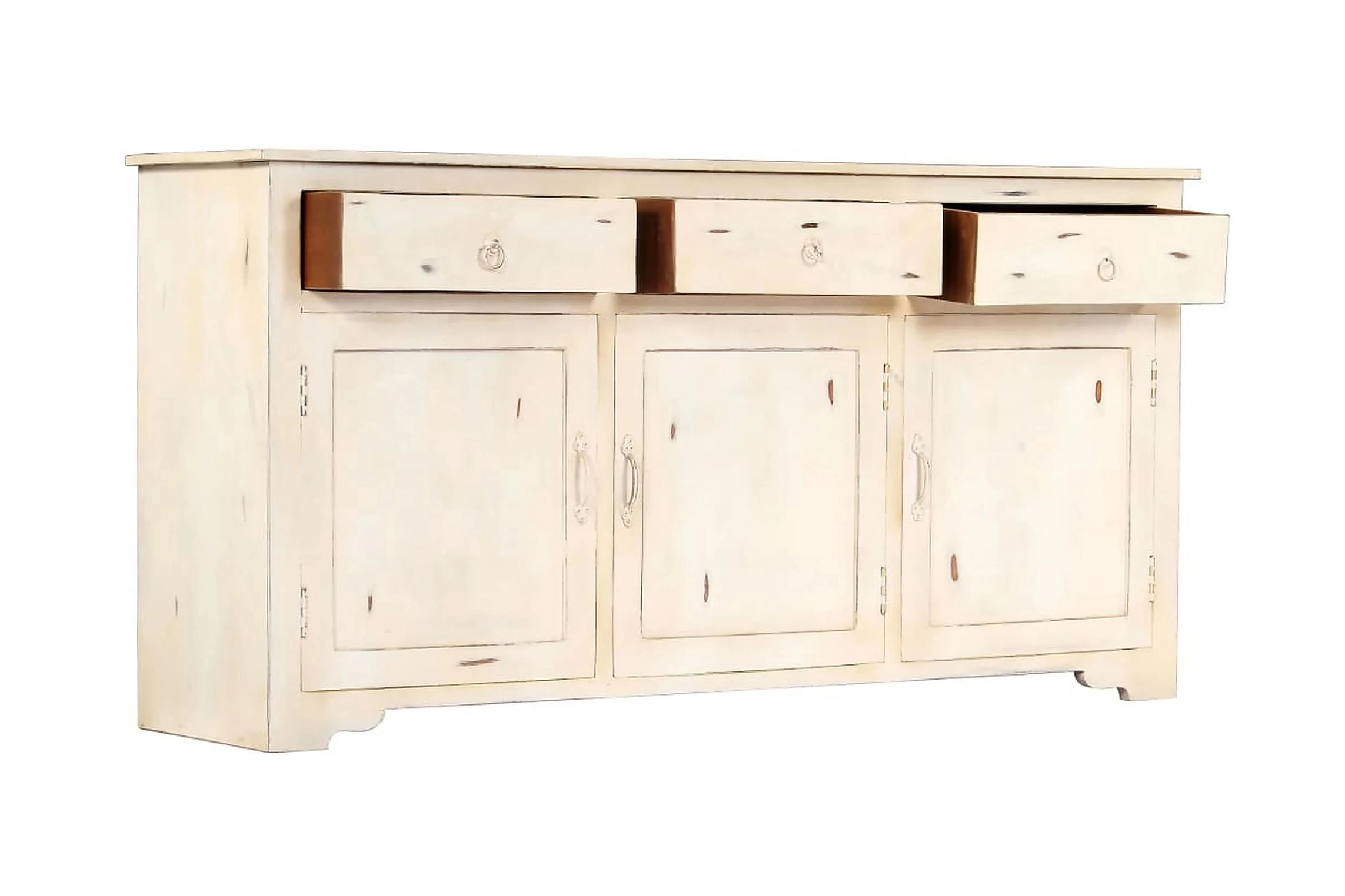 Detta vintageskåp är tillverkat av massivt mangoträ, ett lövträ med täta ådringar. Grovt mangoträ har inte bara styrkan att bära vikten, utan behåller sin hållbarhet under många år. Därför är detta skåp ytterst stabilt, hållbart och iögonfallande. Det förstklassiga hantverket och de eleganta träådringarna gör varje möbel distinkt och något annorlunda än nästa. Detta träskåp har 3 lådor och 2 skåp med 3 dörrar, vilket ger gott om förvaringsutrymme för dina kläder, böcker och andra saker.