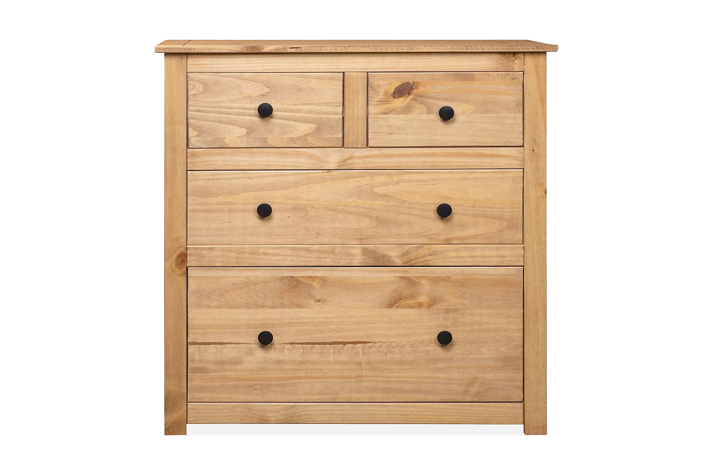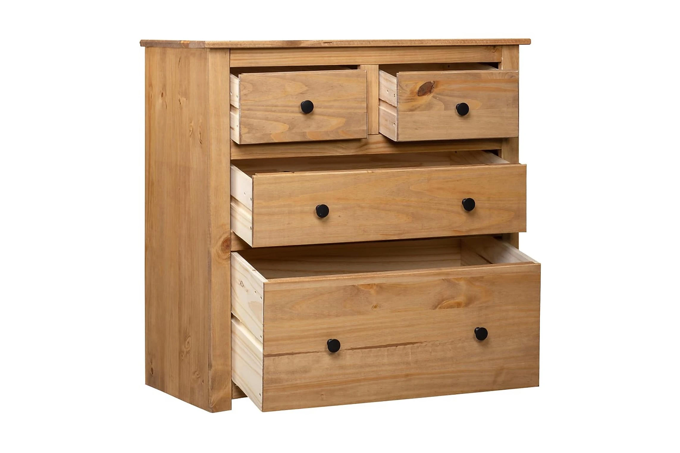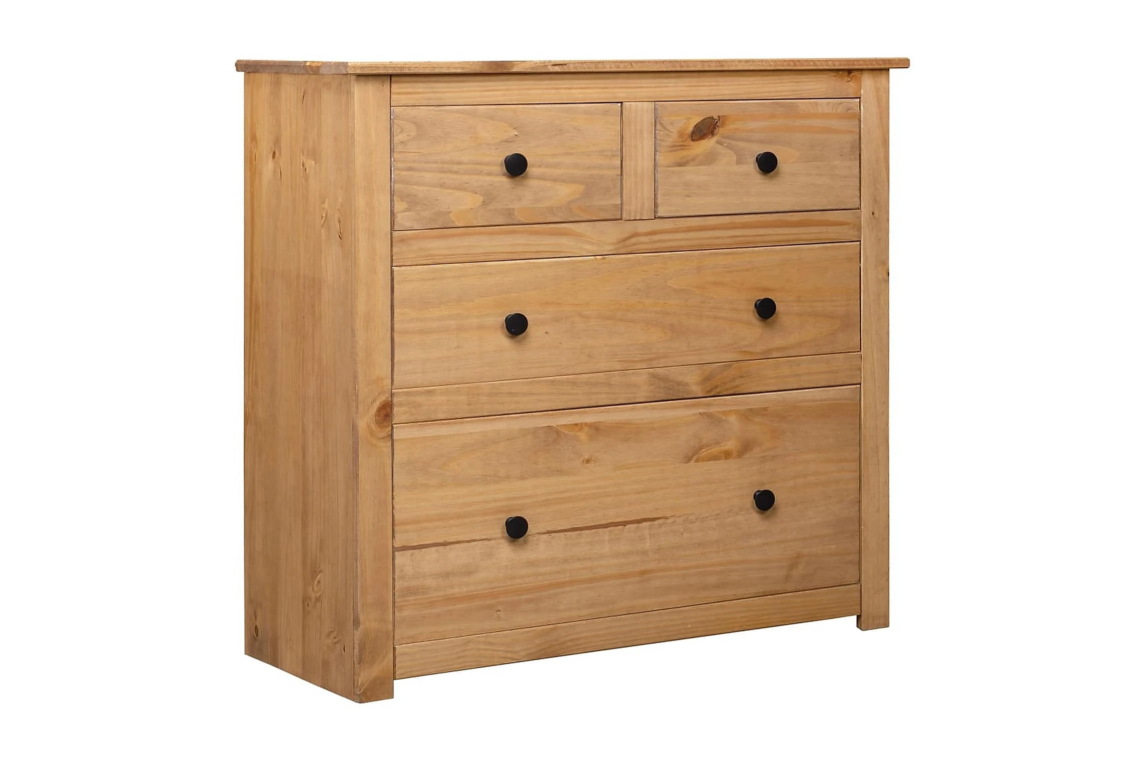 Tack vare skänkens 4 lådor kan du förvara dina tidskrifter, böcker, DVD:er och mediaenheter organiserat och inom räckhåll. Dess robusta ovansida är en perfekt plats att ställa dekorativa föremål som vaser eller krukväxter. Skåpet är tillverkat i massiv furu. Varje steg i processen utförs med största omsorg, vare sig det är polering, målning eller lackering. Det skickliga hantverket och de vackra träådringarna gör varje möbel unik och något olik alla andra.