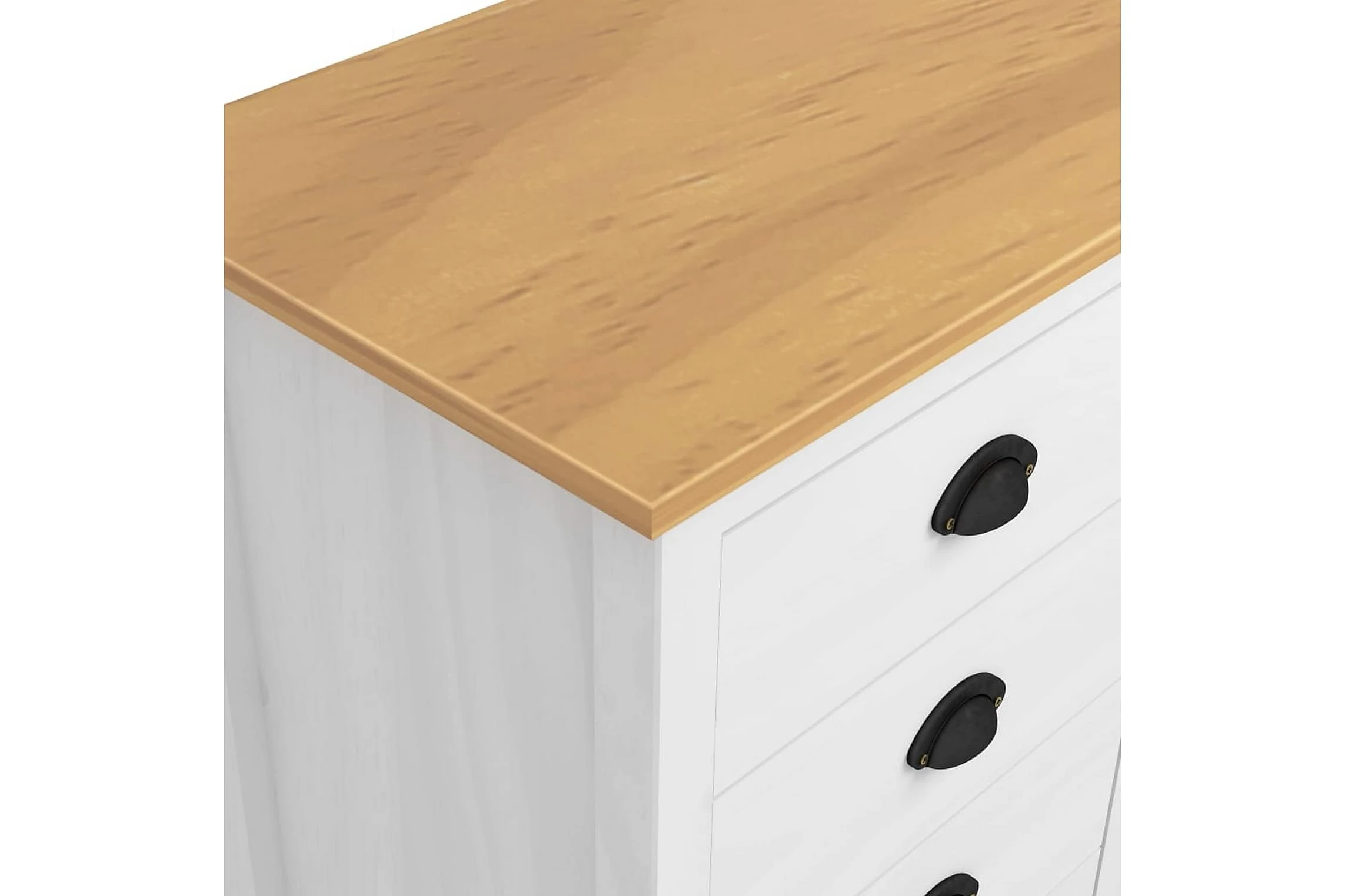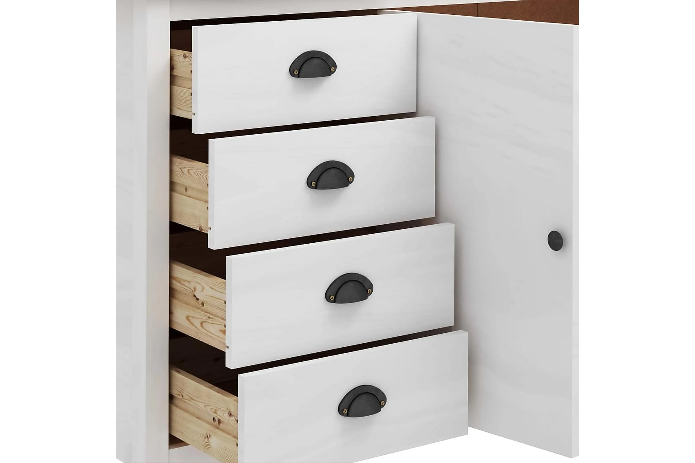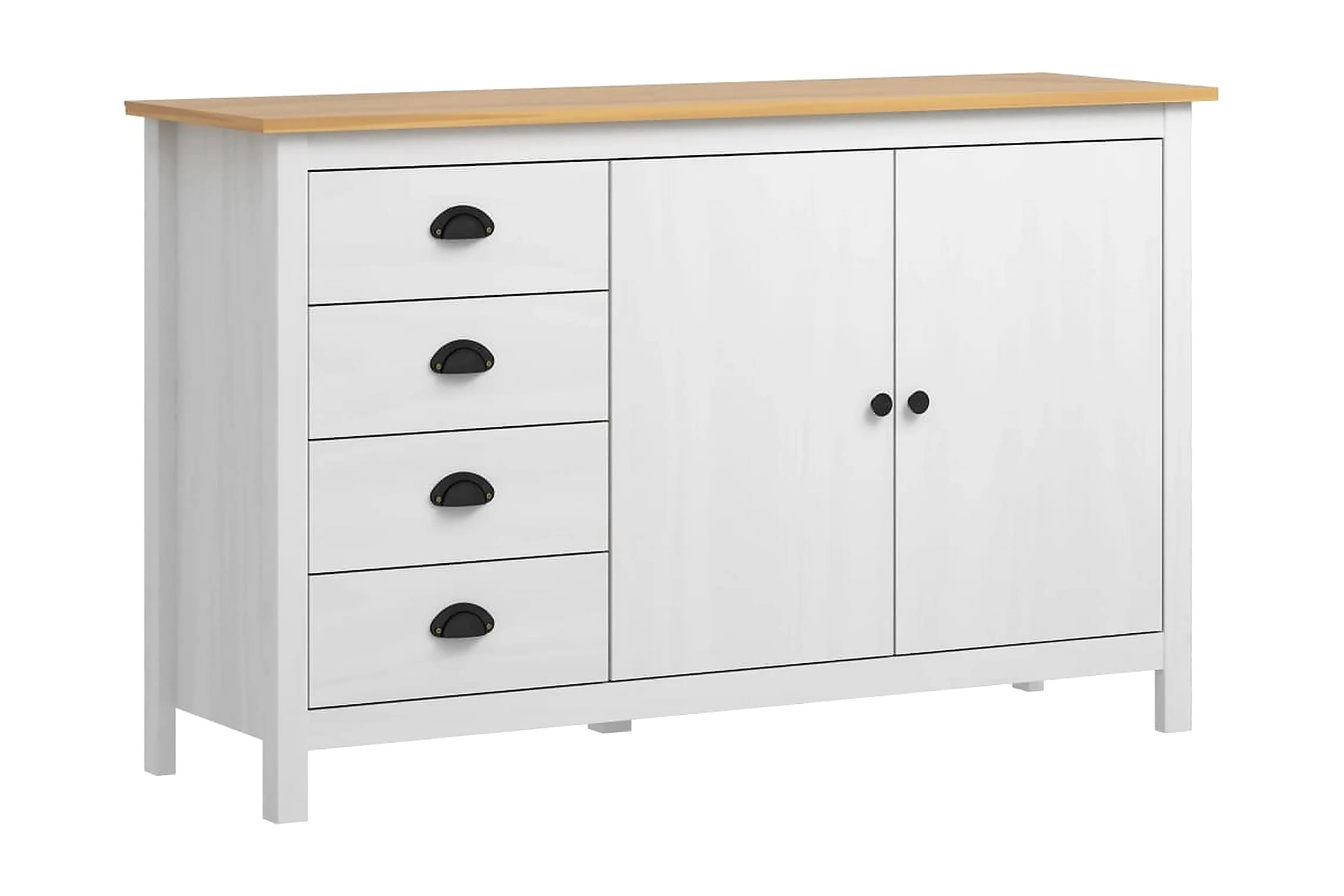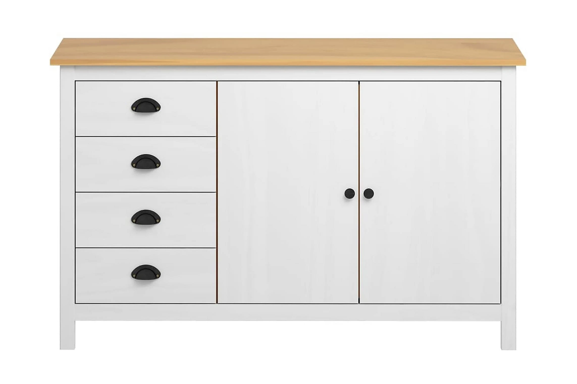 Skänken är tillverkad i massiv furu som gör den stabil och stadig. Tack vare dess två dörrar och 4 rymliga lådor med skålhandtag erbjuder den gott om förvaringsplats för att hålla dina olika föremål i perfekt ordning och inom räckhåll.