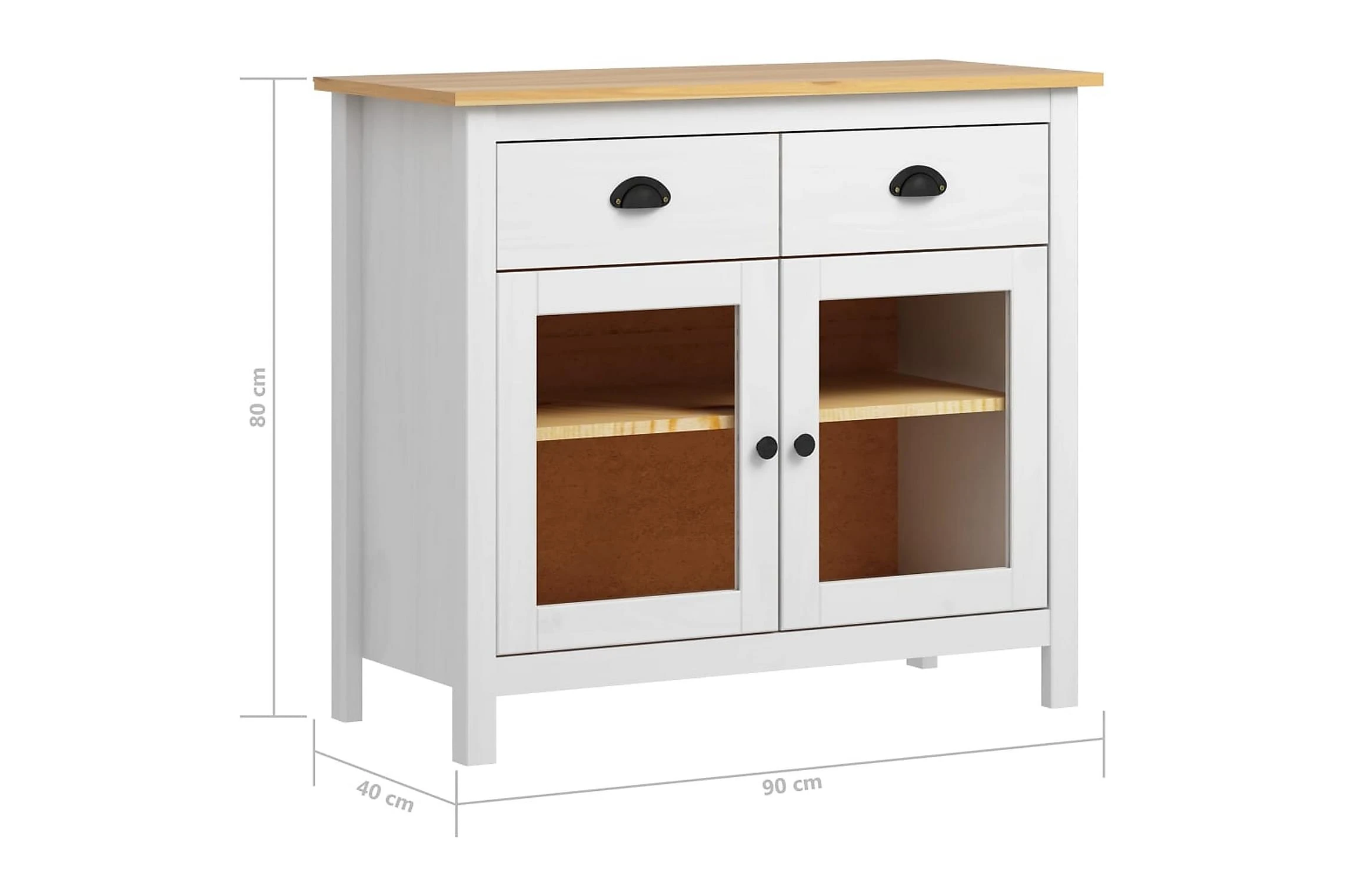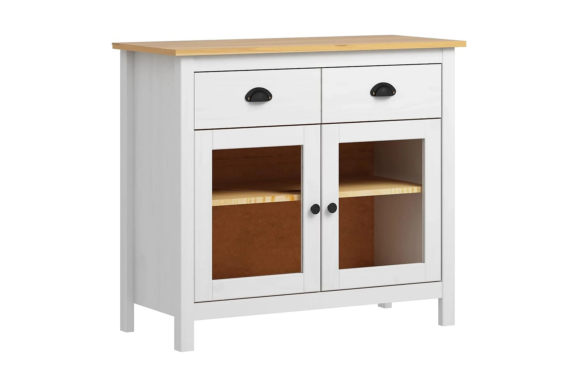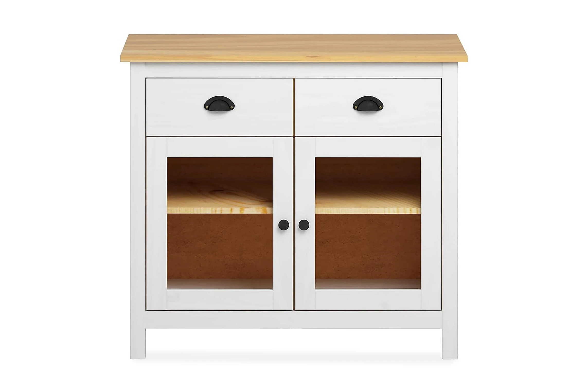 Skänken är tillverkad i massiv furu som gör den stabil och stadig. Tack vare 2 hyllor och 2 rymliga lådor med skålhandtag erbjuder den gott om förvaringsplats för att hålla dina olika föremål i perfekt ordning och inom räckhåll.