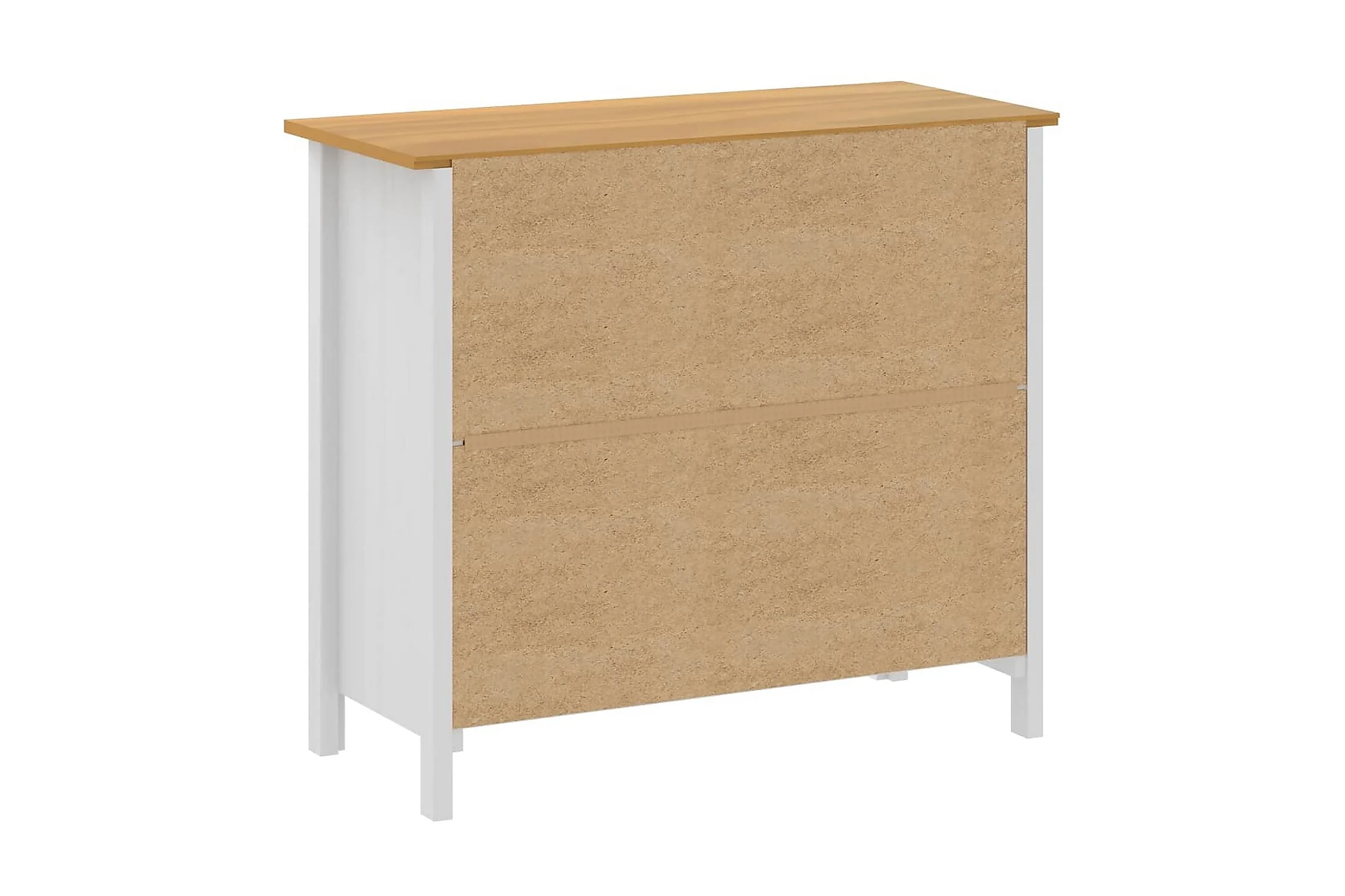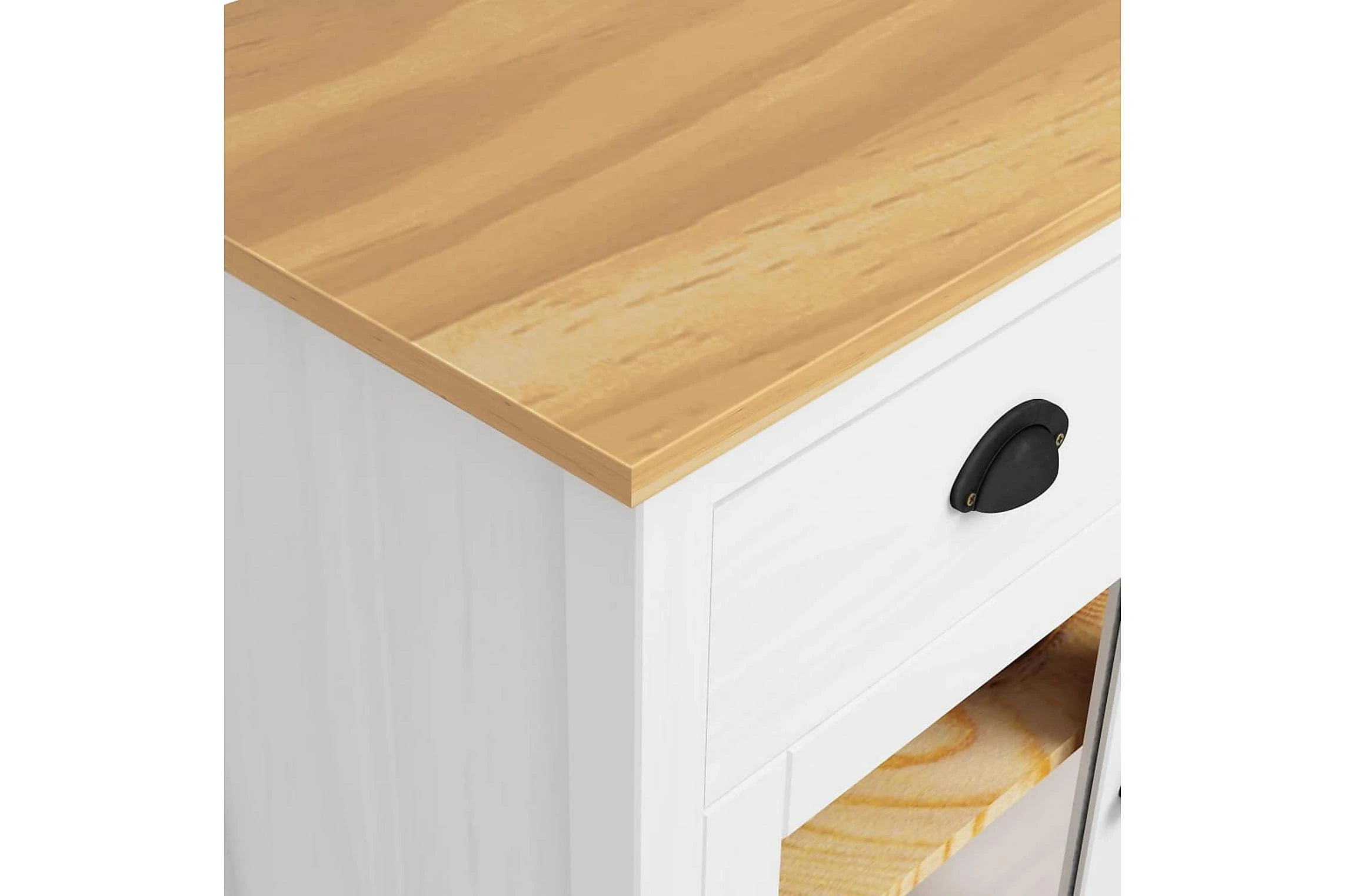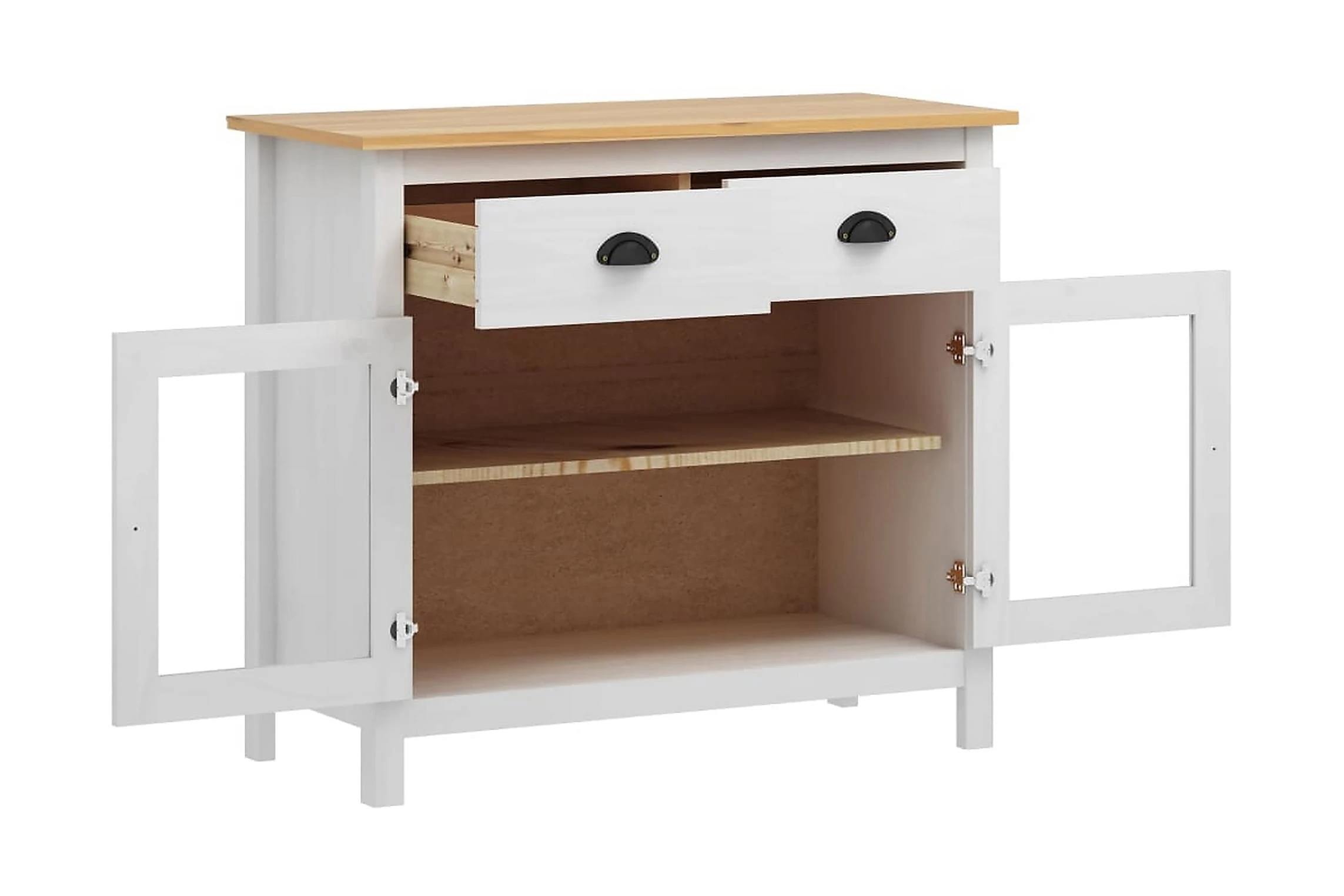 Skänken är tillverkad i massiv furu som gör den stabil och stadig. Tack vare 2 hyllor och 2 rymliga lådor med skålhandtag erbjuder den gott om förvaringsplats för att hålla dina olika föremål i perfekt ordning och inom räckhåll.