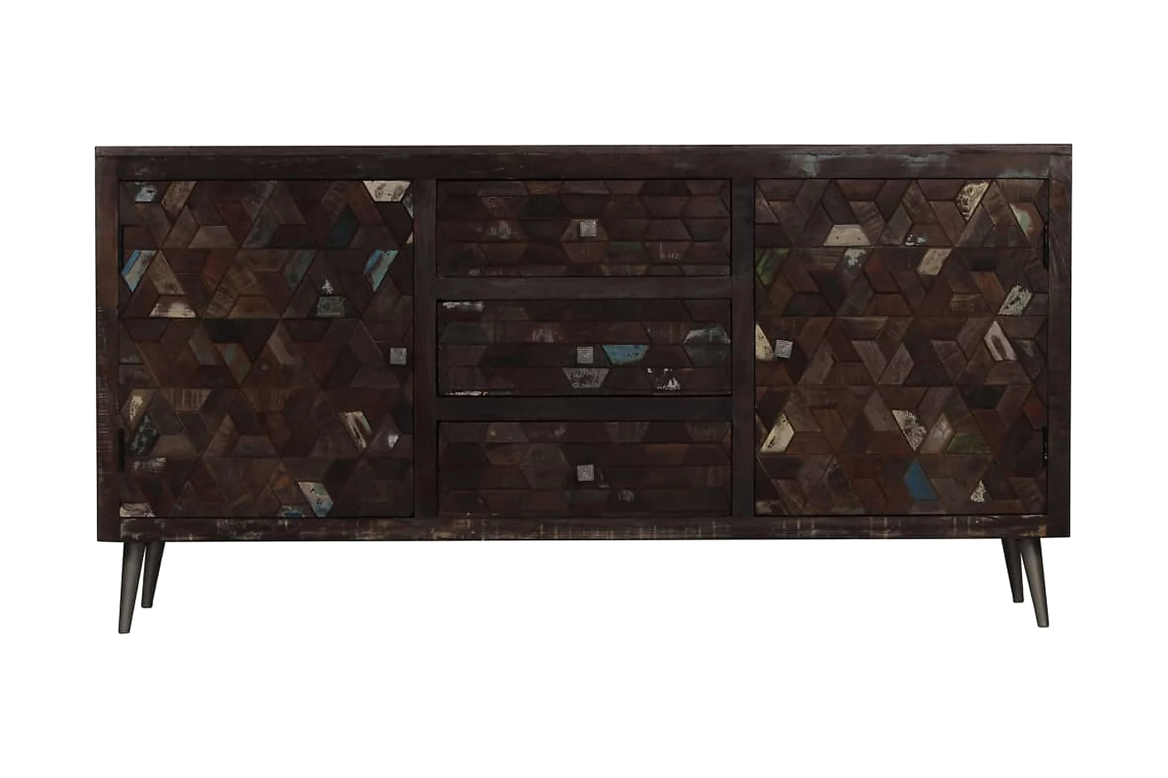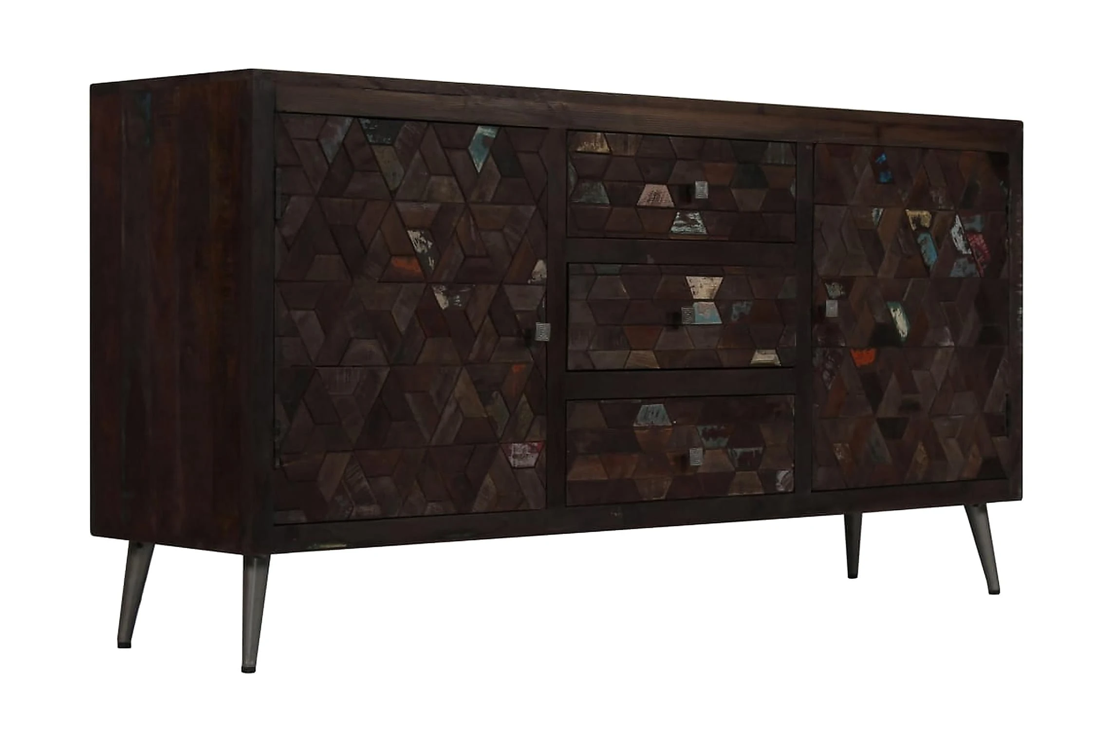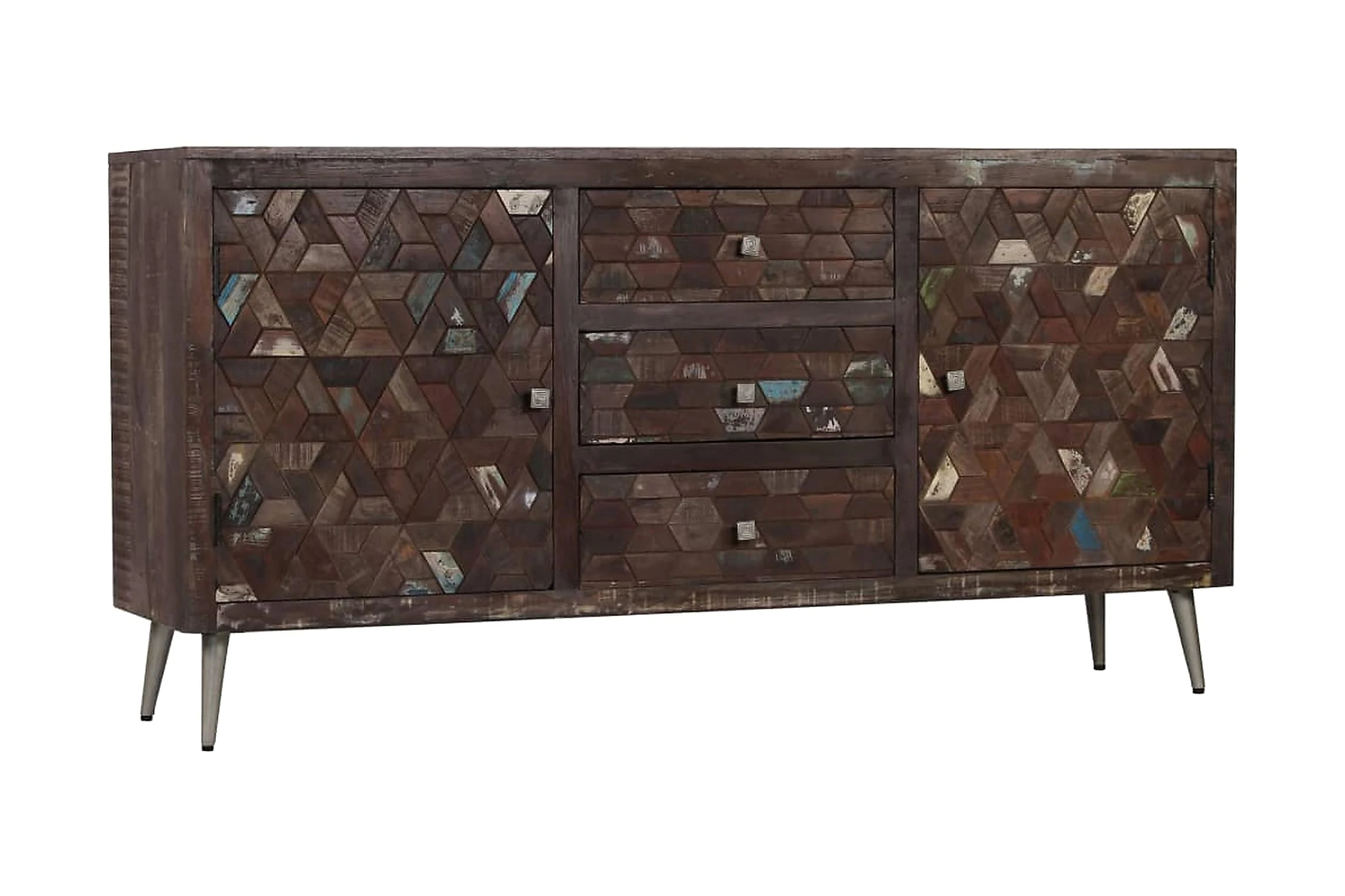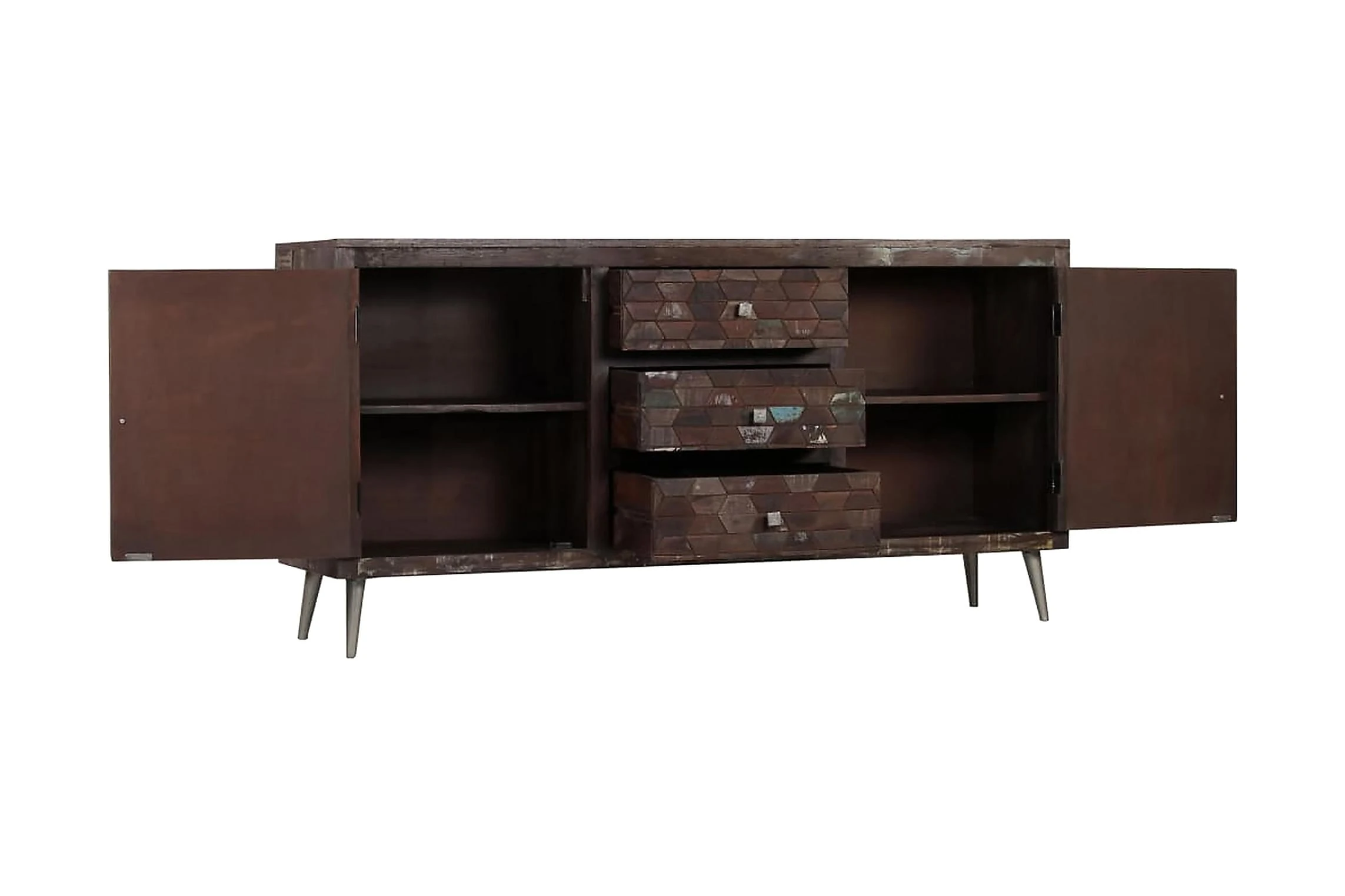 Skänken är tillverkad i massivt återvunnet trä som har samlats in från reglar, golv och balkar från gamla byggnader som har rivits, och kan bestå av olika typer av trä såsom furu, teak, björk, ek, ceder, mangoträ, akacia, etc. Detta innebär att det återvunna träet behåller egenskaperna hos dessa olika träslag. Återvunnet trä är redan åldrat, vittrat och torkat, så det varken krymper eller böjs. De vackra träådringarna gör varje möbel unik och något annorlunda från de andra. Tecken på slitage och synliga träådringar vittnar om träets rika historia och ger bordet ett varmt och autentiskt utseende. Varje steg i processen utförs med största omsorg, vare sig det är polering, målning eller lackering. Skänken har gott om förvaringsutrymme och håller dina olika viktiga föremål såsom tidningar, böcker, DVD-skivor och mediaenheter prydligt organiserade och inom räckhåll. Dess stålben är robusta och har en fantastisk industriell stil. Monteringen är enkel.