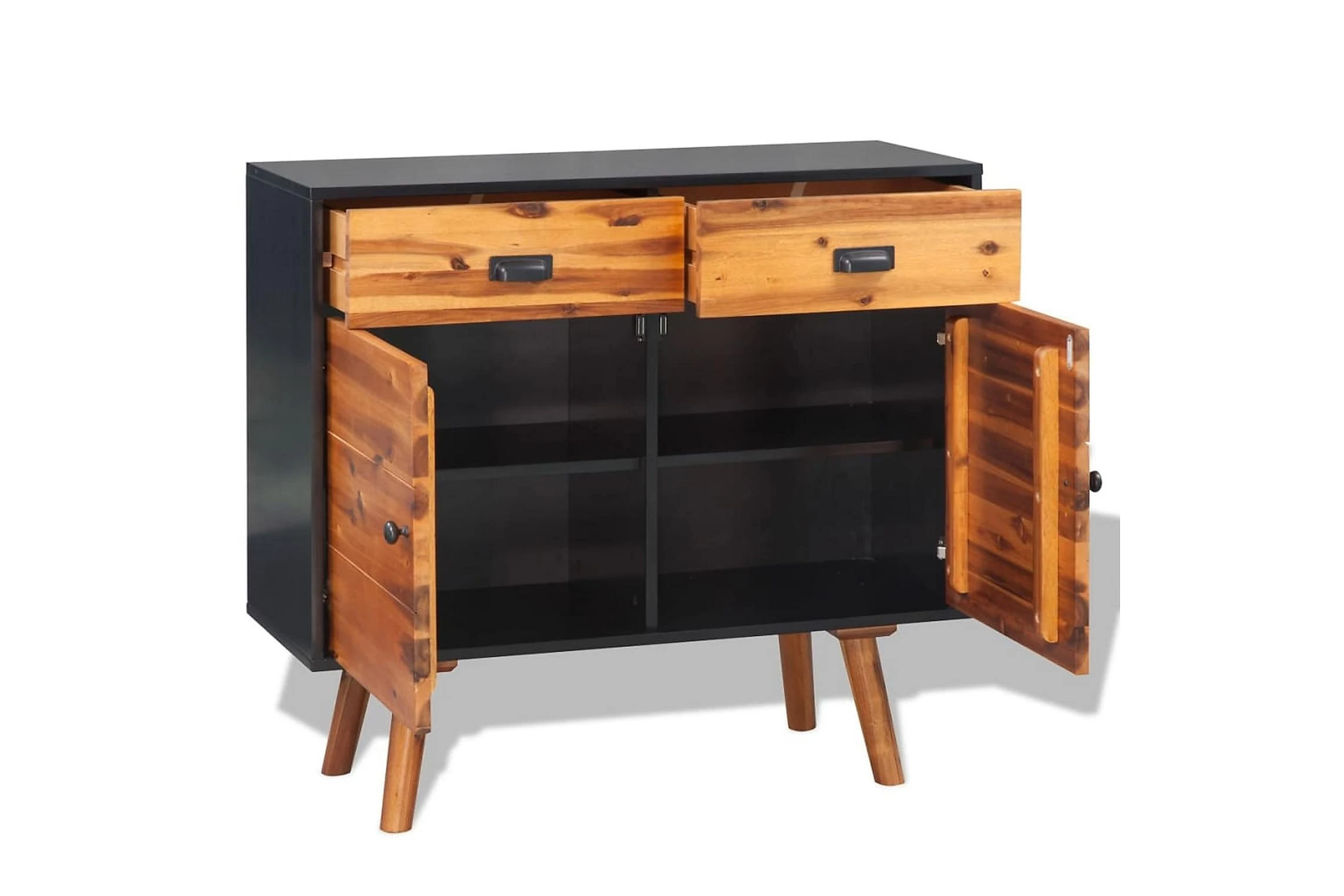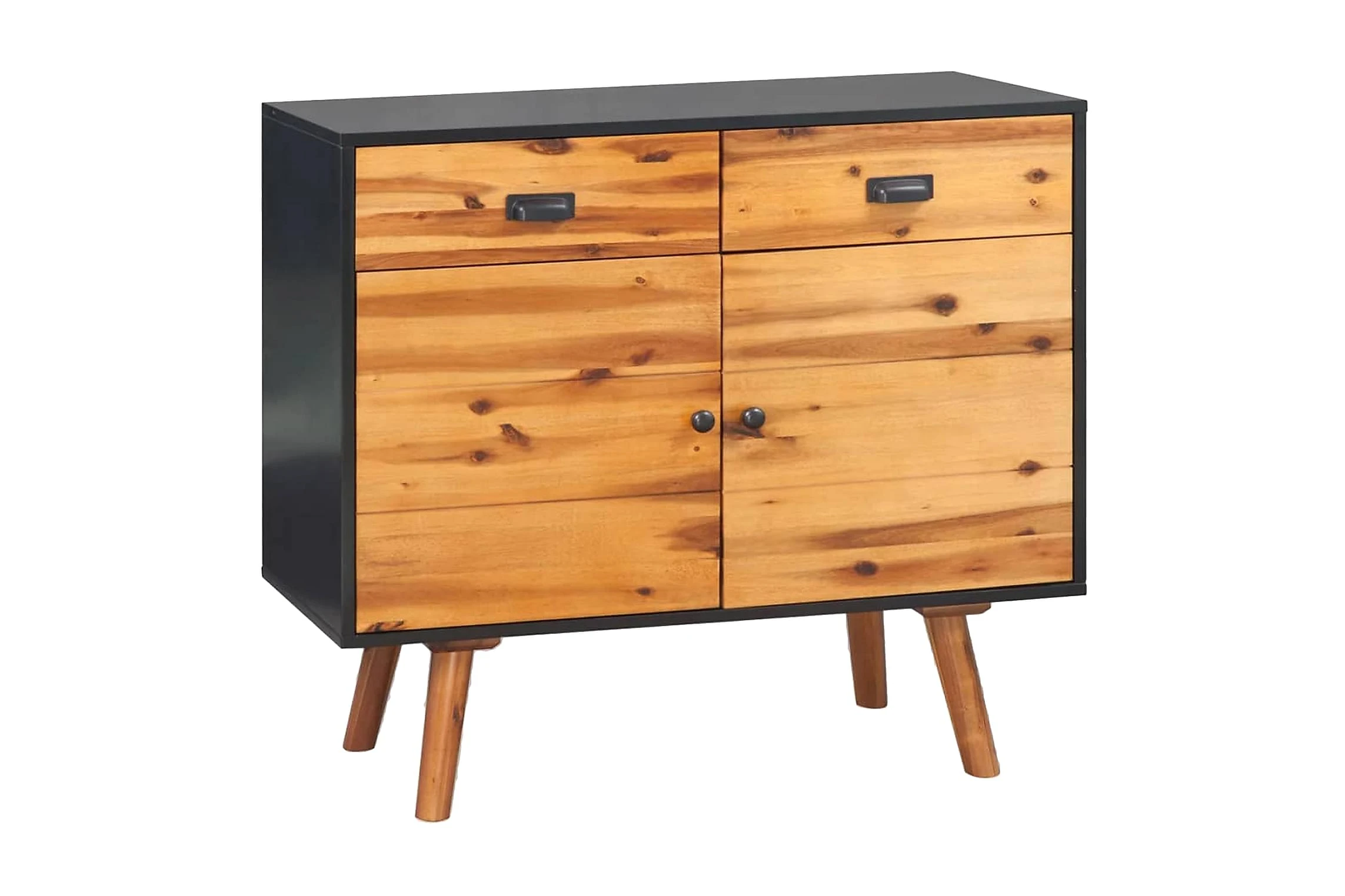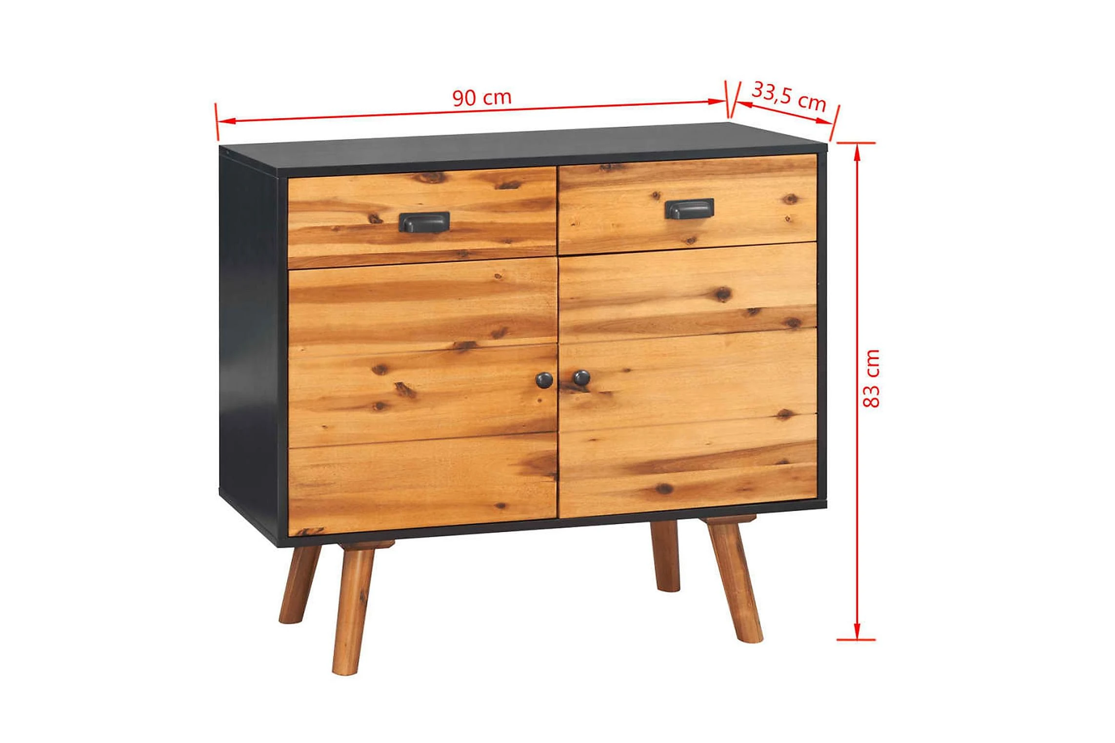 Skänken är tillverkad i massivt akaciaträ och högkvalitativ MDF, vilket gör den mycket stabil och slitstark. Den har två lådor och två skåp med dörrar, vilket ger gott om förvaringsutrymme för böcker, multimedia-enheter och andra saker. Bordsytan är en perfekt plats att ställa vackra föremål, fotoramar eller krukväxter.