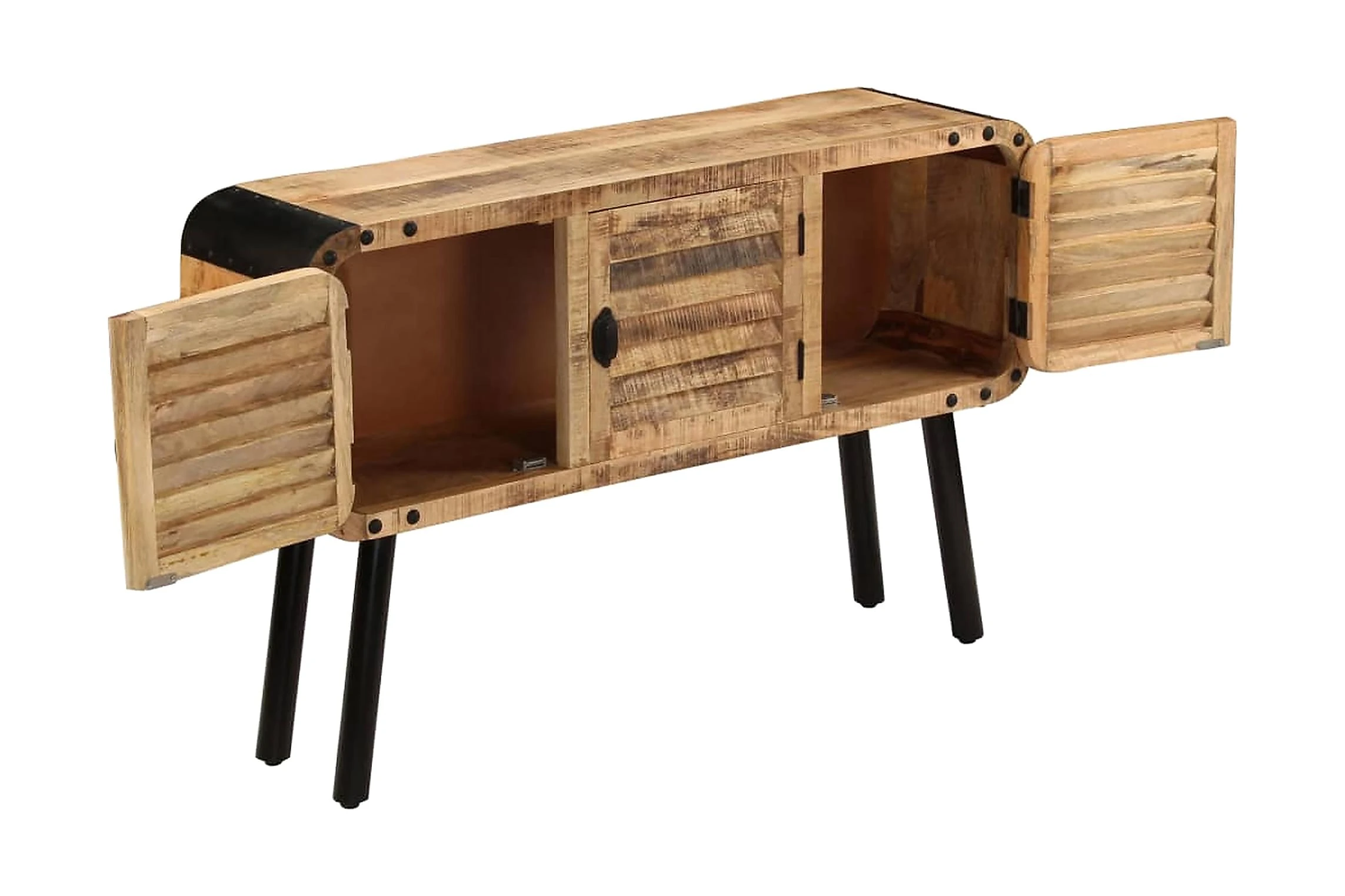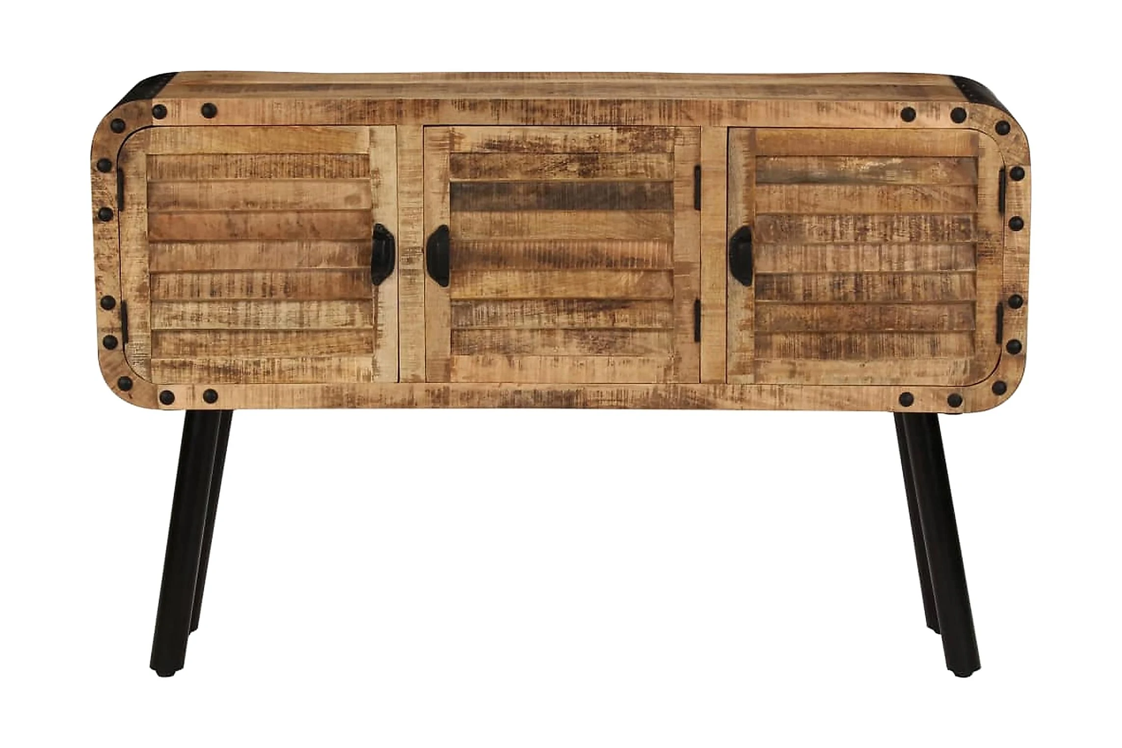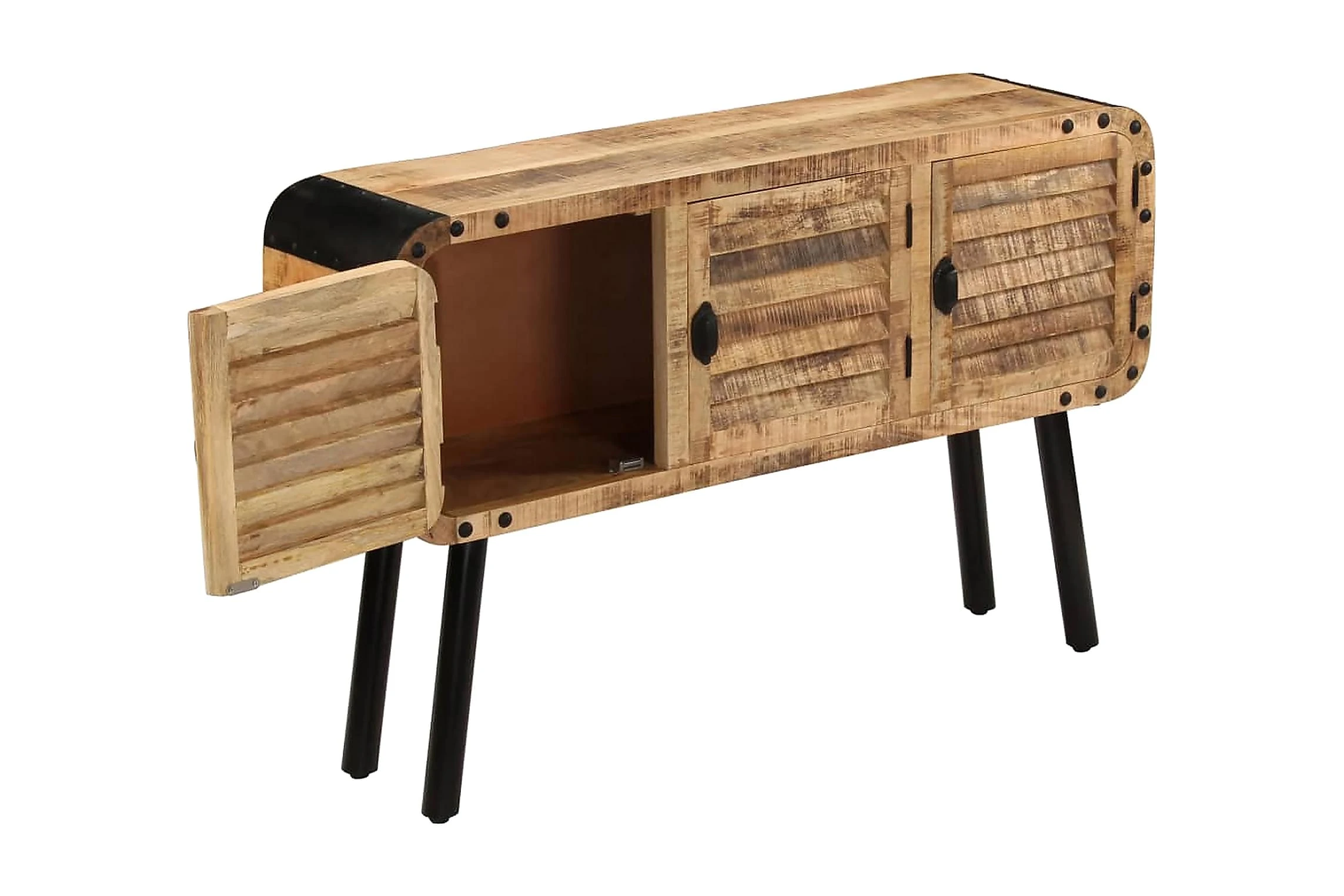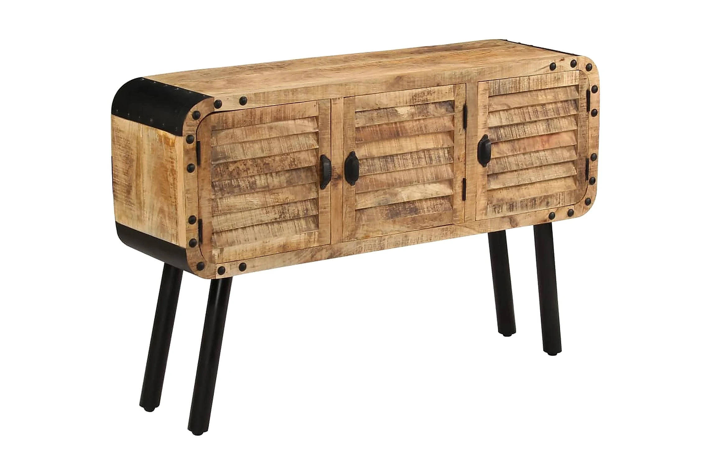 Skänken är tillverkad i massivt mangoträ som har polerats och lackerats men ändå har sin naturliga färg och ett grovt utseende. De vackra träådringarna gör varje möbel unik och något annorlunda från de andra. Skänken har en robust och stabil ovansida där du kan ställa fruktkorgar, vaser eller andra dekorativa föremål och ett stort skåp med 3 luckor för extra förvaringsutrymme. Metallelementen bidrar till skänkens industriella stil. Monteringen är enkel.