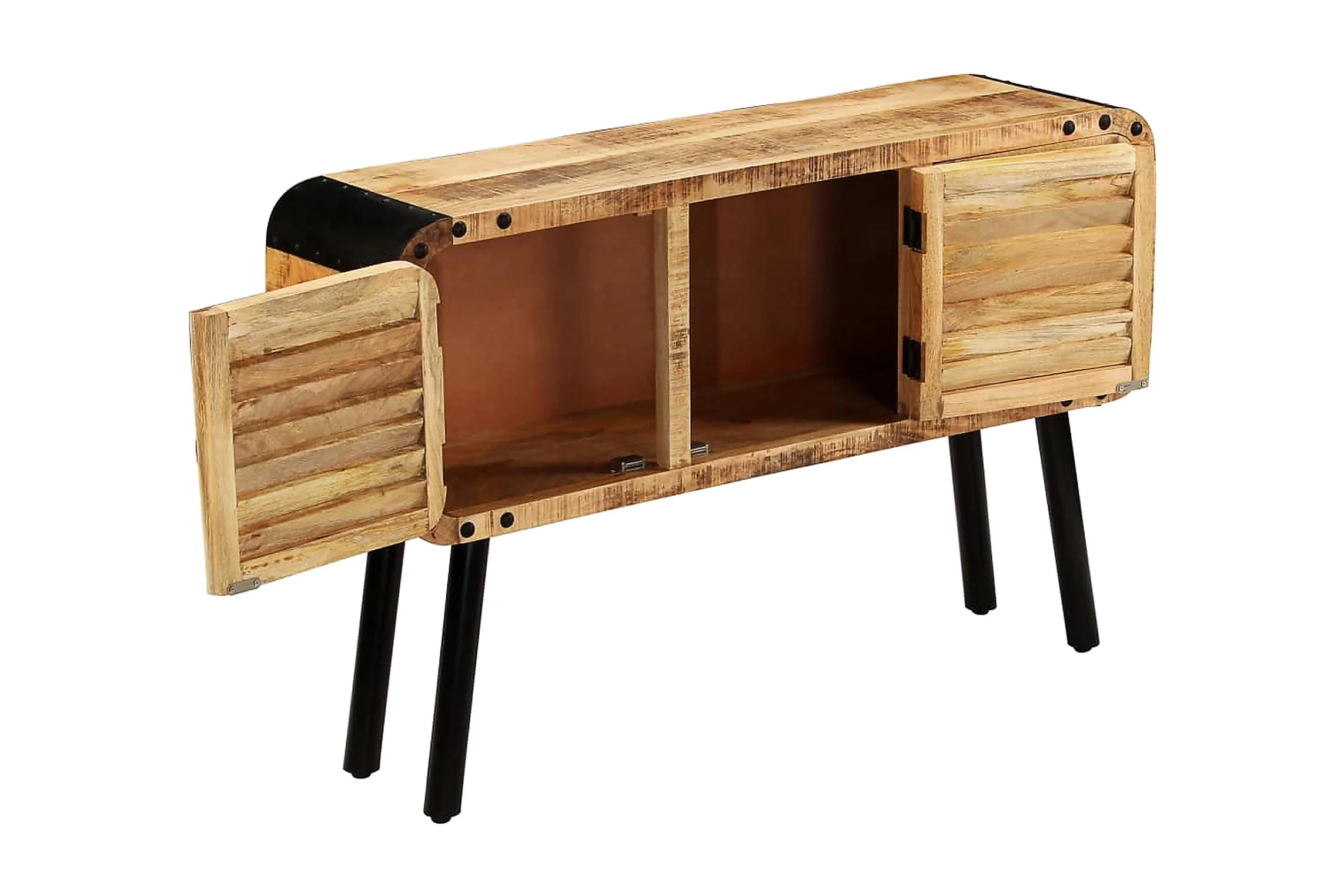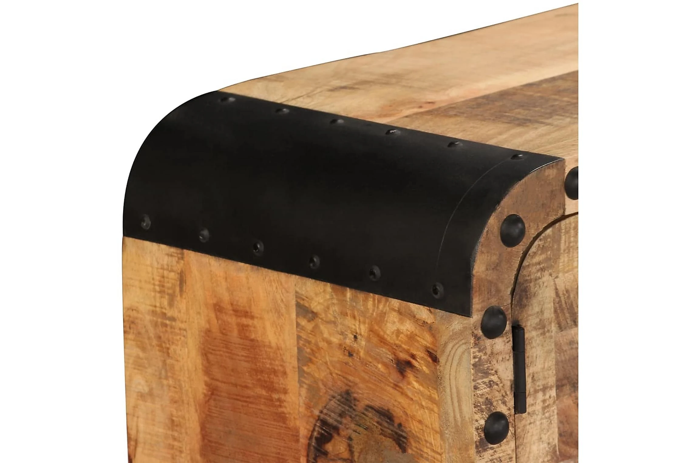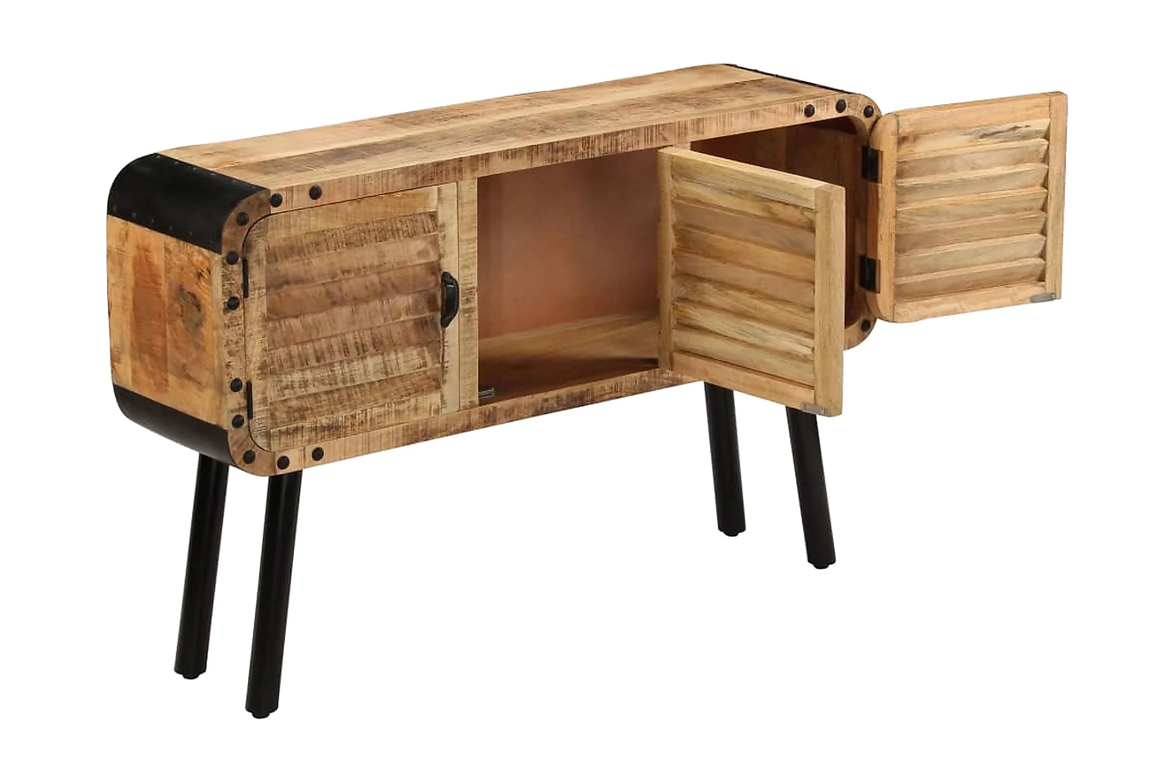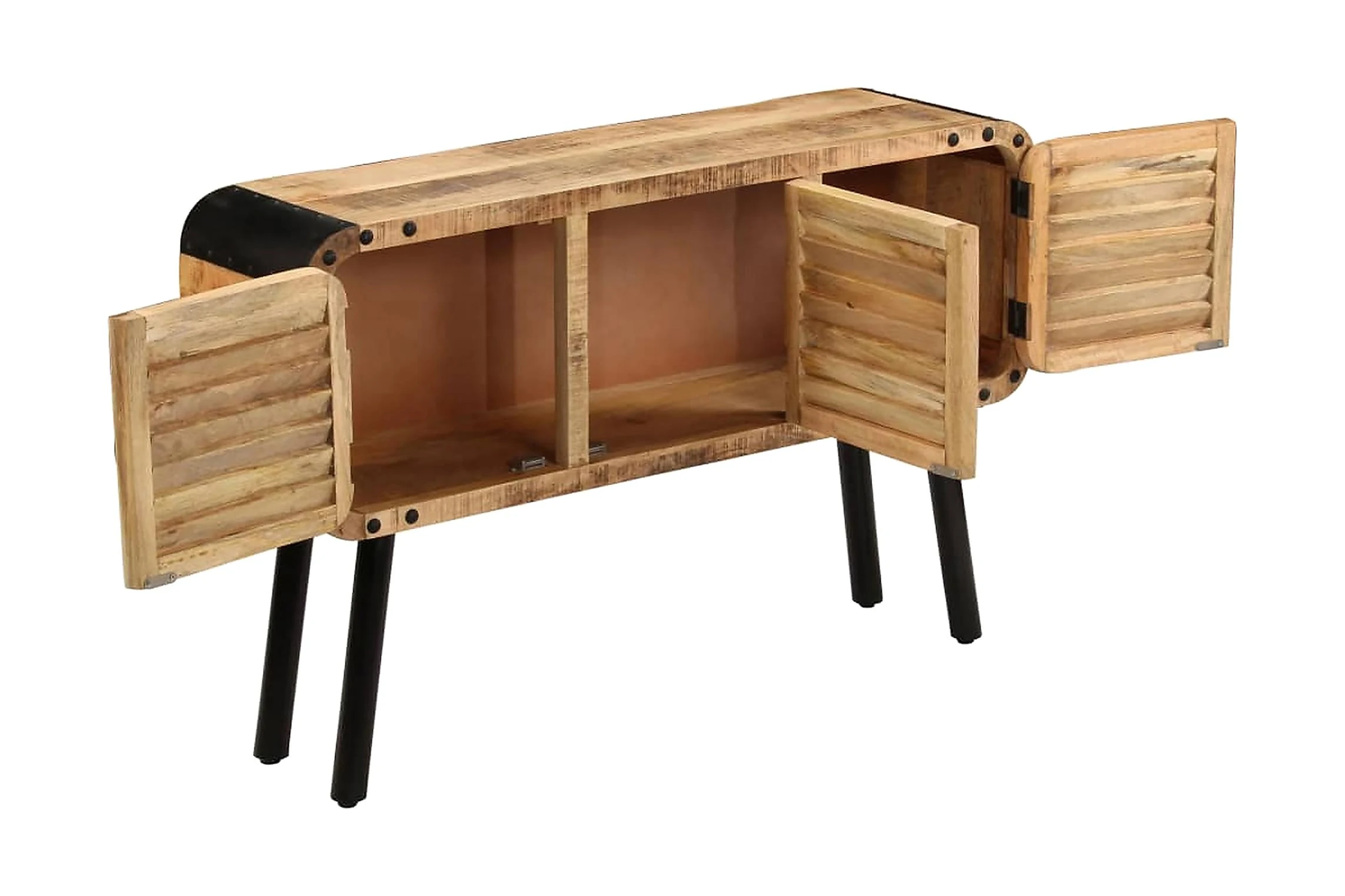 Skänken är tillverkad i massivt mangoträ som har polerats och lackerats men ändå har sin naturliga färg och ett grovt utseende. De vackra träådringarna gör varje möbel unik och något annorlunda från de andra. Skänken har en robust och stabil ovansida där du kan ställa fruktkorgar, vaser eller andra dekorativa föremål och ett stort skåp med 3 luckor för extra förvaringsutrymme. Metallelementen bidrar till skänkens industriella stil. Monteringen är enkel.