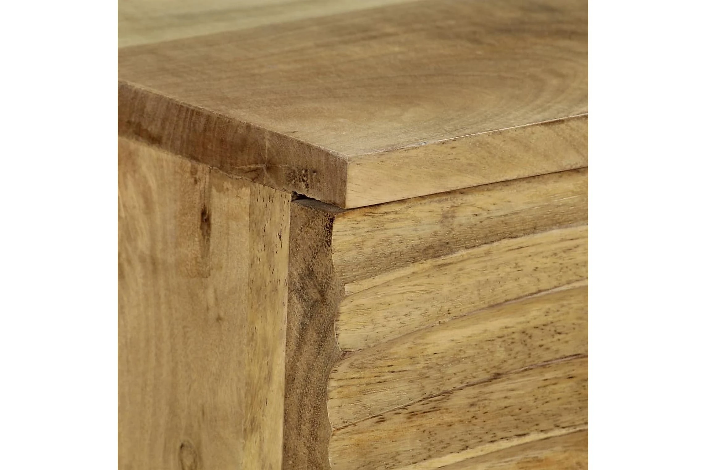 Förvaringsbänken är tillverkad i massiv mango och är ytterst stadig och hållbar. Mangoträ är ett starkt och tätt lövträ som har vackra ådringar och konturer i brunt och guld. Den stadiga ovansidan är perfekt för att ställa dekorativa föremål som vaser eller krukväxter. Skåpet har gott om för förvaringsplats för att hålla olika föremål prydligt organiserade. De vackra handsnidade mönstren på skåpsytan bidrar till skänkens rustika charm. Varje steg i tillverkningsprocessen utförs med största omsorg, vare sig det är polering, målning eller lackering. Skänken är lätt att montera.