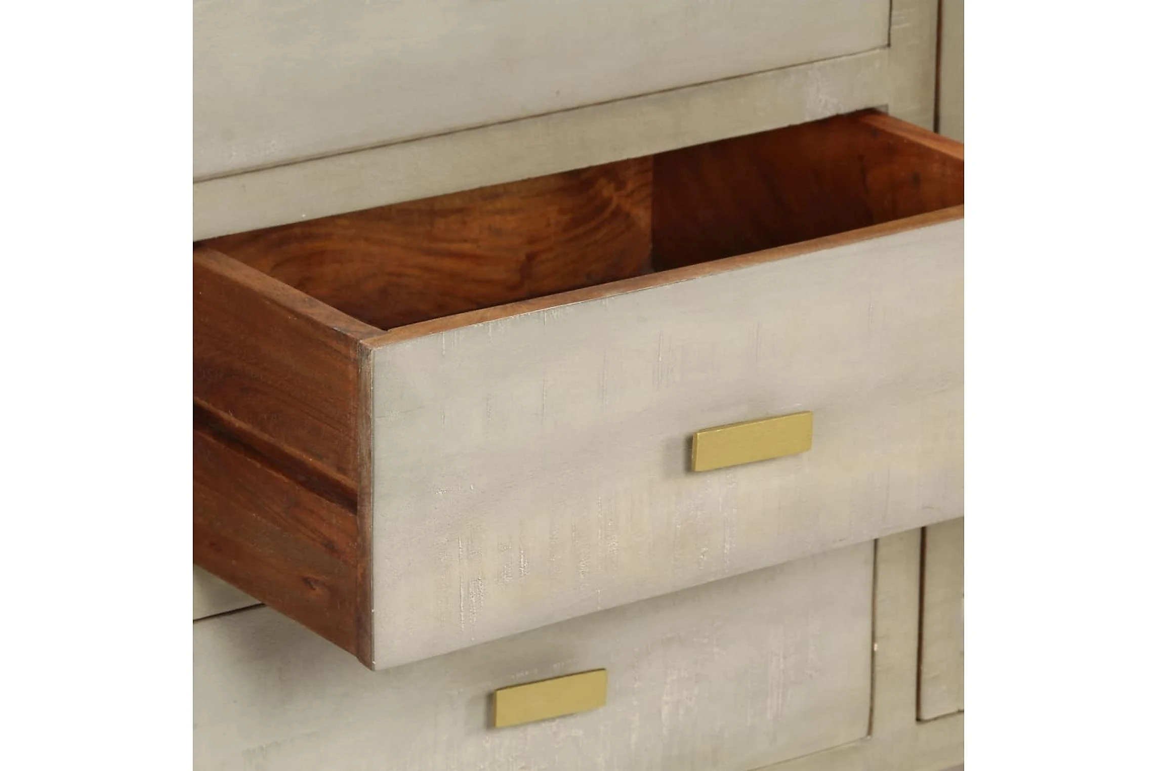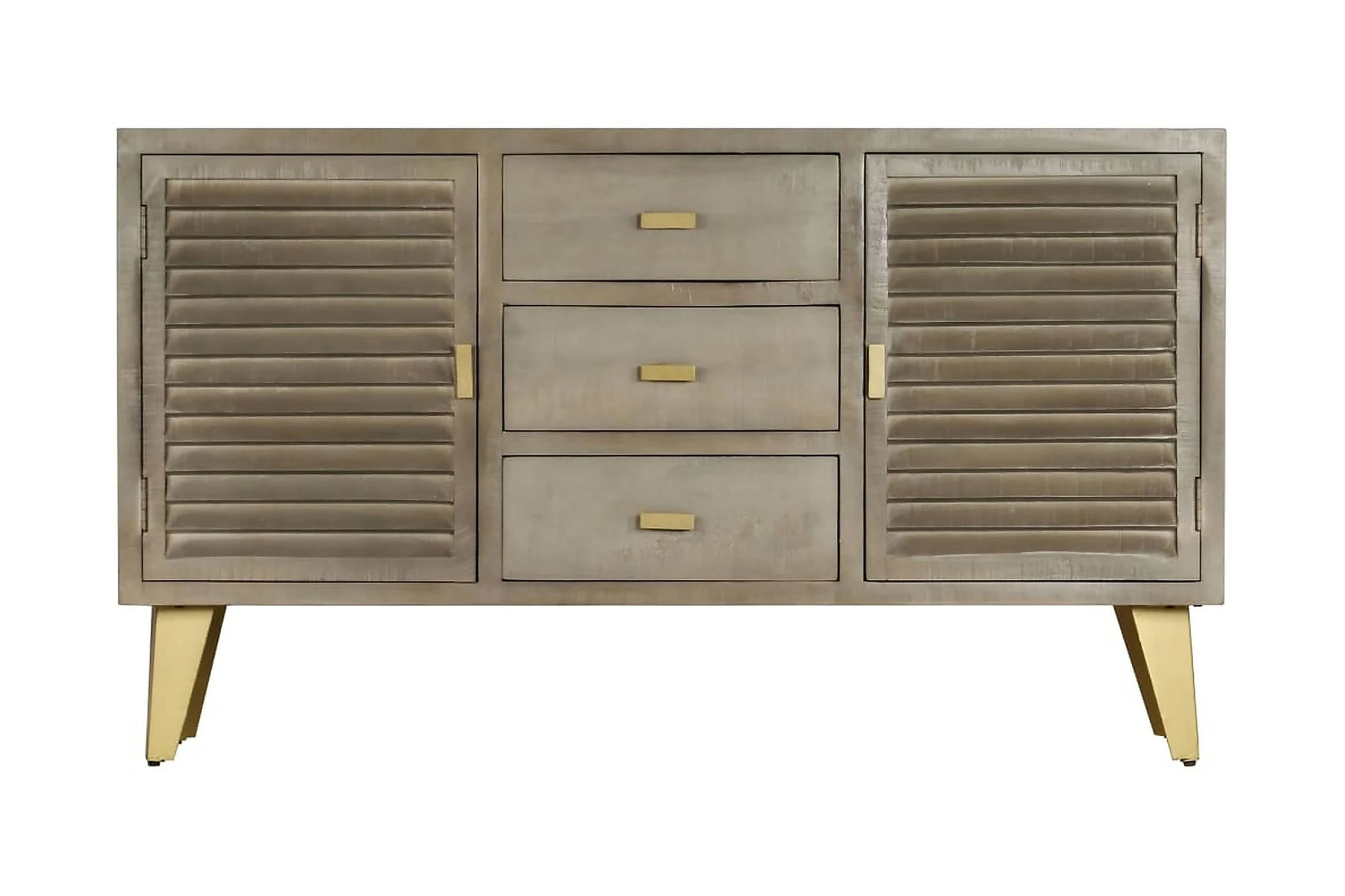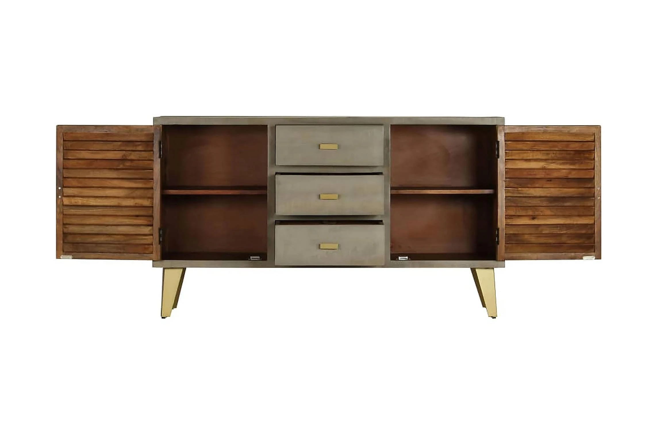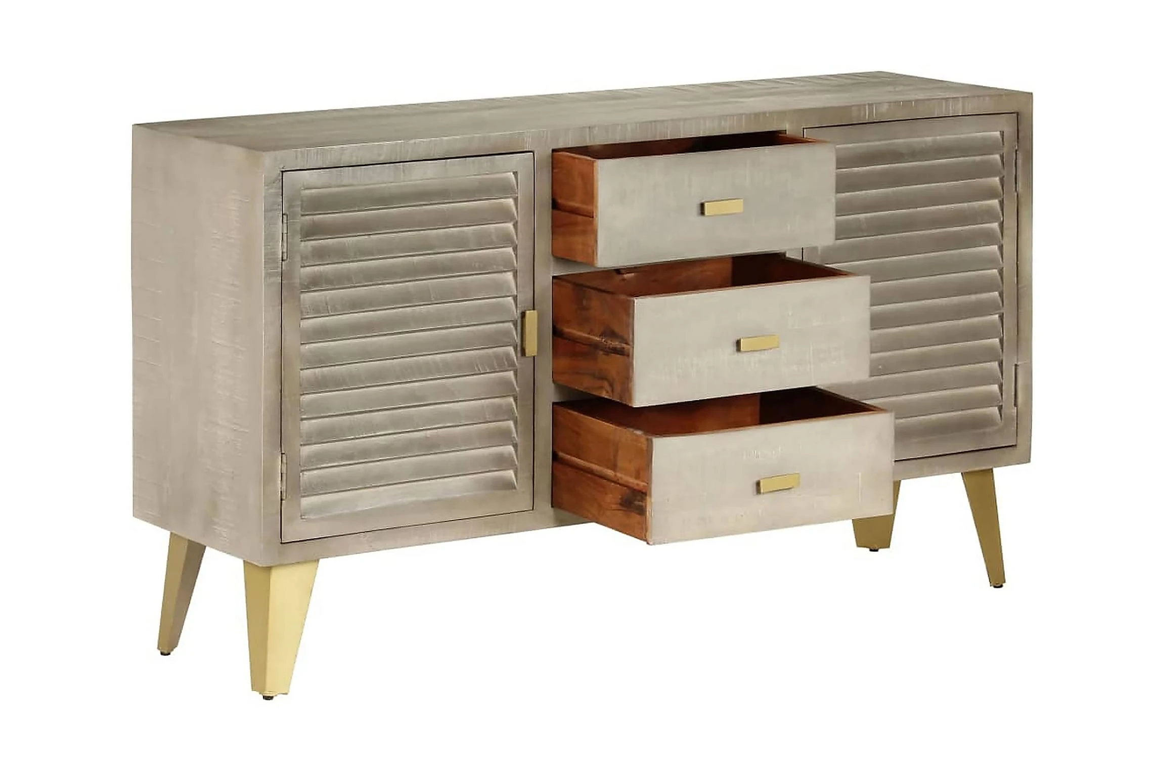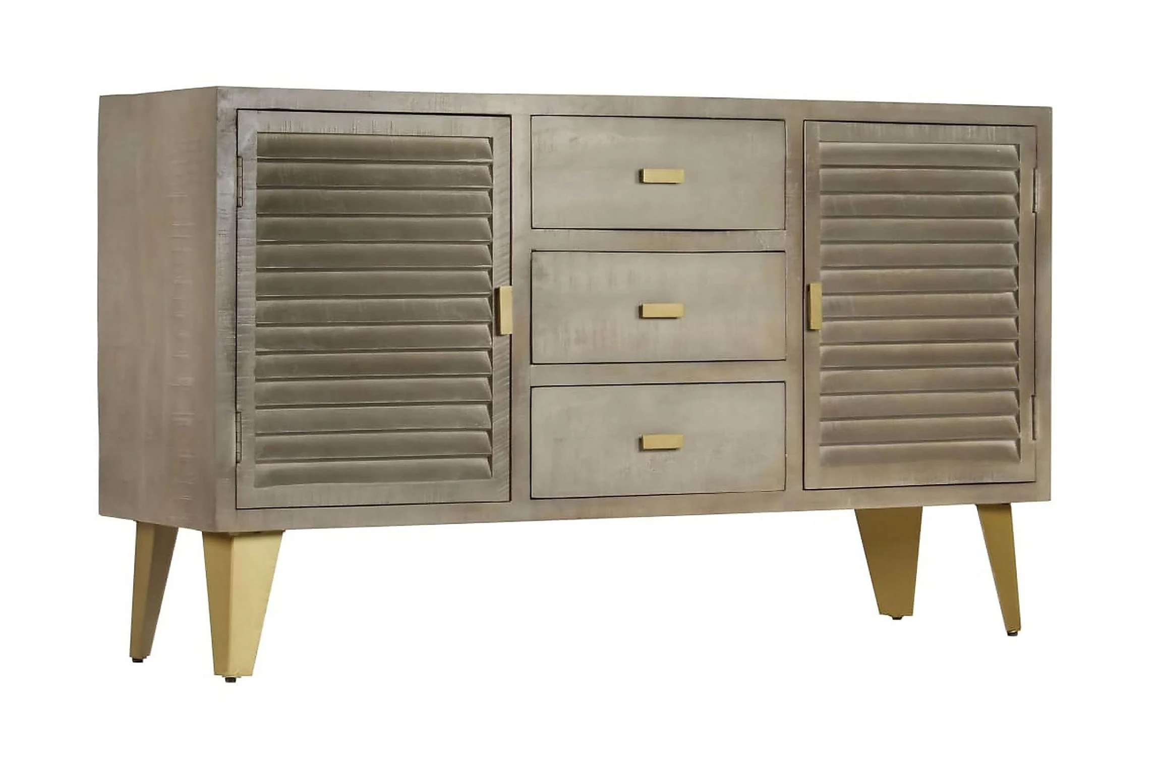 Den har tre lådor och två utrymmen med luckor som blir perfekta för att hålla dina föremål prydligt organiserade. Skänken är tillverkad i massivt mangoträ som är massivt, stabilt, hållbart och vackert. Hantverksskickligheten bidrar dessutom till dess spektakulära retro stil. Varje steg i processen utförs med största omsorg, om det så är polering, målning eller lackering. Stålbenen med mässingsbeläggning bidrar till skänkens stabilitet samt dess unika charm. Produkten är lätt att montera.
