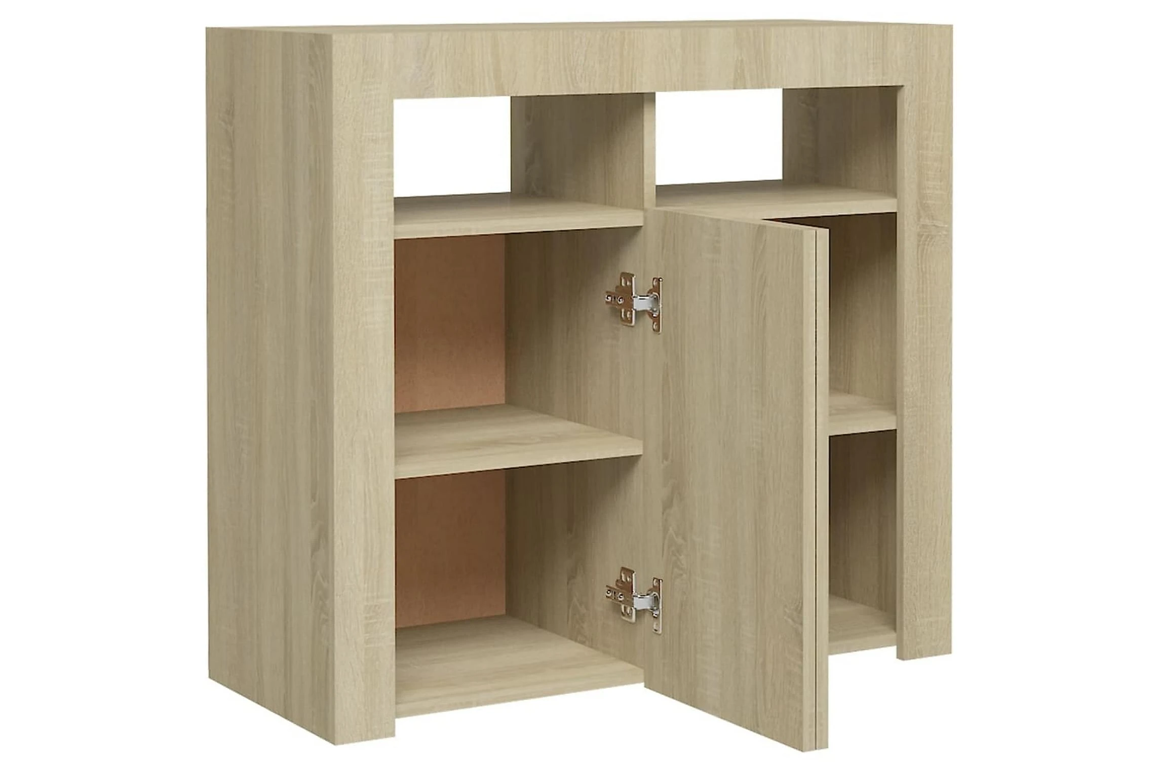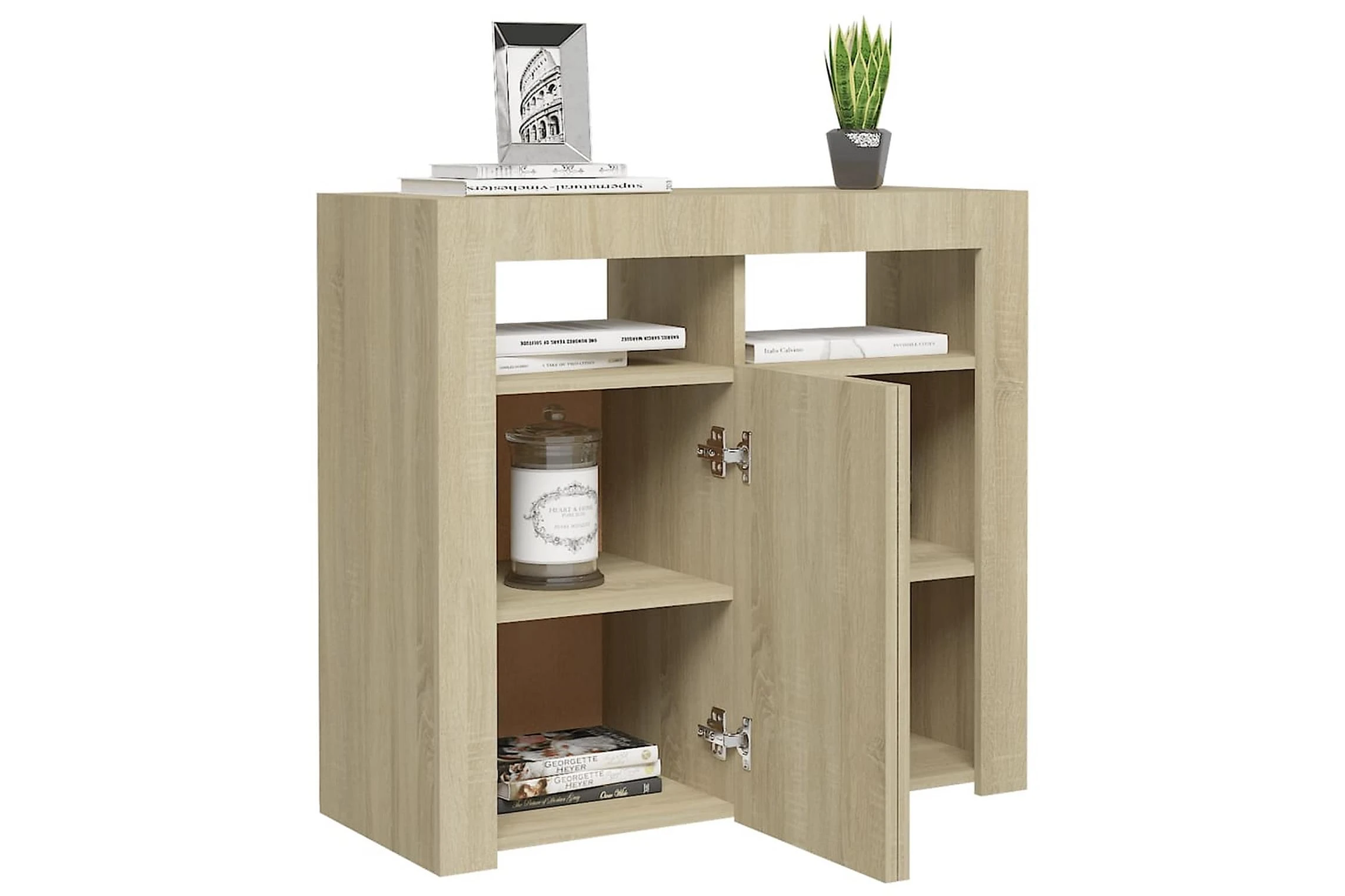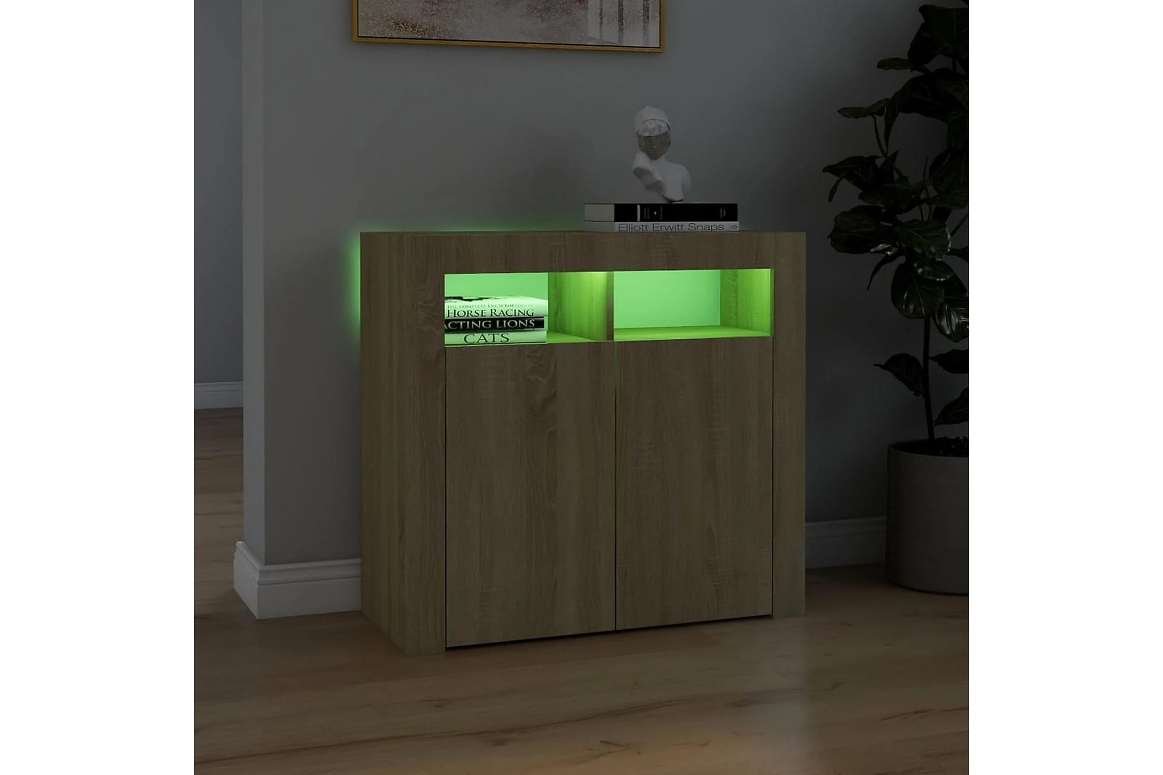 Skänkens robusta konstruktion gör den extremt hållbar och stabil. Den har också gott om lagringsutrymme för böcker, multimedieapparater och andra föremål. Den kraftiga bordsskivan är ideal för att ställa dekorativa föremål, fotoramar eller krukväxter på. Skänken har RGB LED-lampor, som har olika menyer för att ändra färg på ljuset och låta ljusfärgen justeras olika automatiskt. LED-lamporna ger det moderna utseendet och bidrar till den trendiga känslan.