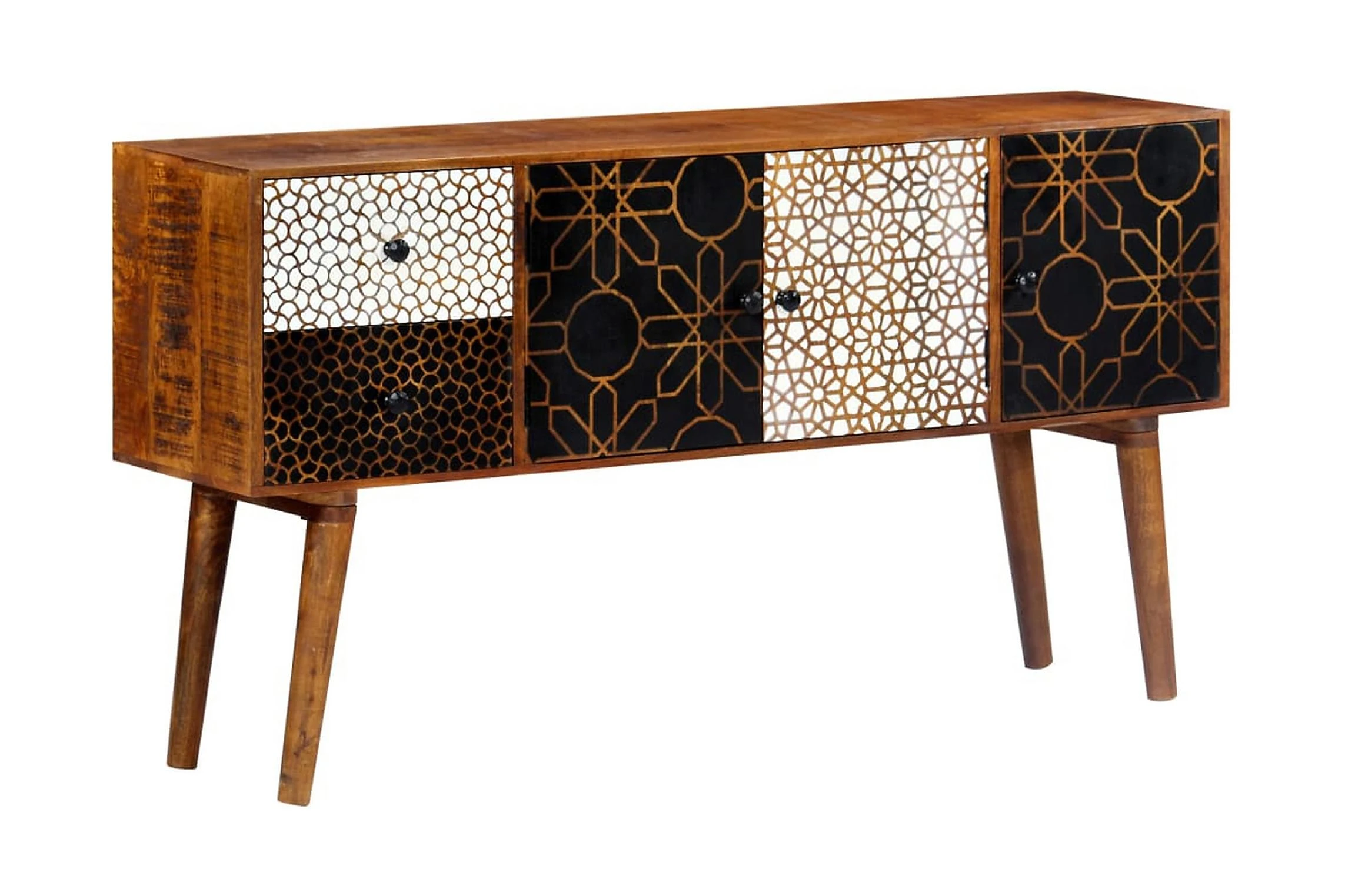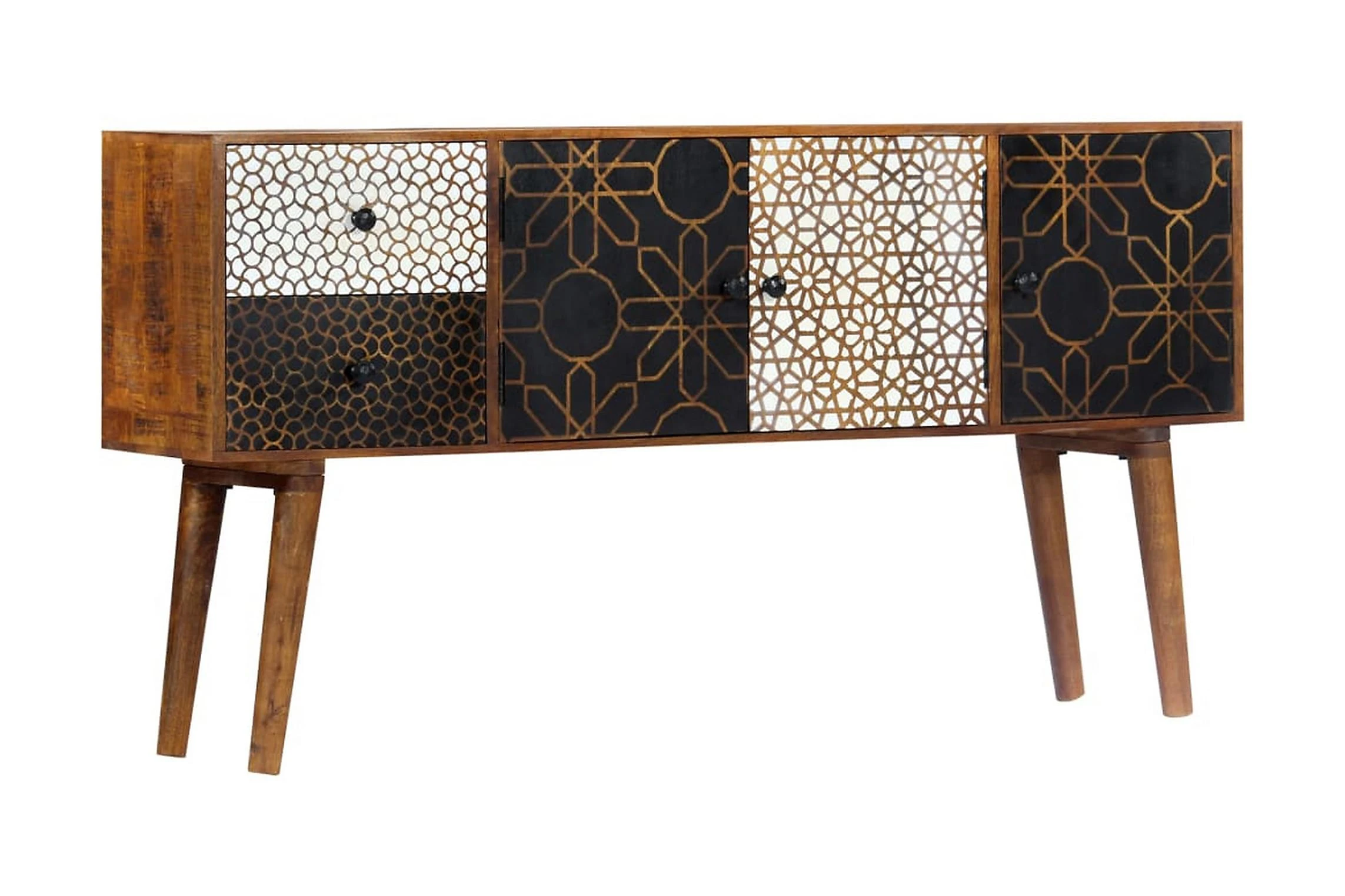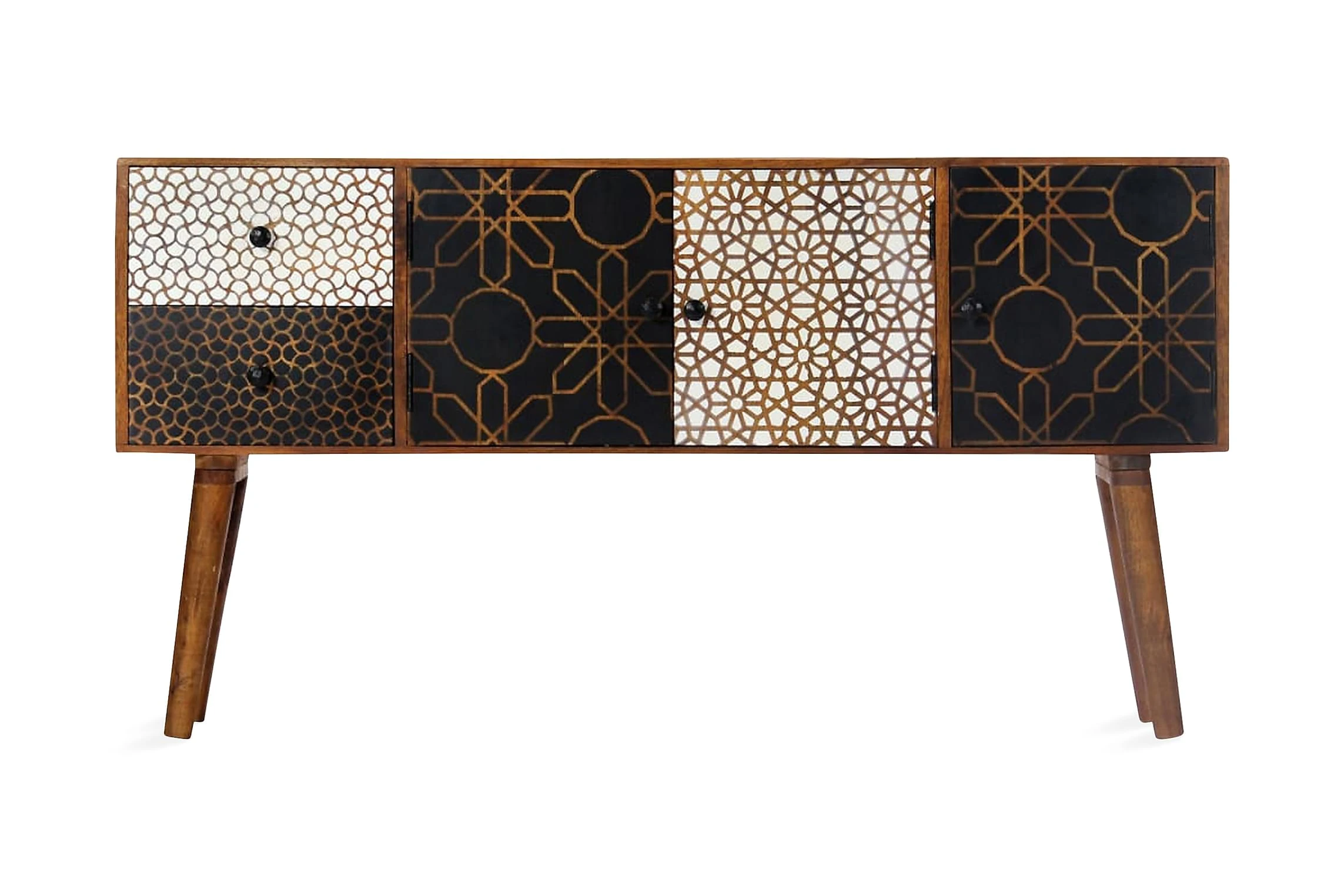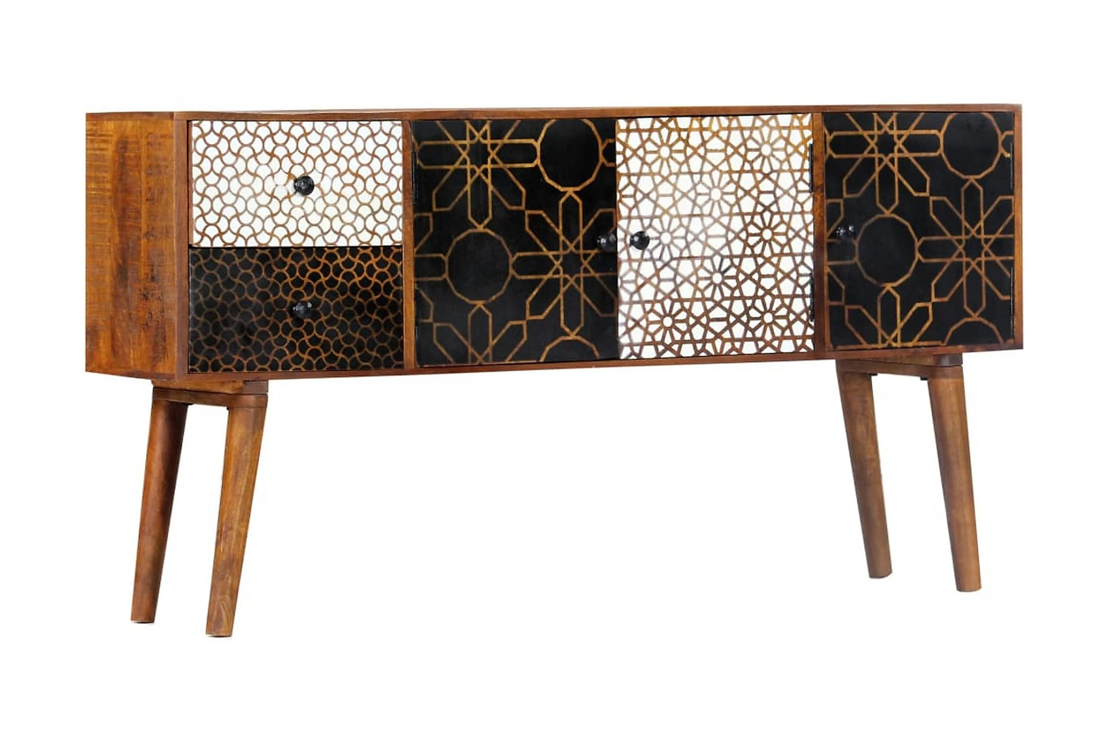 Eftersom den är tillverkad i mangoträ har skänken en vacker finish som har polerats, målats och lackerats, som bidrar till dess fina utstrålning. Mangoträ är ett robust lövträ som har vackra bruna eller gyllene strimmor på ytan. Det vackra tryckta mönstret på lådorna bidrar till sidoskåpets skönhet. Dessutom är den enkel att montera och rengöra med en fuktig trasa. Ta din inredning till en ny nivå med vår eleganta byrå.