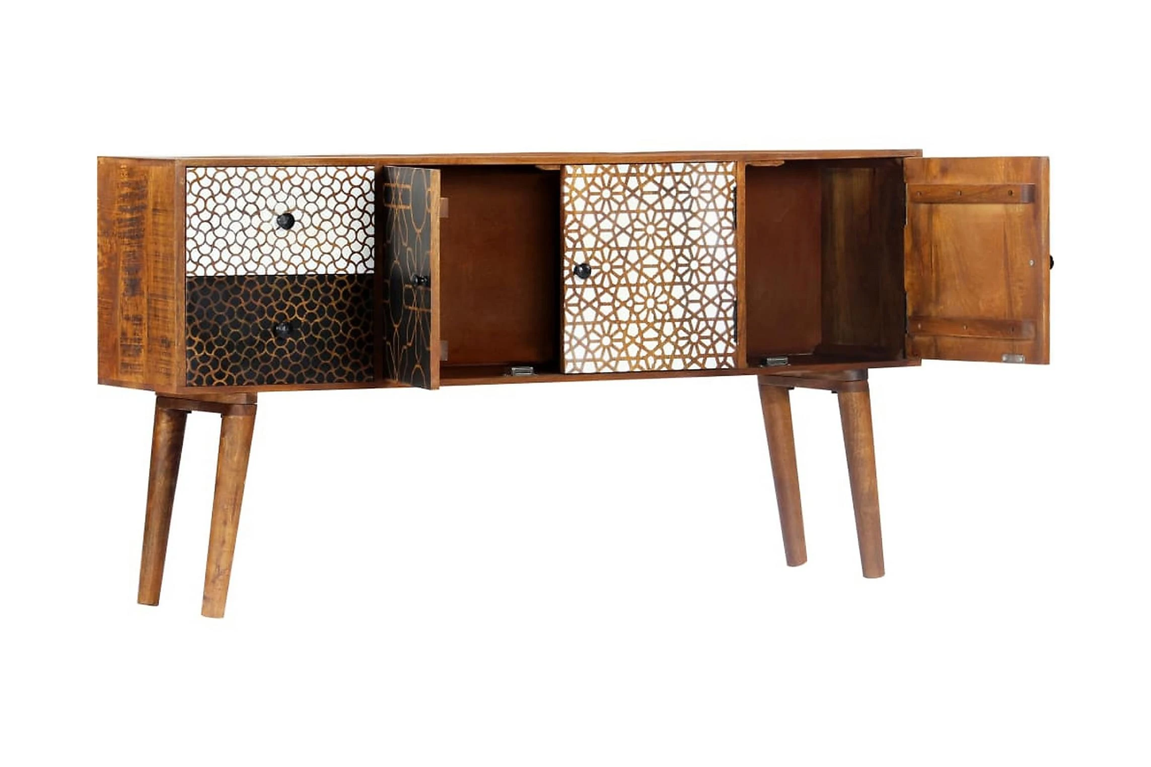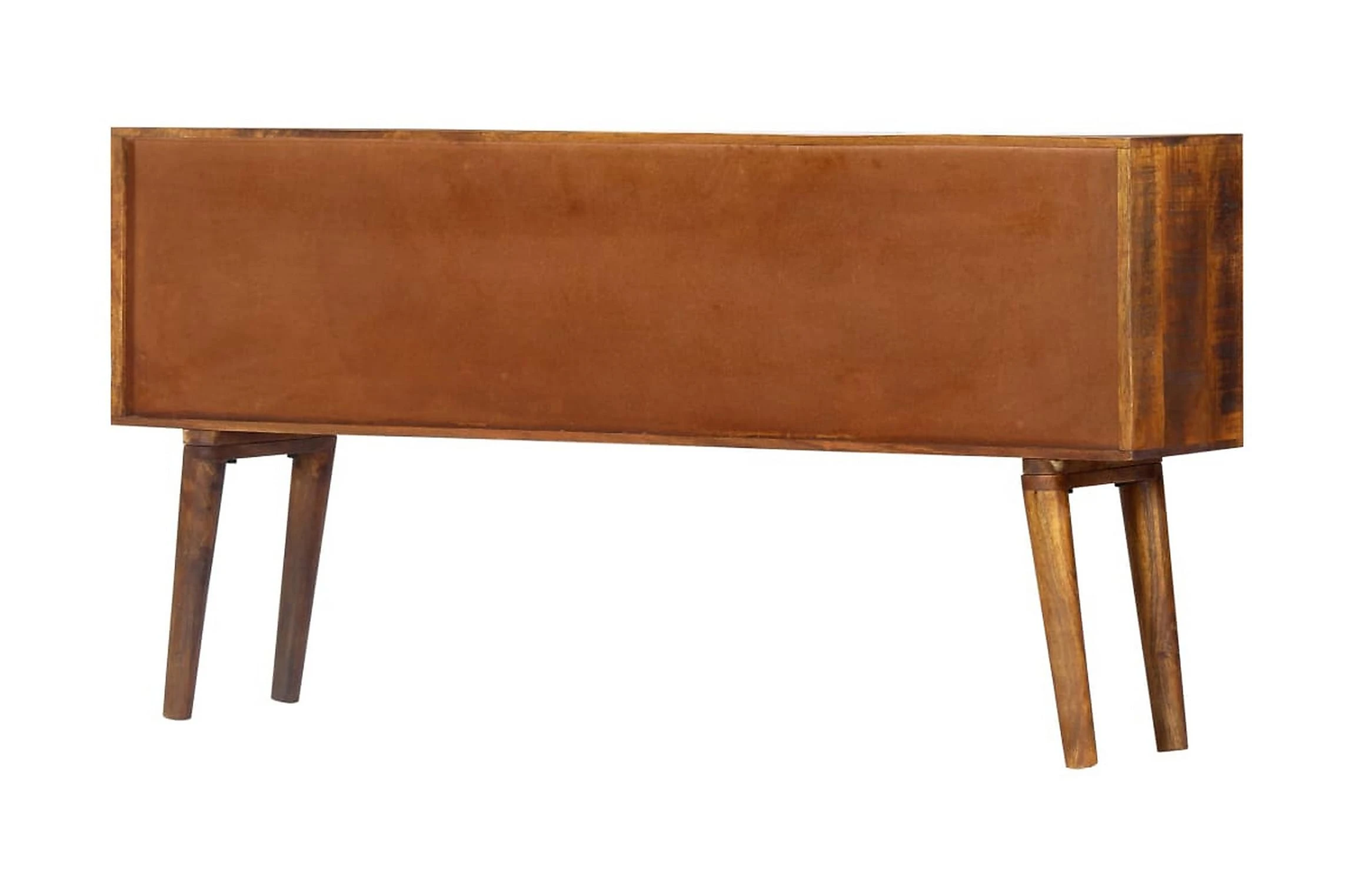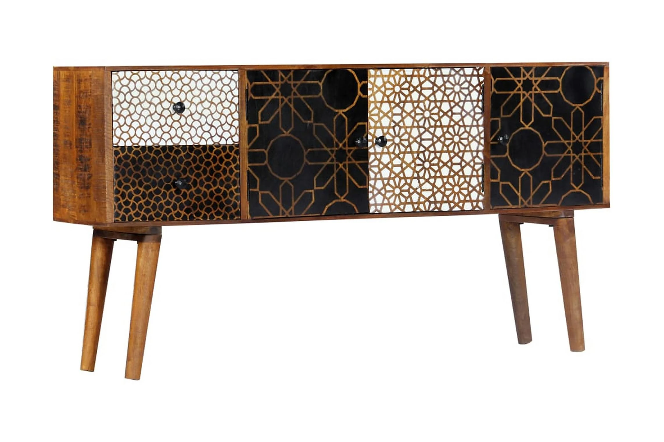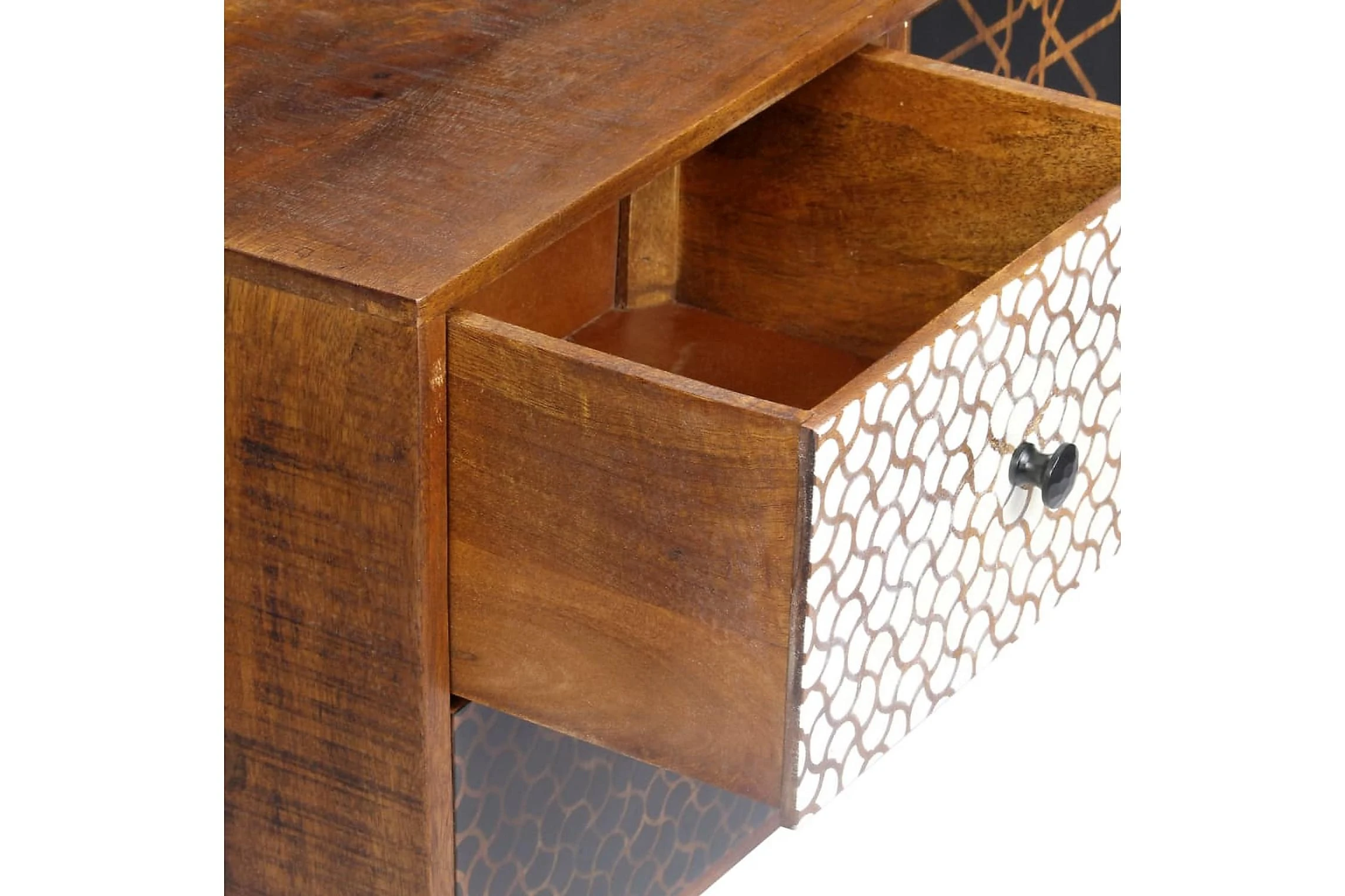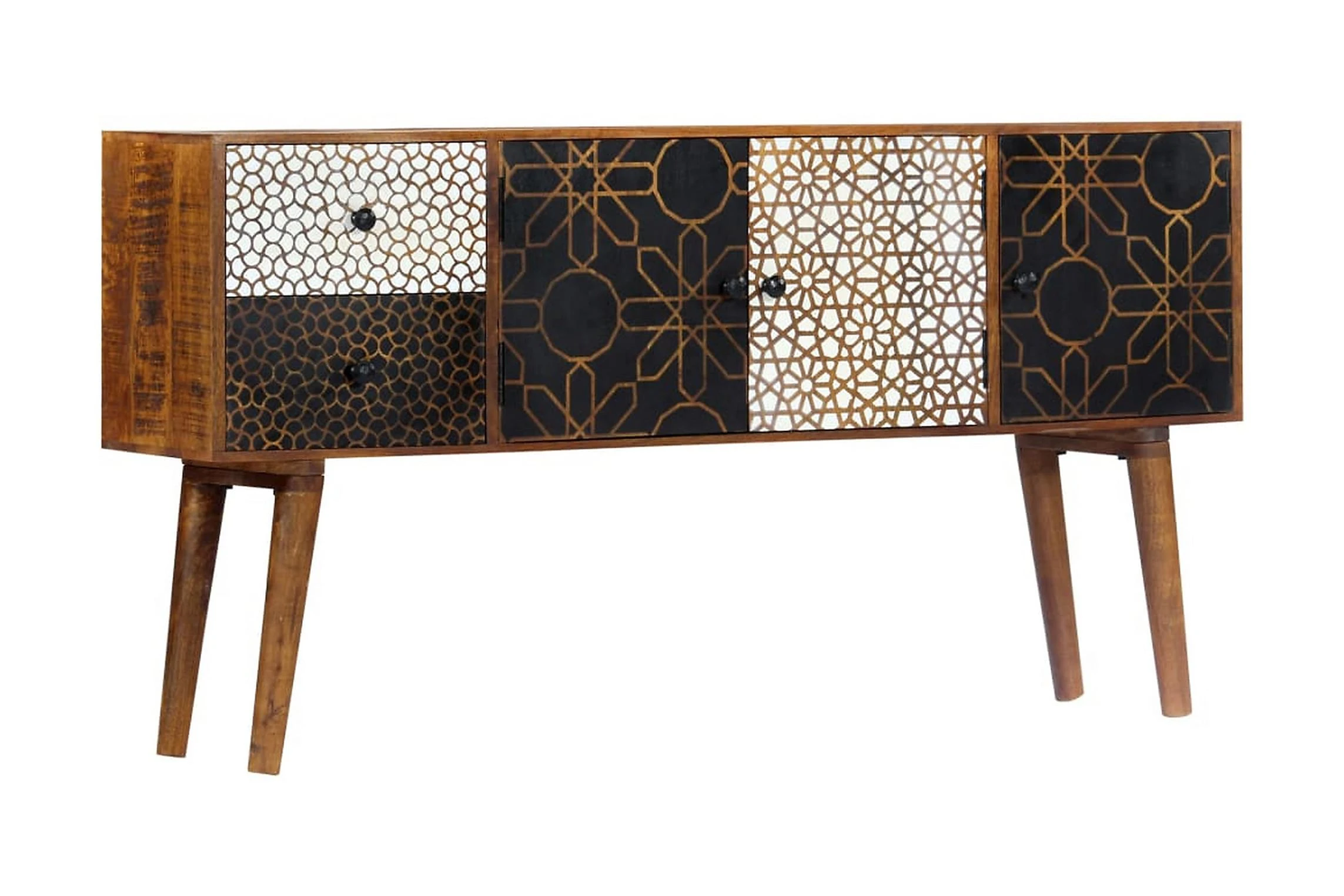 Eftersom den är tillverkad i mangoträ har skänken en vacker finish som har polerats, målats och lackerats, som bidrar till dess fina utstrålning. Mangoträ är ett robust lövträ som har vackra bruna eller gyllene strimmor på ytan. Det vackra tryckta mönstret på lådorna bidrar till sidoskåpets skönhet. Dessutom är den enkel att montera och rengöra med en fuktig trasa. Ta din inredning till en ny nivå med vår eleganta byrå.