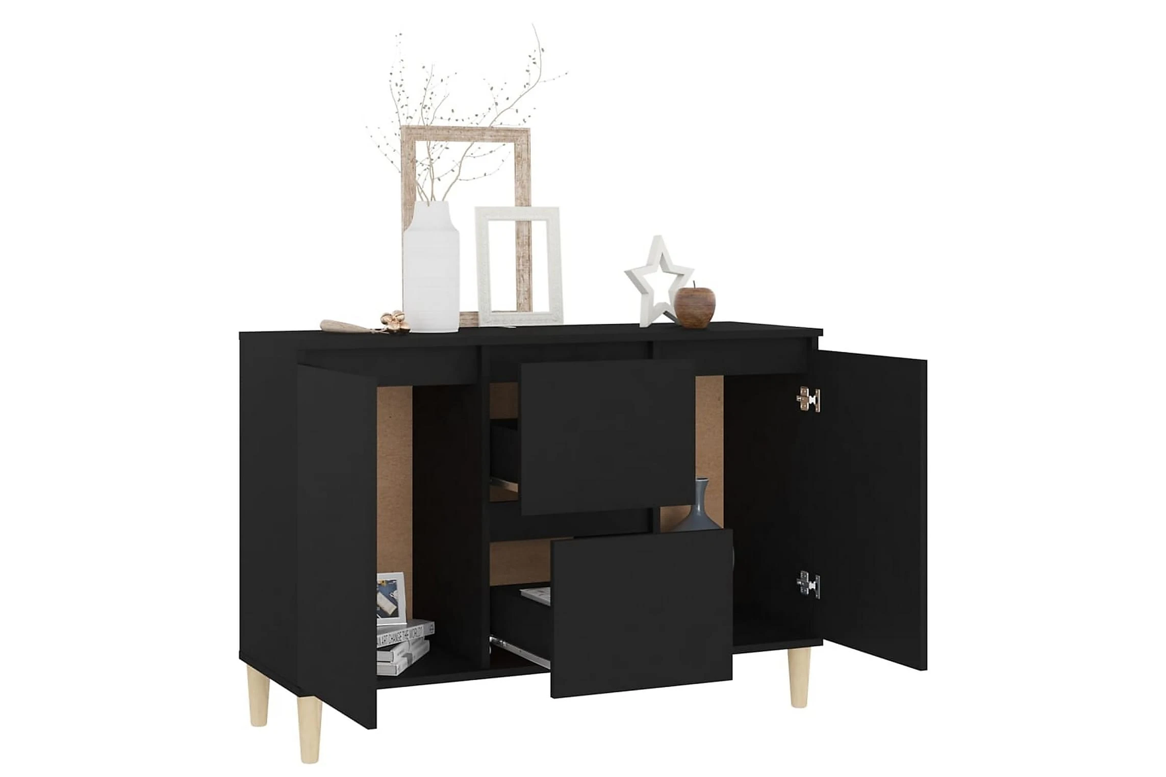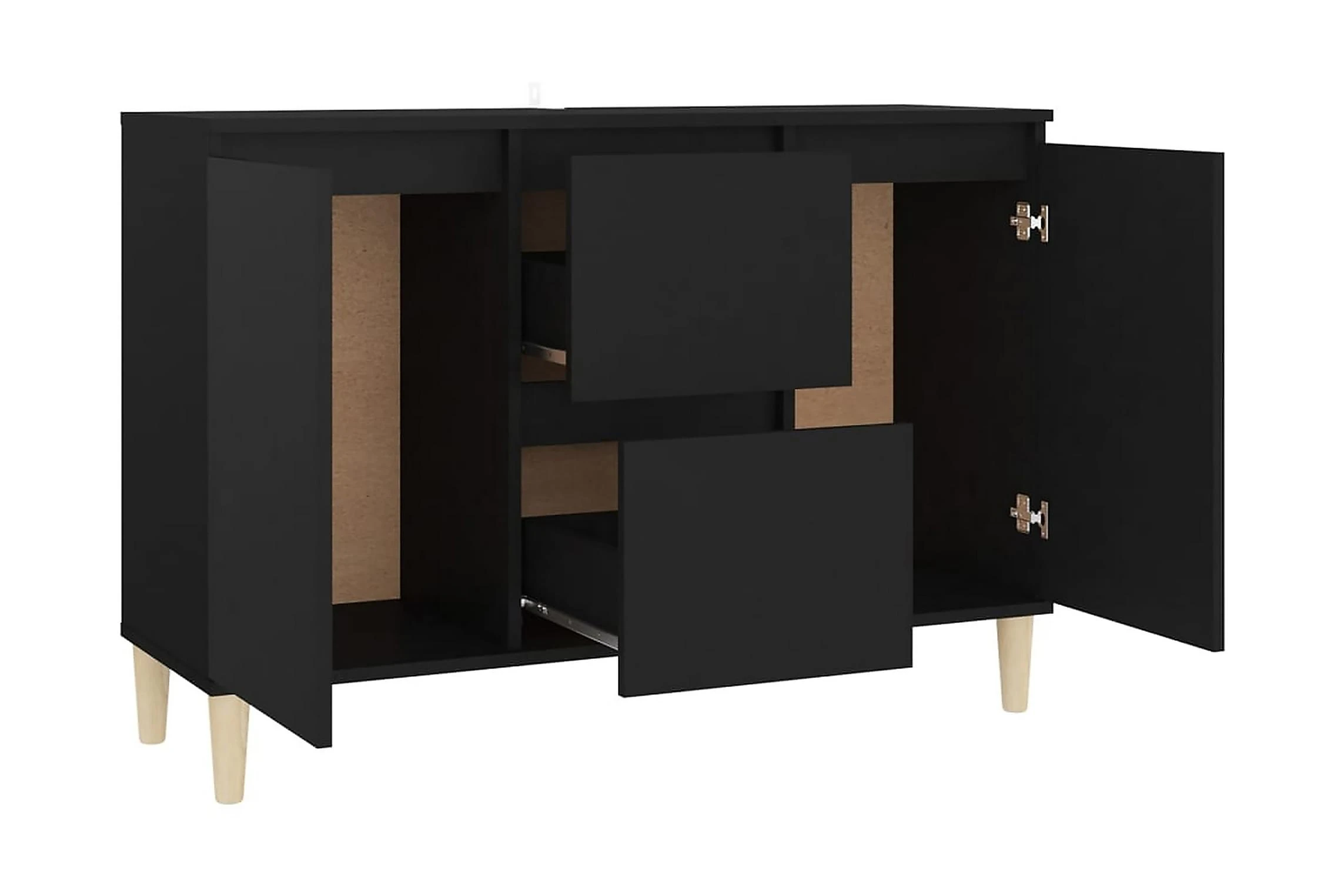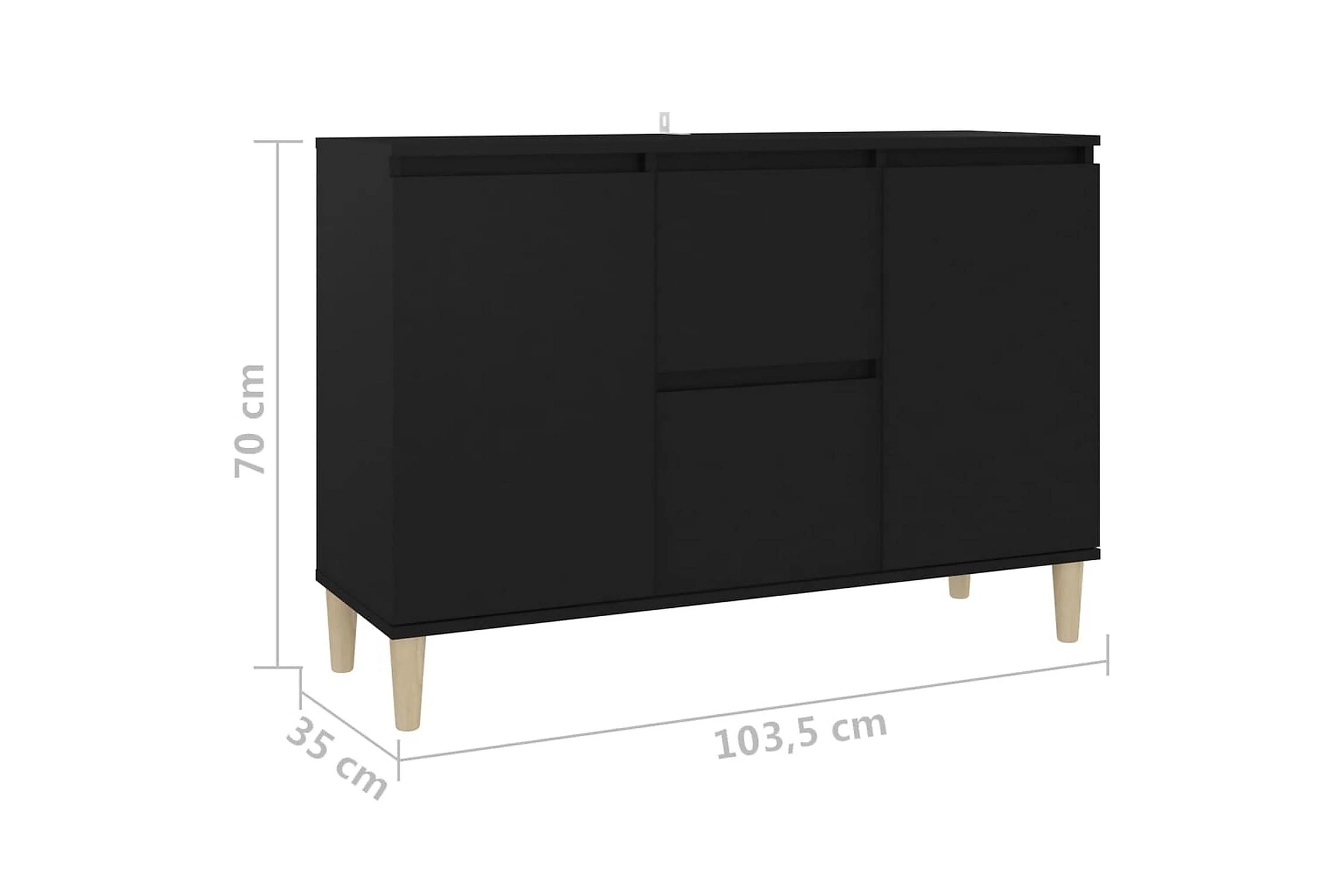 Skänken är tillverkad av spånskiva, vilket gör den robust och hållbar för många års användning. Benen i trä bidrar till extra stabilitet. Skänken har 2 lådor och 2 dörrar med gott om förvaringsplats. Den robusta skivan är en perfekt plats att ställa prydnadssaker, fotoramar eller krukväxter på. Skänken kan enkelt torkas av med en fuktig trasa.