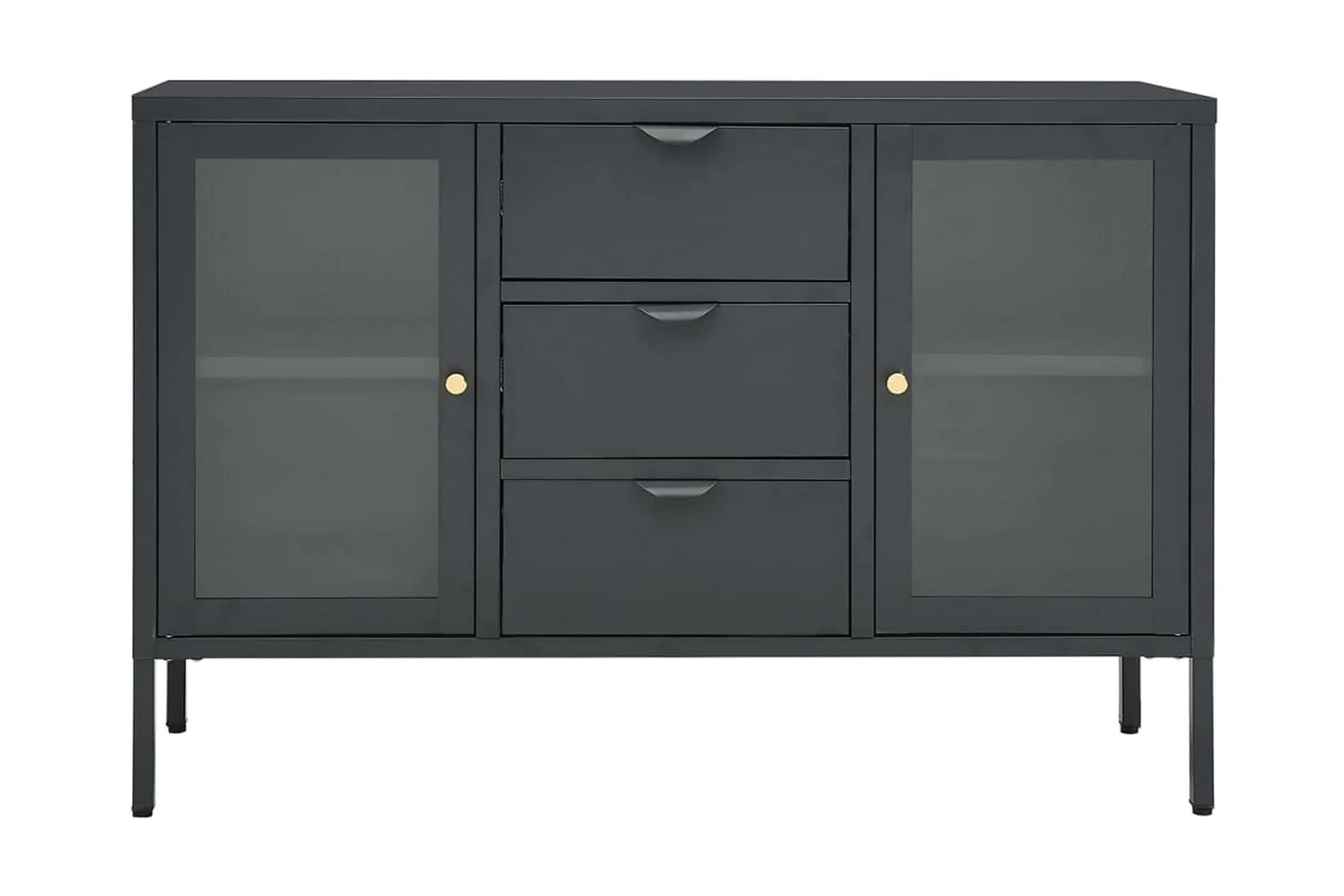 Förvaringsskåpet är tillverkat av stål och härdat glas, vilket gör det stabilt och tåligt och kommer stå sig i många år. Skåpet har 2 justerbara hyllor och 3 lådor, med gott om förvaringsutrymme för att hålla dina DVD-skivor, multimedieapparater, böcker och små väsentliga föremål organiserade och inom räckhåll. Lådan med 3 sektioner kullager ger smidig öppning och stängning. Dessutom är skåpet lätt att rengöra med en fuktig trasa.