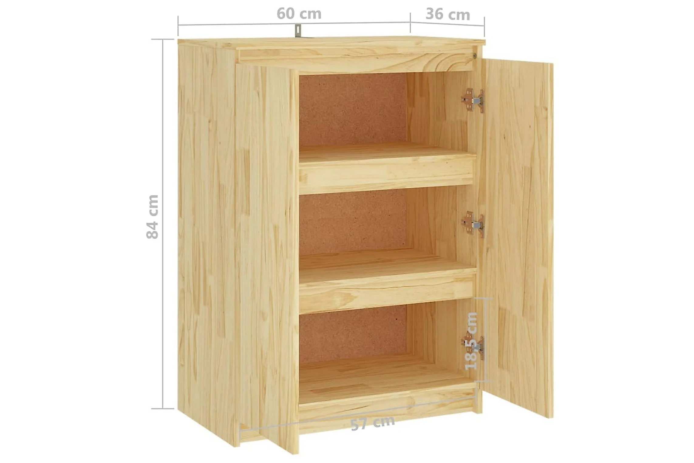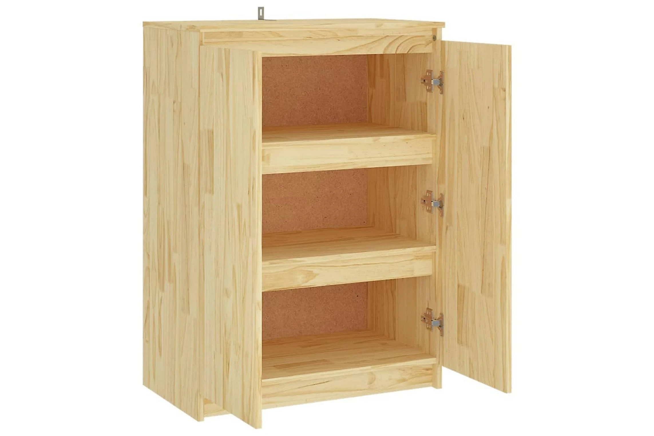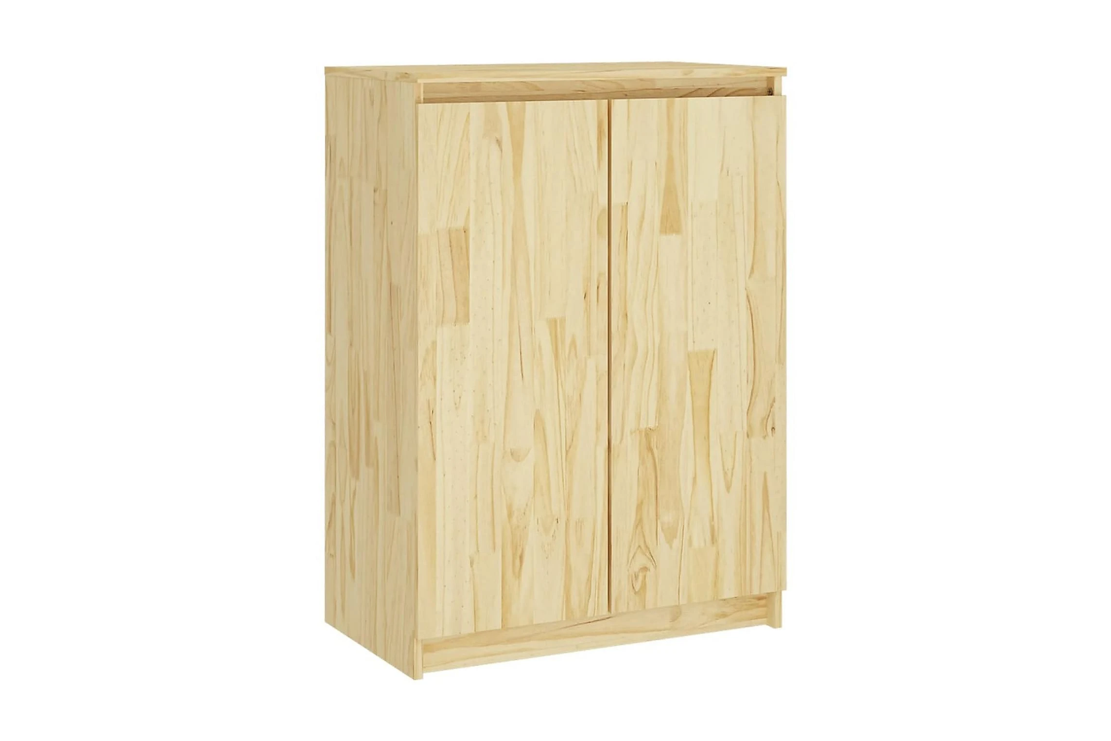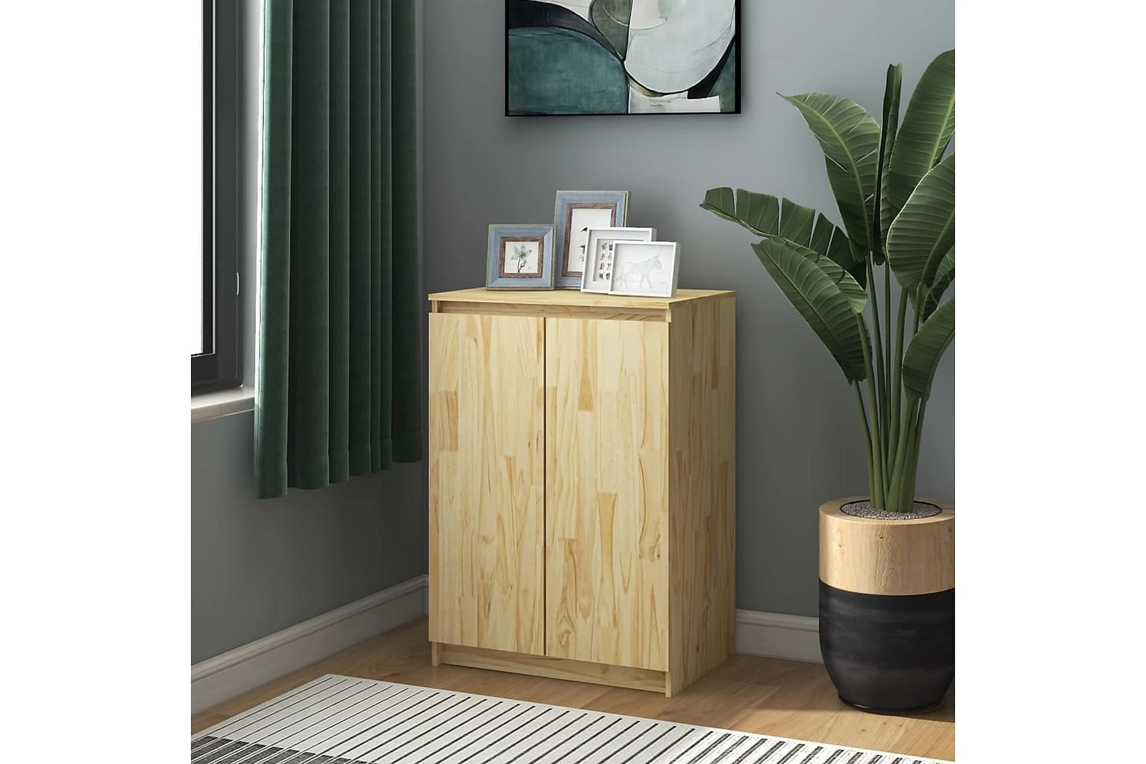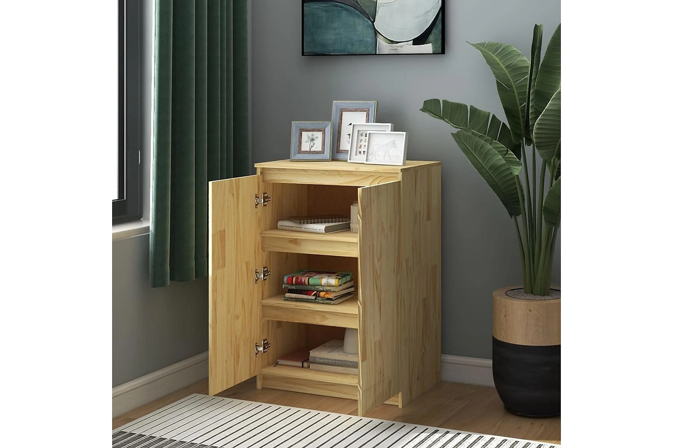 Skänken är tillverkad av massivt furuträ, vilket gör den mycket hållbar och robust. Med 2 dörrar och 3 fack har sidoskåpet gott om förvaringsutrymme för böcker, multimedieapparater och andra föremål. Den robusta bordsskivan är ideal för att visa upp dekorativa föremål, fotoramar eller krukväxter. Sidoskåpet är lätt att rengöra med en fuktig trasa.